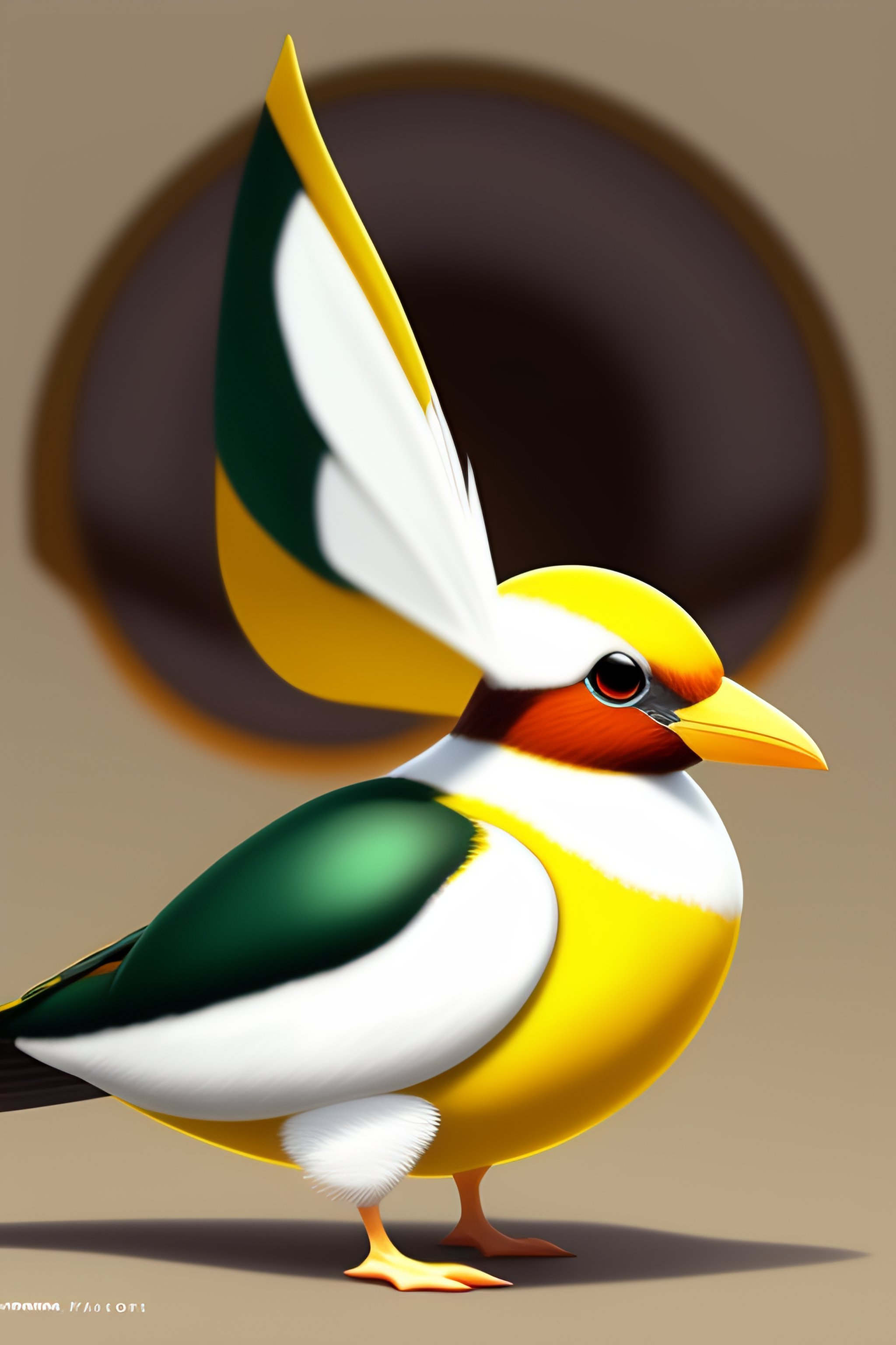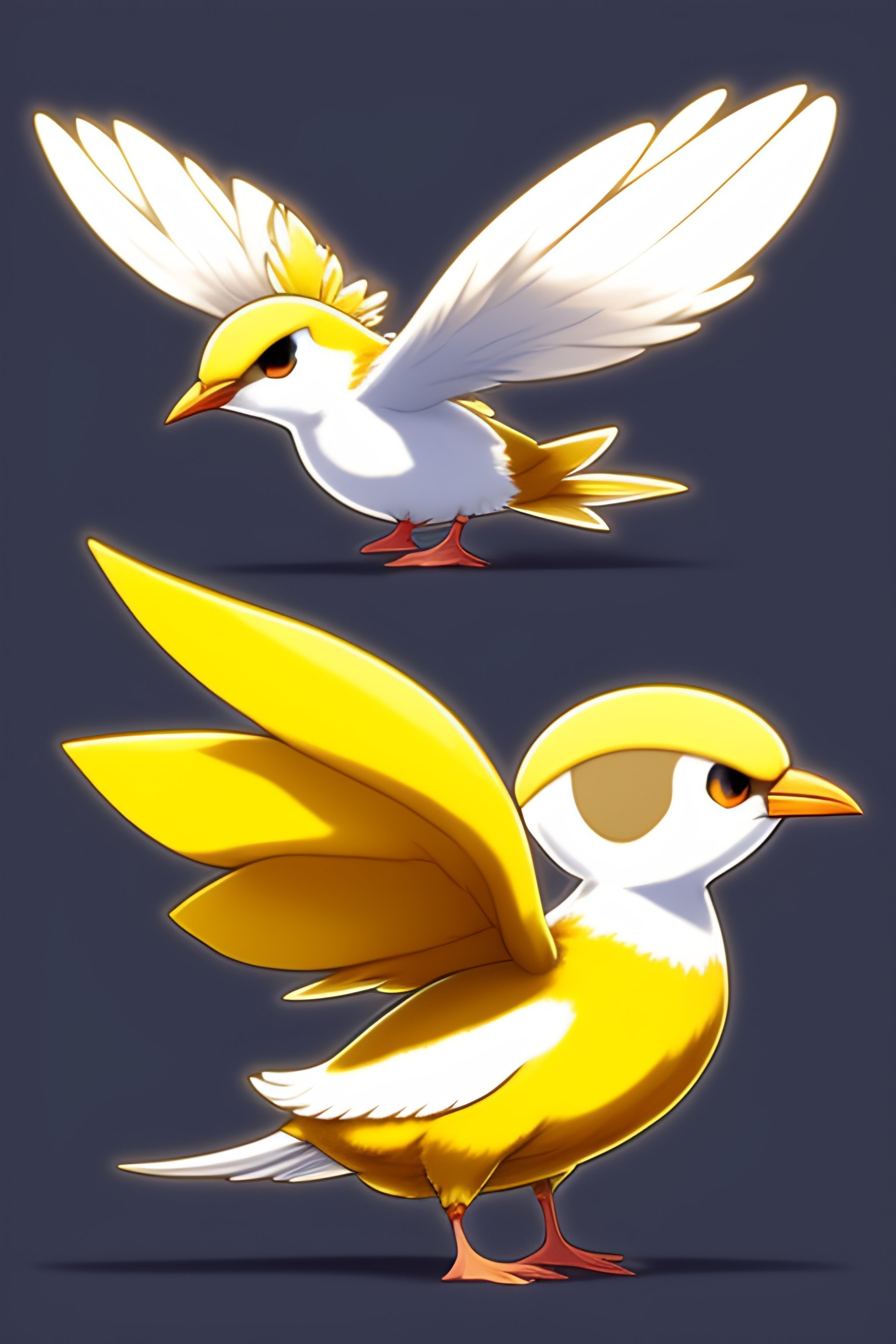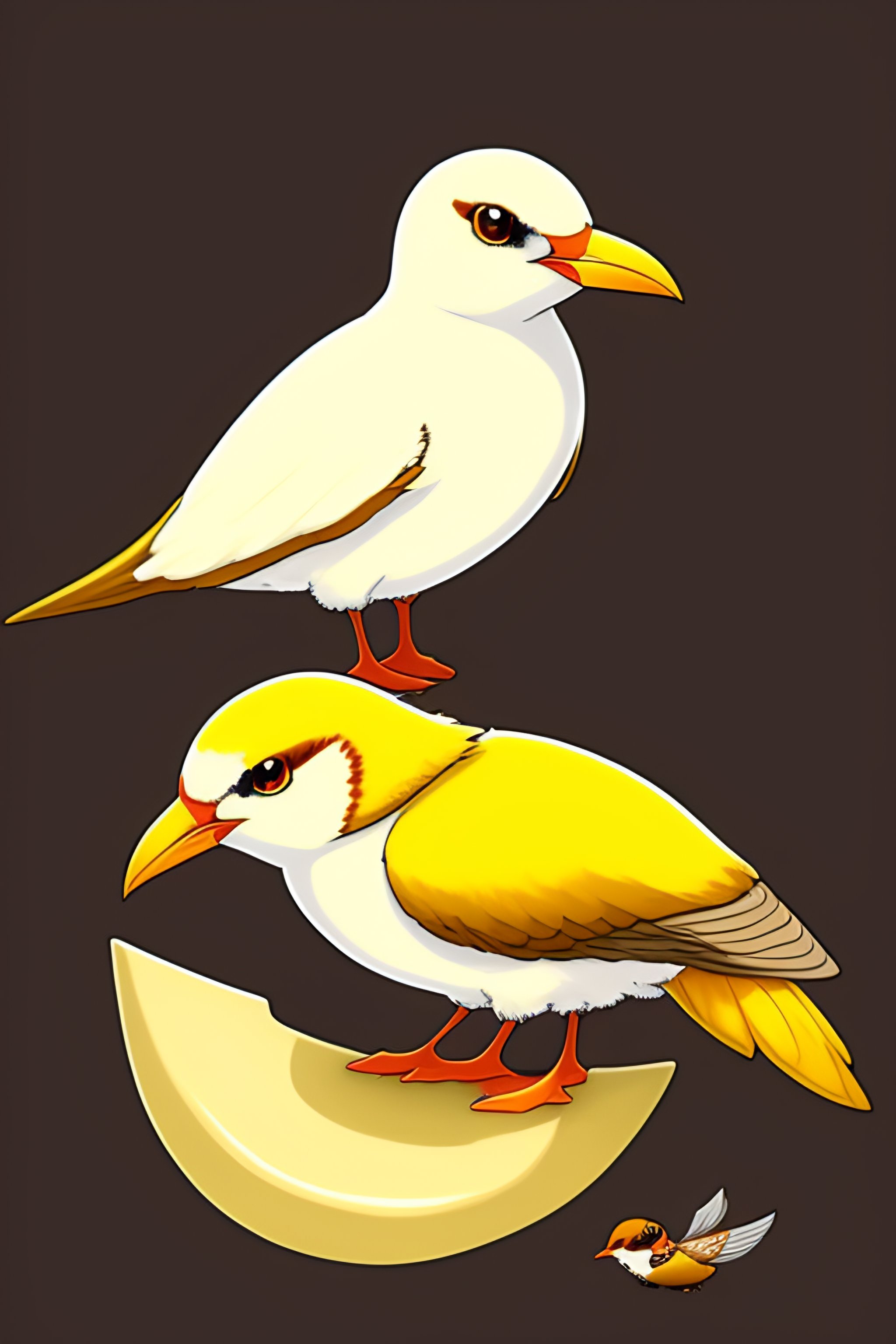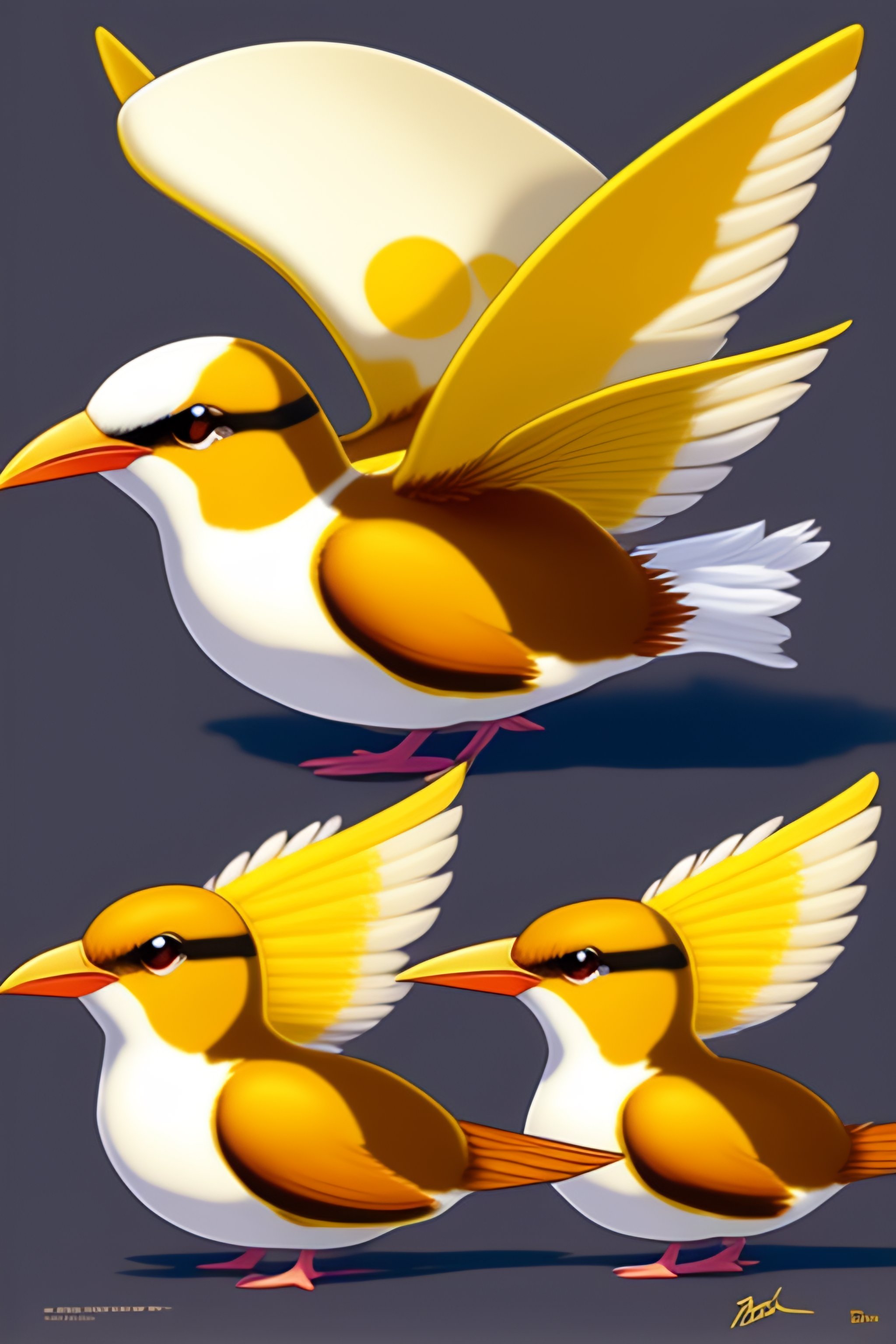 Flying type pokemon based on a tern seagull, first stage pokemon, color scheme yellow brown and white, tail feathers look like a sail, wears a seashell on its head, cute, fakemon, drawn by ken sugimori, concept art