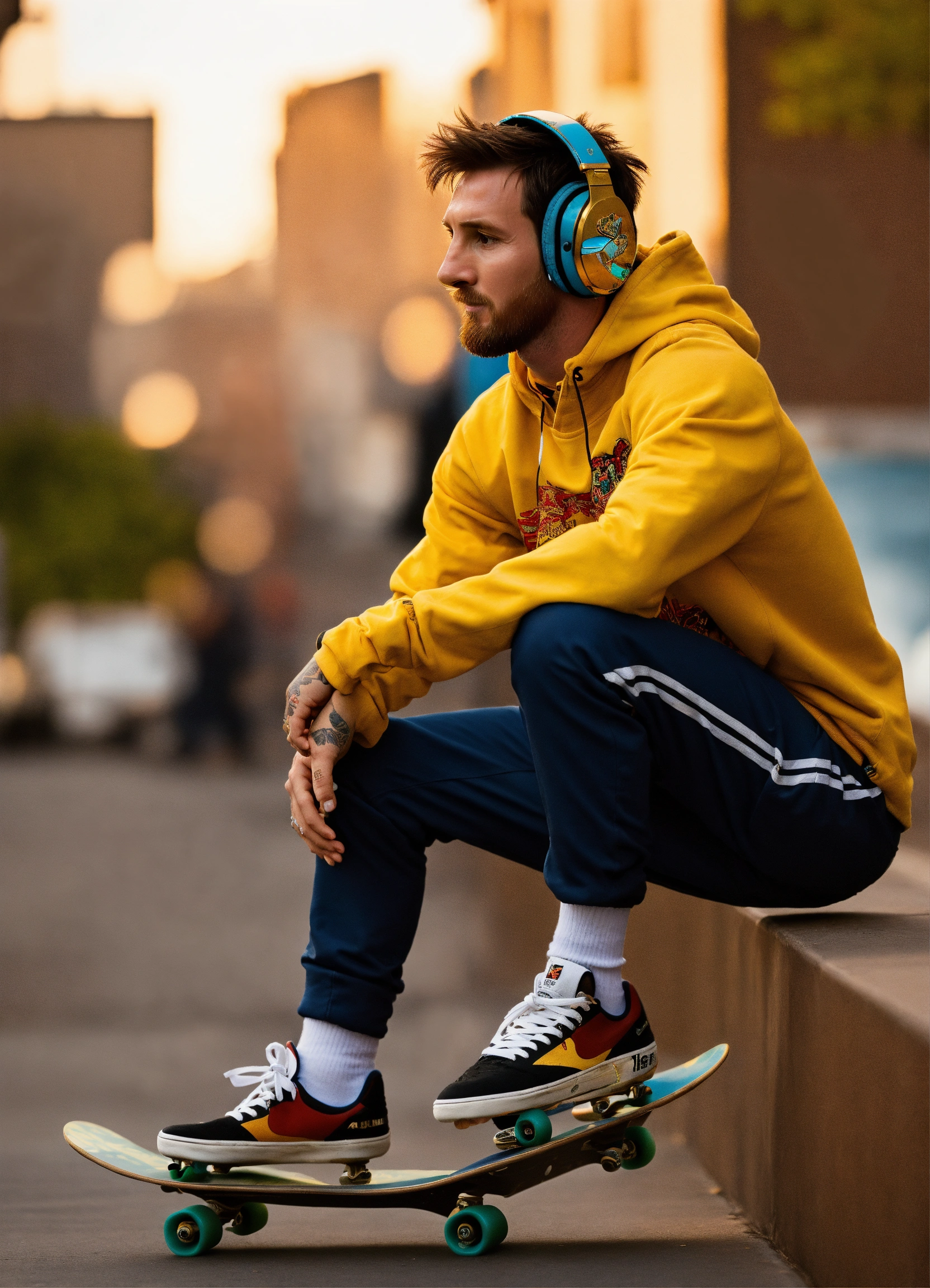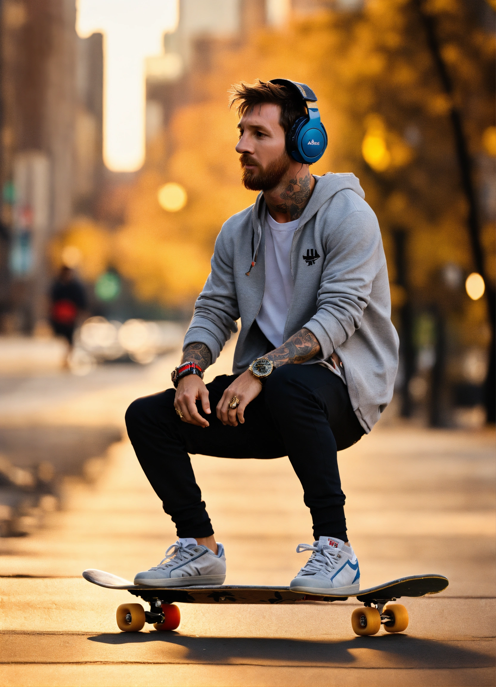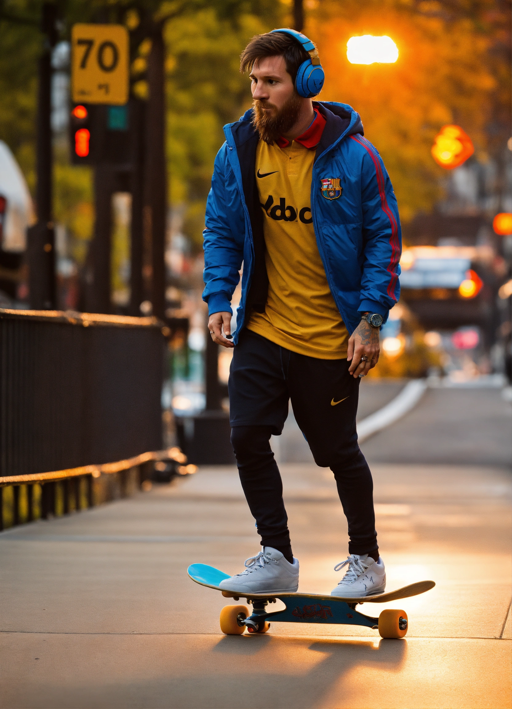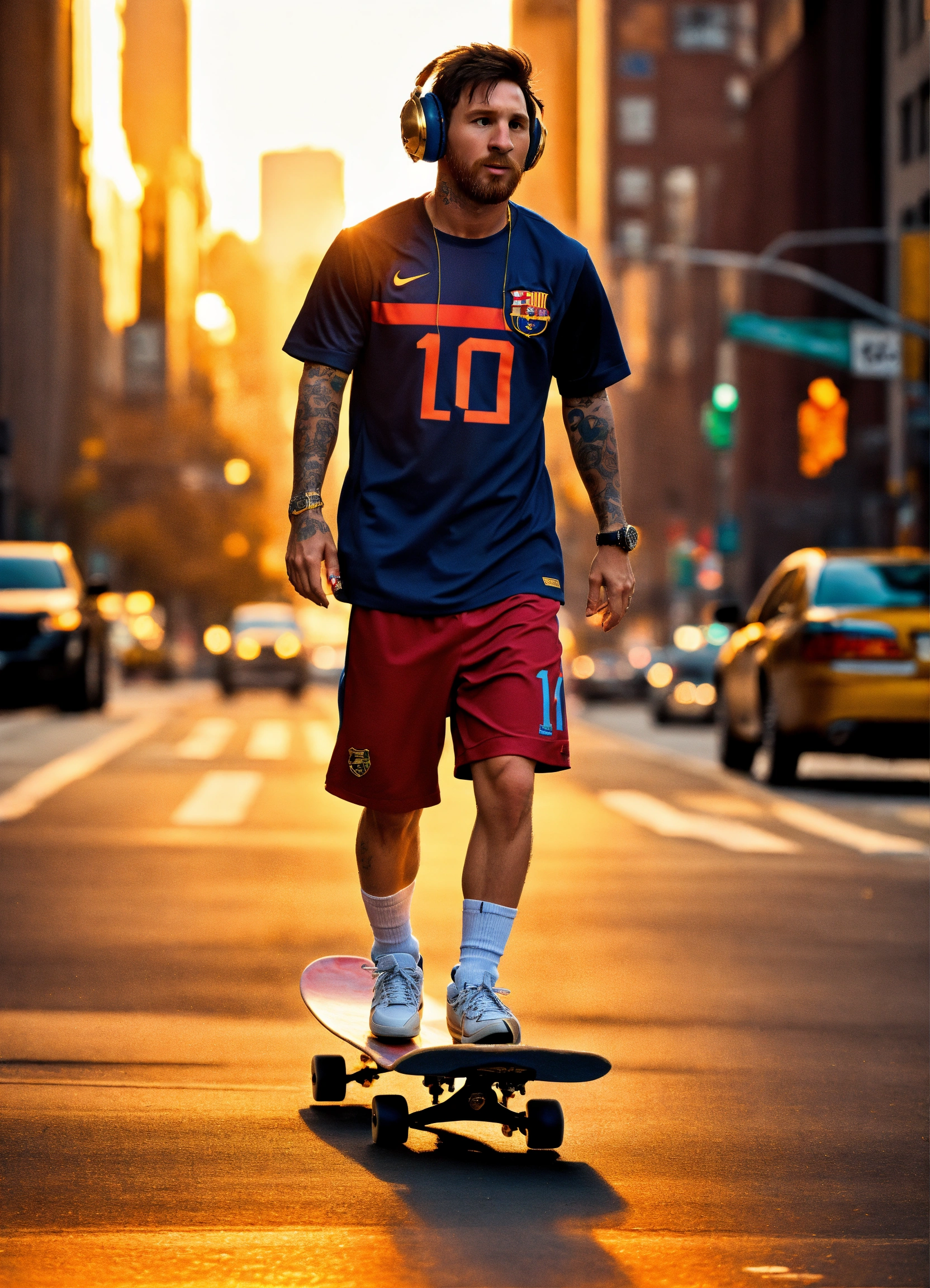 Lionel messi con ropa skateboarding con auriculares, andando en skate en nueva york por la tarde, golden hour, super realista y detallado
