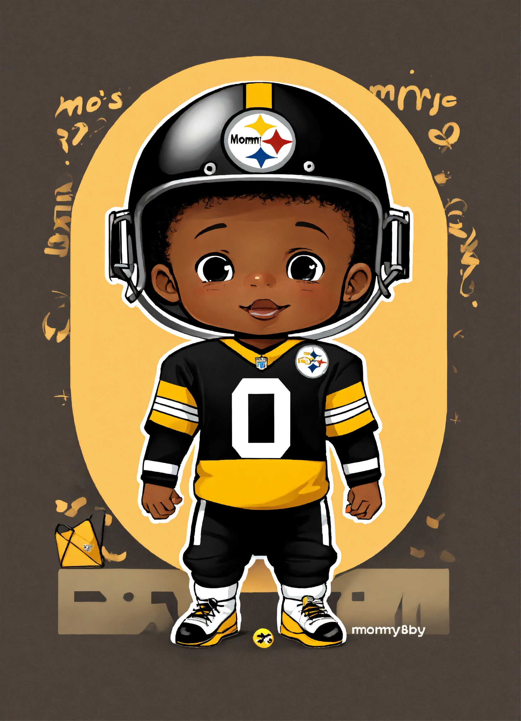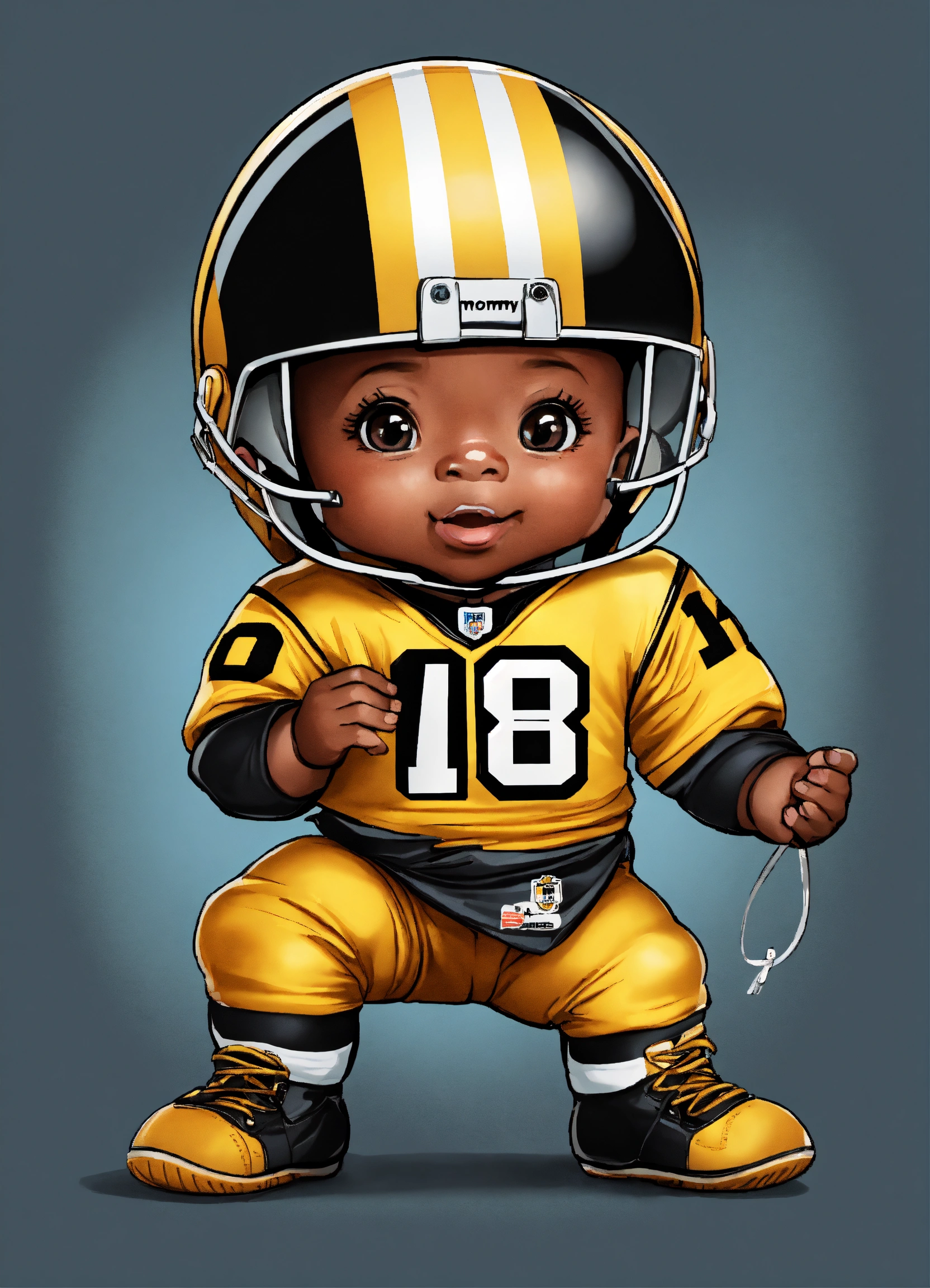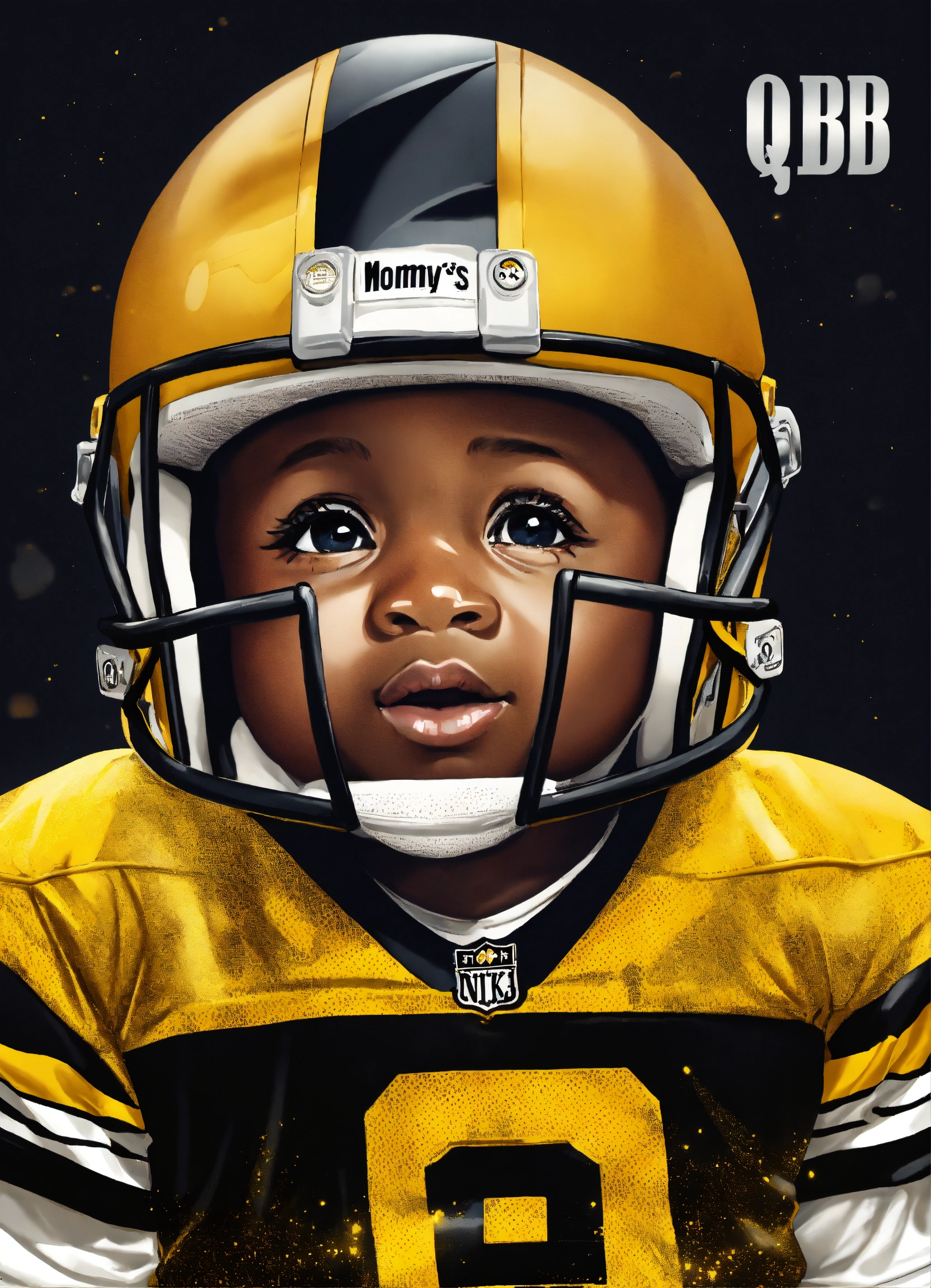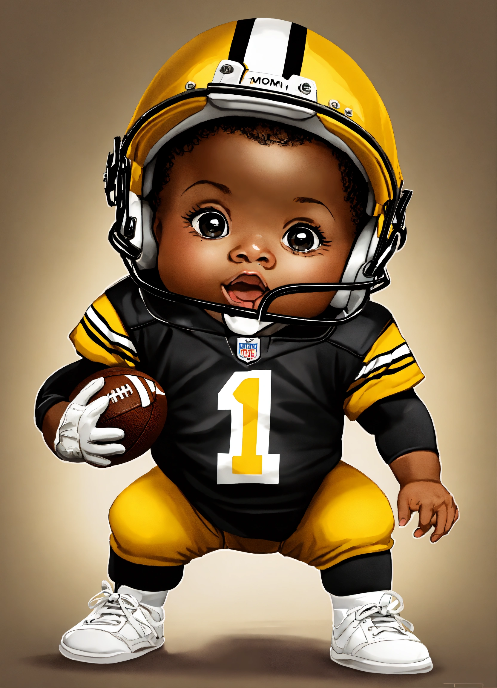 Cute black baby boy in a steeler's uniform in the down position, with the words mommy's above the imagine and qb under the image hyper- detailed, ultra- sharp, 8 k, illustration, highly detailed, smooth and clean vector, no jagged edges, vector art
