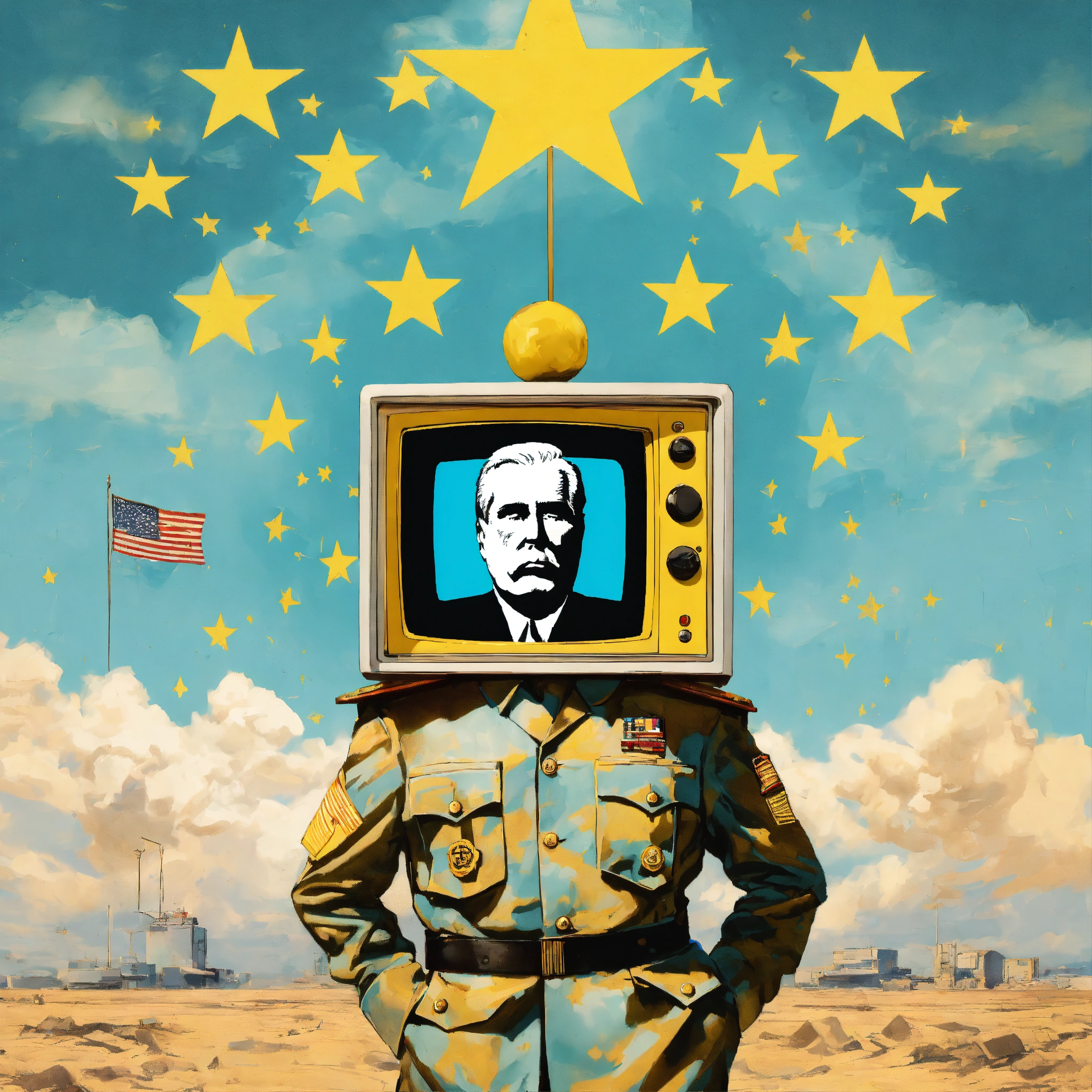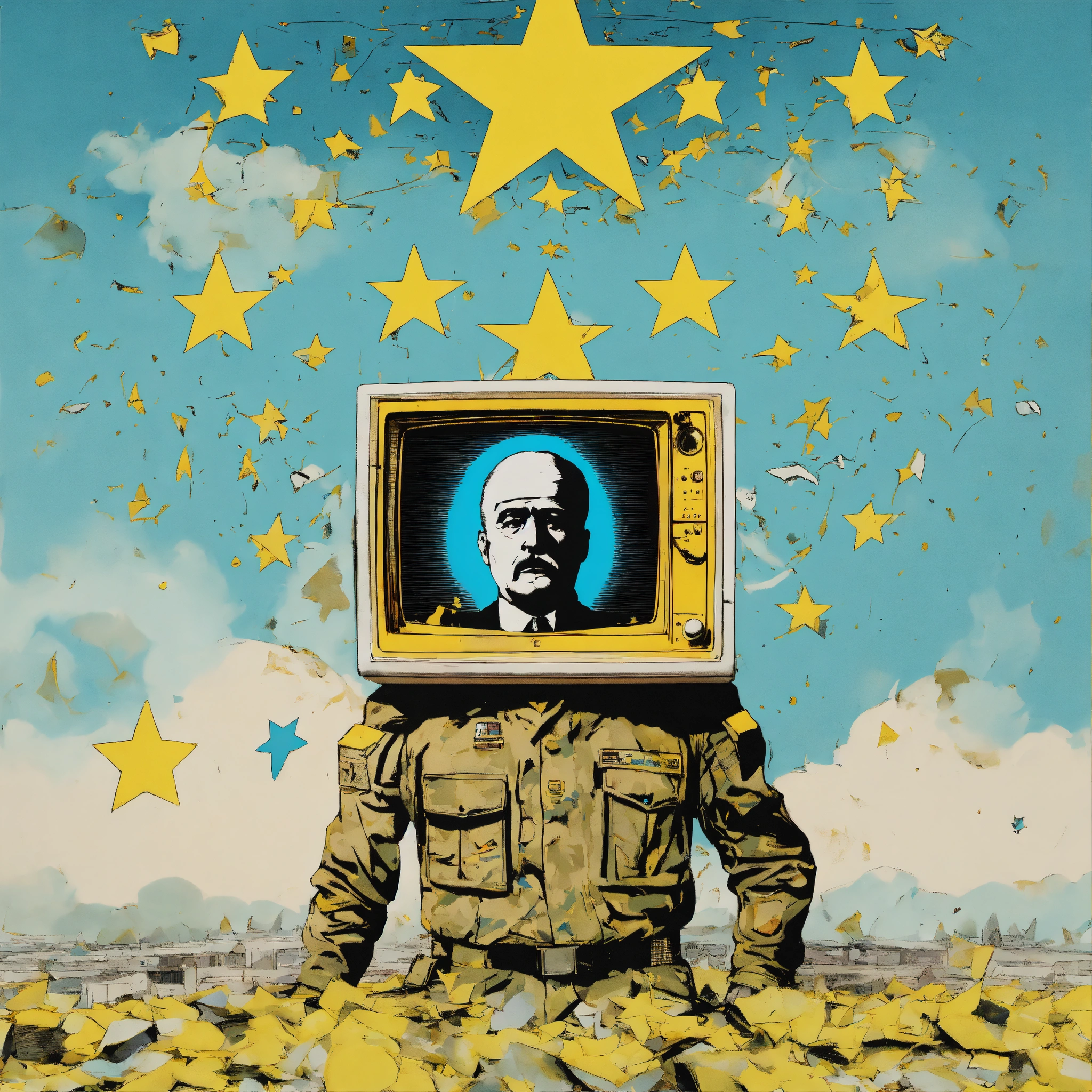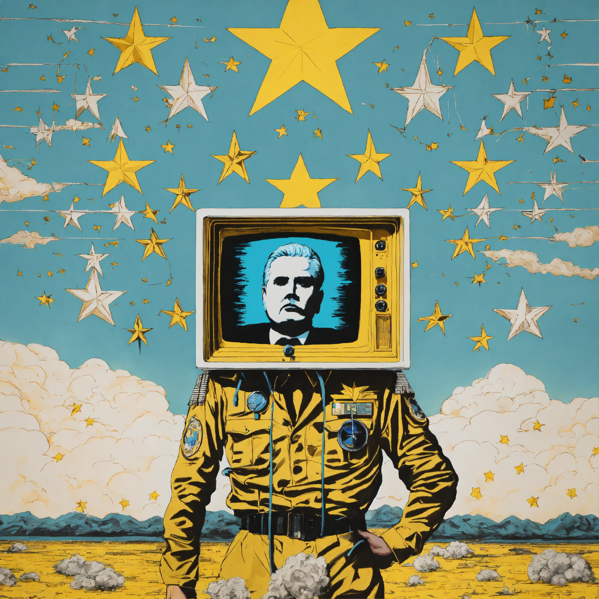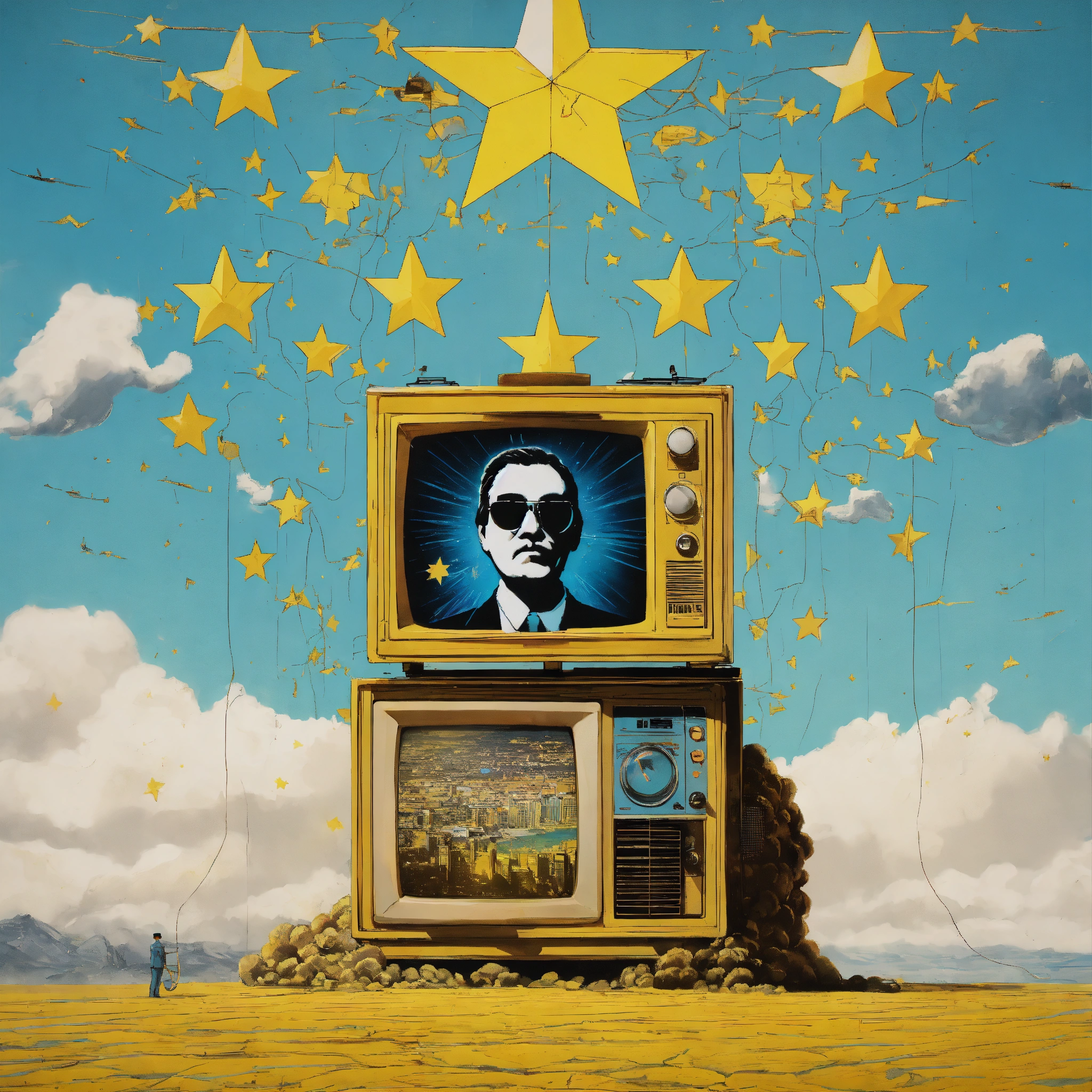 A human dictator with television-head on a war propagand art style sky blue and white colors 80’s with yellow stars