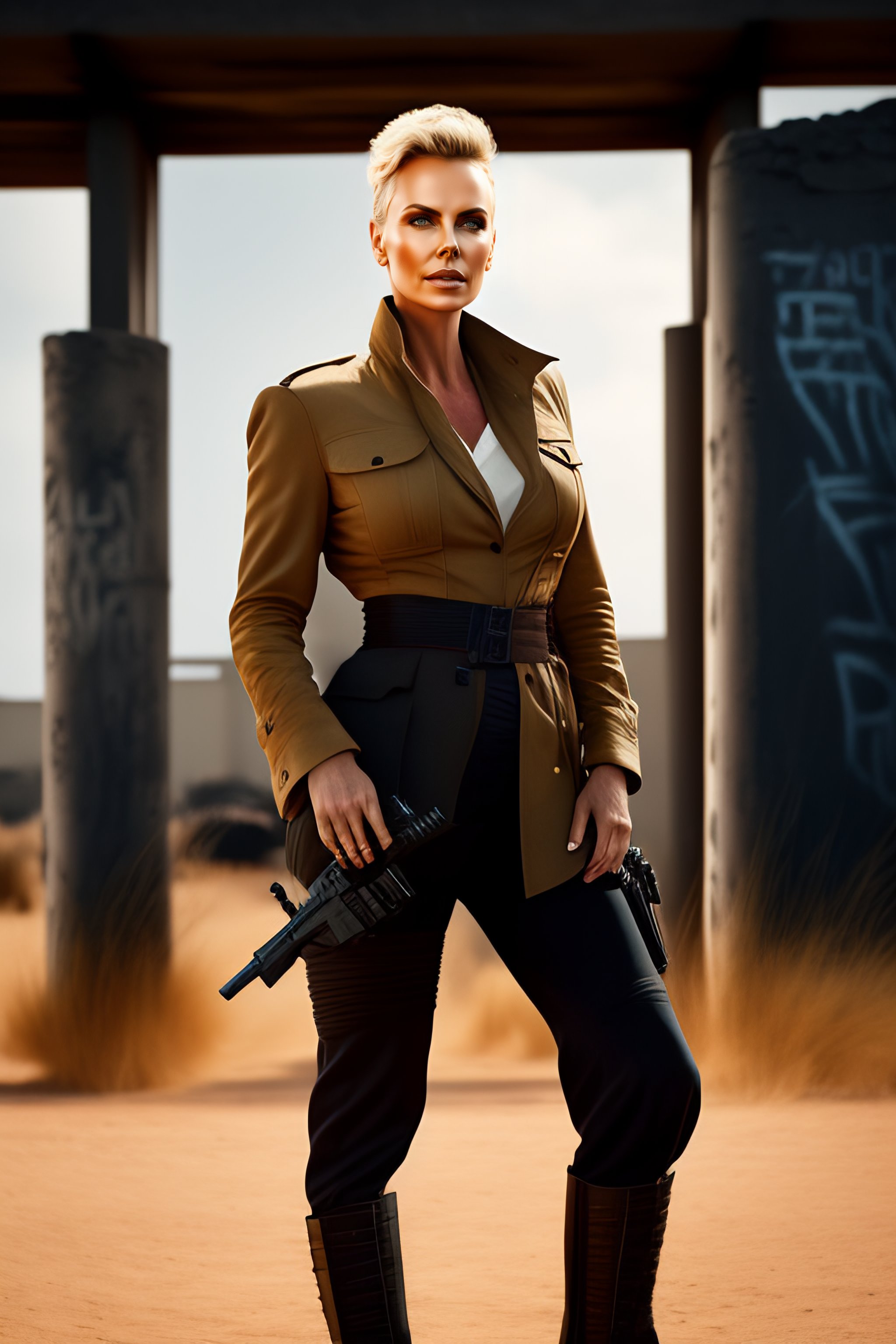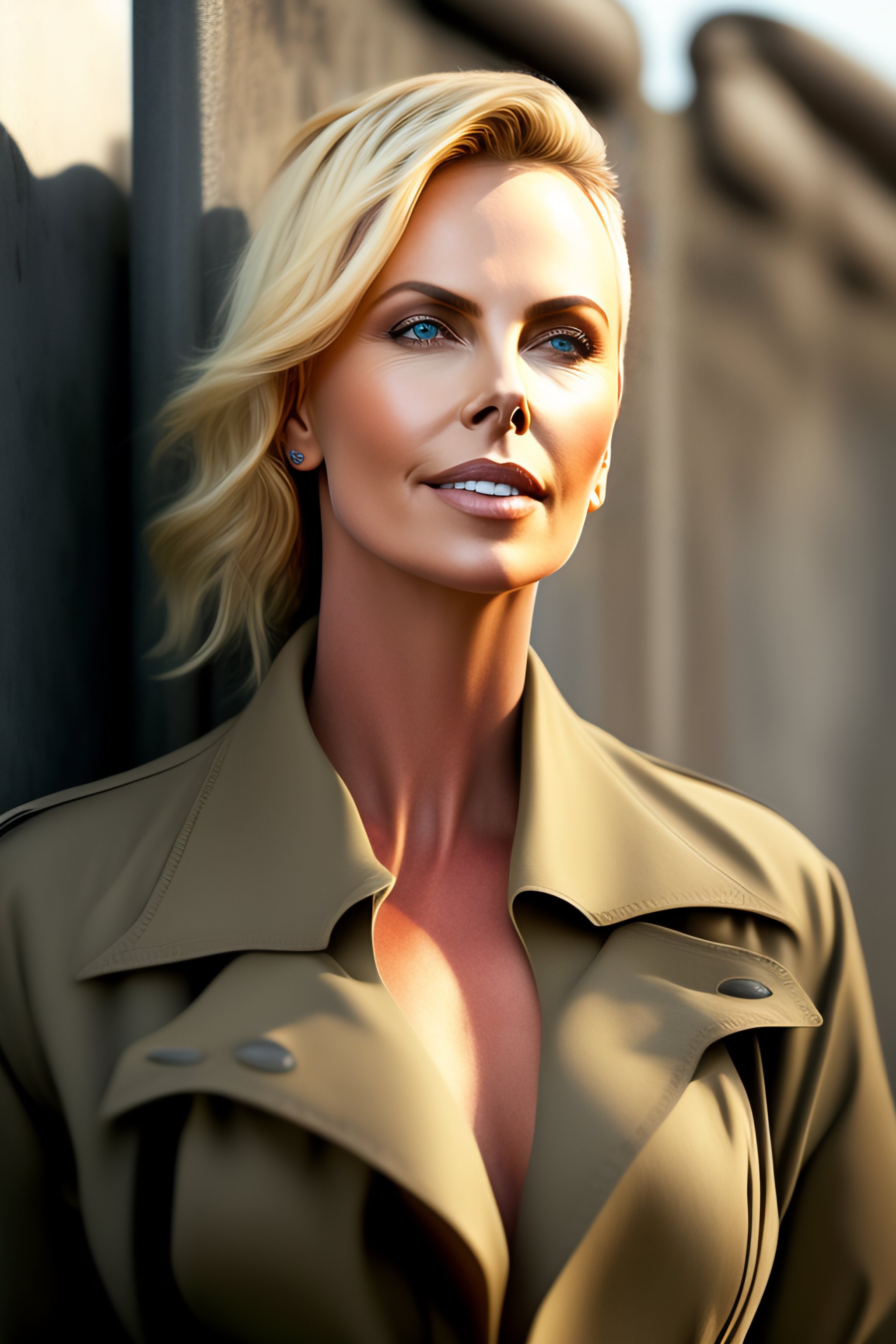 Charlize theron is a badass wild-west brunette female gunslinger loading her pistol. she is leaning against the berlin wall. she is wearing a loose open low-cut blouse, cargo pants with pockets, a single gunbelt slung low around her hips, practical men's size combat boots, and a beat up trench coat. ultra-wide shot, full body portrait. natural lighting.