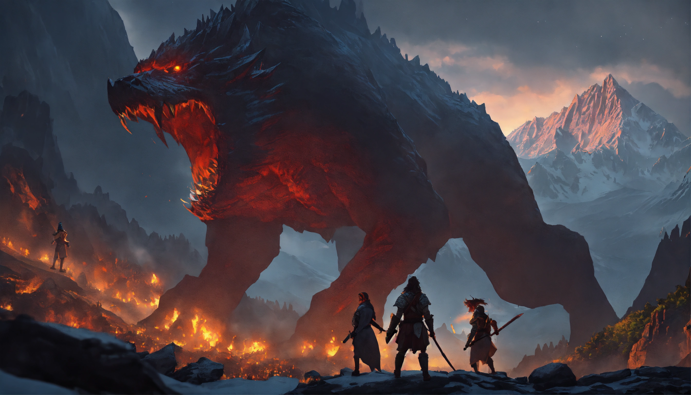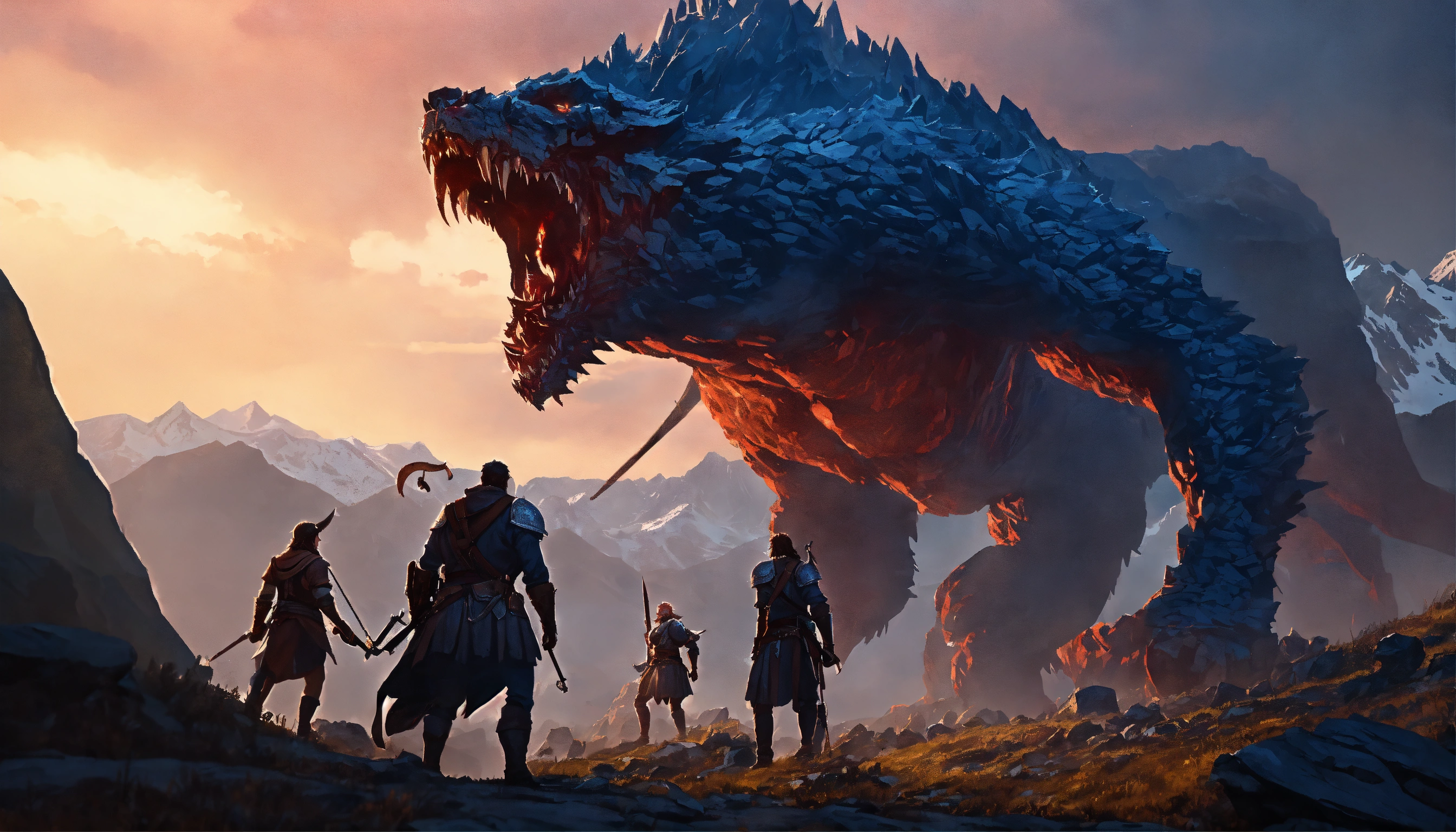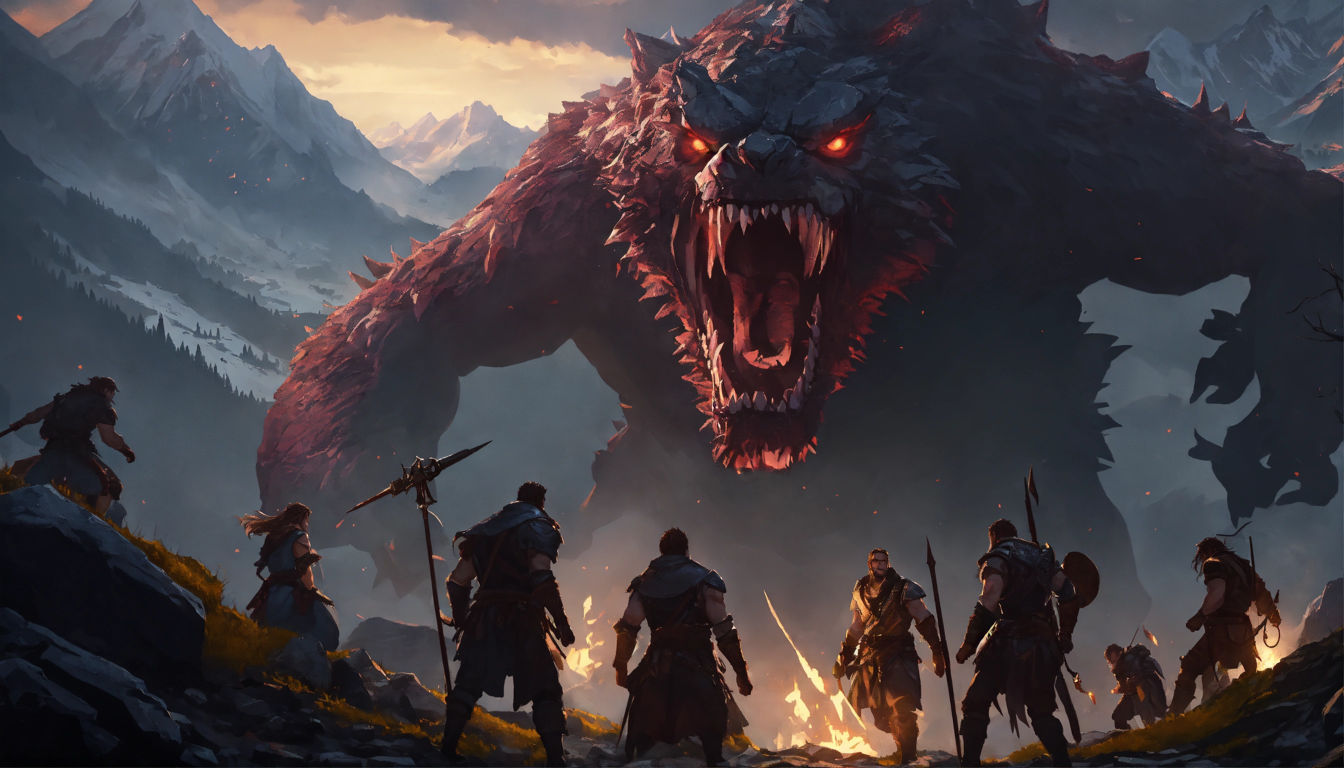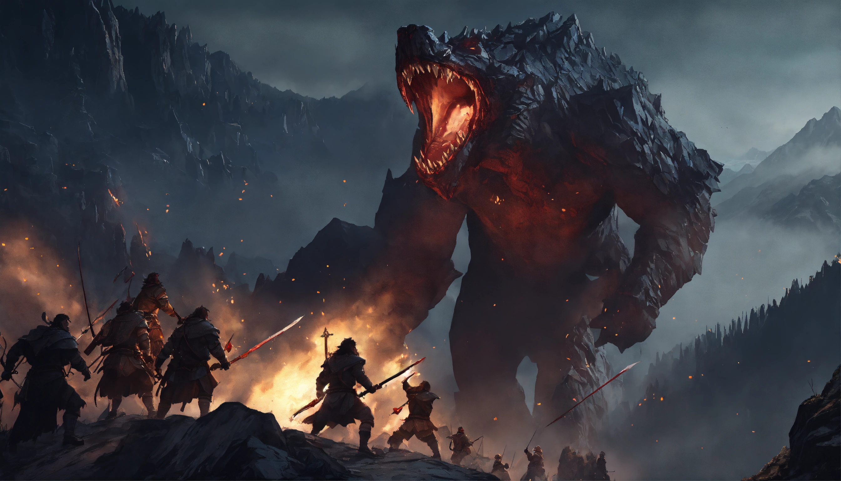 Giant humans fighting giants with jagged teeth that have an uncanny valley appearance in a large mountain range at night. d&d, cinematic