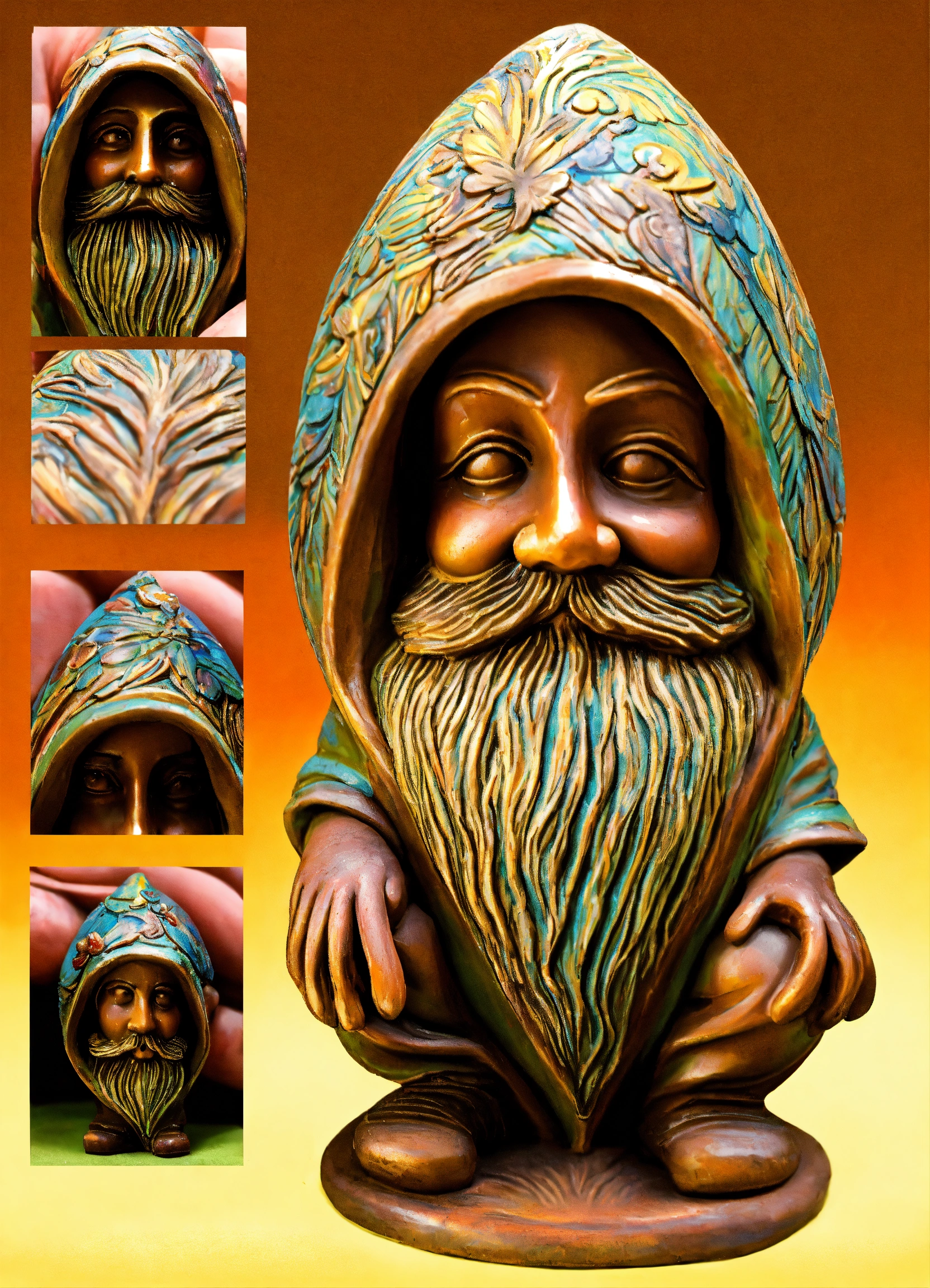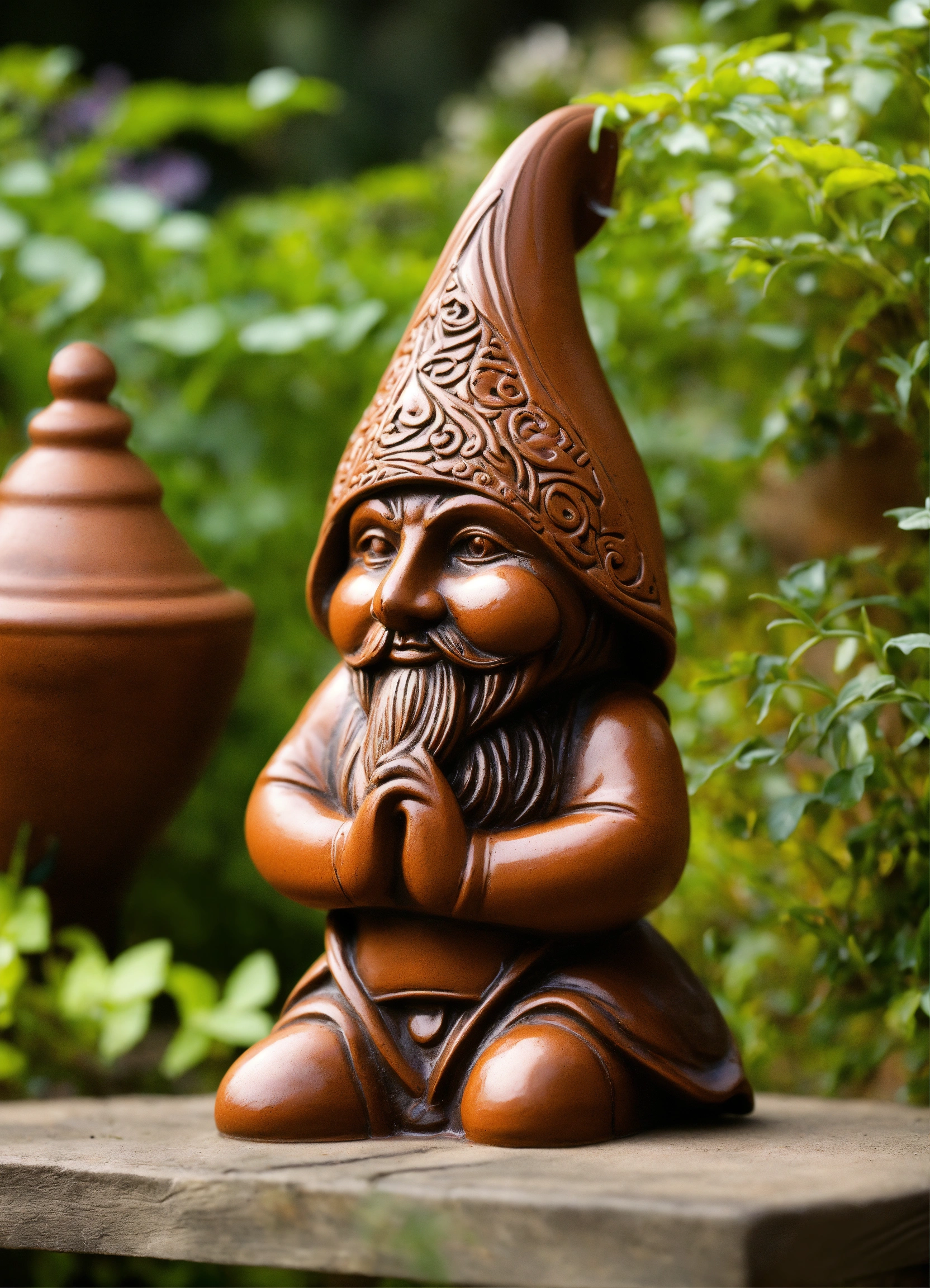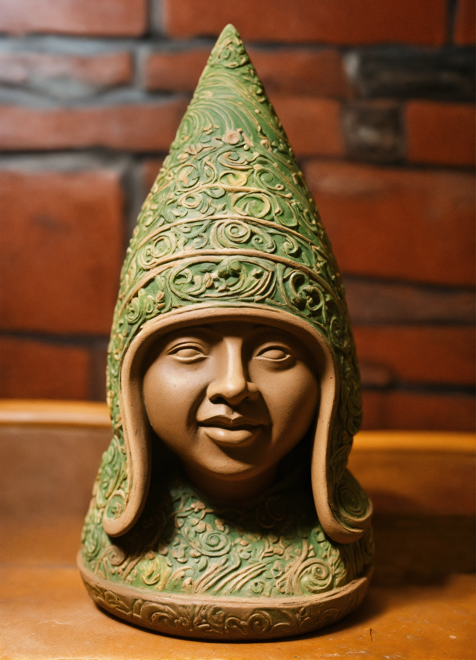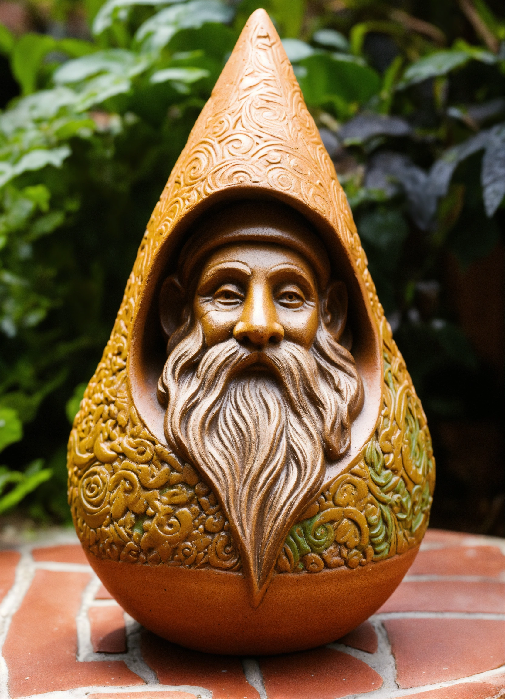An ancient clay hooded sculptured garden gnome teardrop shaped