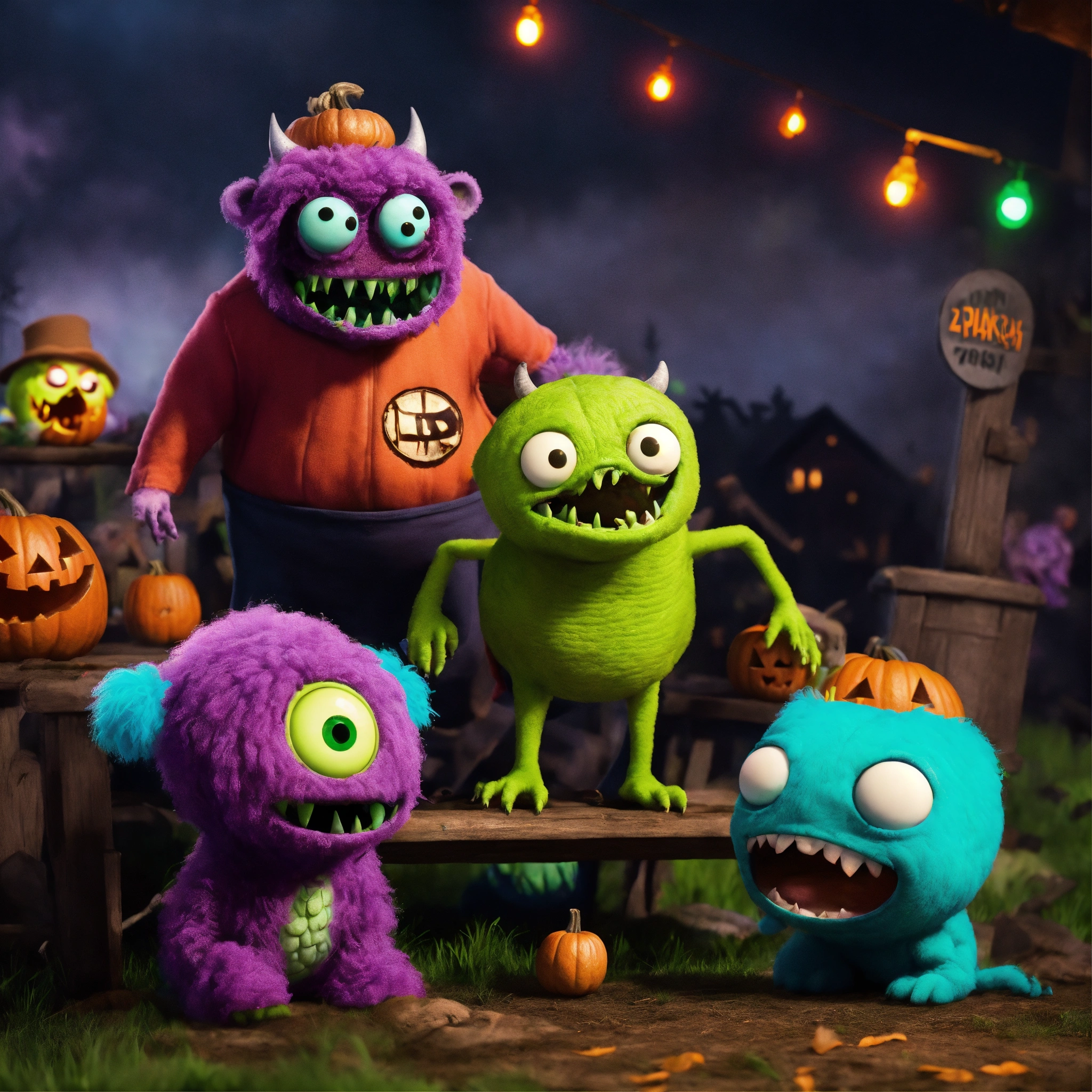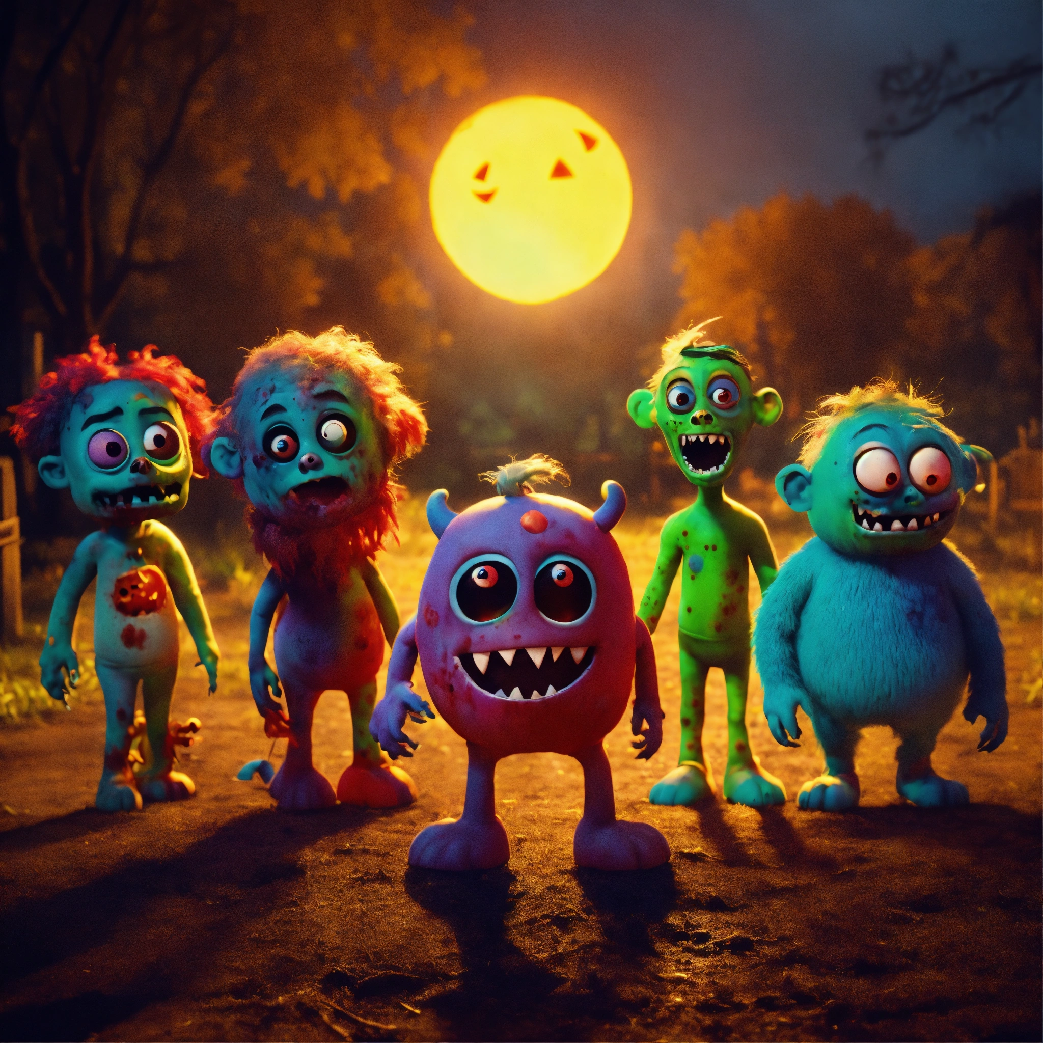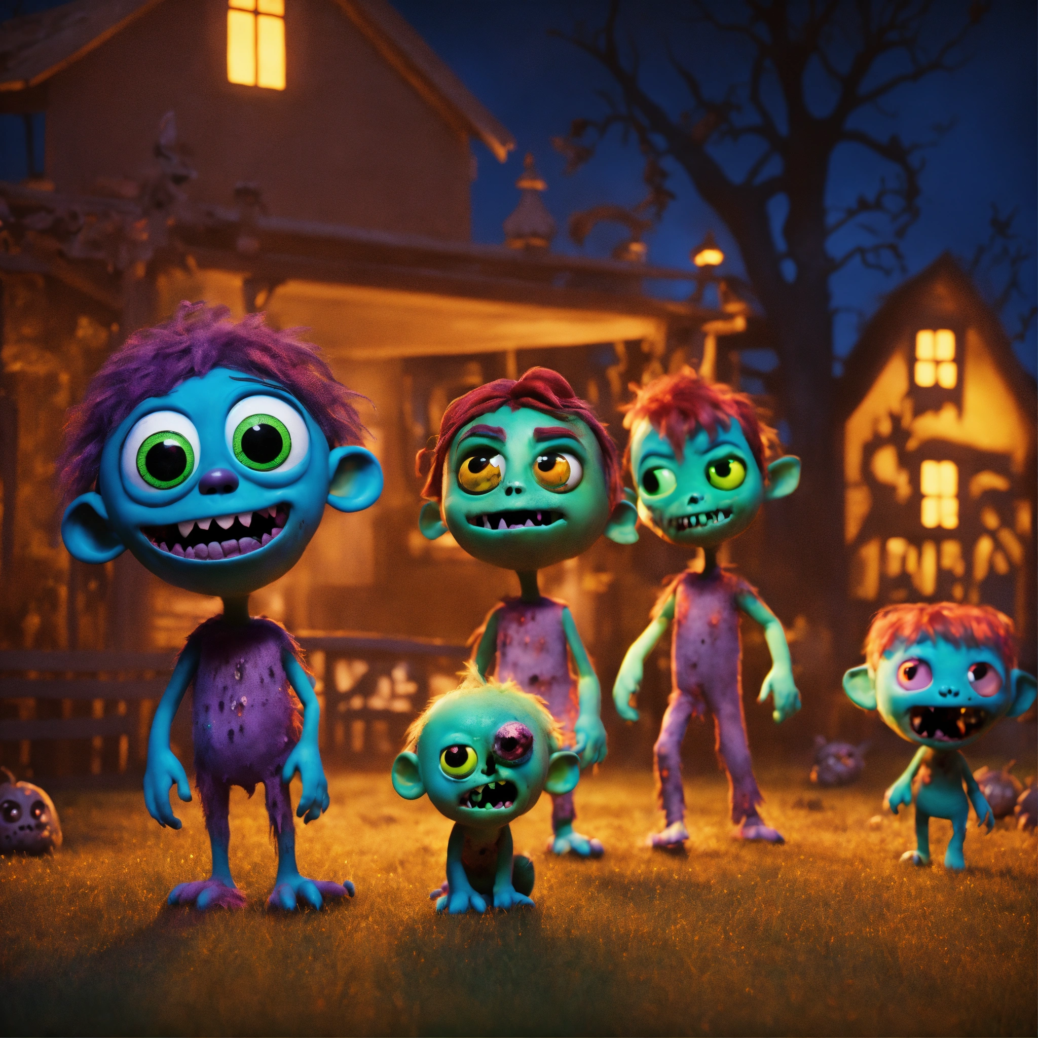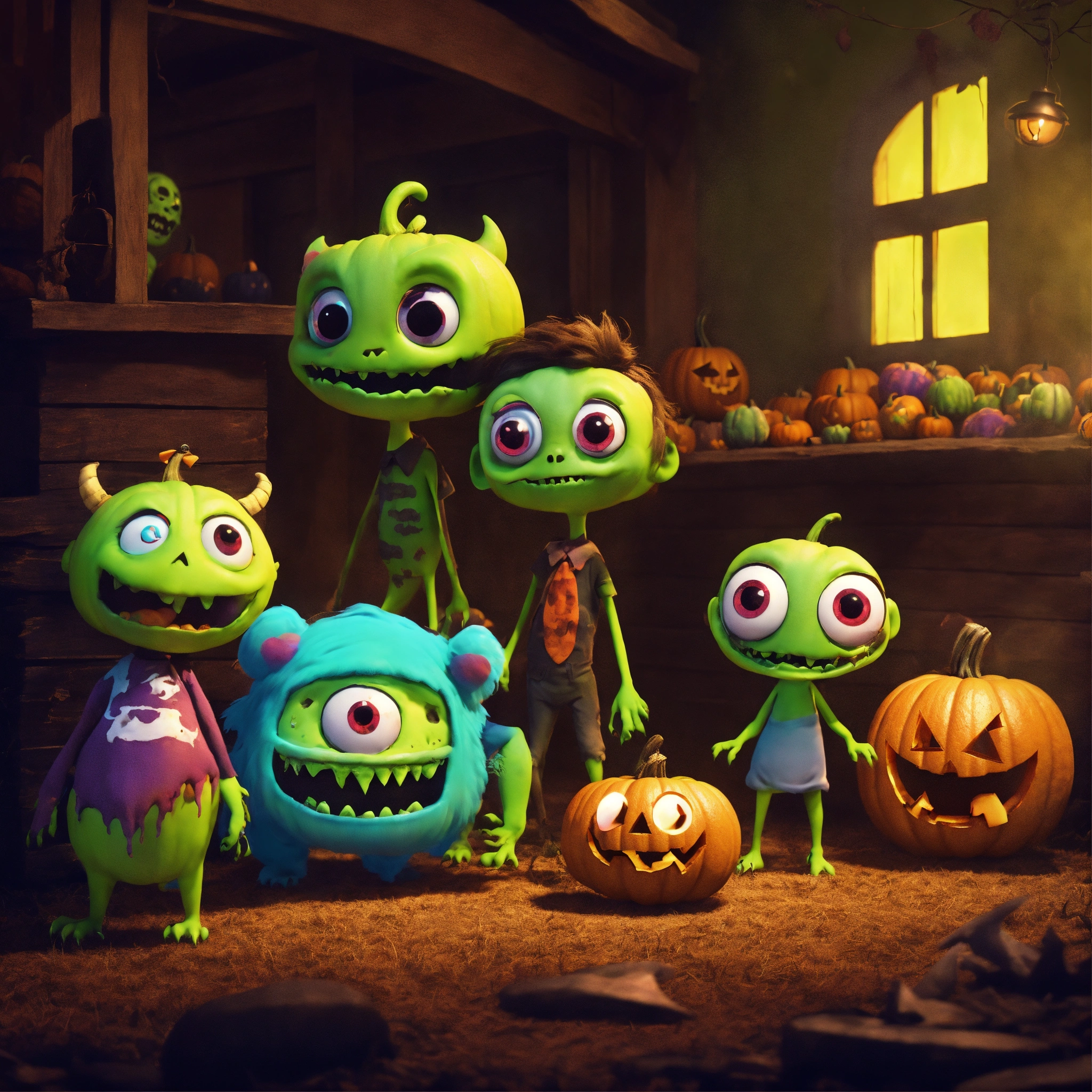 Group of cute friendly pixar-style monstersas zombies for halloween on a haunted farm, dark colors, animated feature film quality but with soft diffusion