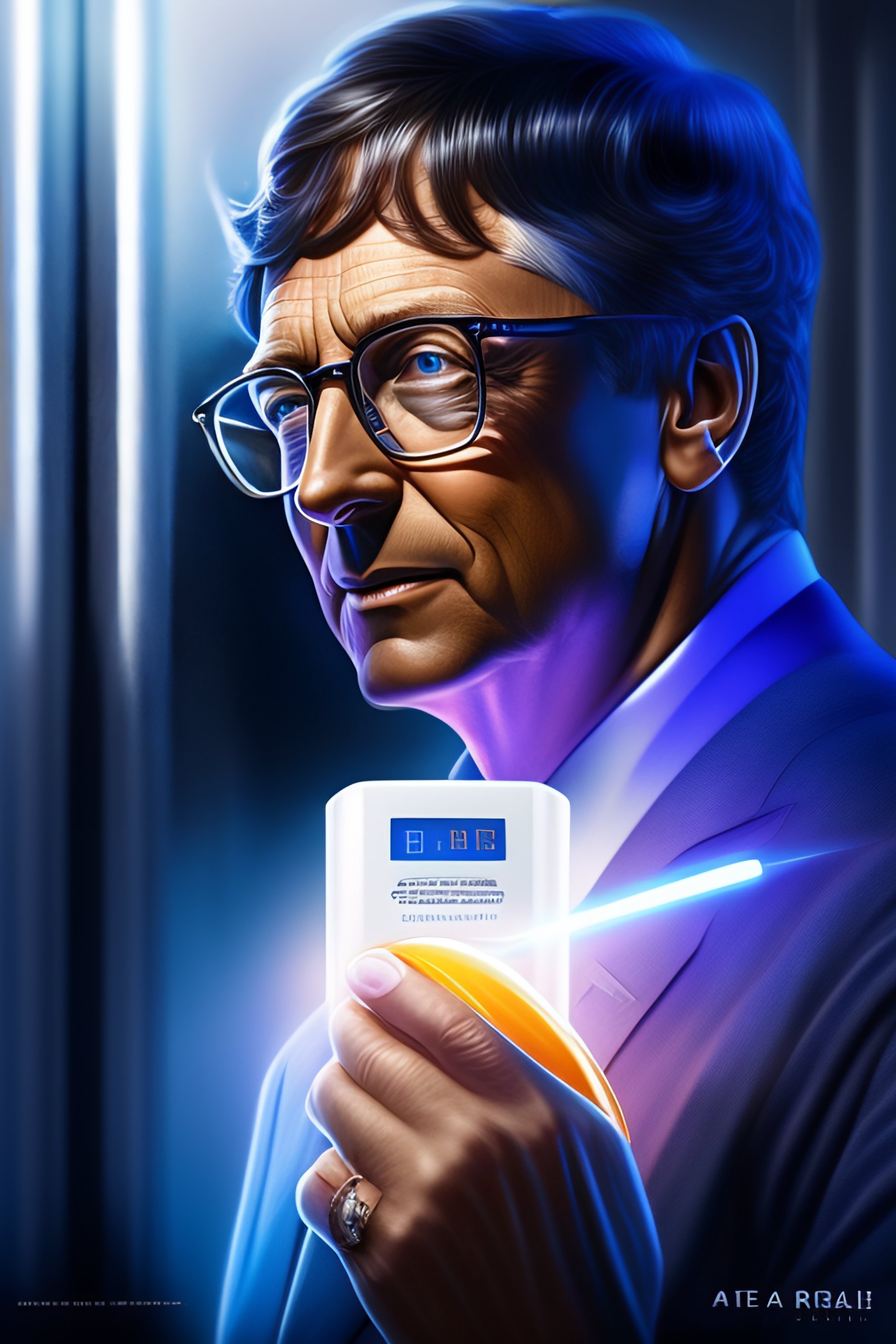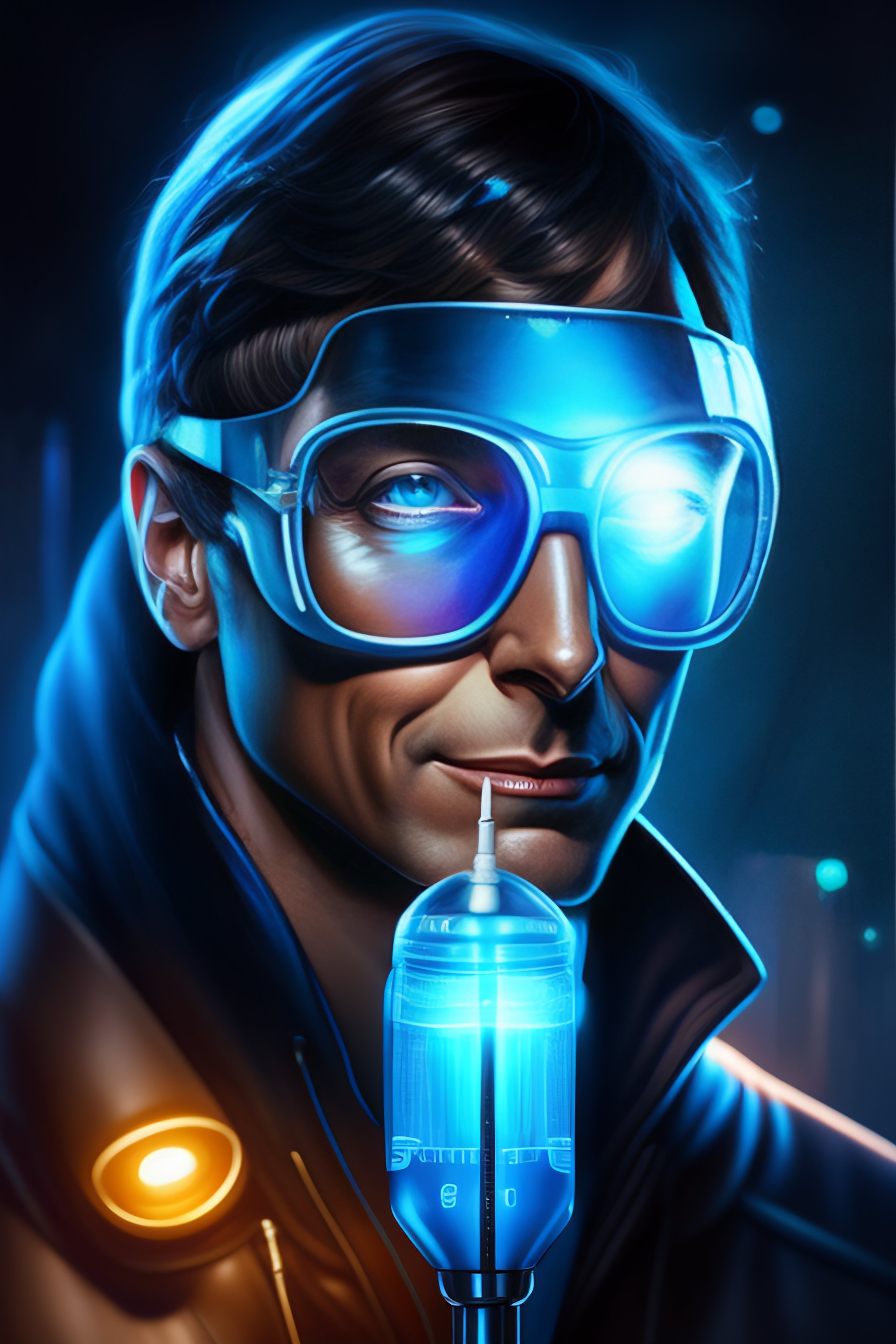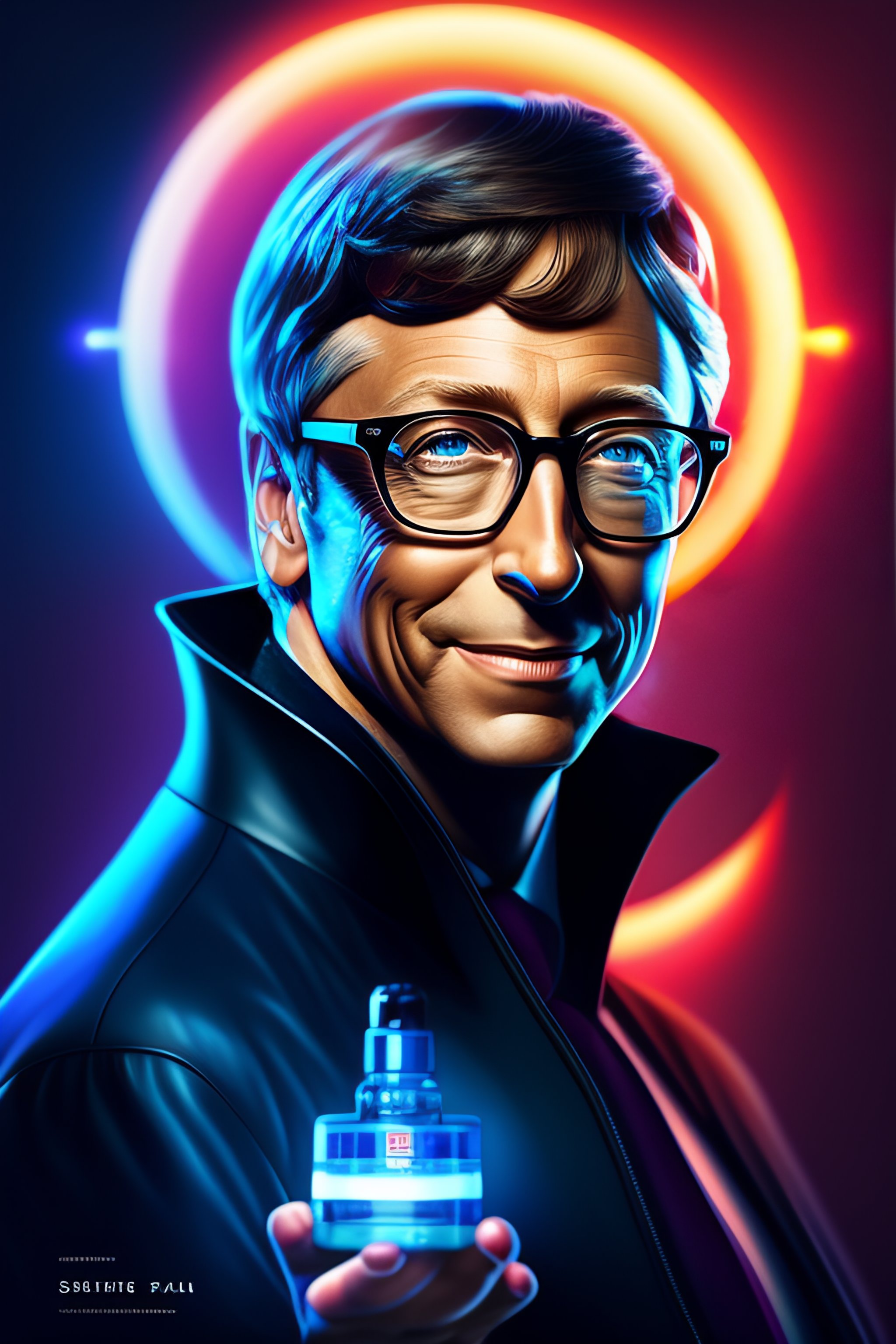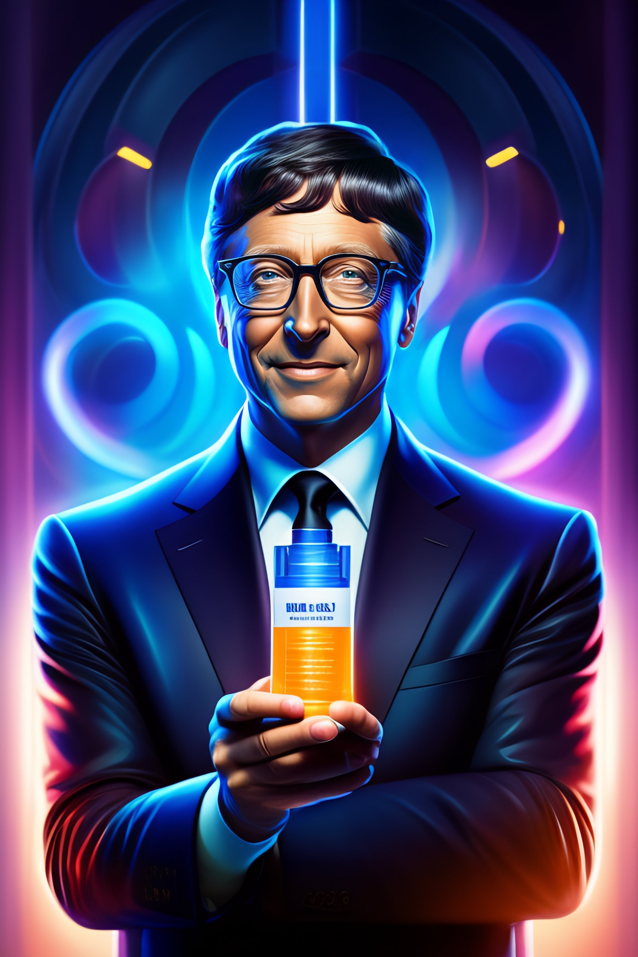 Portrait of bill gates holding a syringe, blue alien from they live, venom intricate, glowing lights, waist to top, highly detailed, digital painting, artstation, concept art, smooth, sharp focus, illustration, art by artgerm and greg rutkowski, artey freytag