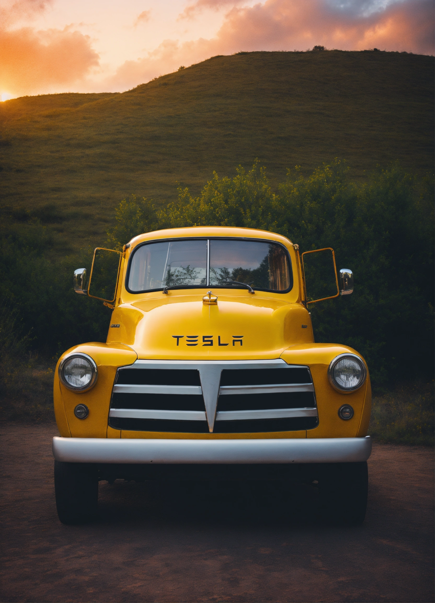 Tesla ford style truck with Tesla symbol on hood.