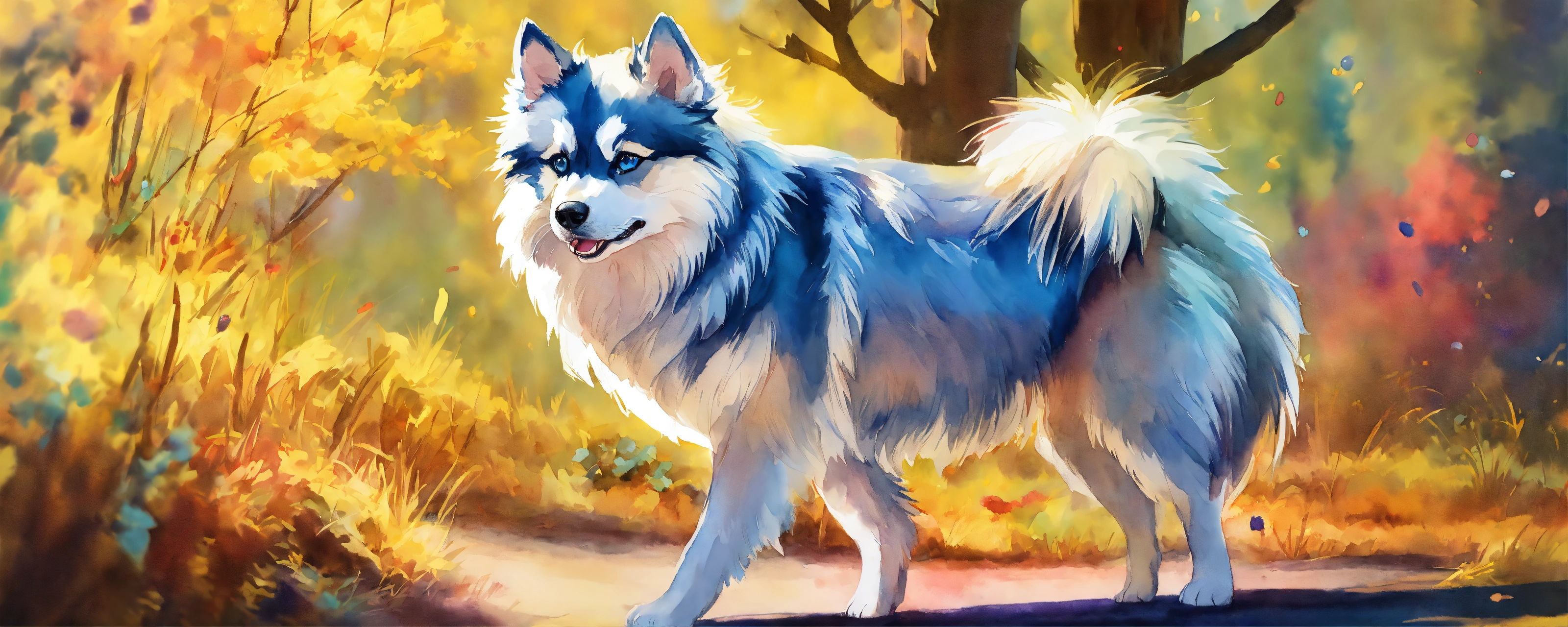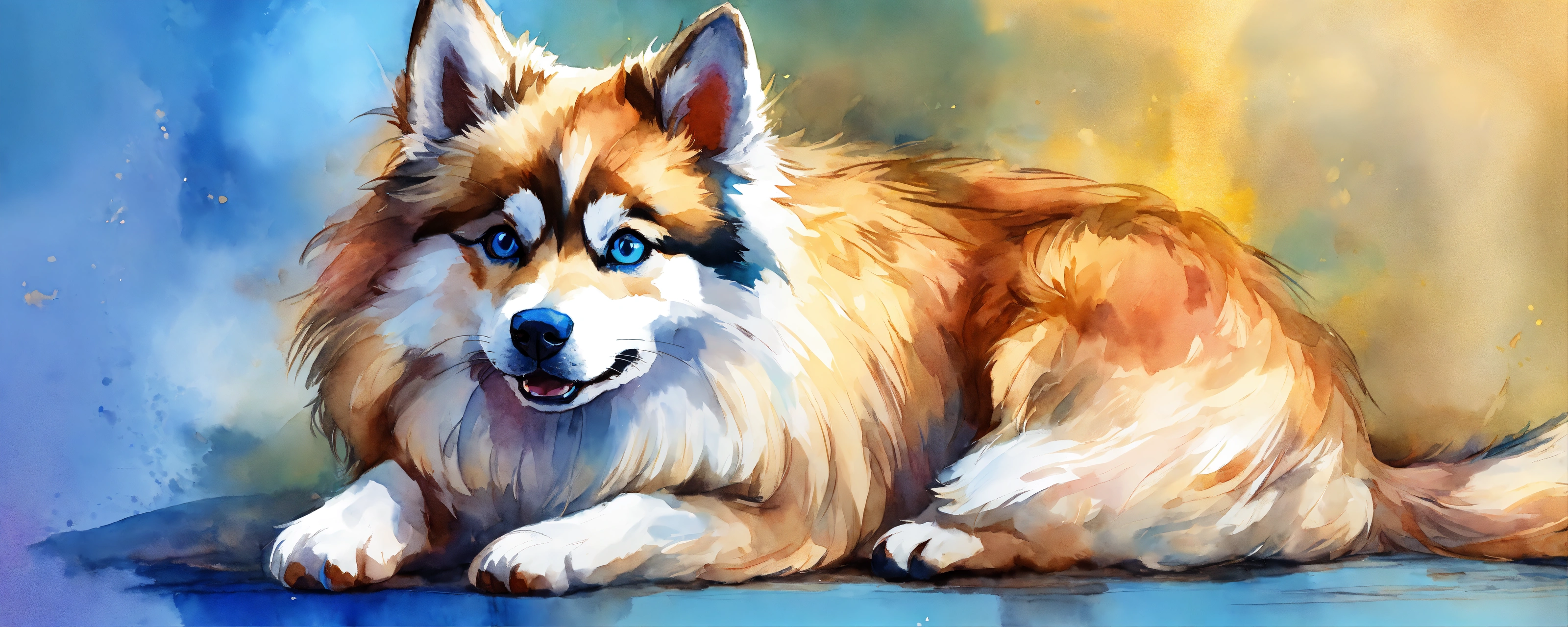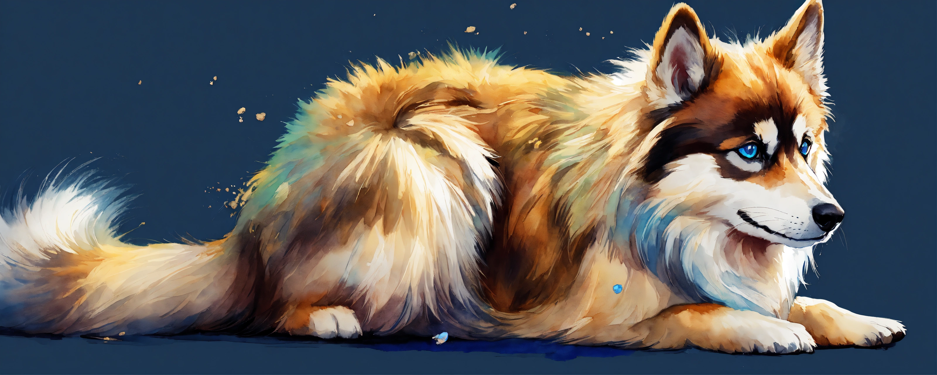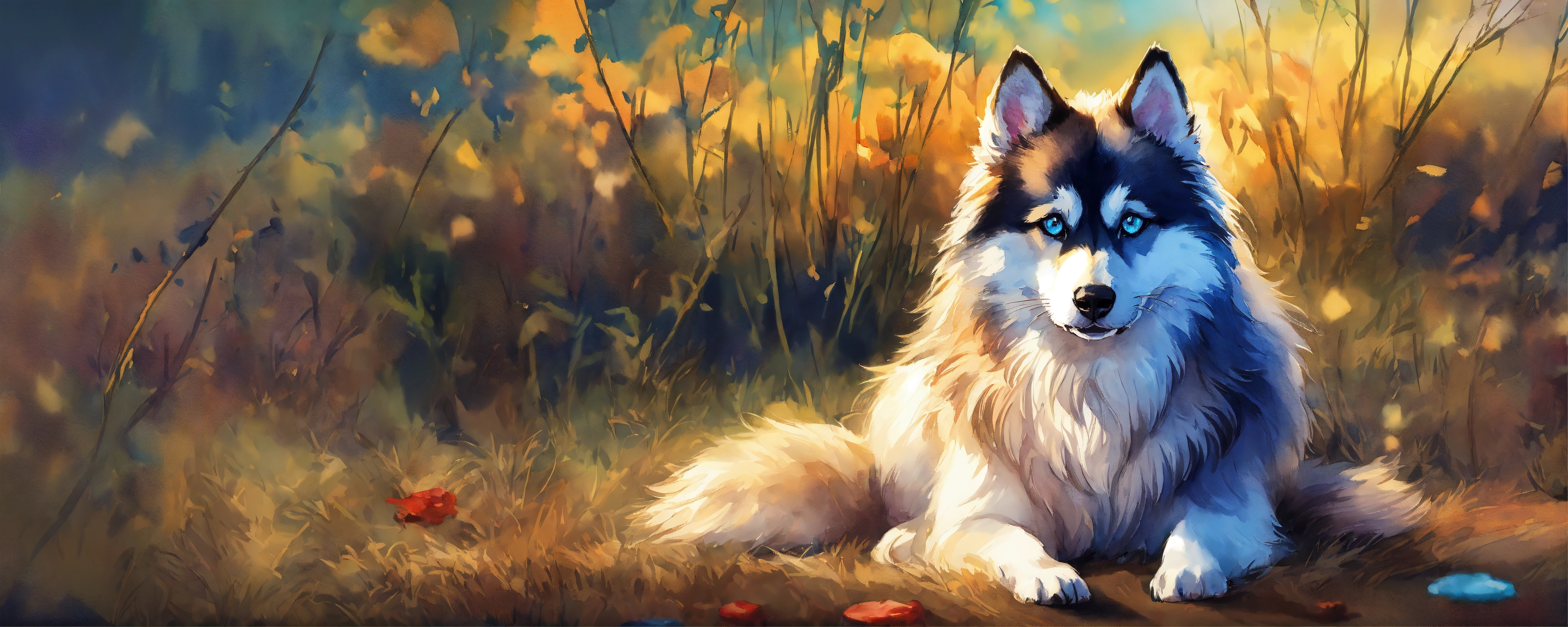 A full body image of a pomsky with long hair and blue eyes that digs and buries a bone, very detailed beautiful face, a freedom, soul, digital illustration, approaching perfection, vibrant, highly detailed, watercolor, artstation, concept art, sharp and smooth focus, very colorful illustration