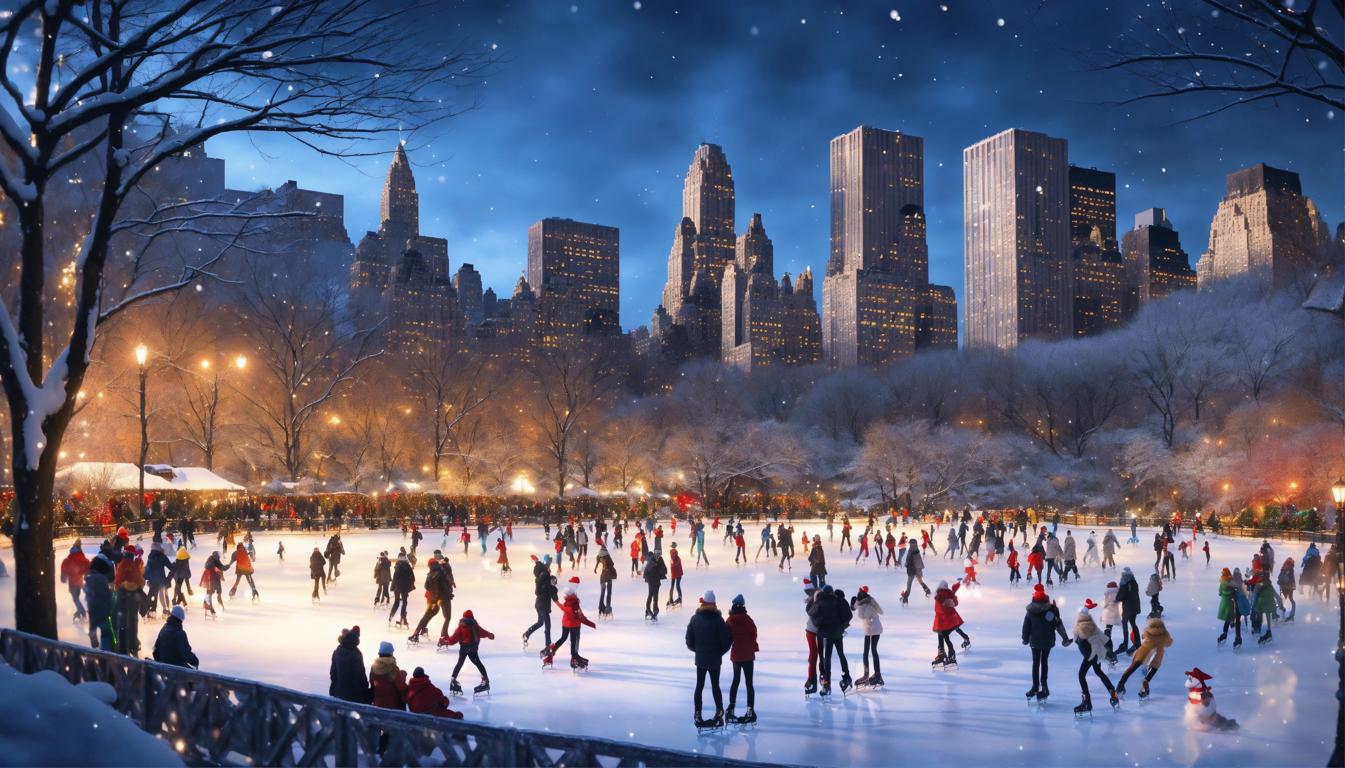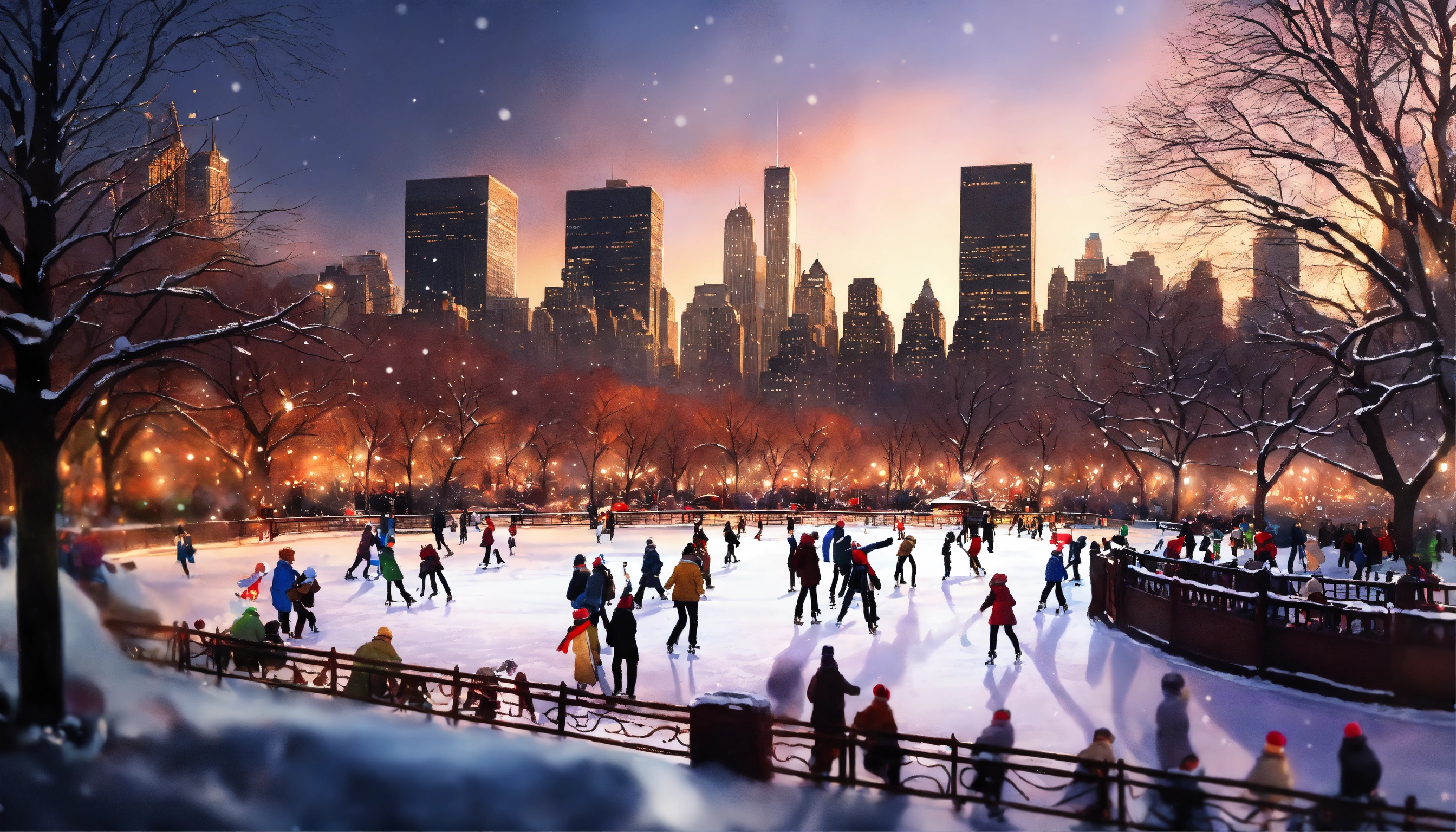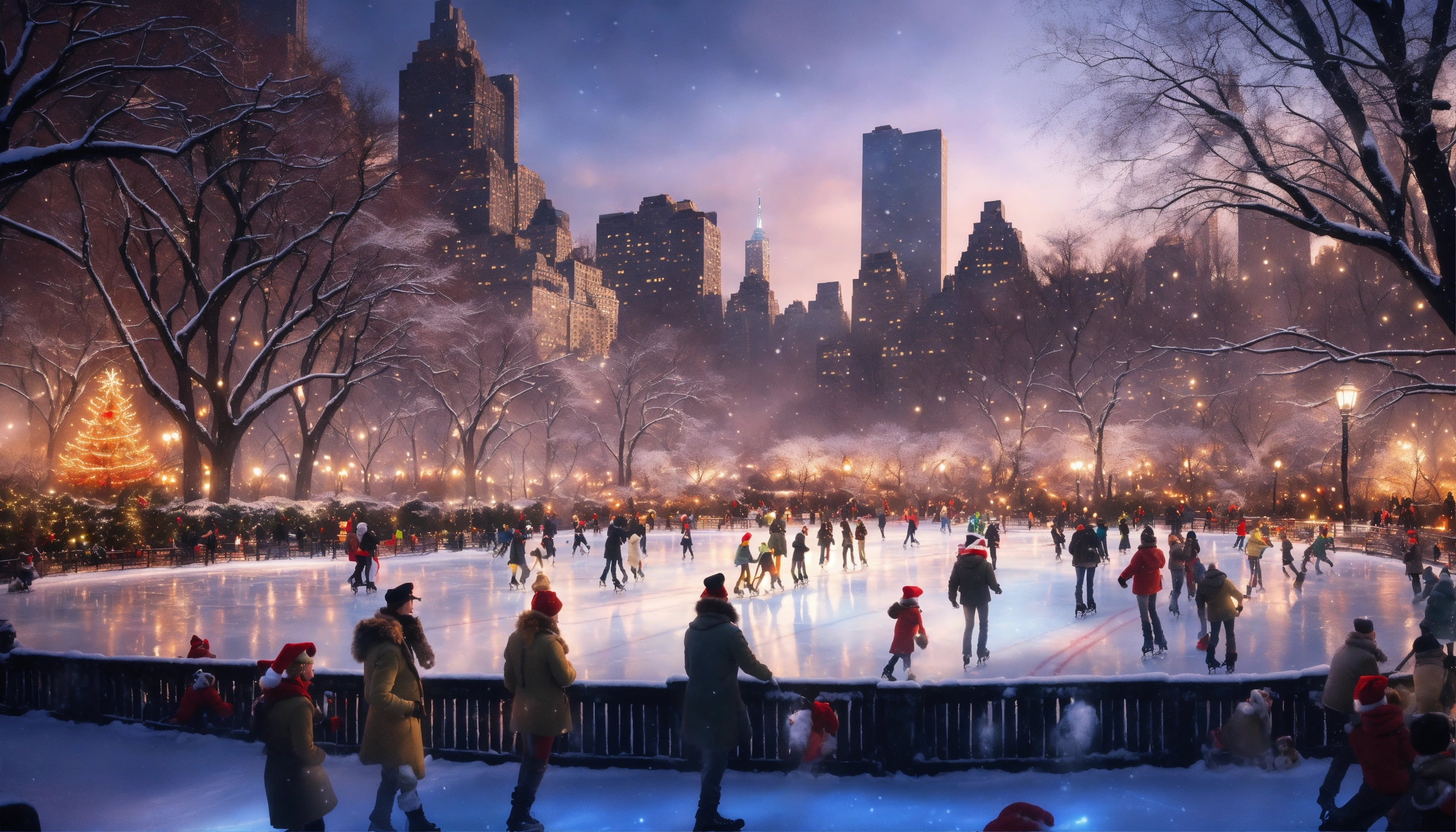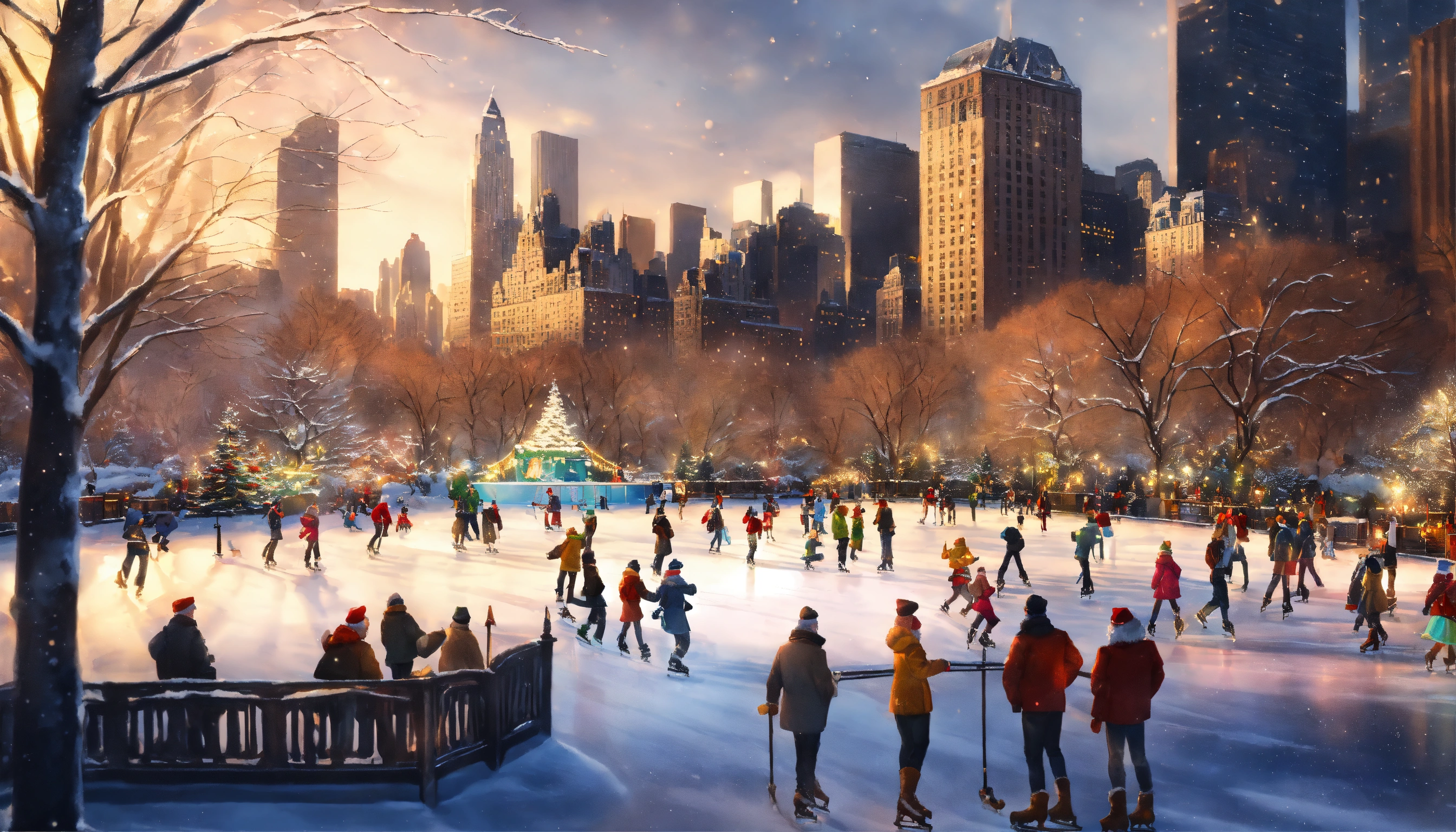 Epic shot of a ice skating in new york in central park, ultra cozy, full of details, digital painting, little photorealistic, sharp focus, new york 50s, magical place with christmas atmosphere, winter wonderland, luminous. ultra cozy and inviting place, wish to be there. very detailed, arty, should rank high on youtube for a dream trip.