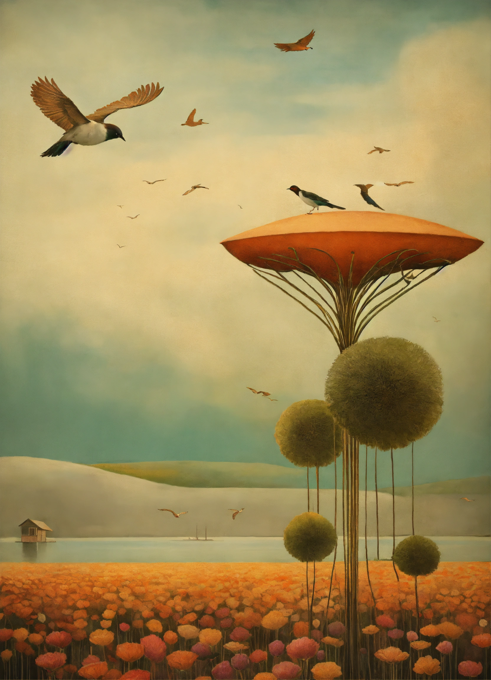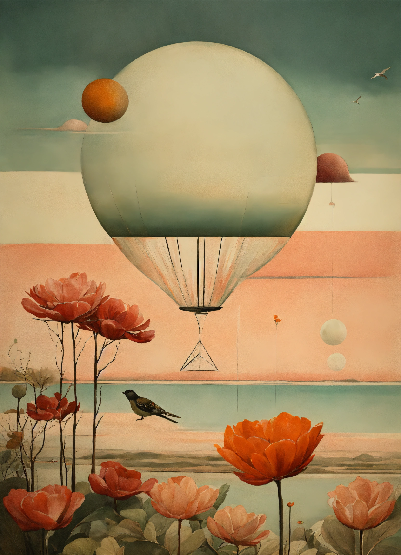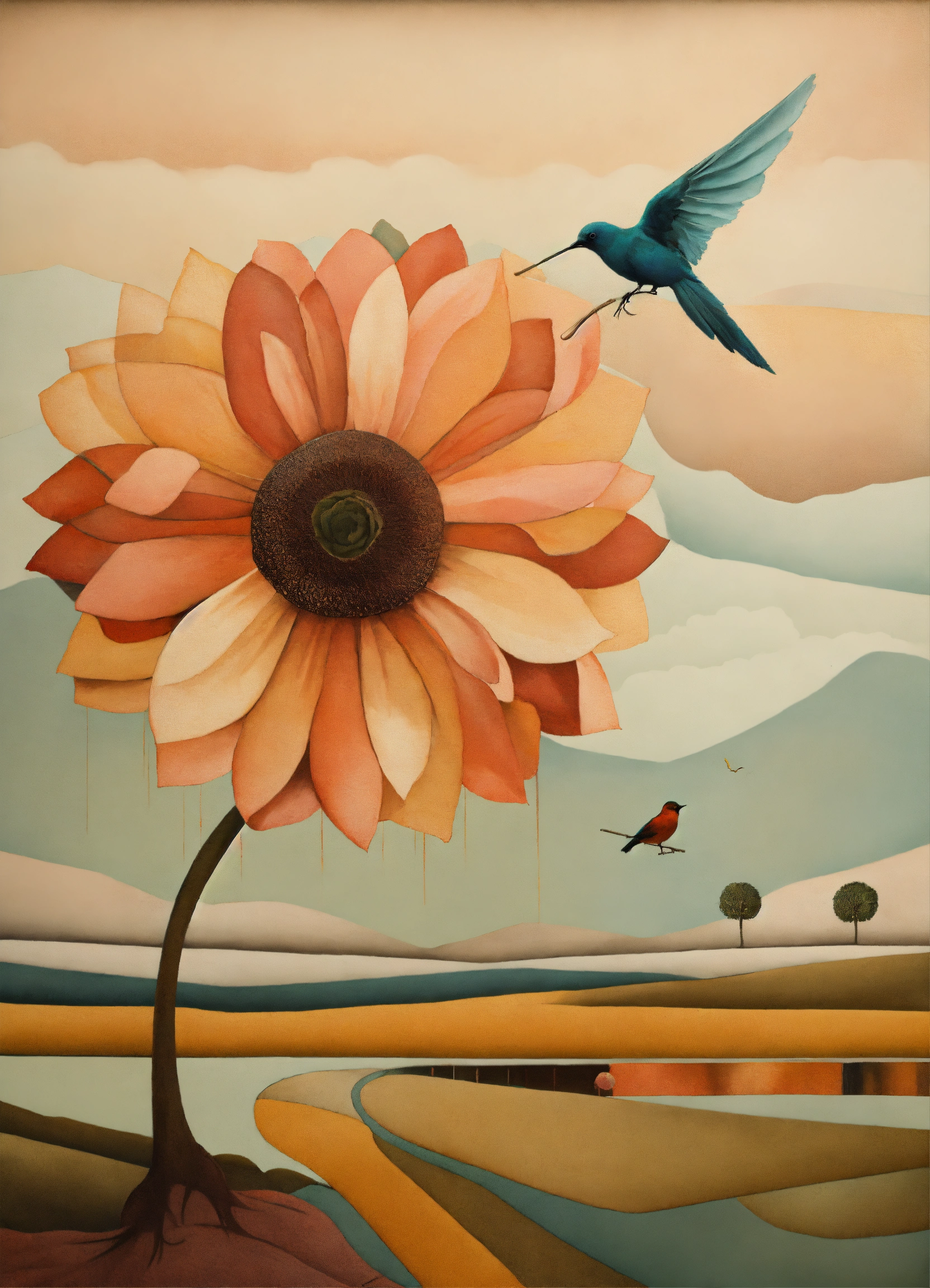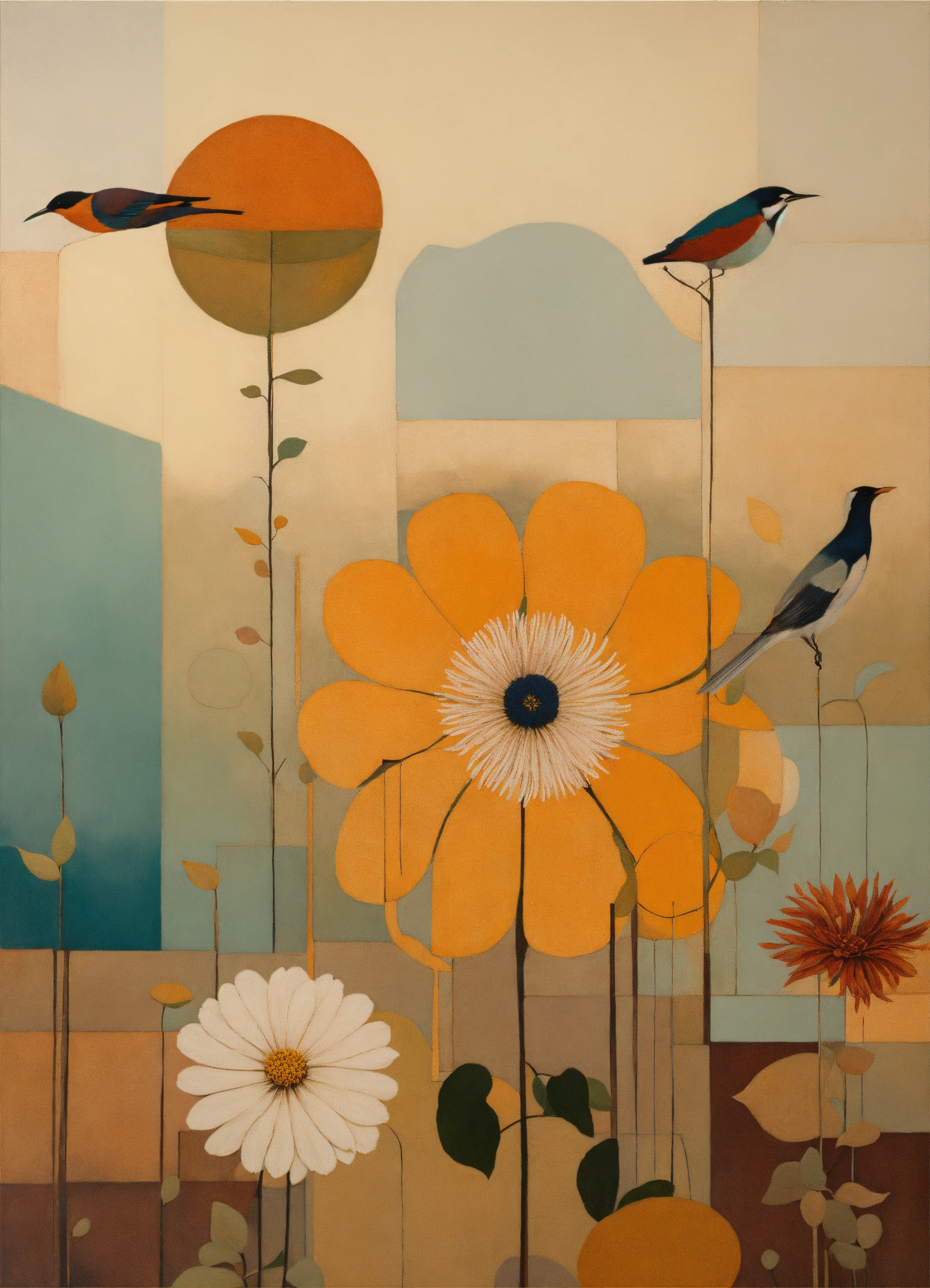 Muted tones colors surreal combination into empty canvas, evoking a sense of serenity, mid-century modern style, oneness of being, add birds and giant flower