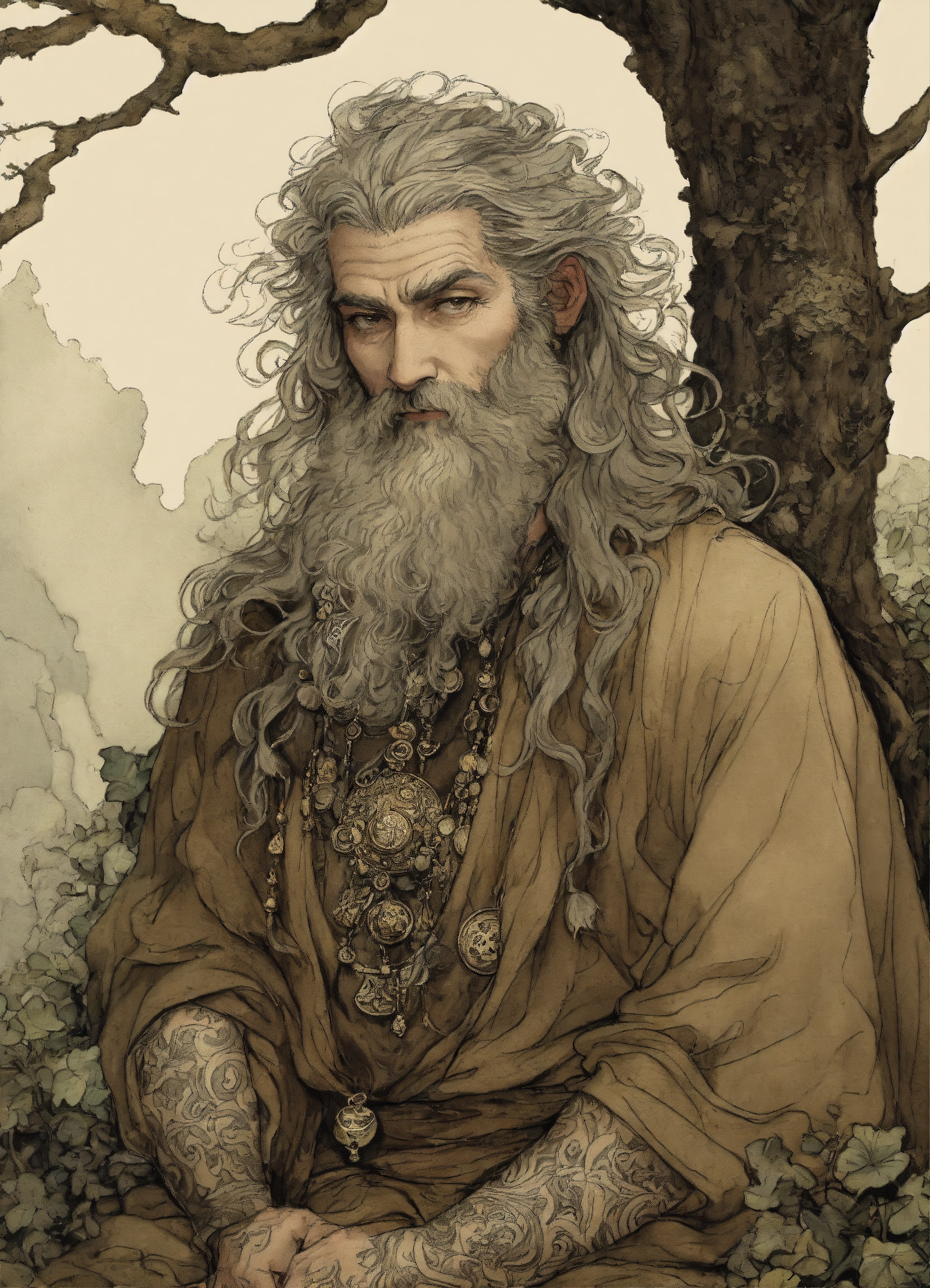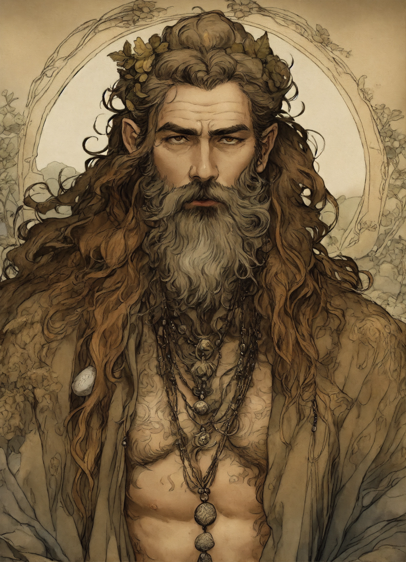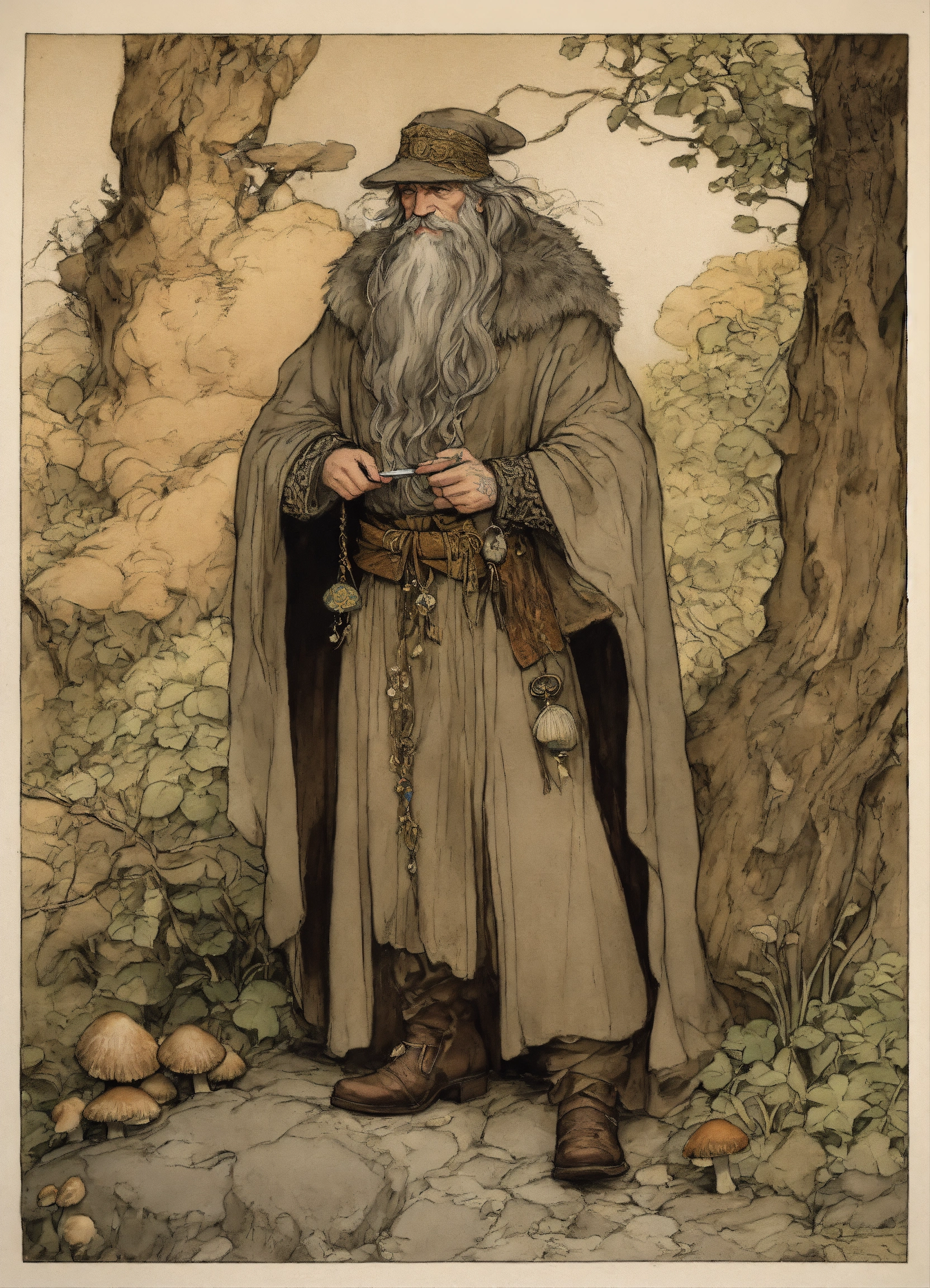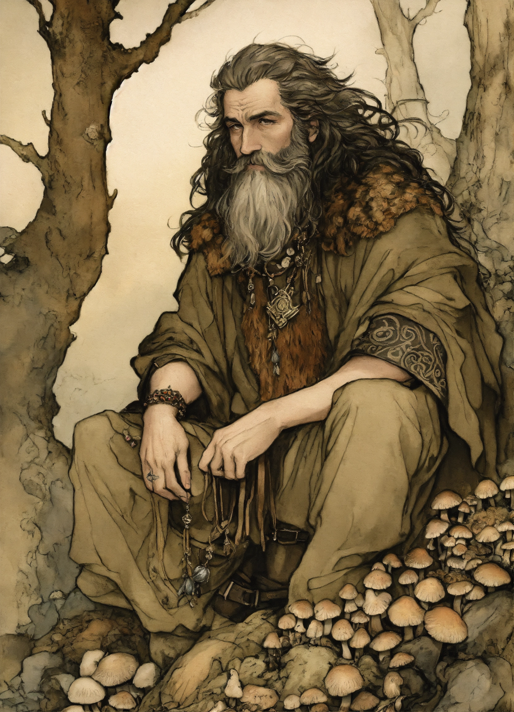 Illustration by arthur rackham, druid, ruggedly handsome, shirtless, bearskin cloak, hairy chest and tattooed 40 year old bearded man, fungus, mushrooms, druidic jewelry and fetishes, long gray hair, intricate details, highly detailed, enkidu, in the style of arthur rackham, 8k, brown auburn black, trichromatic printing