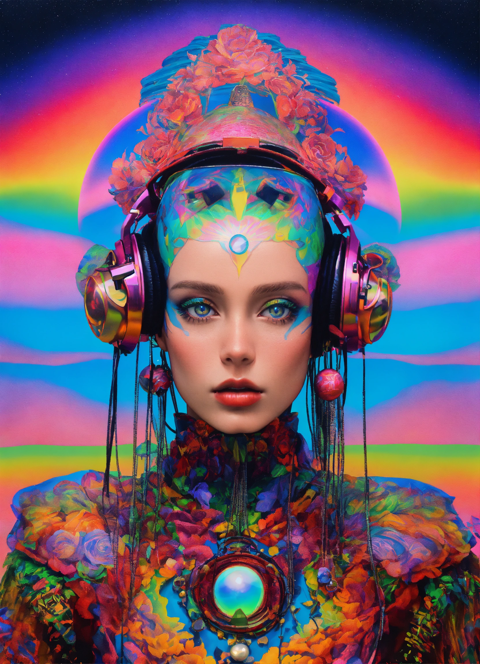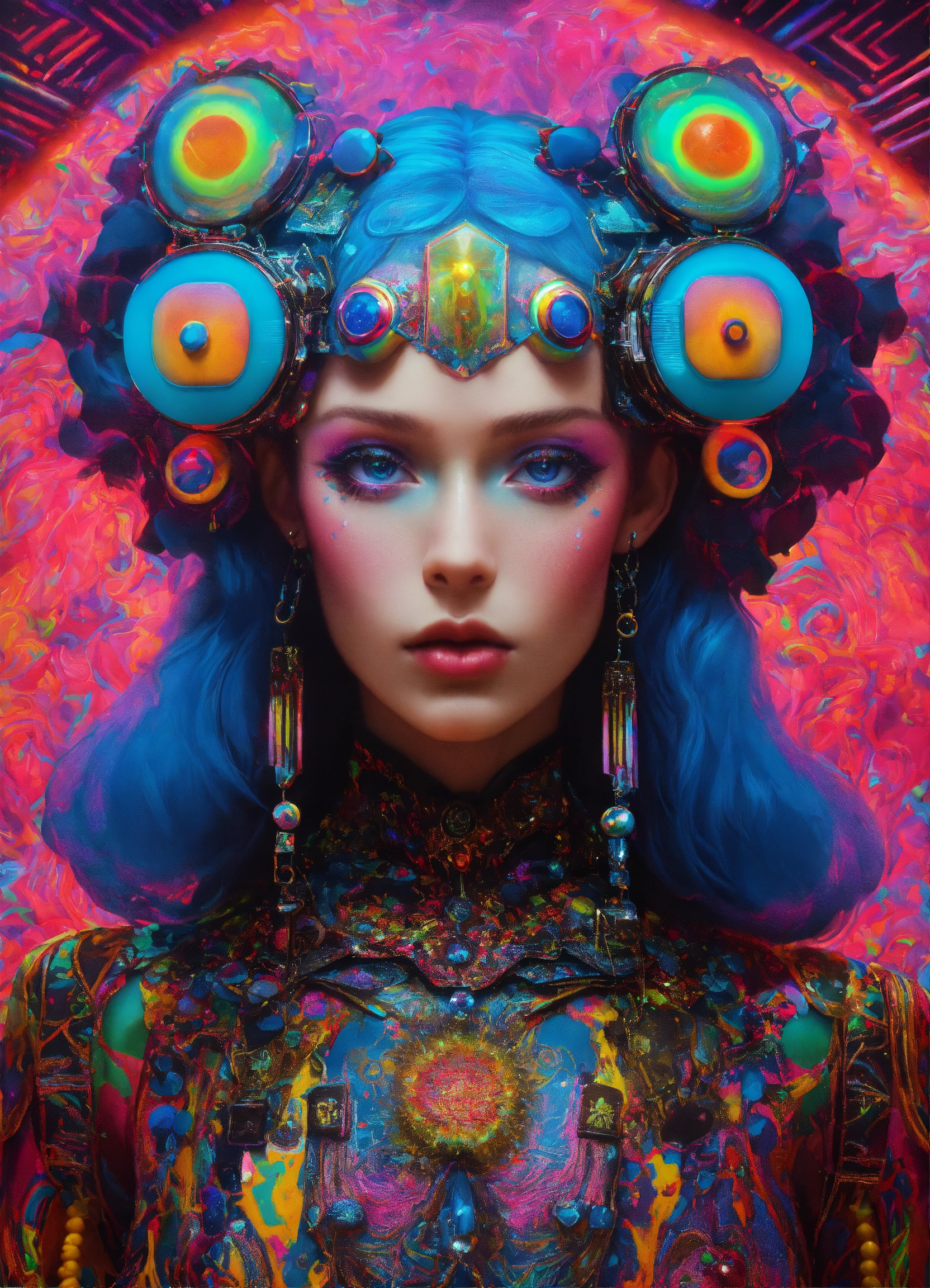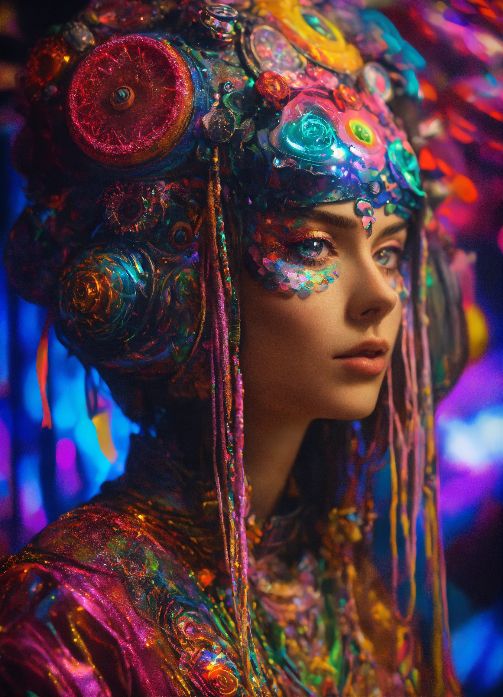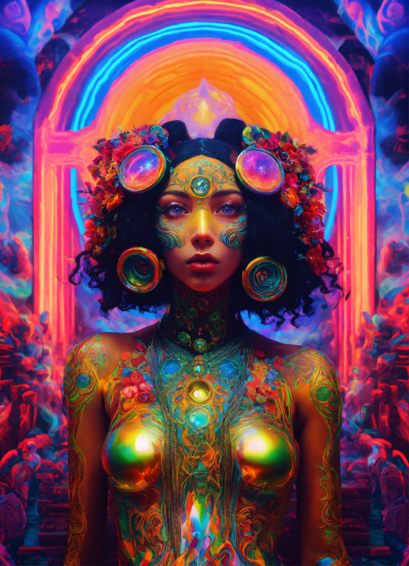 Photorealistic 3d 35 mm portrait of ai god dmt psytrance grimes punk rock anime haute couture costume, baptized in a cosmic alex grey painting in a dmt black laser light neon black rainbow glitter holographic techno club art by salvador dali and holy mountain the movie.