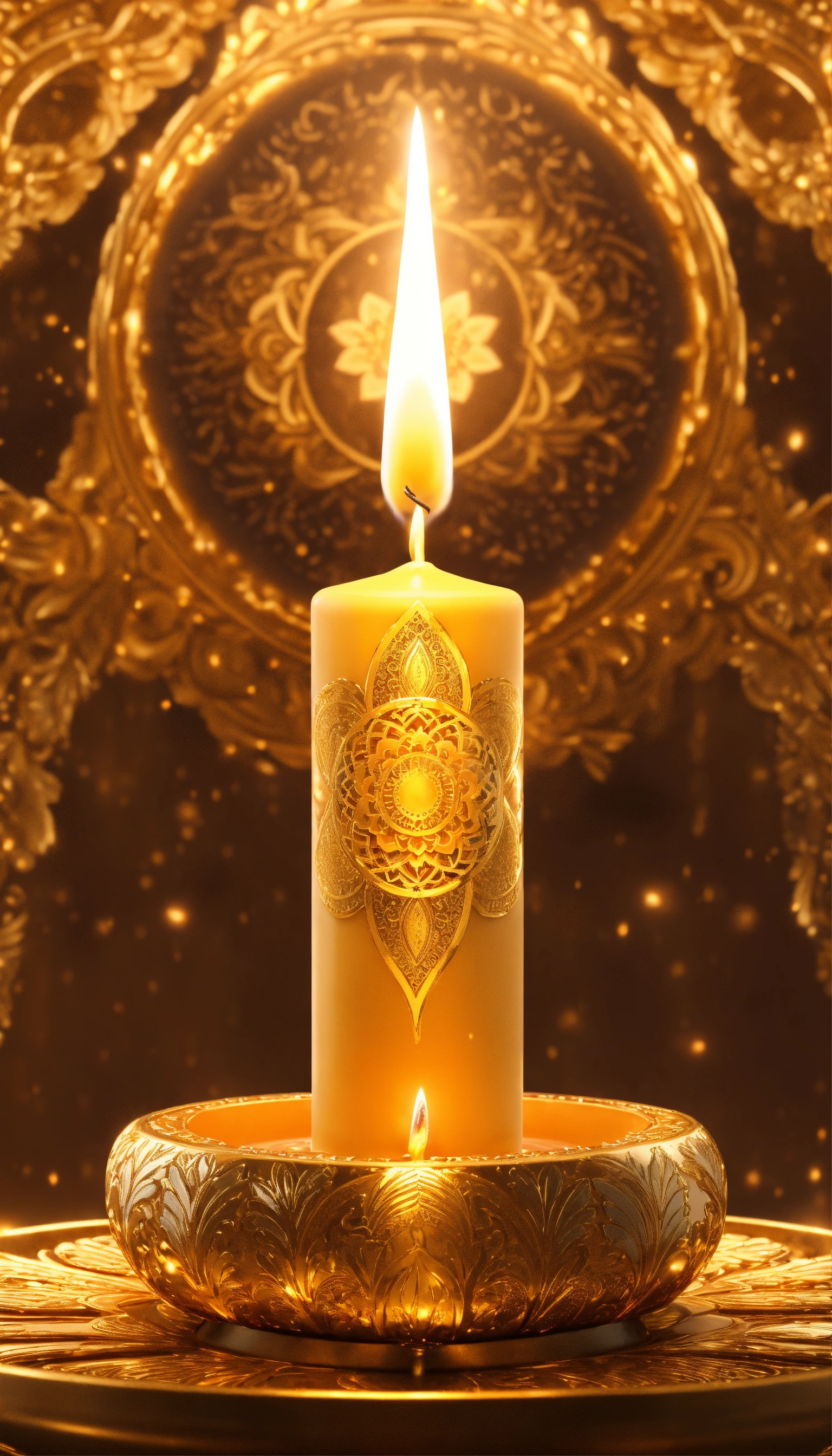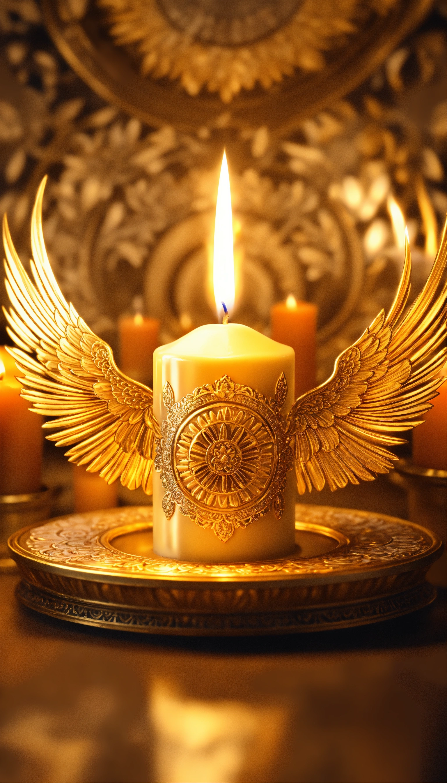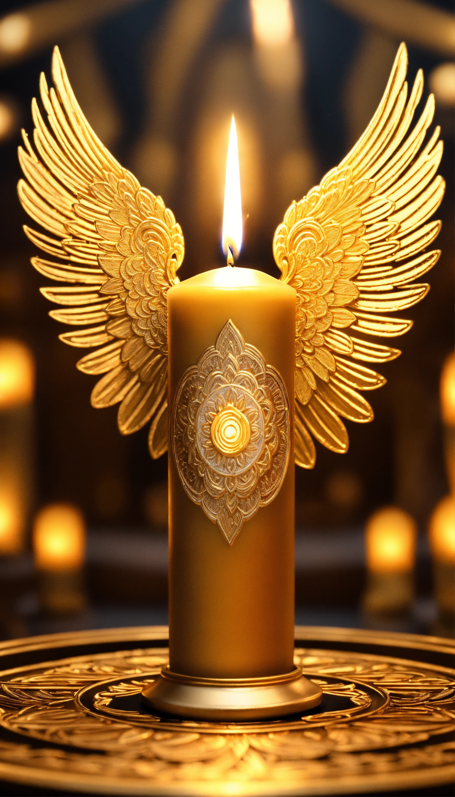Powerful, detailed candle, digital illustration, real, 3d, golden colored candle with a yellow flame with white and golden details, on each side of the candle there are detailed and large wings, luminous golden mandala shape background, sharp focus, illustration cinematic, 8k, hyperrealistic digital painting, hd, high quality and resolution.
