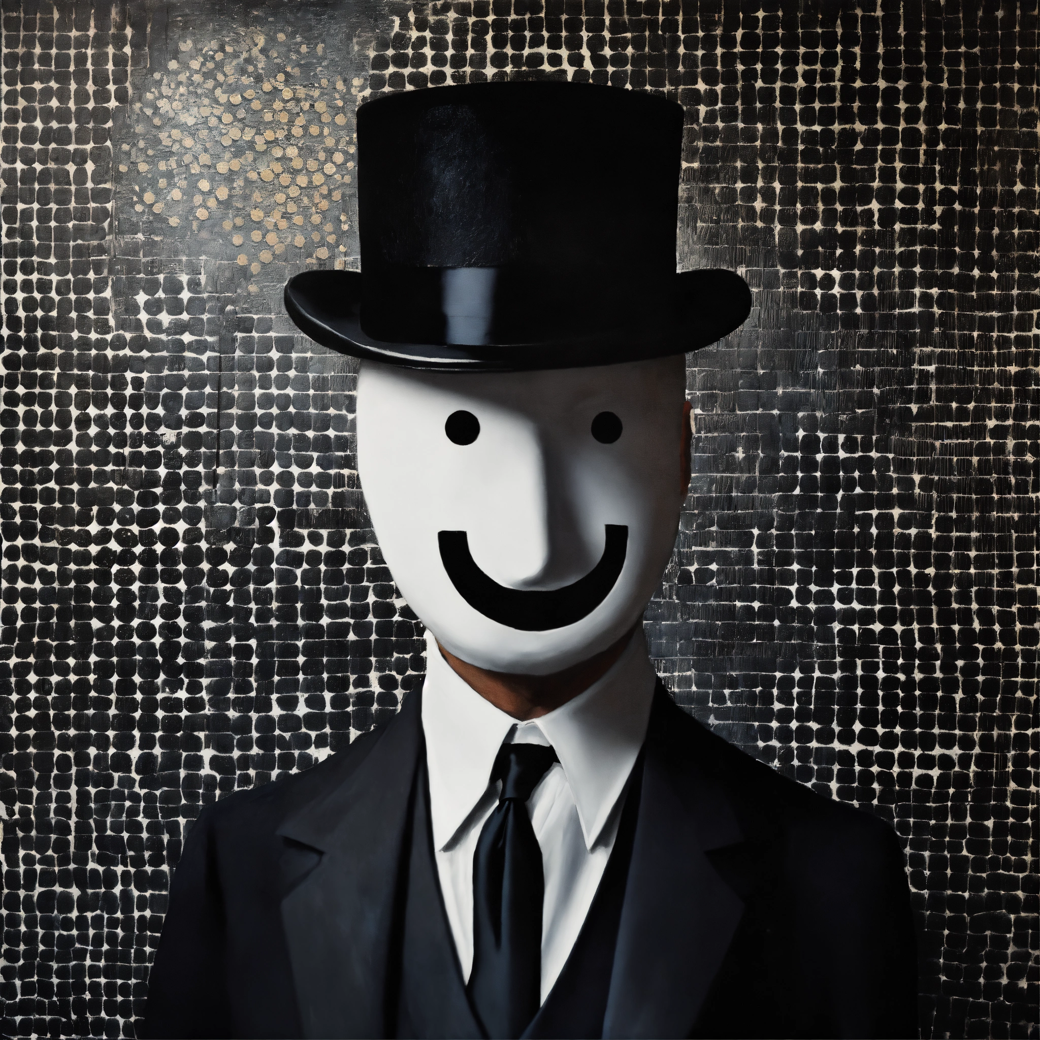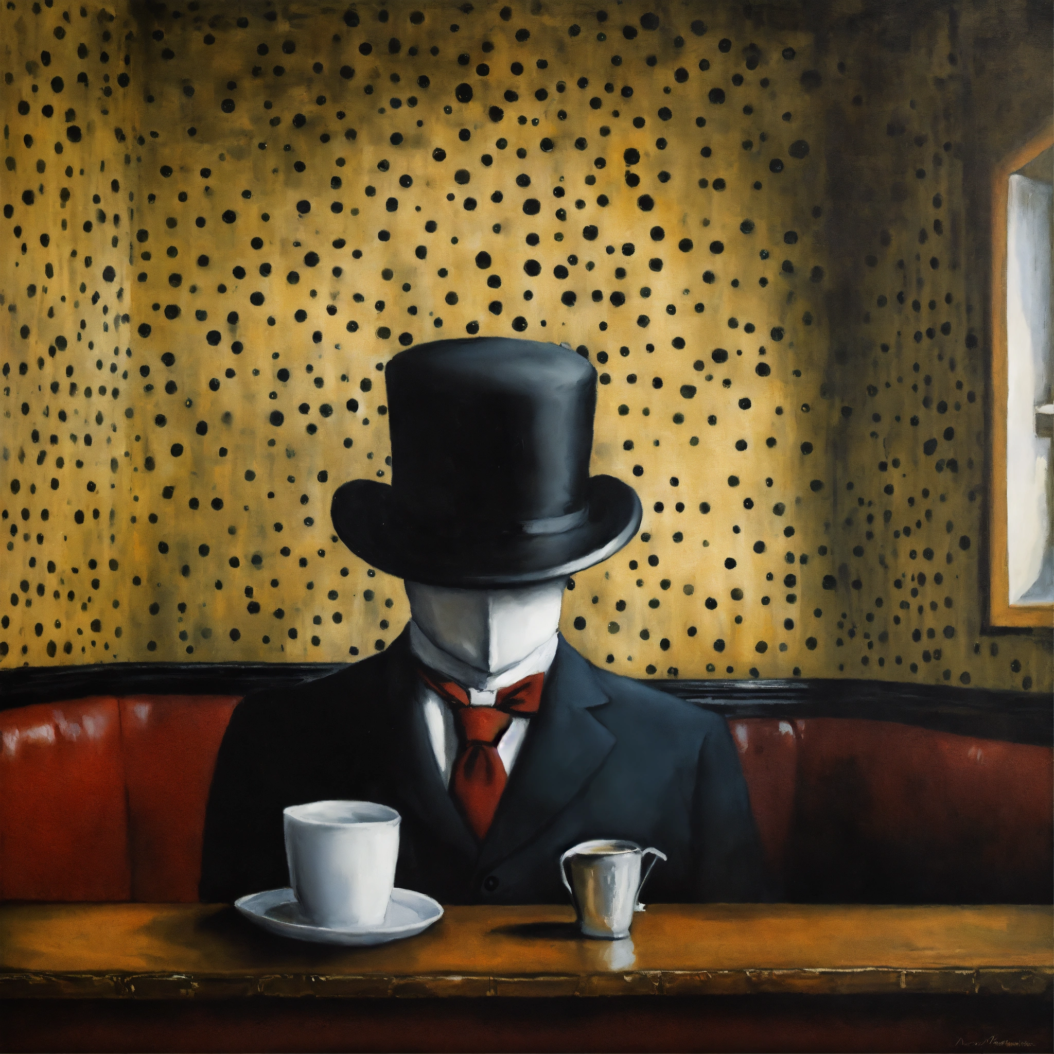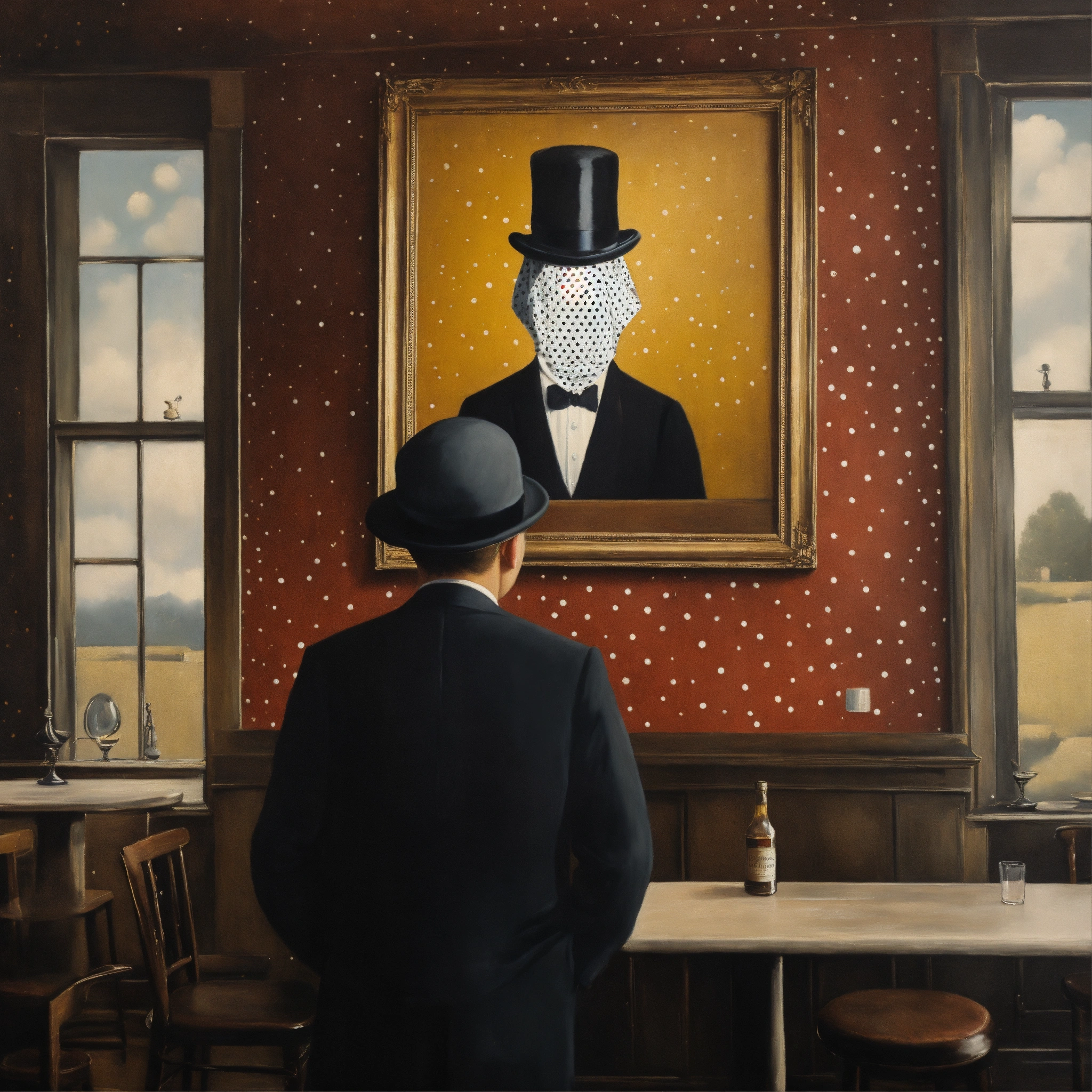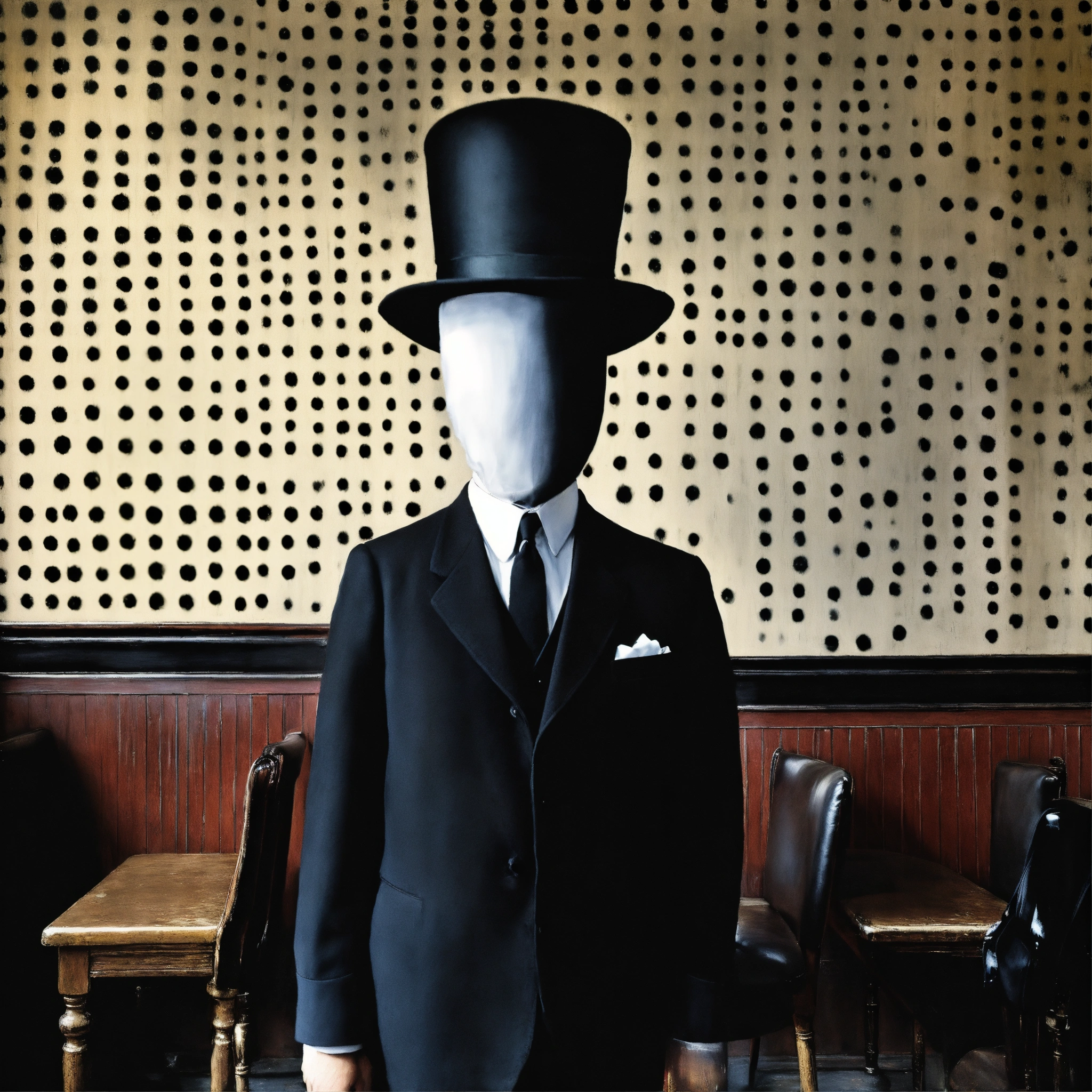 Magician, oil painted texture by rene magritte with no face with bowler hat.black and white small polkadot wall paper in a old pub setting.the man with no face.more surreal bizarre ideas