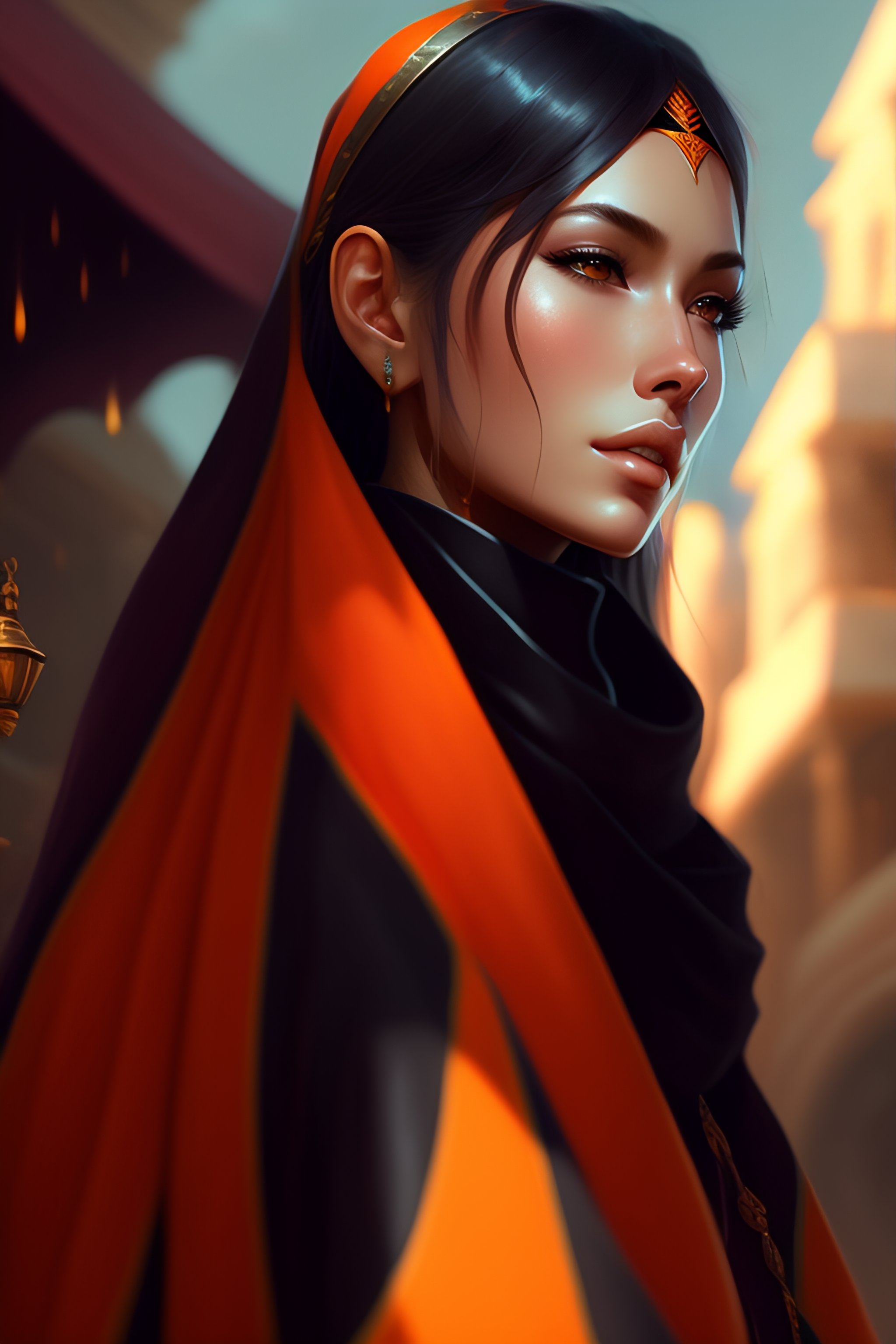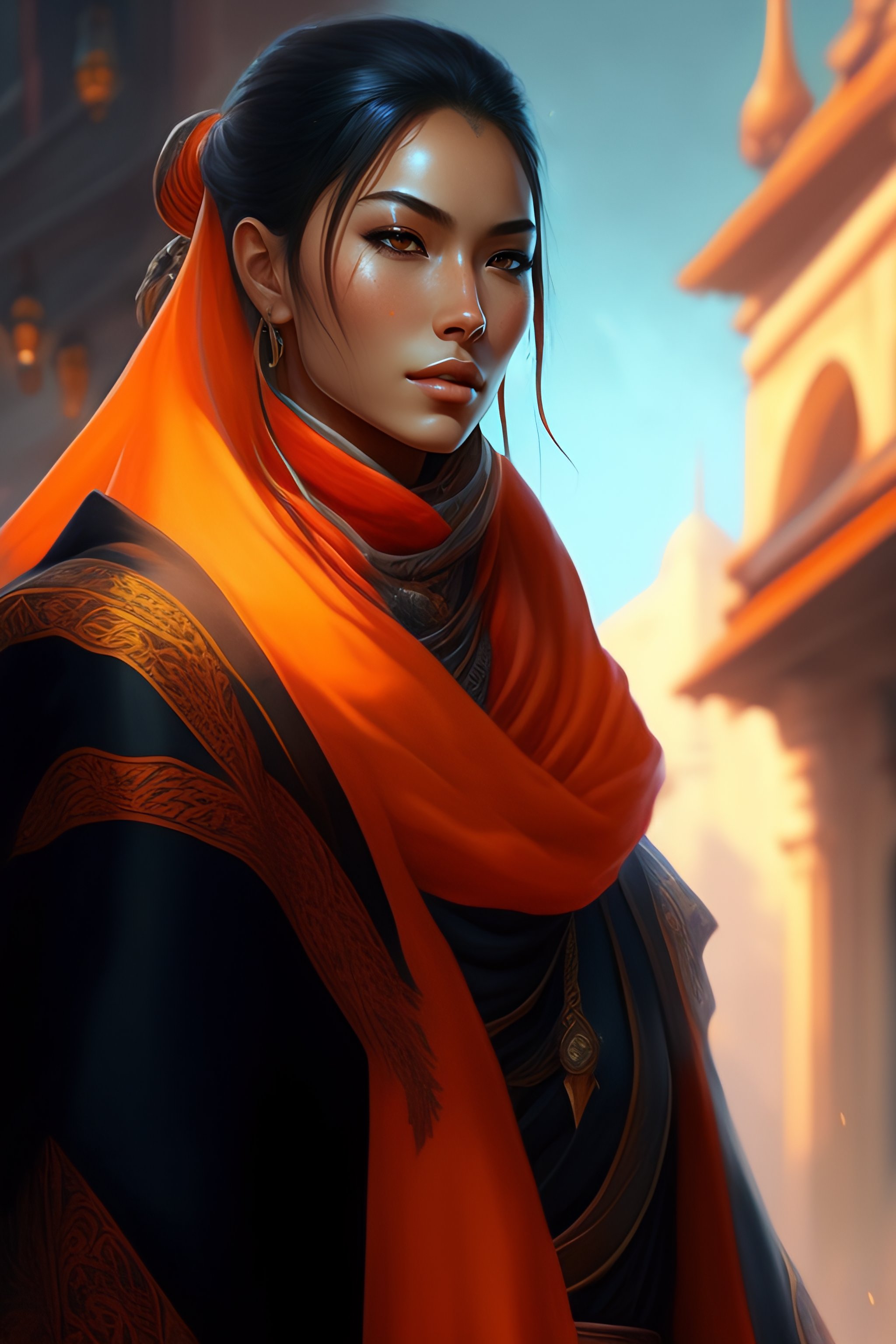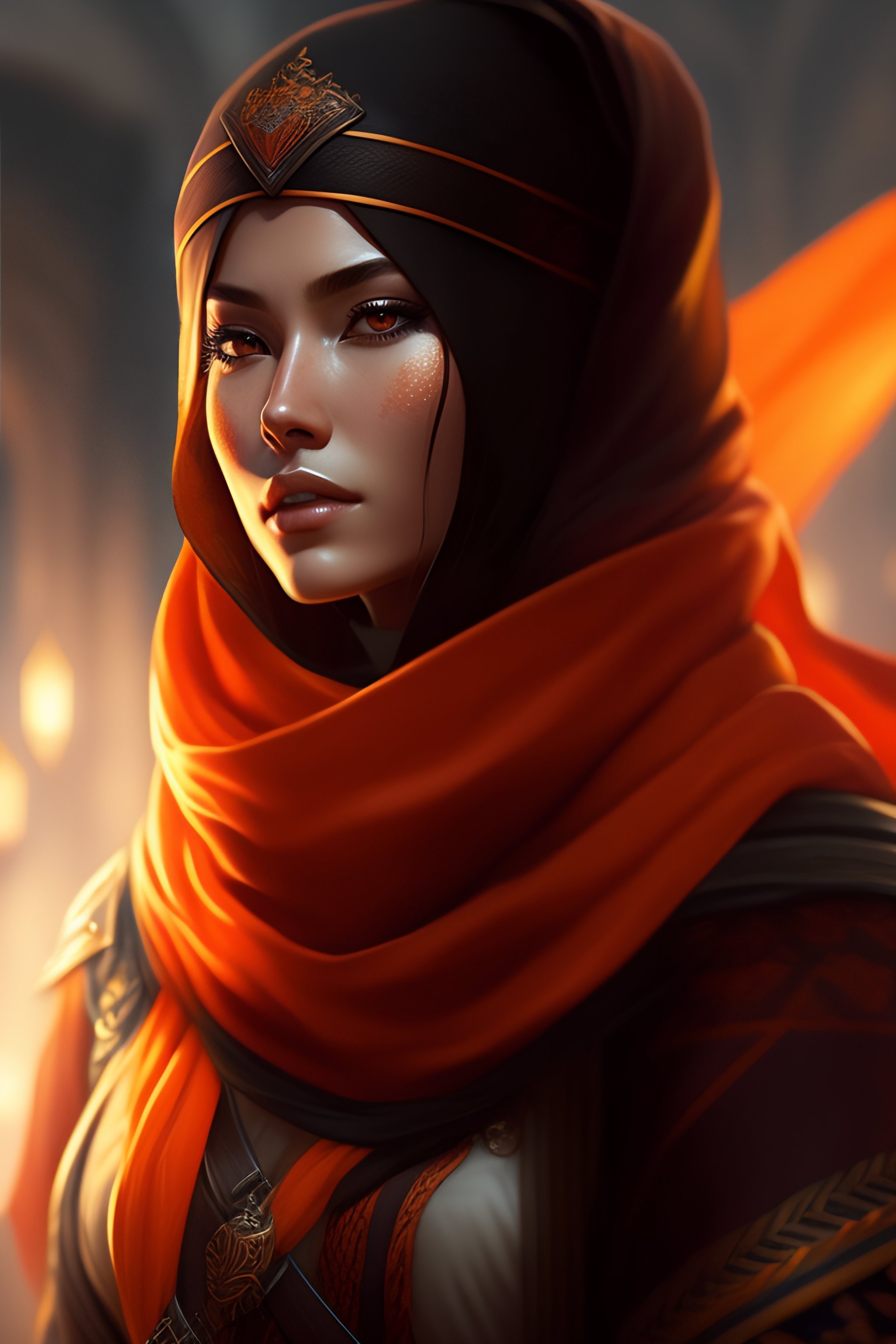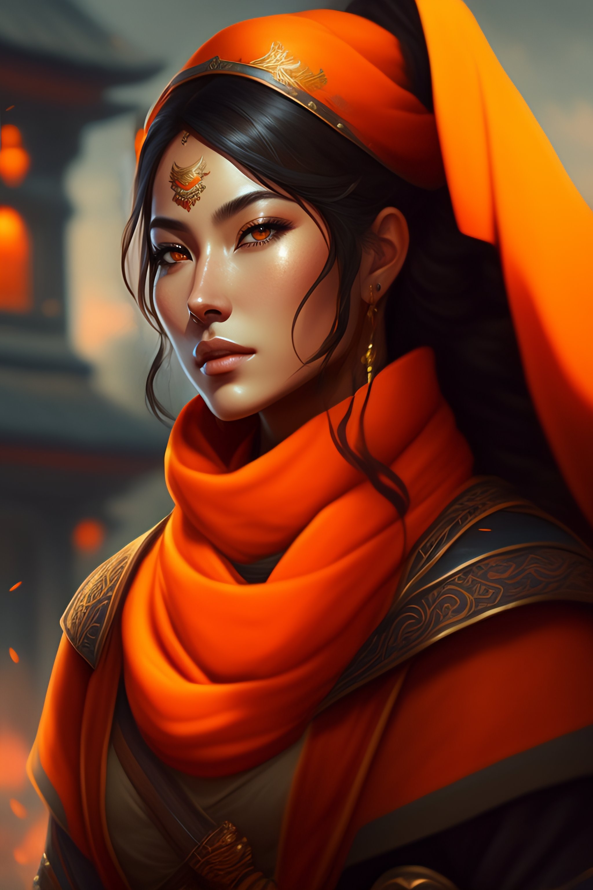 Orange-black lizzard warrior of hiyabusa square, scarf, sword and shield, close up, details, sharp focus, elegant, highly detailed, illustration, by jordan grimmer greg rutkowski wlop maya takamura, intricate, trending artstation, pixiv, digital art