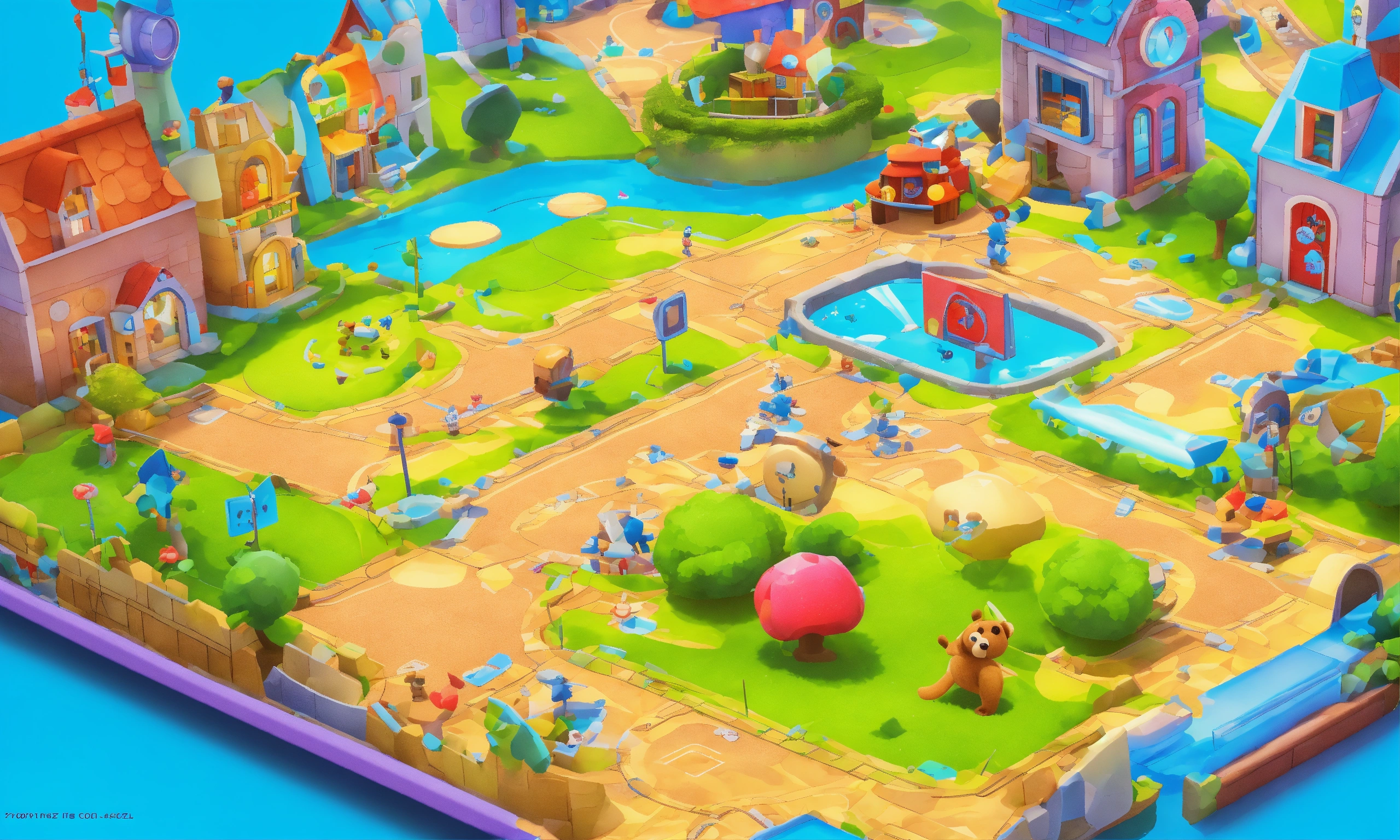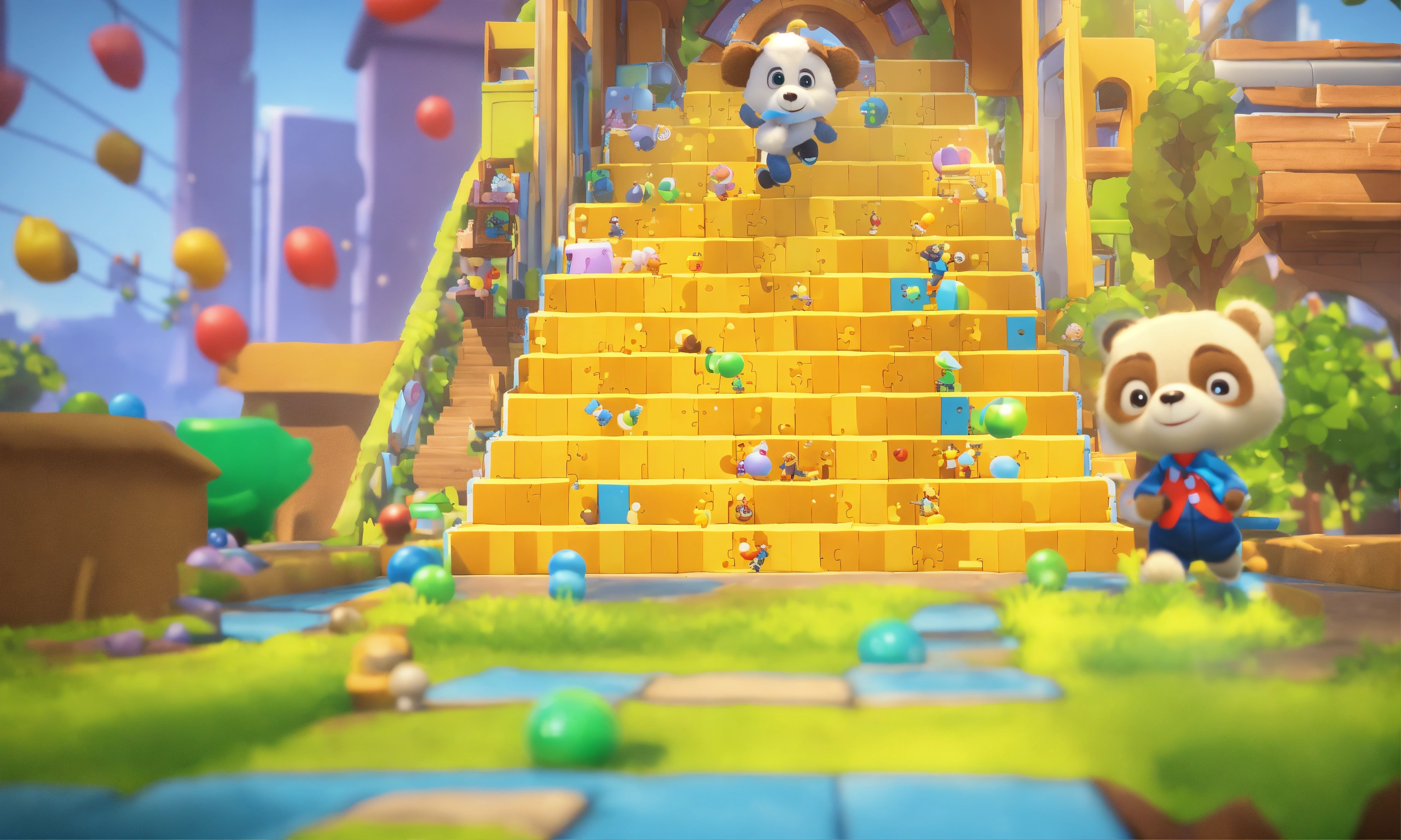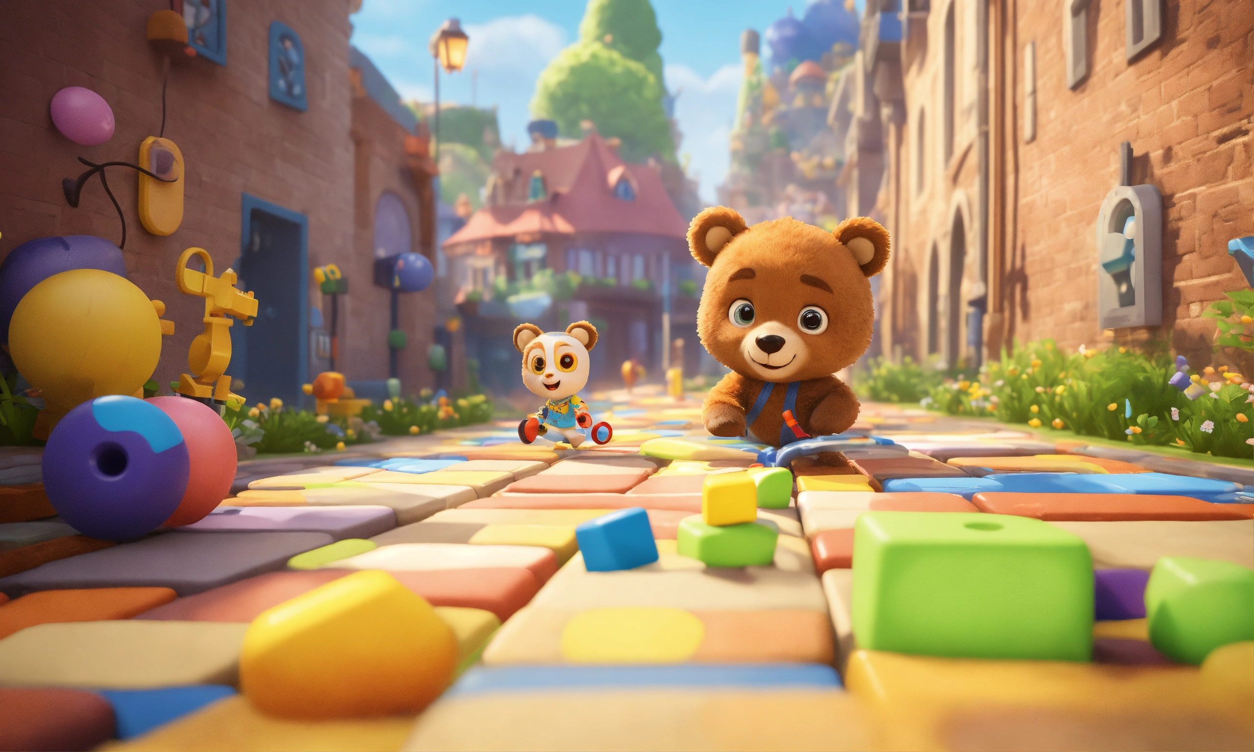 A portrait of a cute find a toy codex from bear kids, target route, combines activity as running and puzzle solving, player find pieces of puzzle scattered different parts of city, use them to solve bigger puzzle, navigate way through obstacle course with joystick in the style of pixar animations