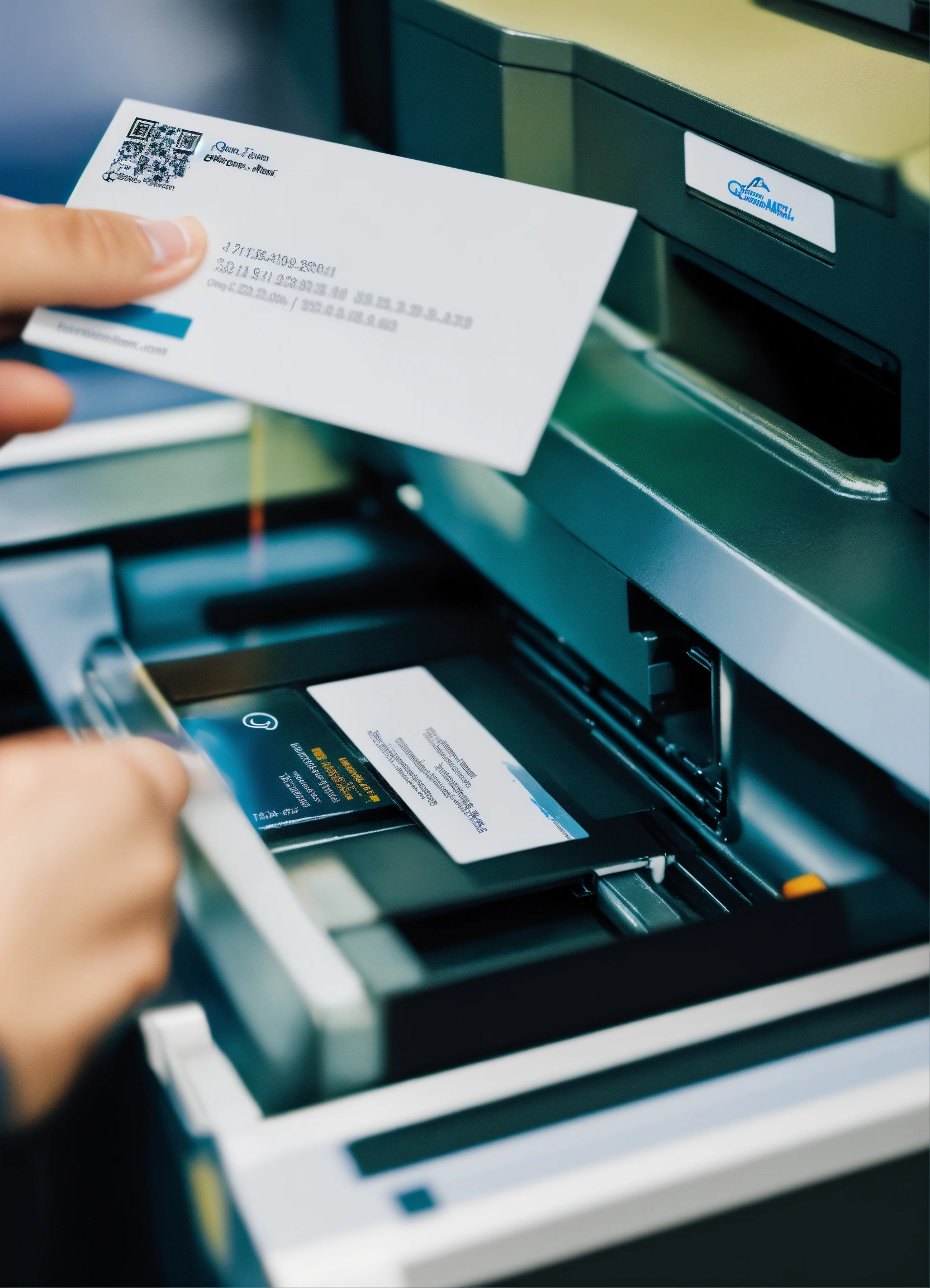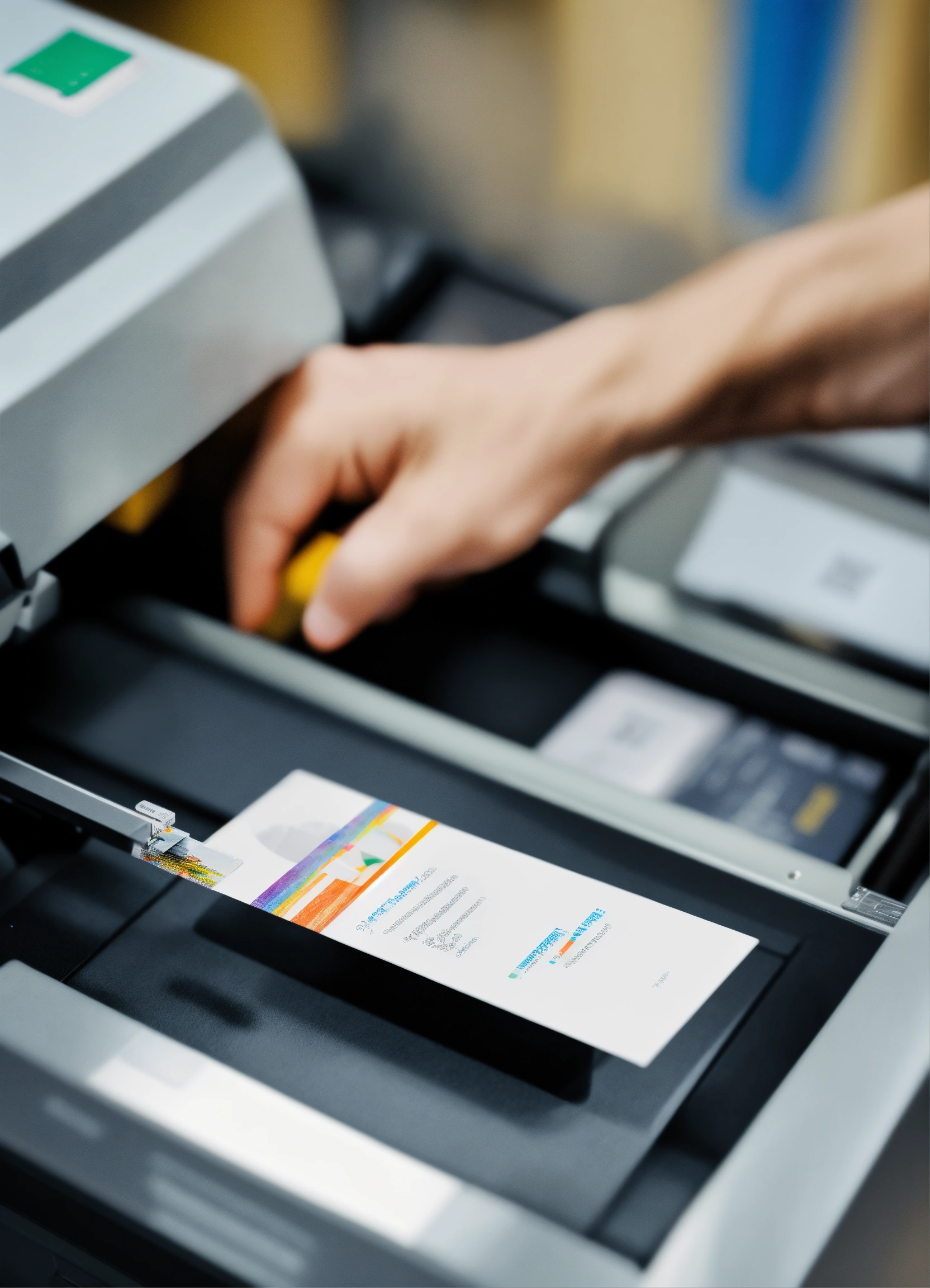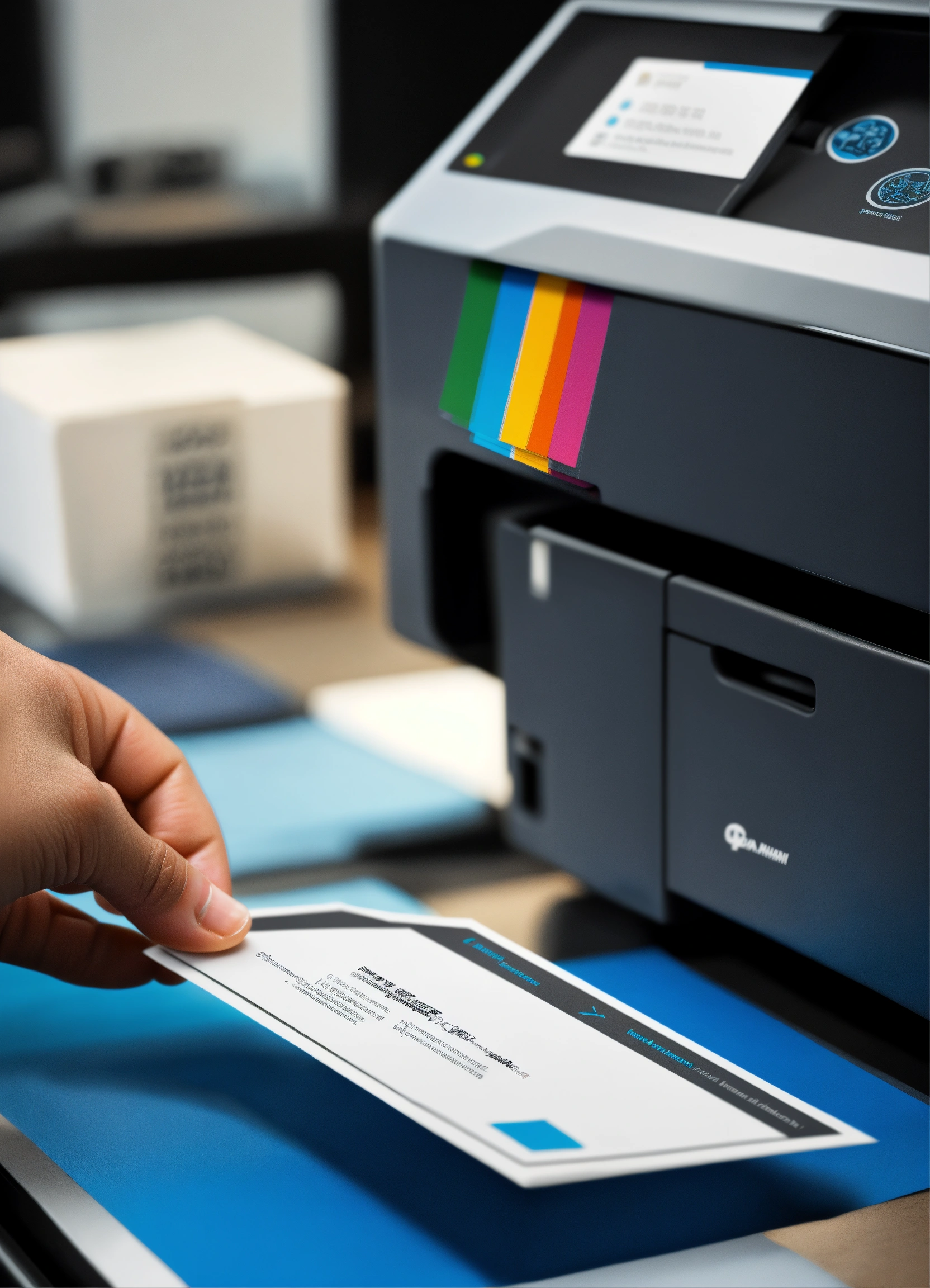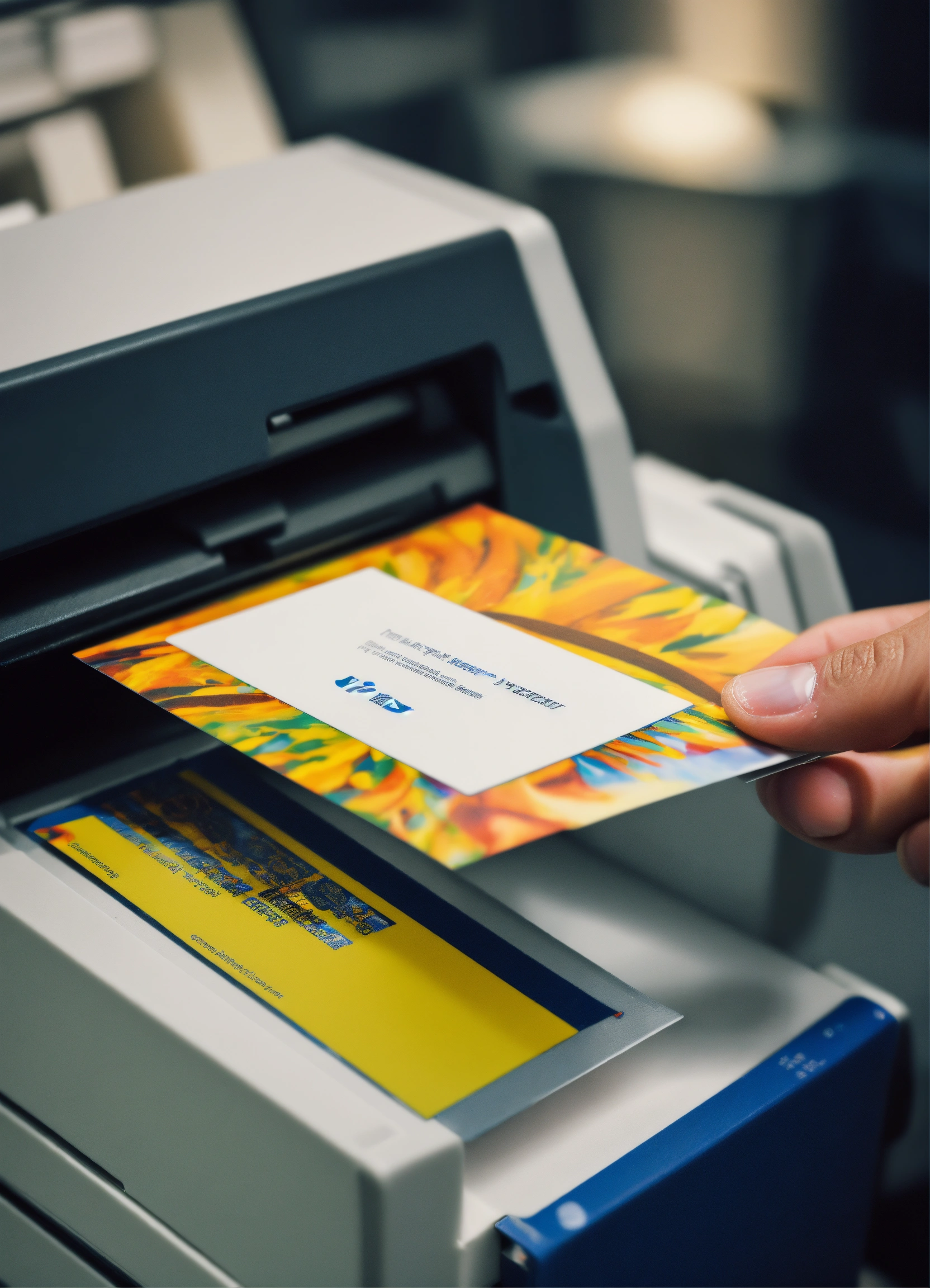 A photo of a printer printing a business card, the business card is printed on high-quality paper and is backed by a 100% satisfaction guarantee