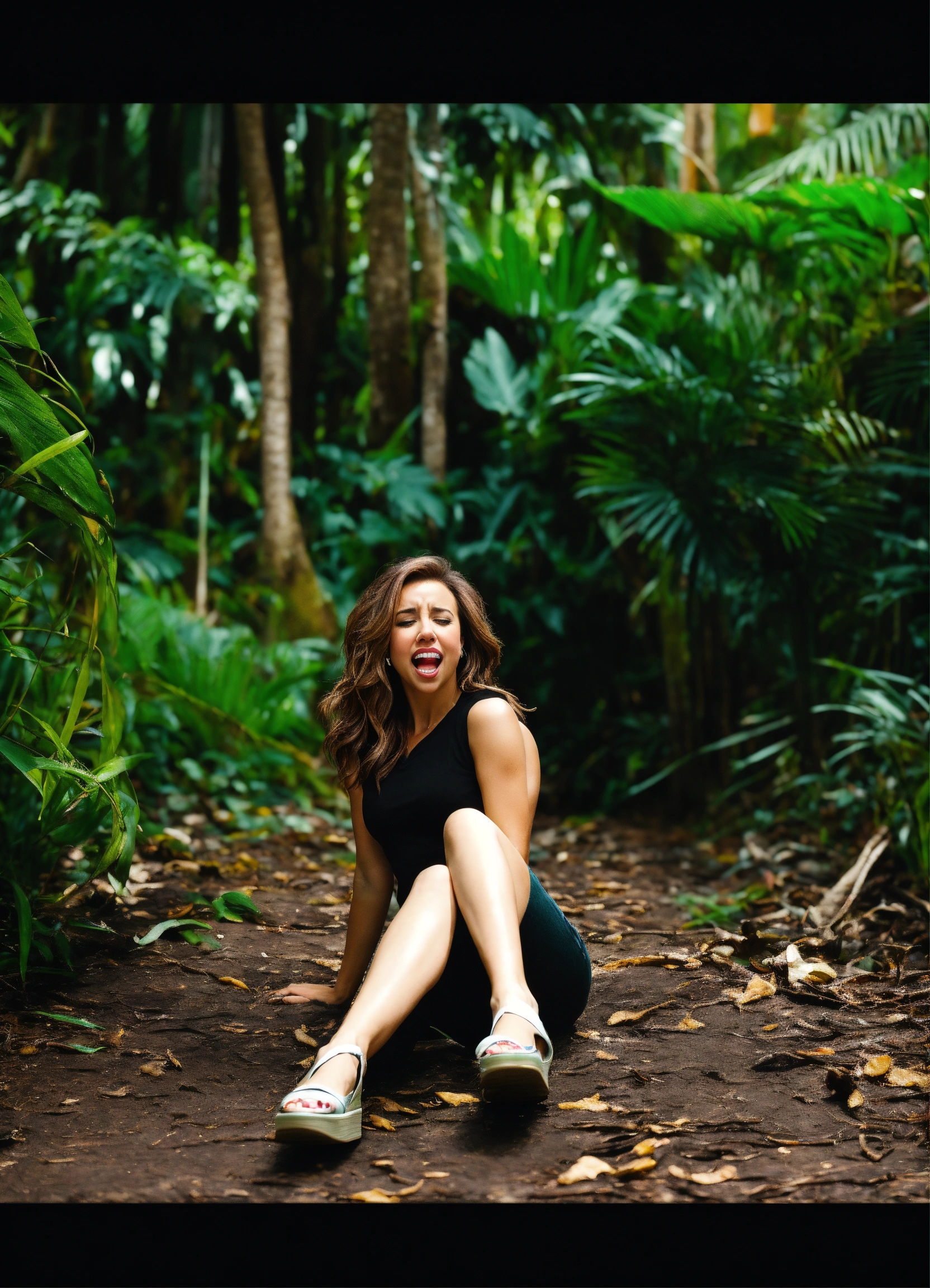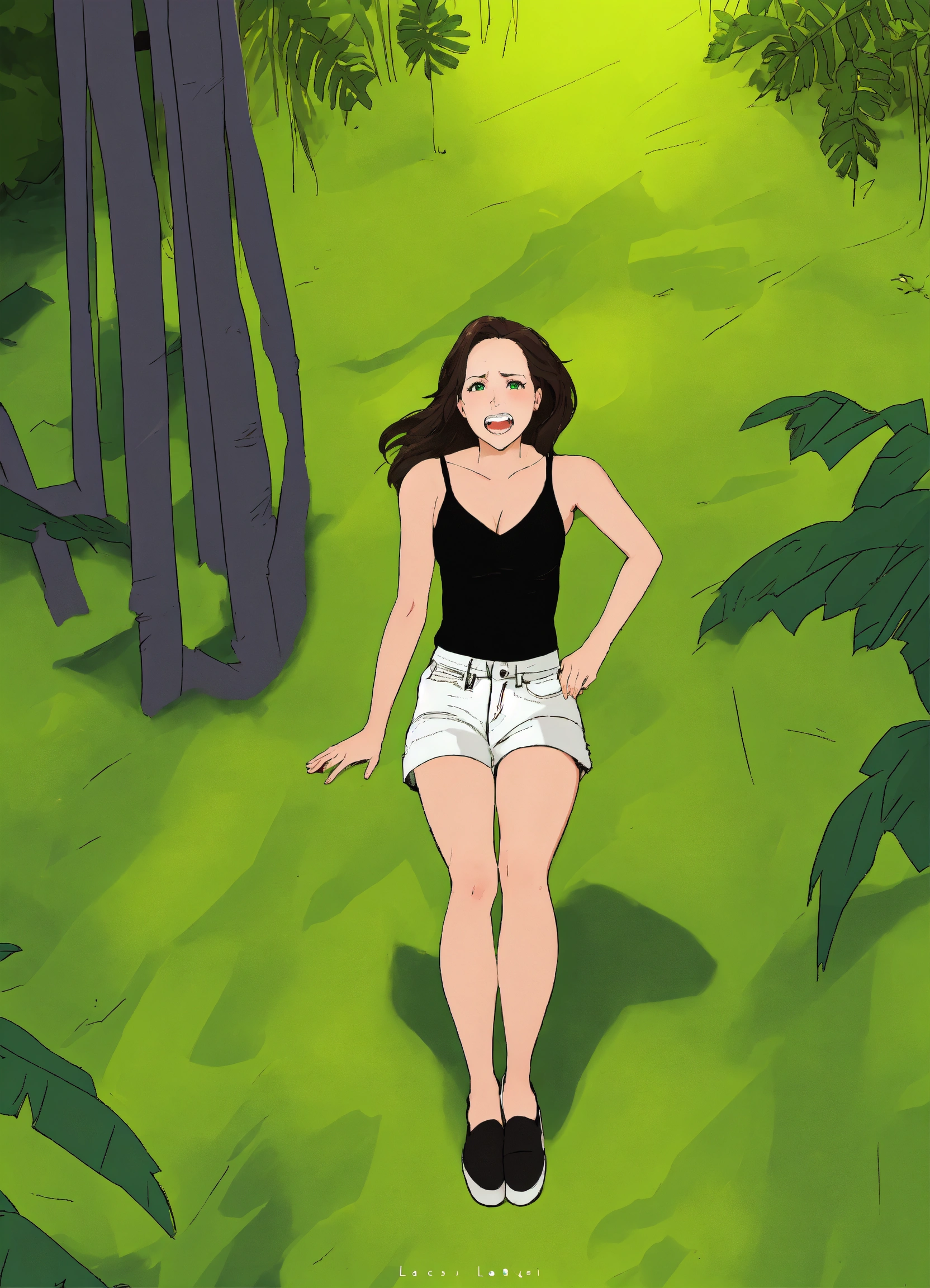 Full body 8k top down image of scared and shocked in pain lacey chabert wearing a black v neck top, white skinny jeans shorts, sleeveless, wedges, laying with her legs together and arms wide open on the tropical forest floor, arms on arm rests, top view picture, arms out wide, green eye color, mouth wide open in pain, stomach showing, wedge shoes, struggling, straight teeth, perfect teeth