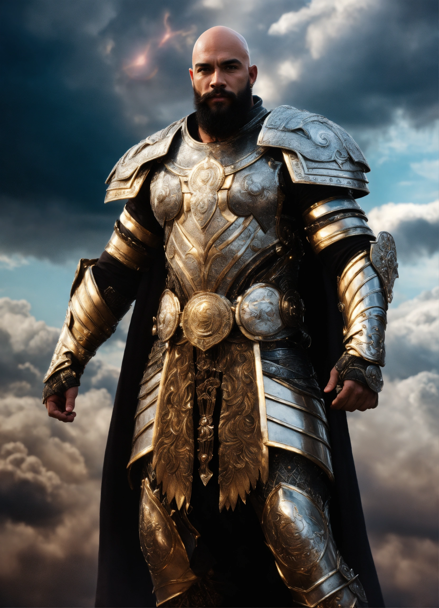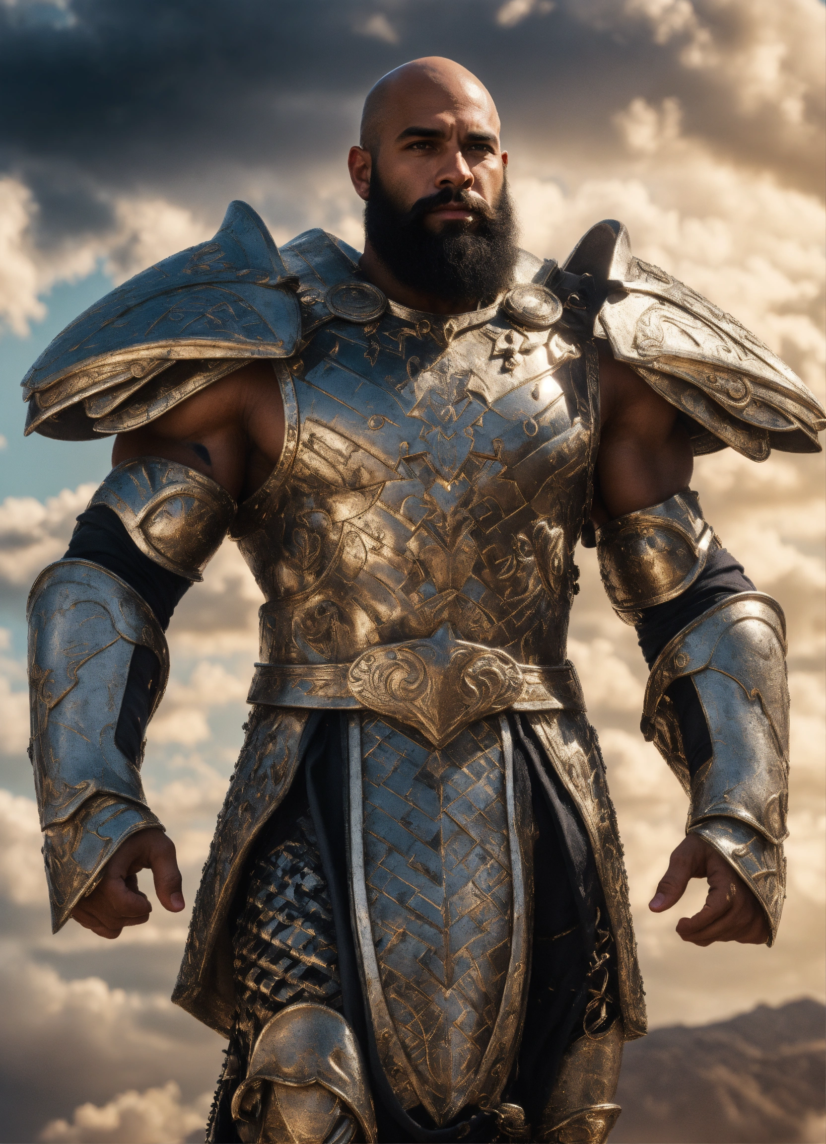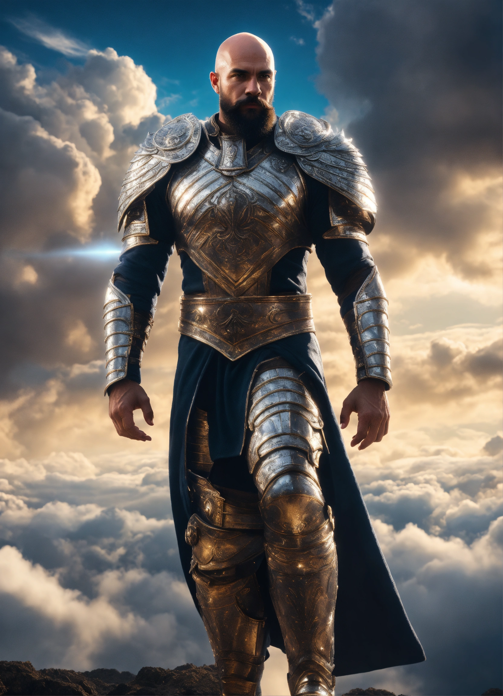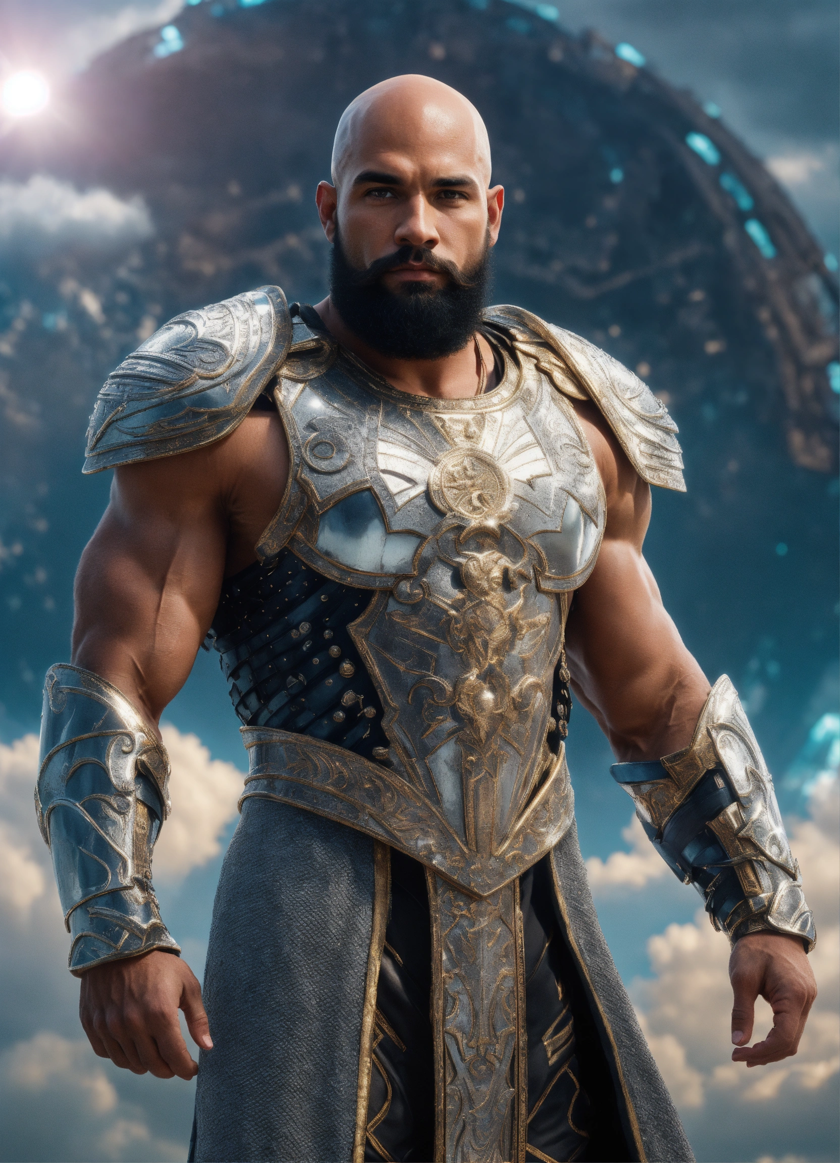 Bald well groomed bearded man, a strong muscular handsome dominican god wizard with light brown skin, a strong handsome god with a bald head and short beard, muscular physique wearing futuristic silver and blackegyptian armor, walking in the clouds resolution 8k, insanely detailed