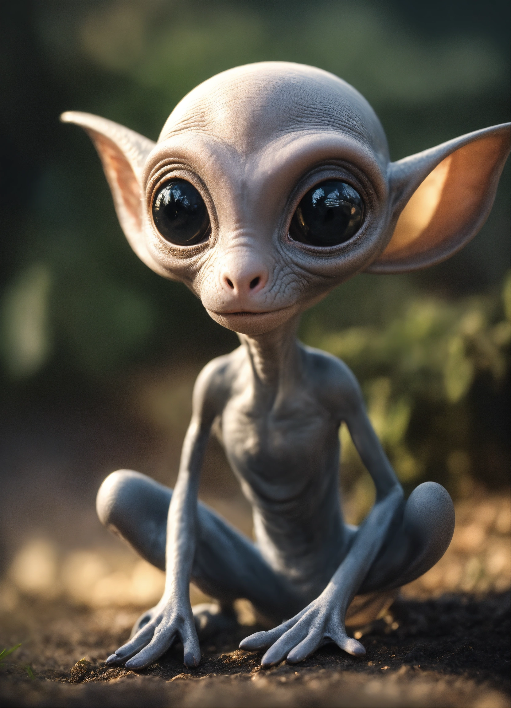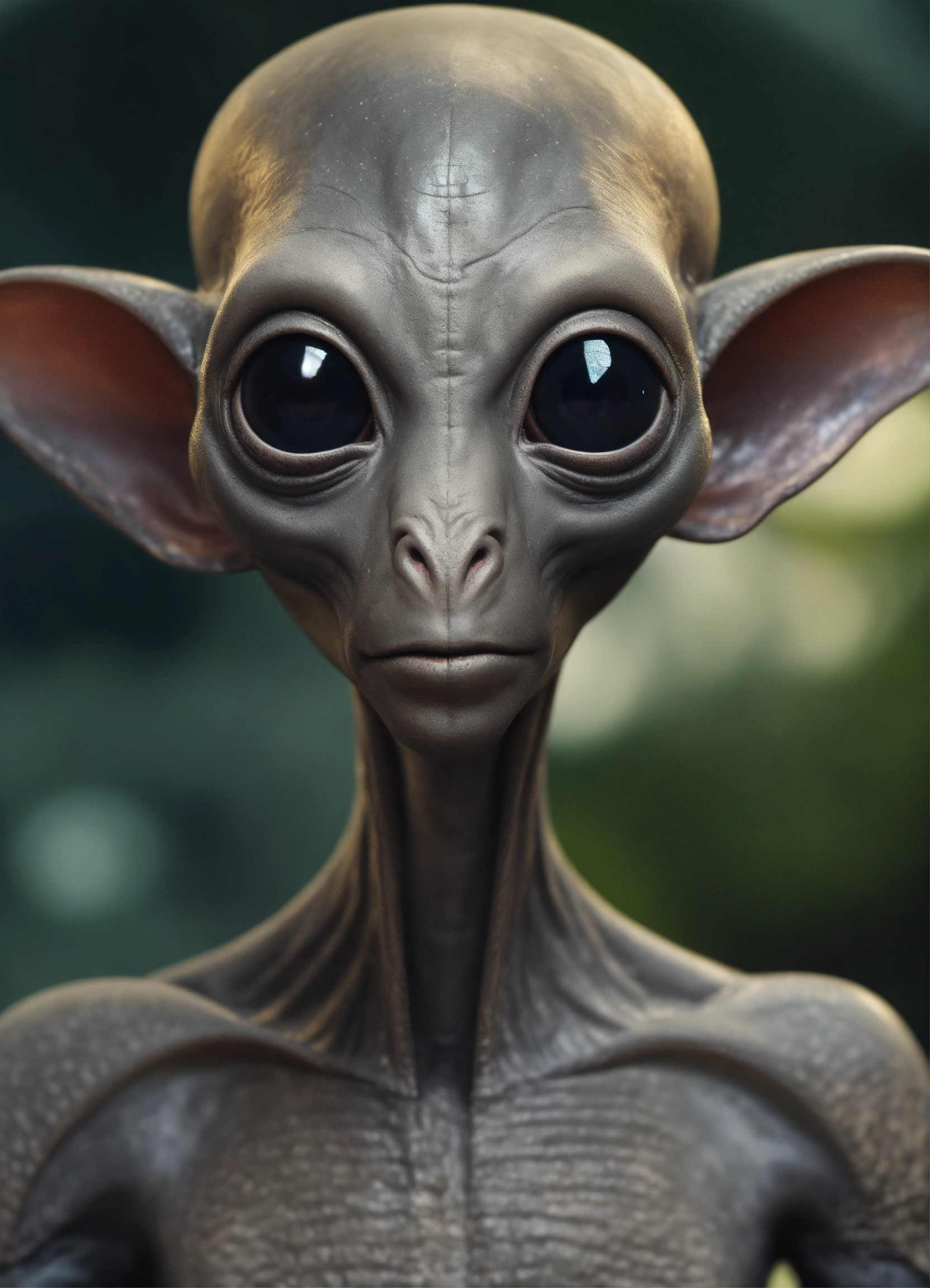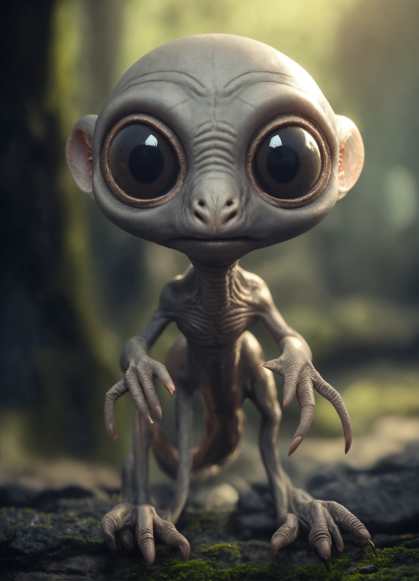 Gray alien creature with huge eyes, bald. instead of a nose there is a small gap, a mouth without lips. lop-eared. 3 fingers on each hand. full length