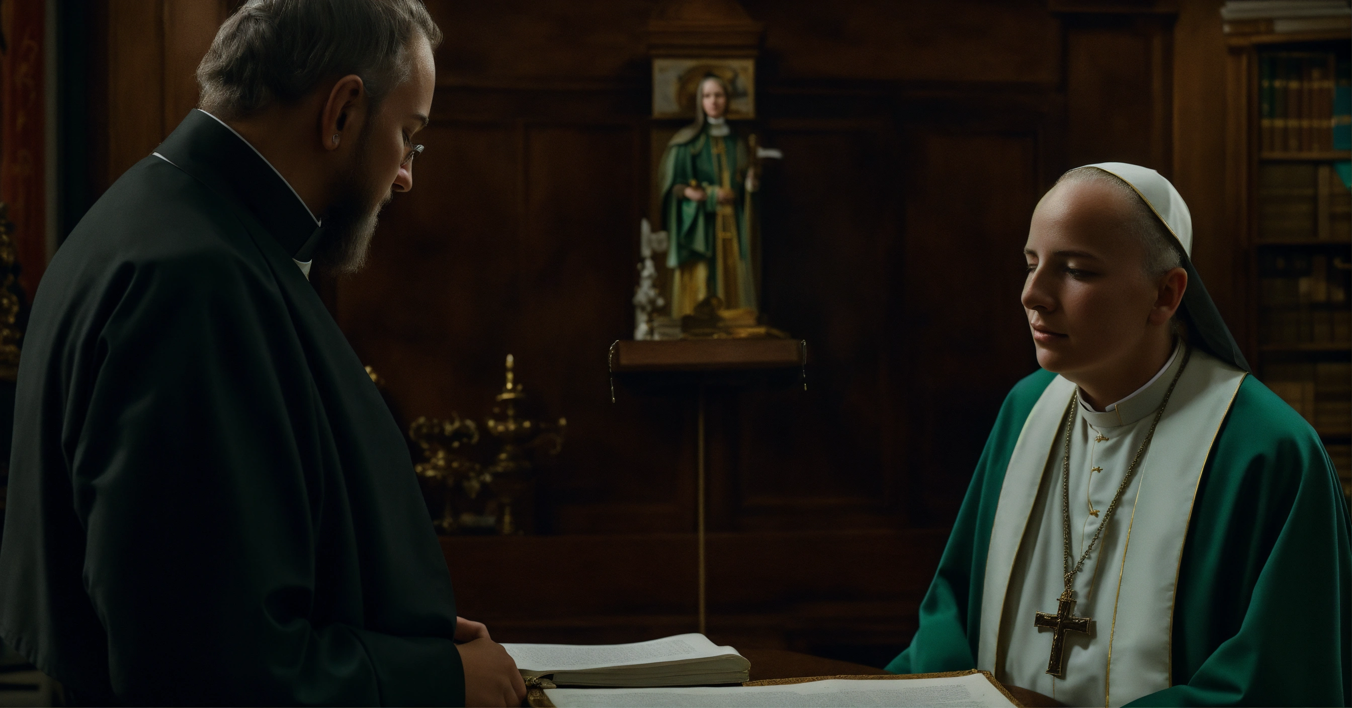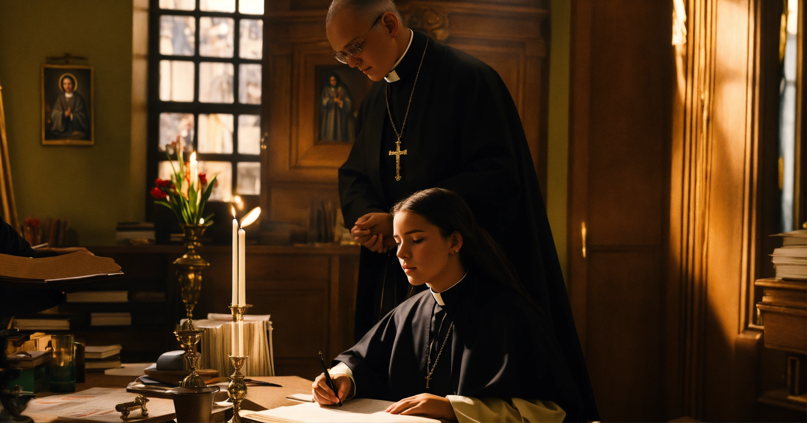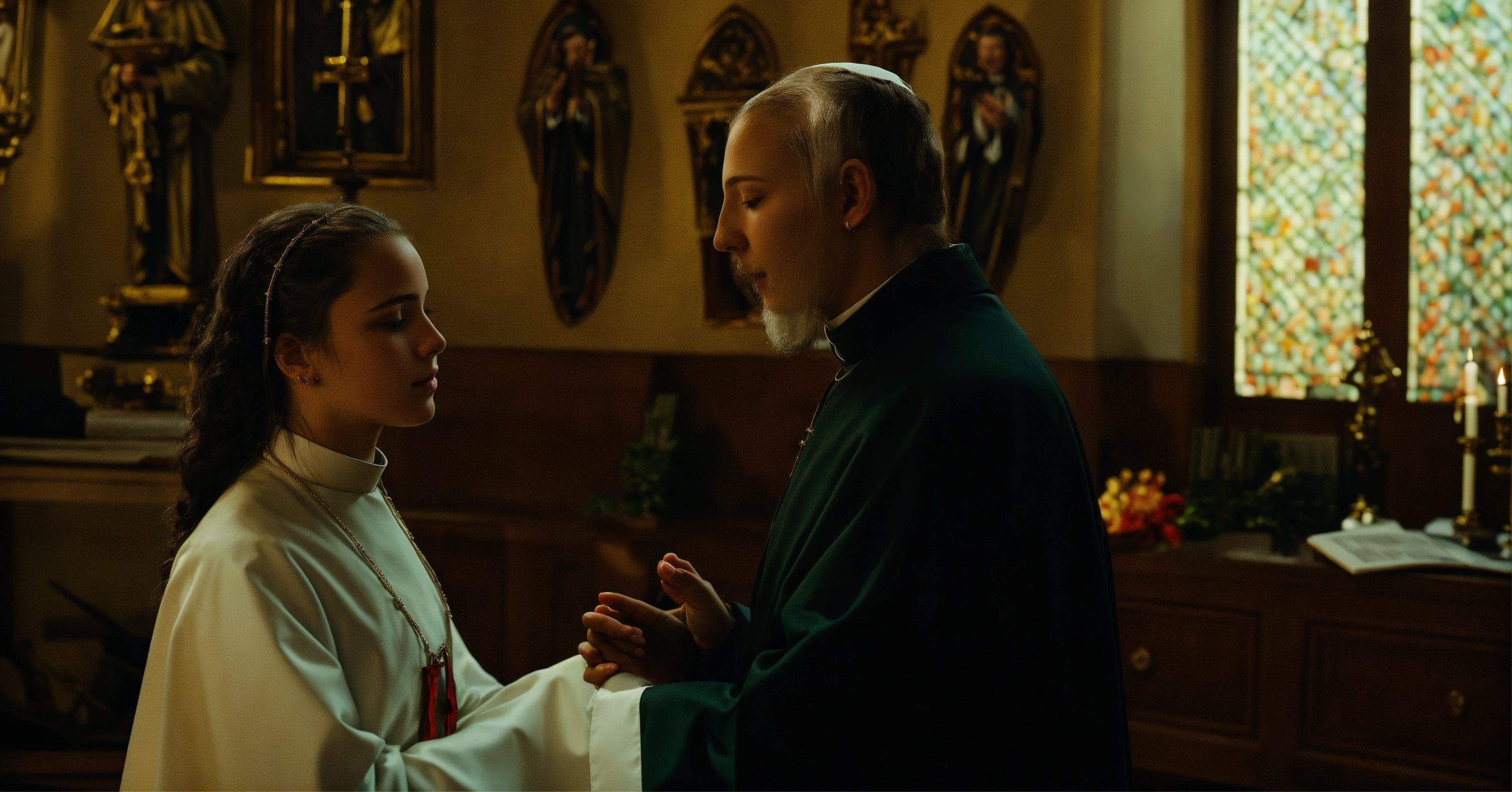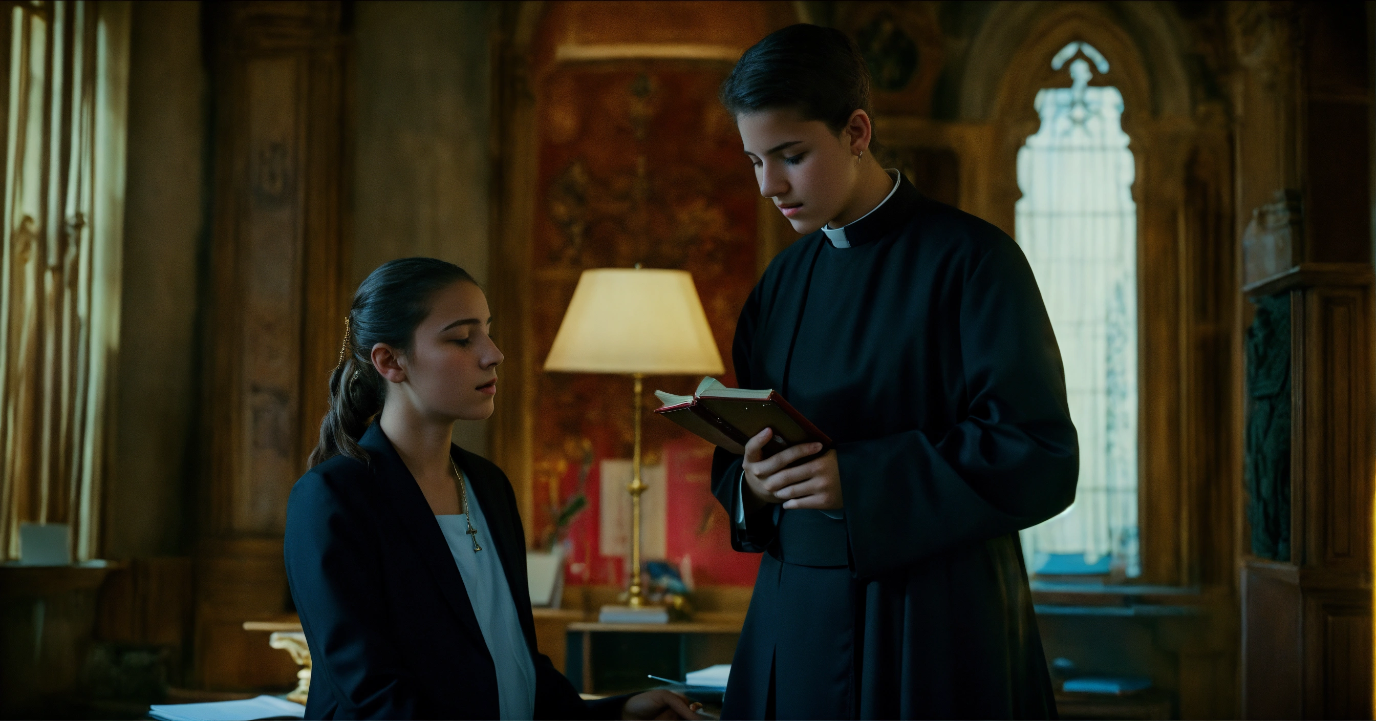 Portrait of a 16 year old girl, hyper-realistic in character, being blessed by a hyper-realistic italian priest, in her office. they are both in prayer