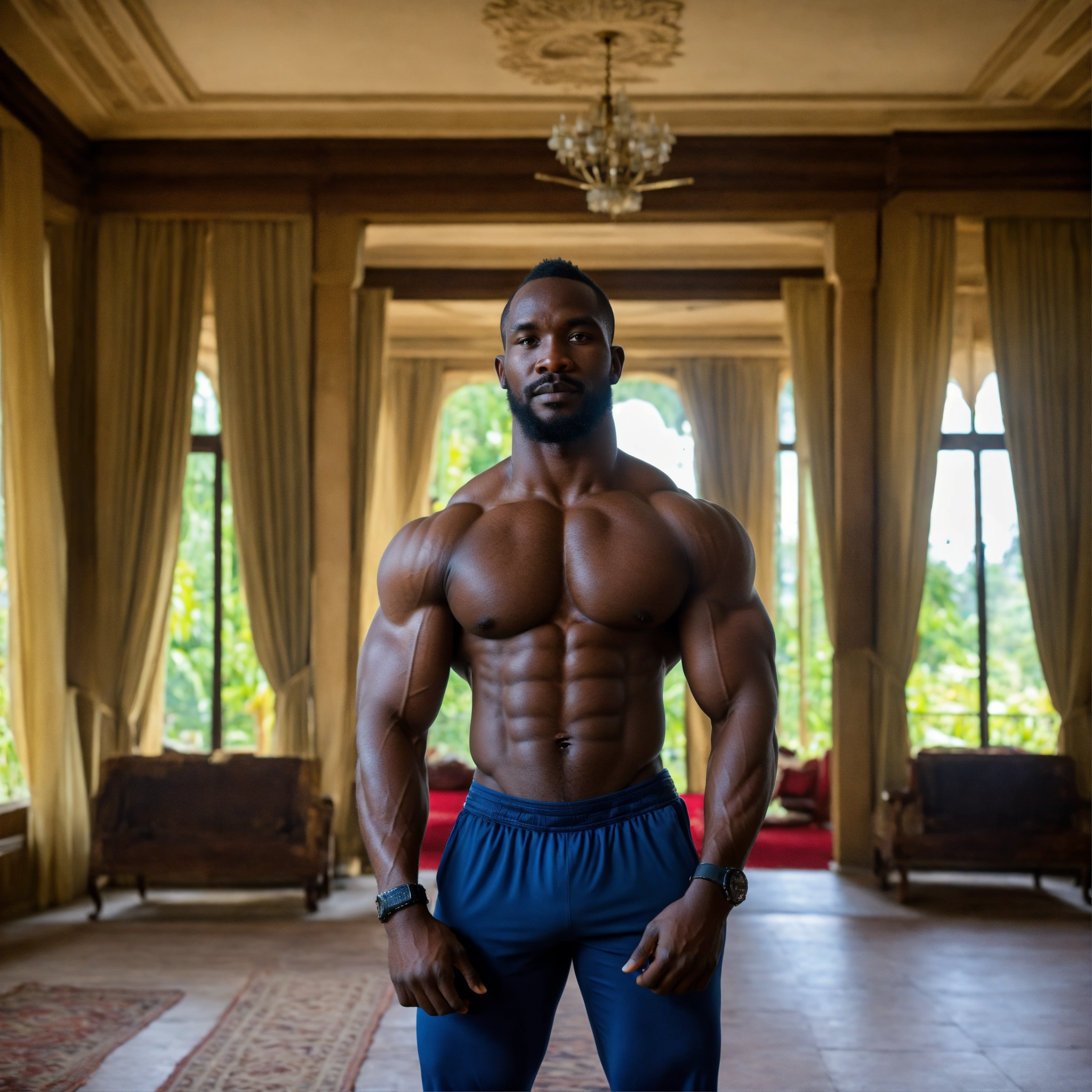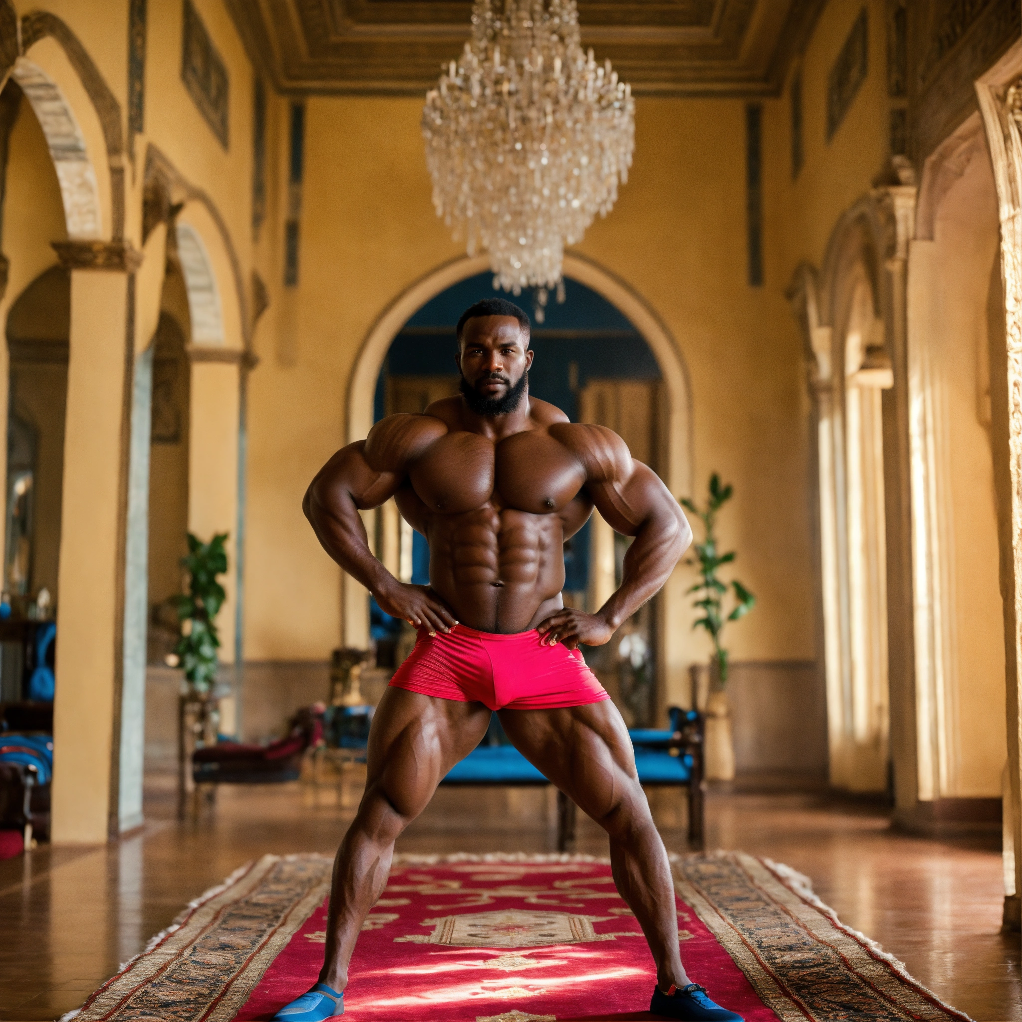 30-year-old hairy rwandan man with big muscles, big bodybuilder, body like a wrestler, in a beautiful palace