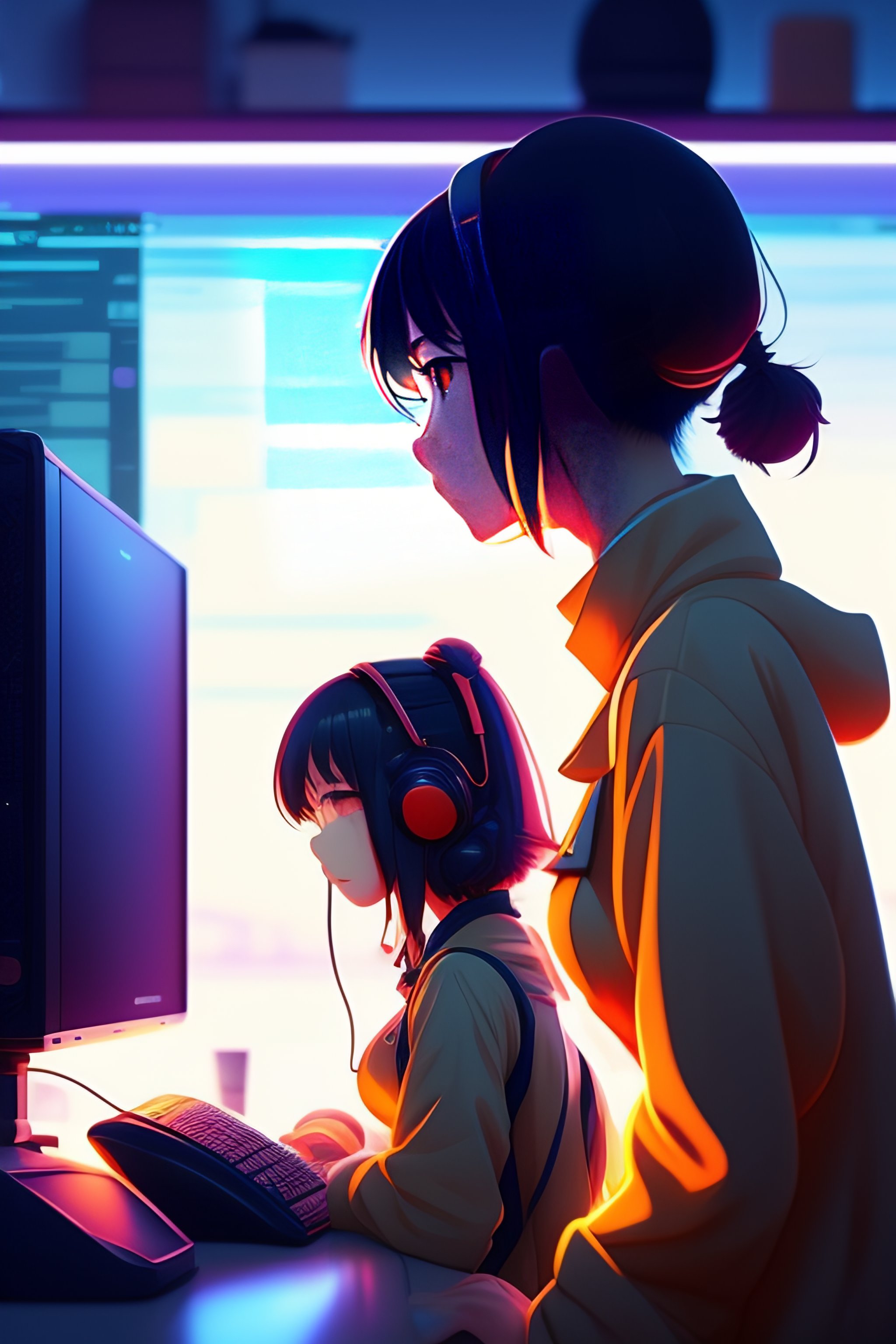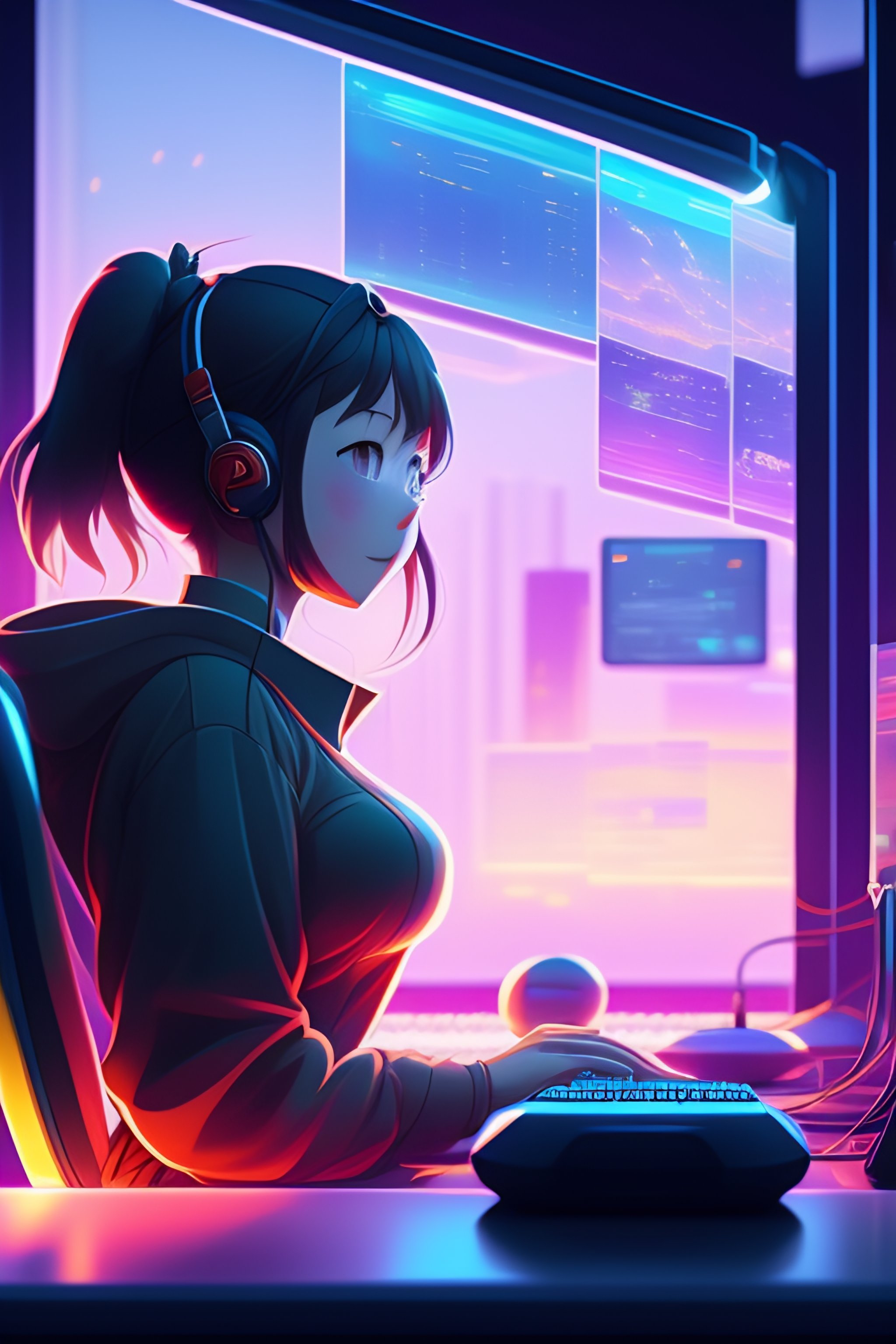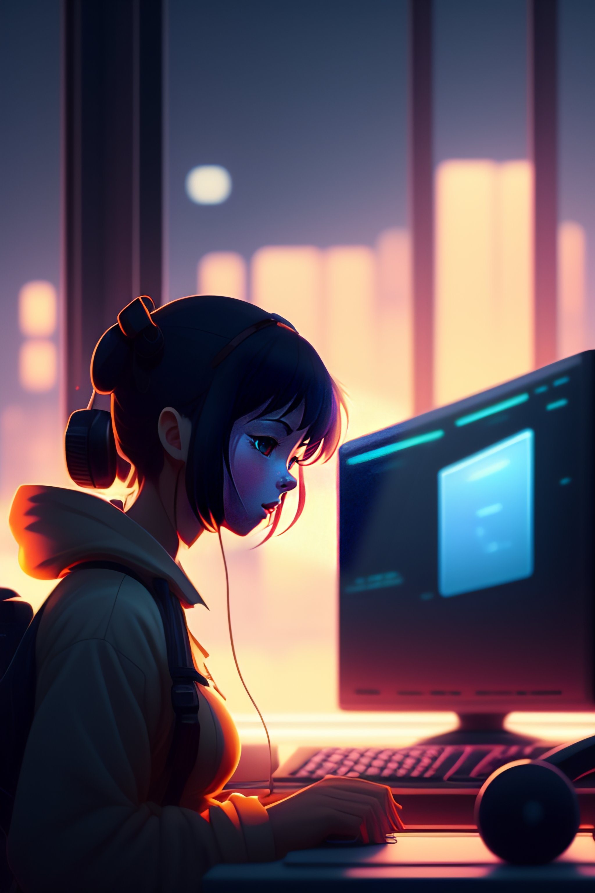 Create a high resolution artwork of lofi, anime girl is programming at a computer in a room full of gadgets, snown, web developer, by makoto shinkai and ghibli studio, outlined silhouettes, dramatic lighting, highly detailed, incredible quality, trending on artstation, masterpiece, 8k