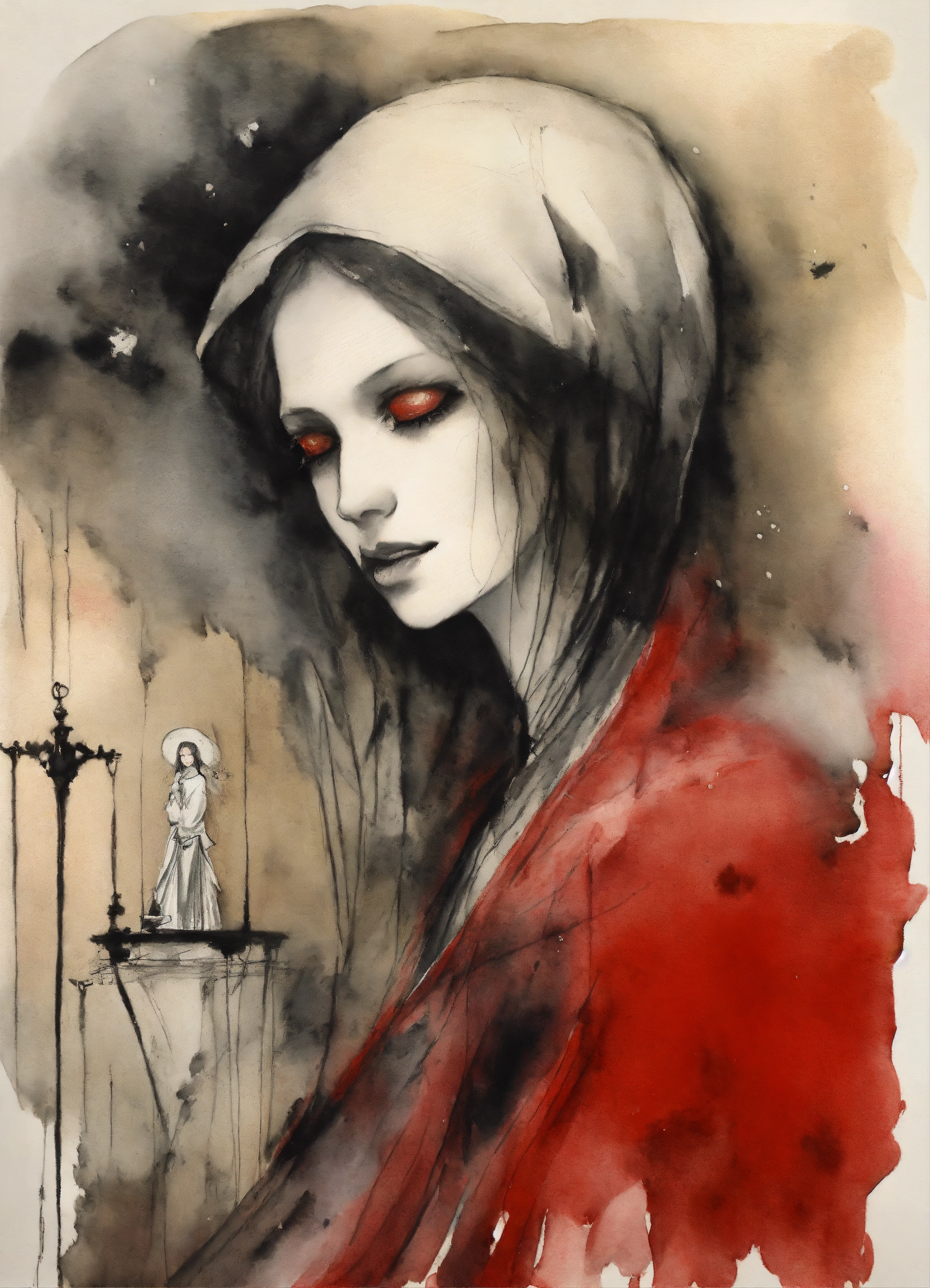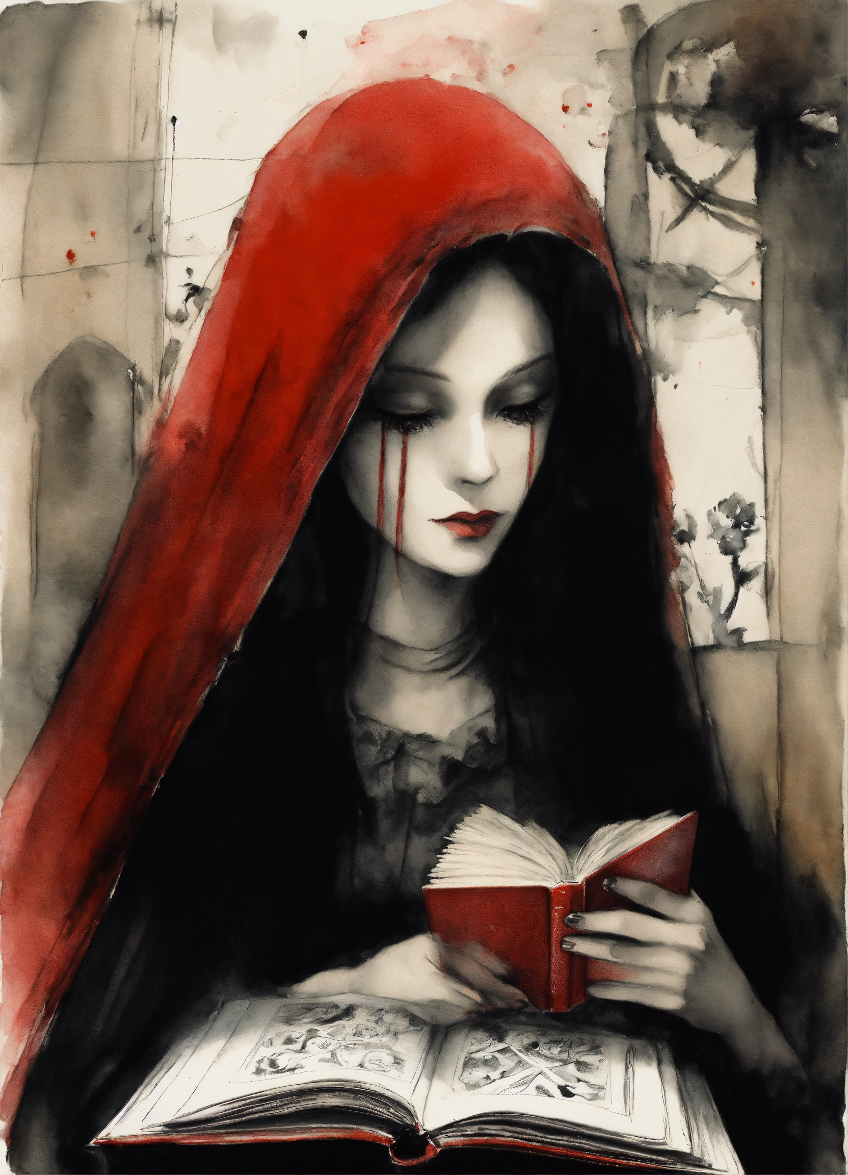 Stephen gammell style, dessin, aquarelle, aquarelles, noir et blanc et rouge, de marais, de sombres créatures, dégoulinant, tarot card representing the popess, a woman who holds a book