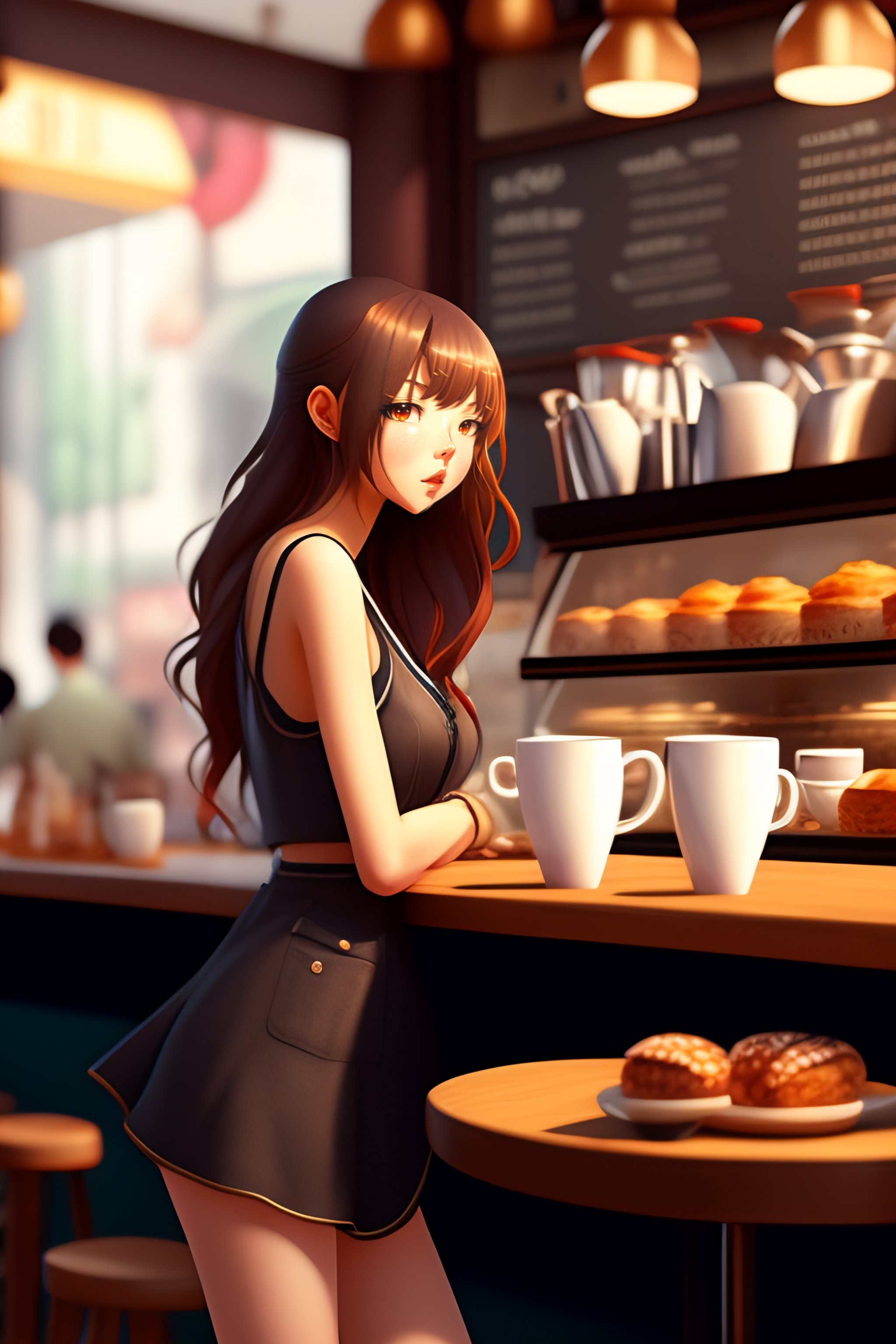Full body anime style model girl inside coffee shop, detailed art, 2d illustration, 8k unrealistic, detailed cafe design, ideal anatomy, full body detailed, reading girl, 600 dpi