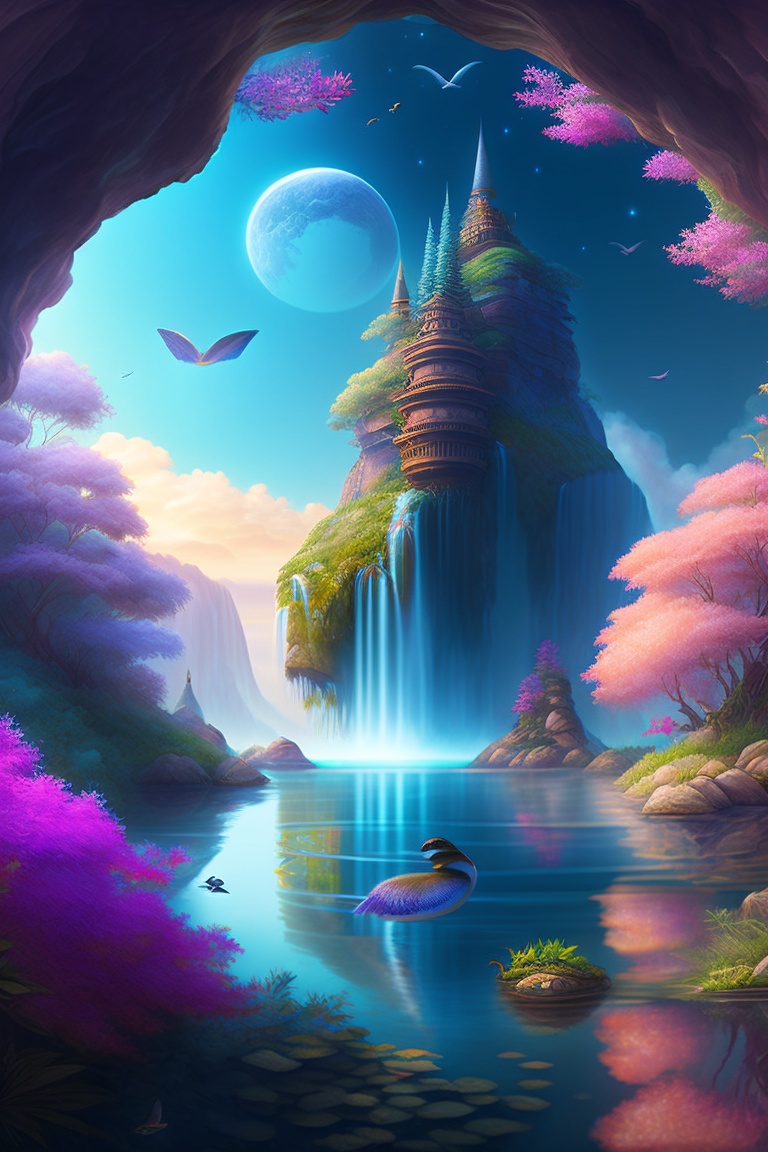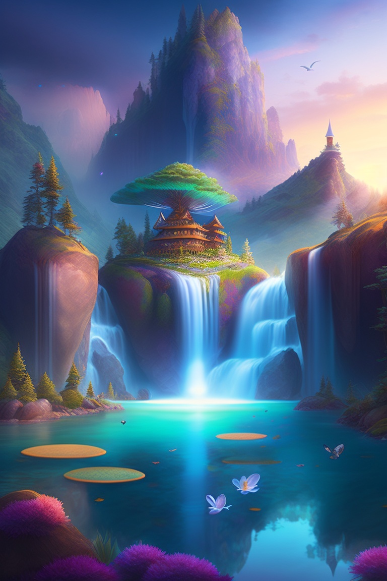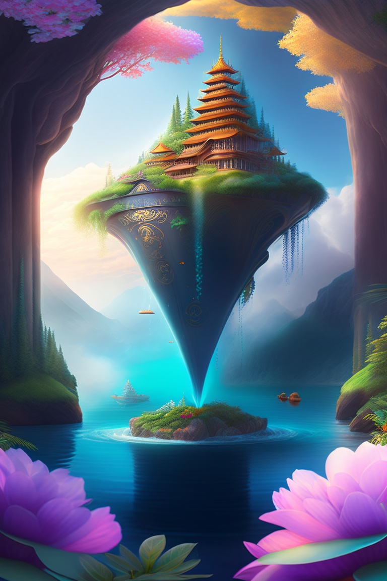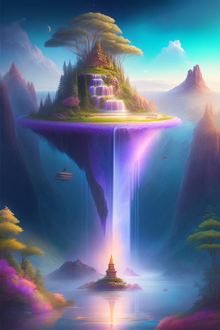 Picture a serene and magical floating island, suspended high in the sky. envision cascading waterfalls, ethereal floating flora, and mythical creatures peacefully inhabiting this enchanting realm