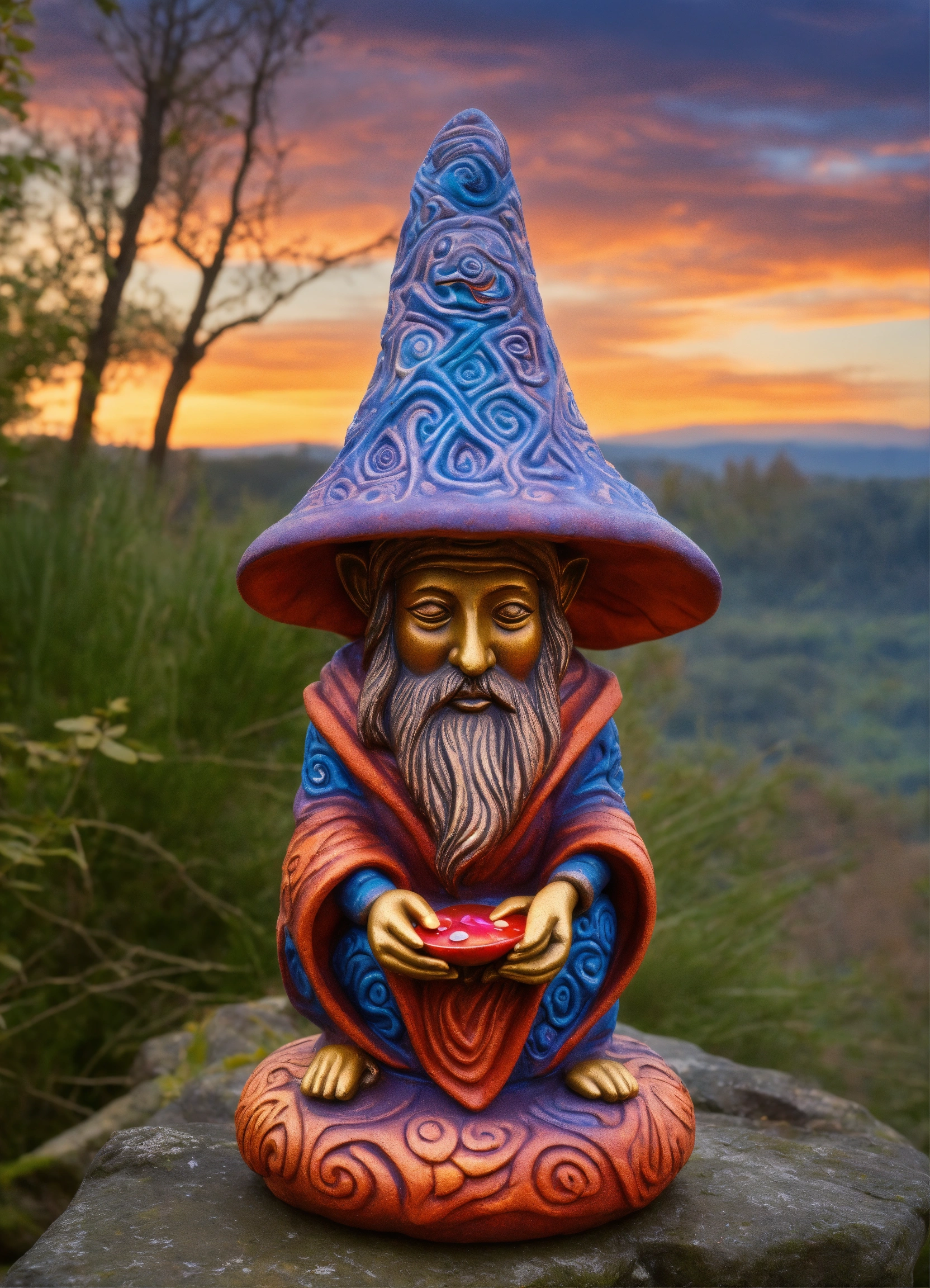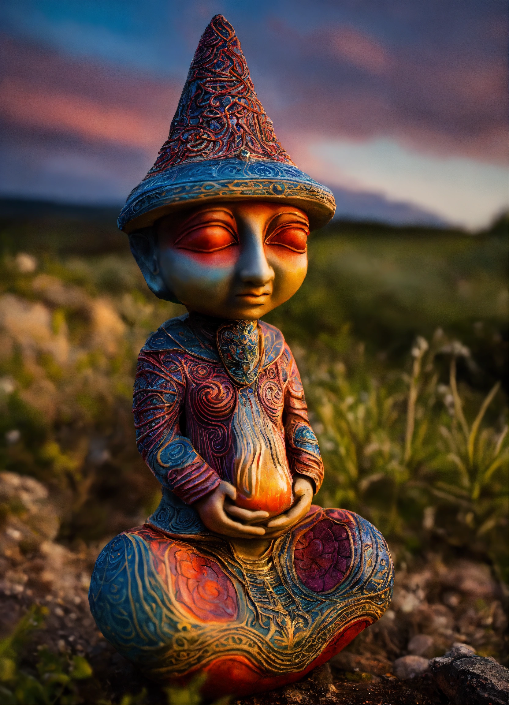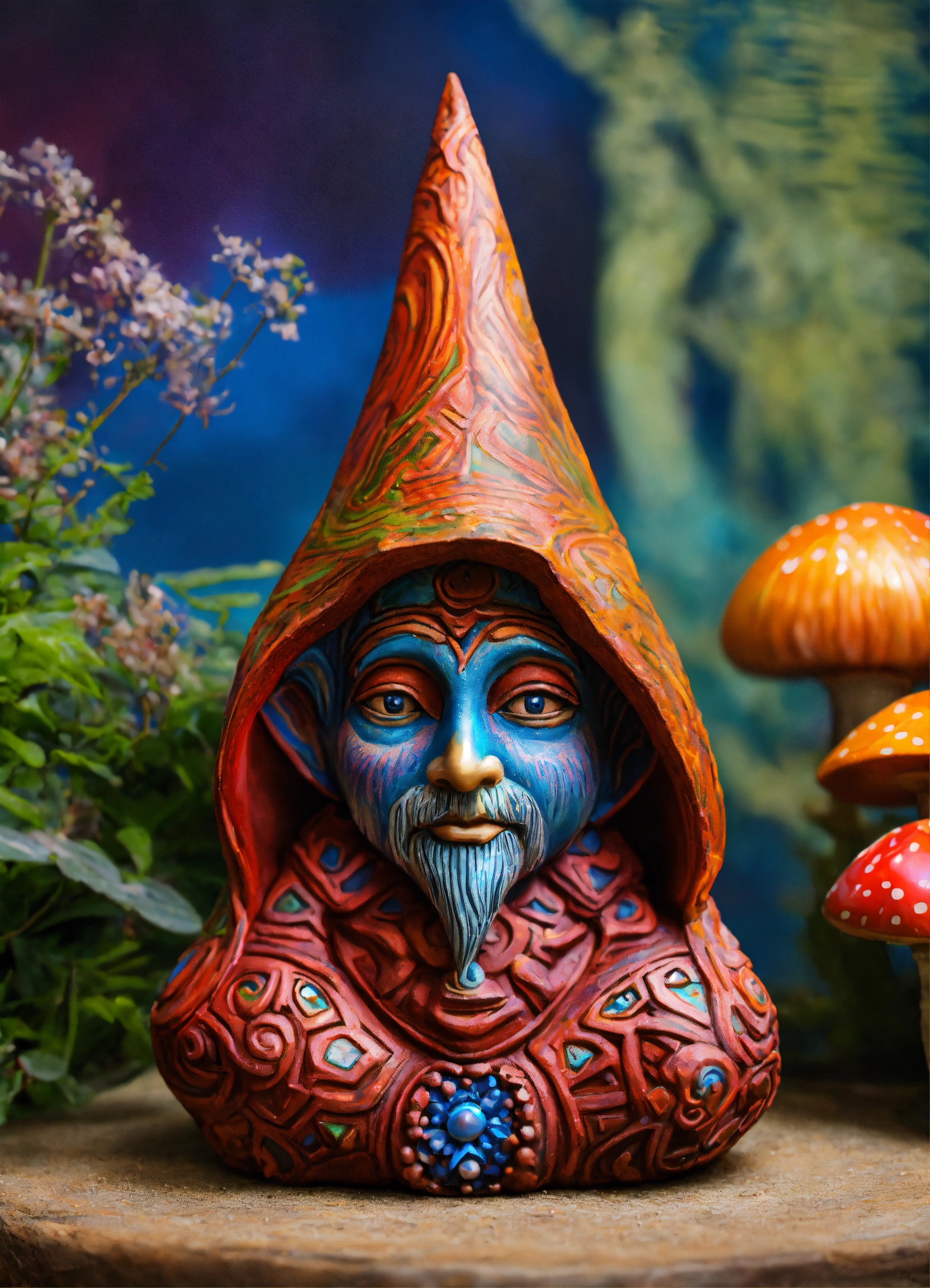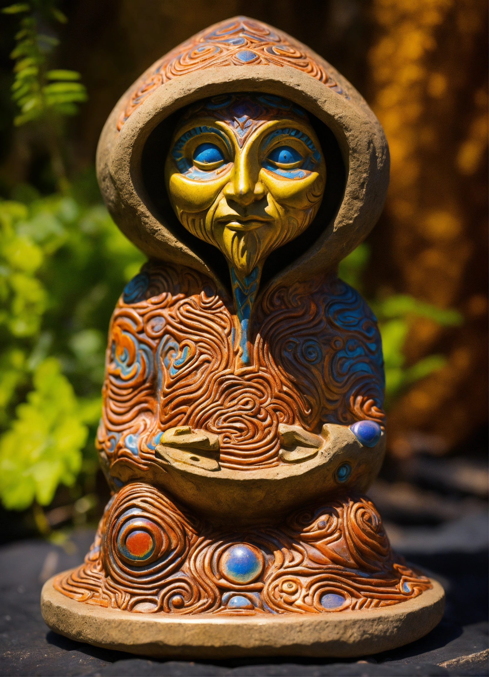 An ancient stone hand made meditative hooded gnome totem sculpture in the style of alex grey, magic mushroom