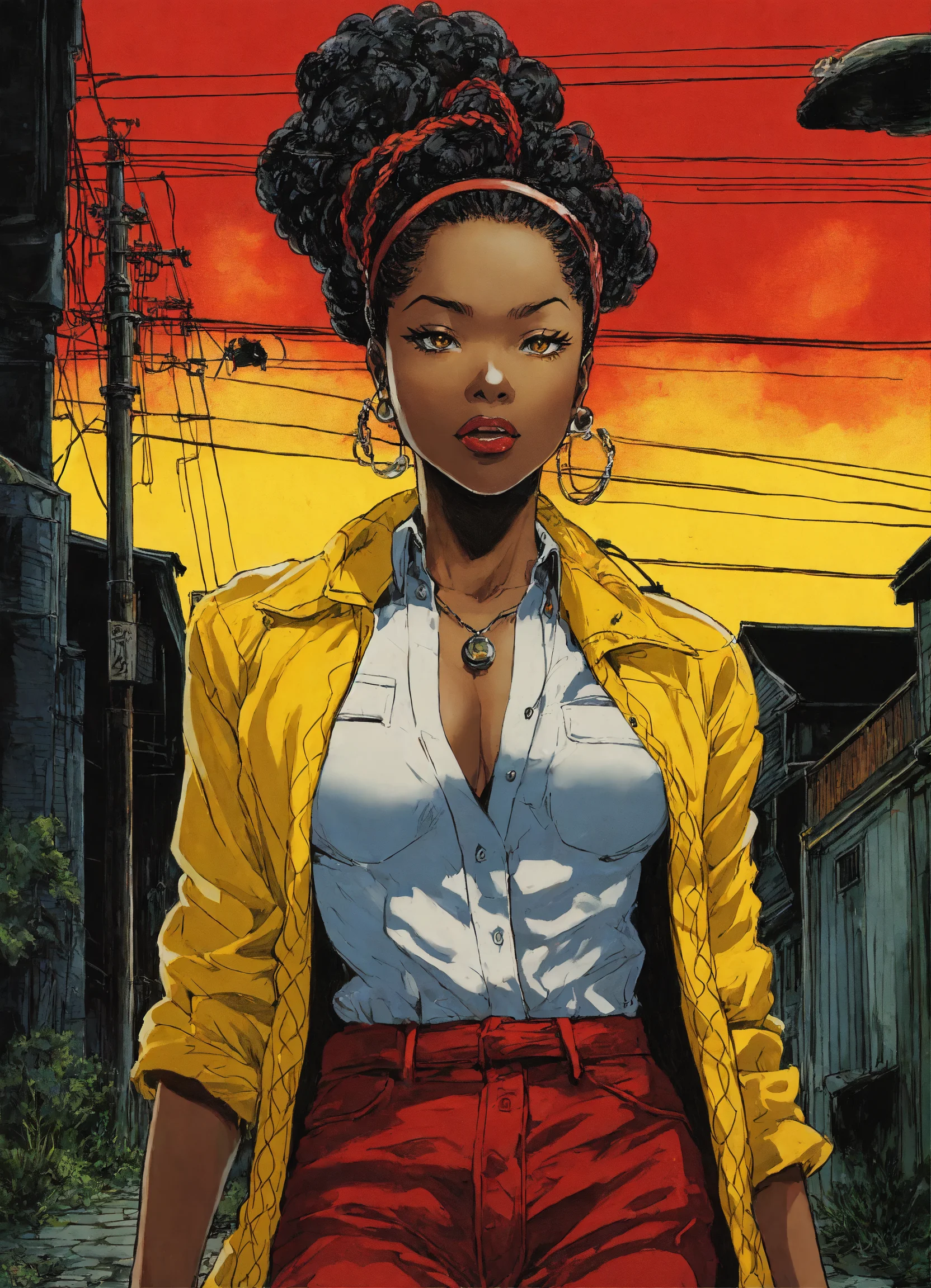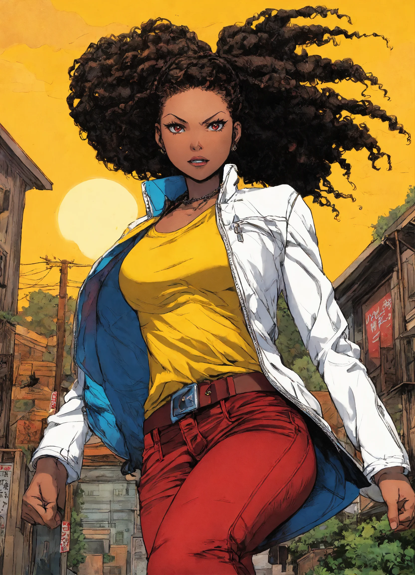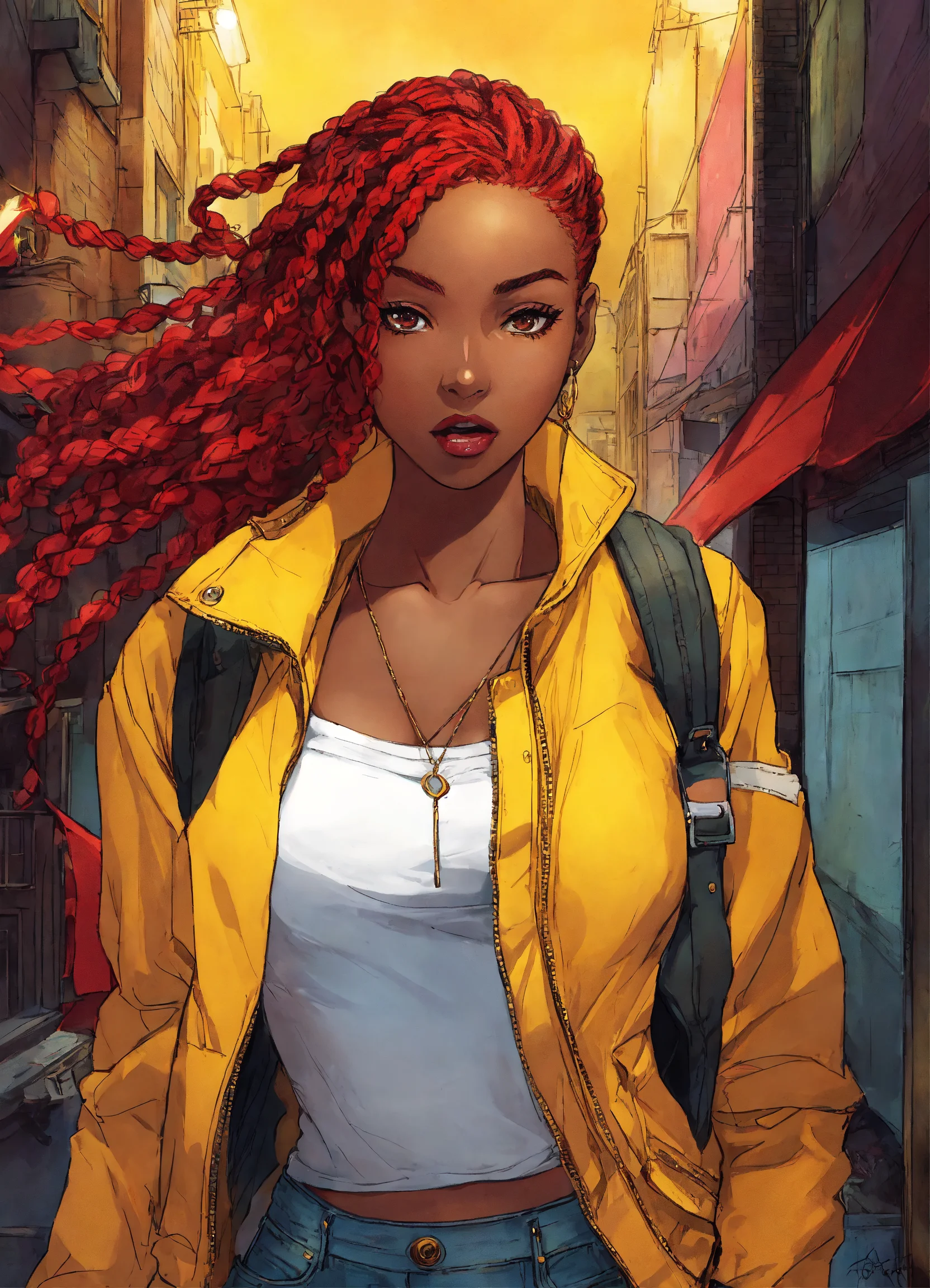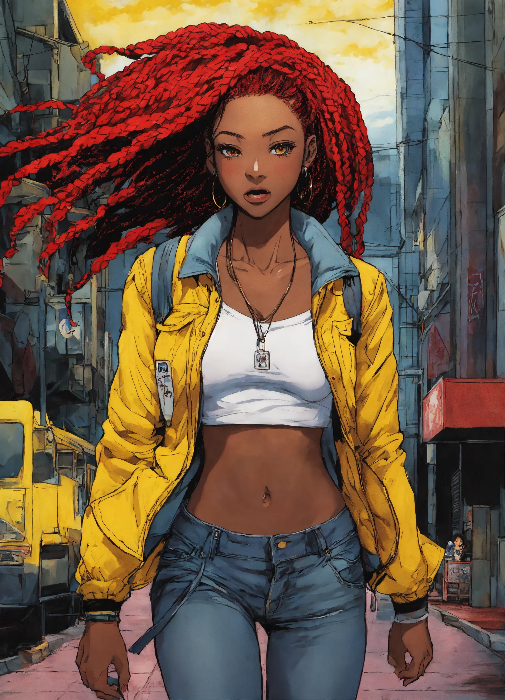 Gothic horror inspired manga. a beautiful african american running. woman is wearing tight jeans and a white jacket. yellow shirt. very sassy, sexy woman. african american woman with red braids; by junji ito, kōji kumeta, naoko takeuchi, rumiko takahashi, hideaki anno, atmosphere.