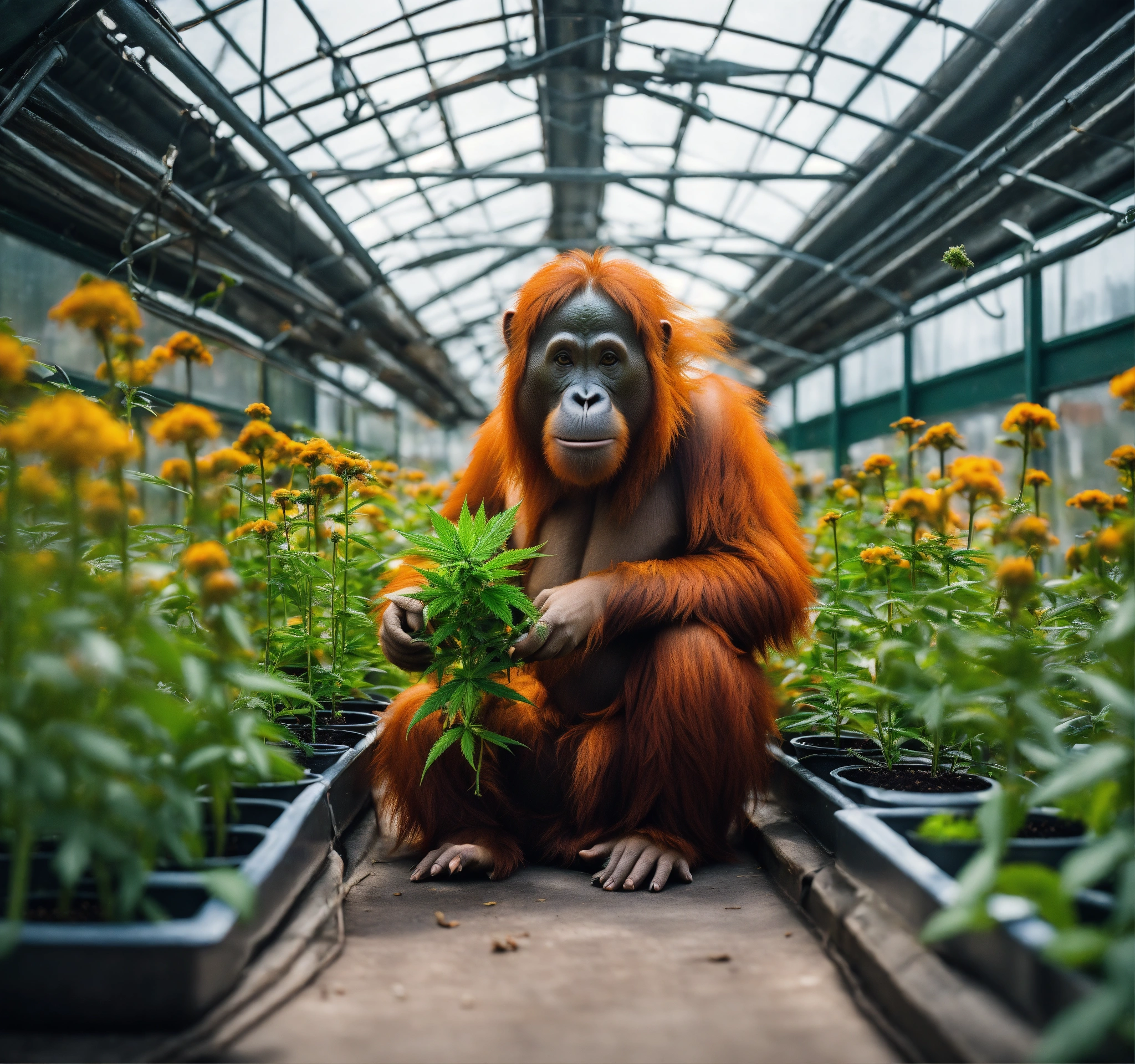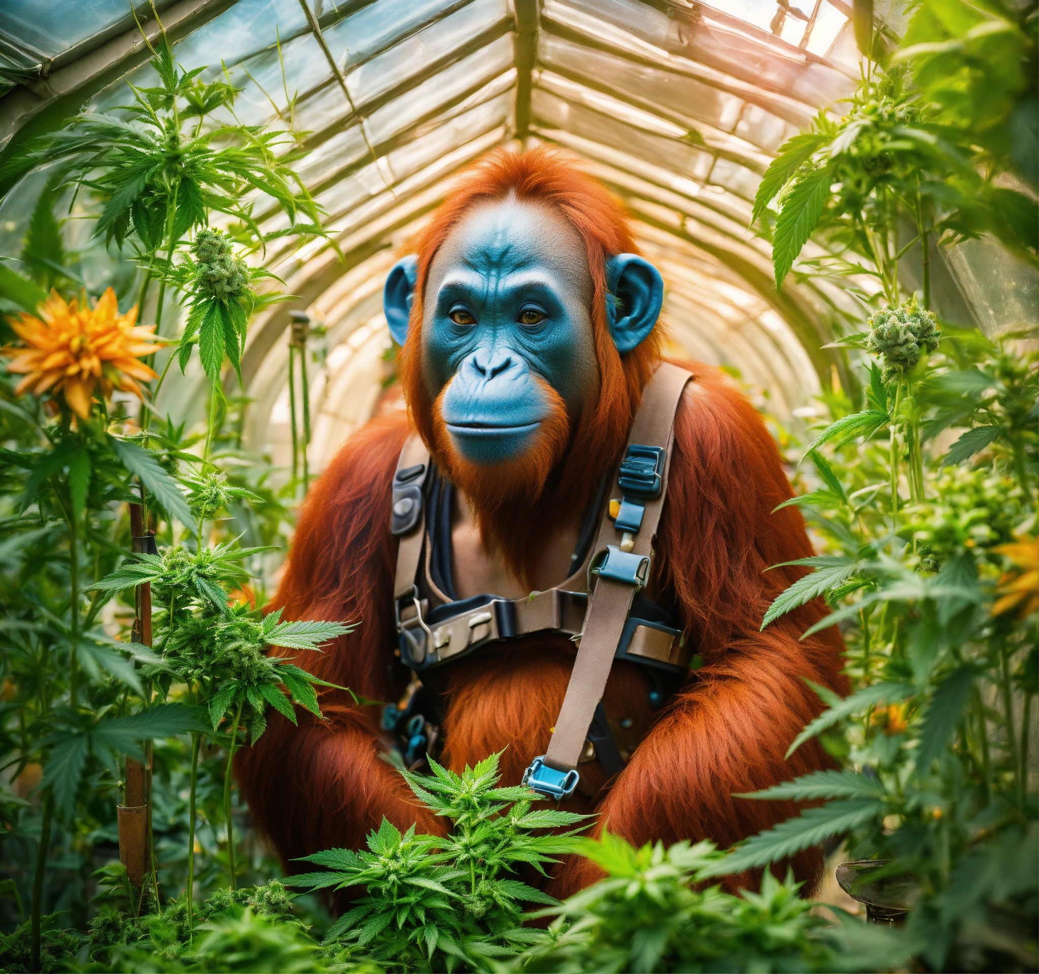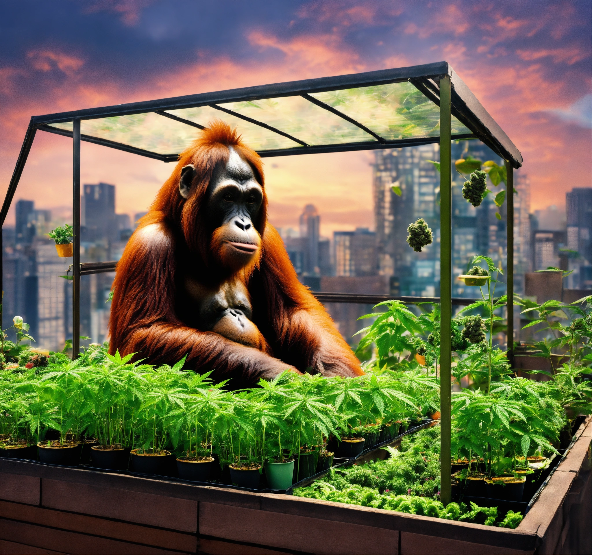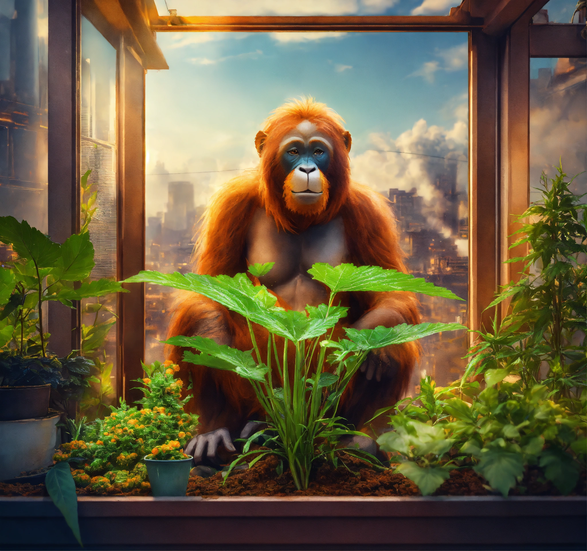 Avatar picture in frame for galaxy orangutan urban gardener in a rooftop greenhouse surreal, anime, seed, plant, cannabis leaf, steam, buds flowers., futuristic