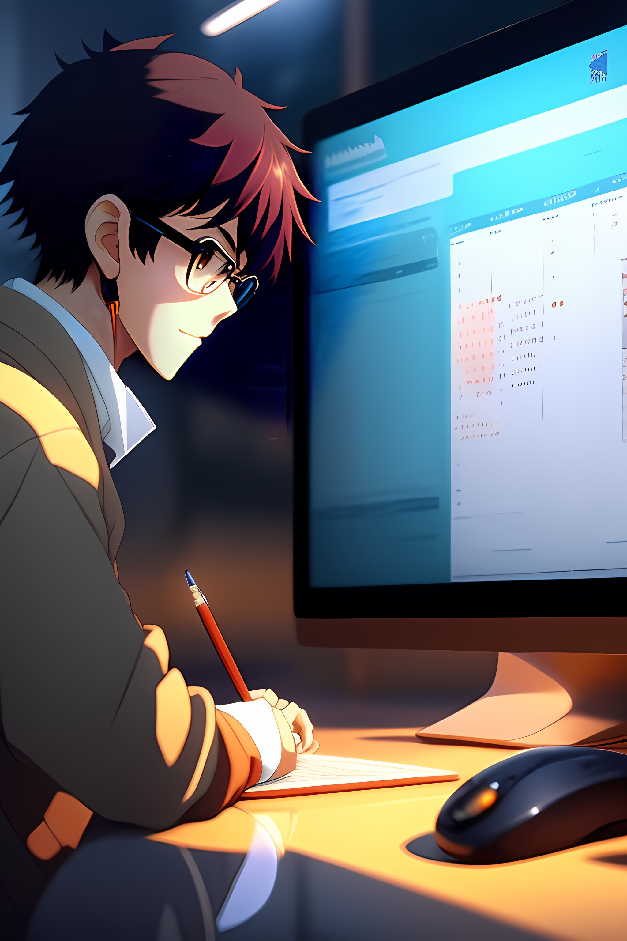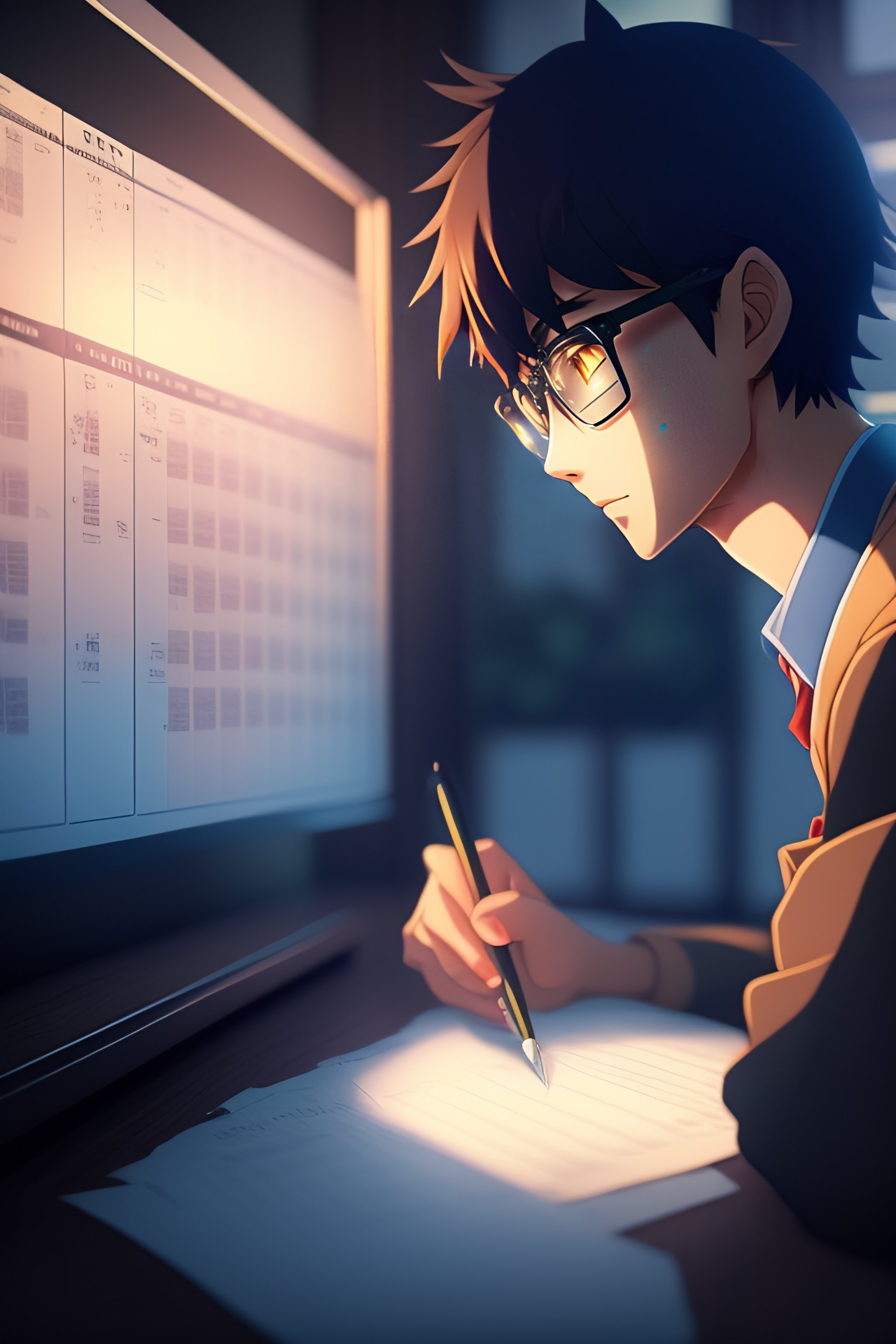 A nerdy anime boy is planing his work on whiteboard with calendar in a room full of gadgets, by makoto shinkai and ghibli studio, dramatic lighting, highly detailed, incredible quality, trending on artstation