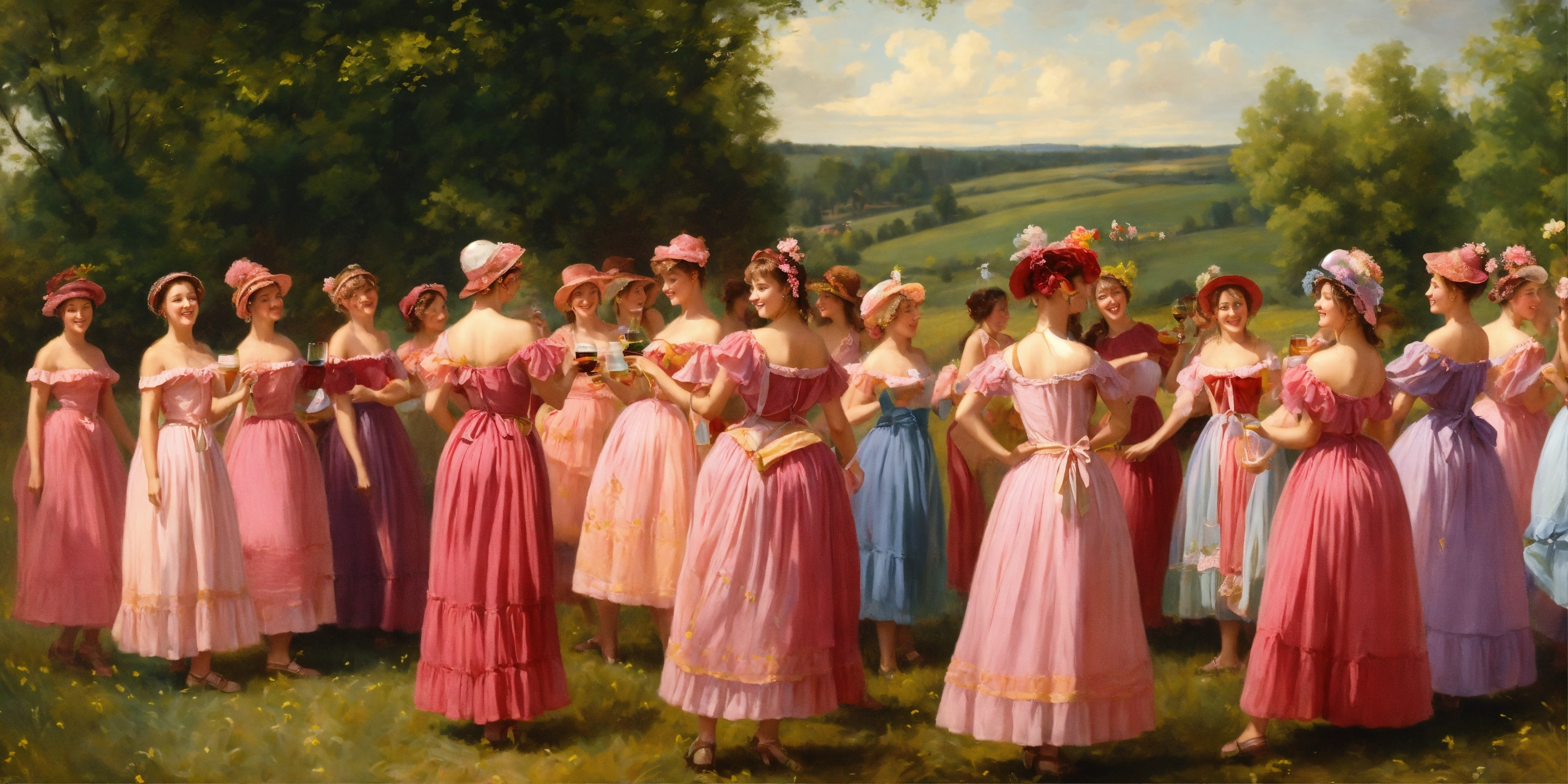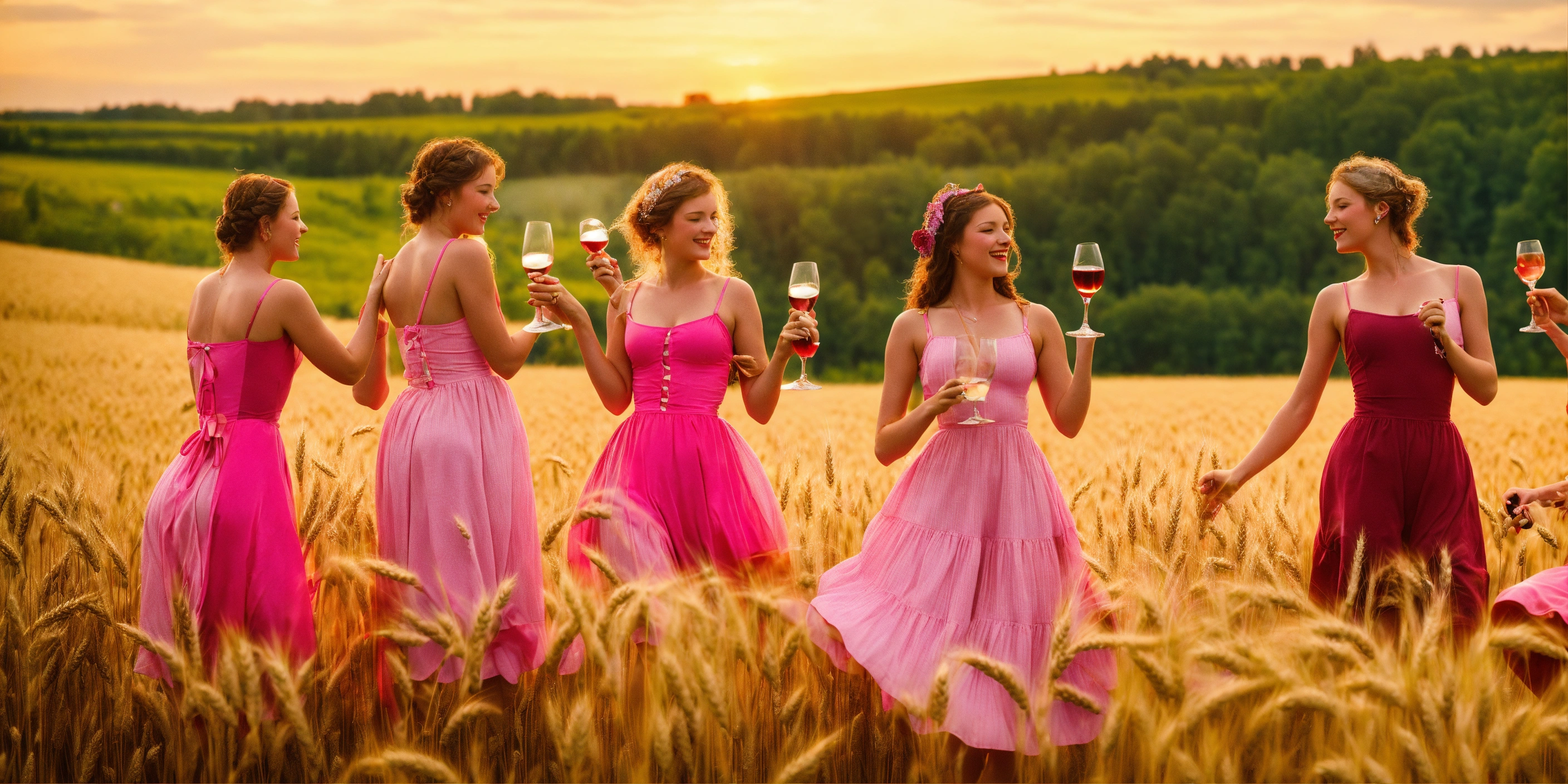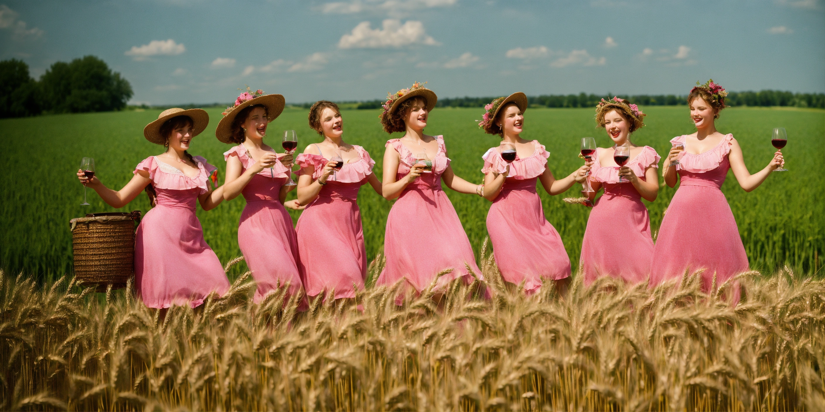 19th century young ladies in a pink swimming suits having a party with music and dances, drinking wine in a field of wheat in ukraine