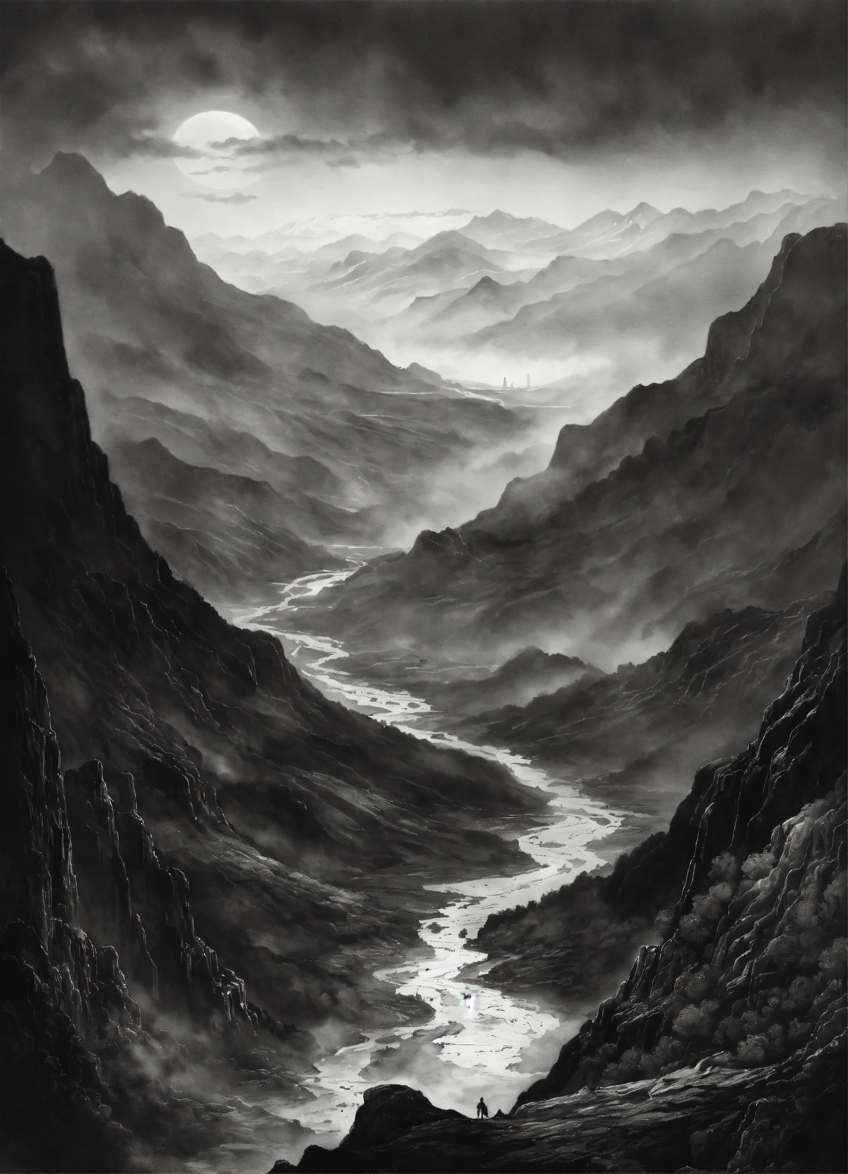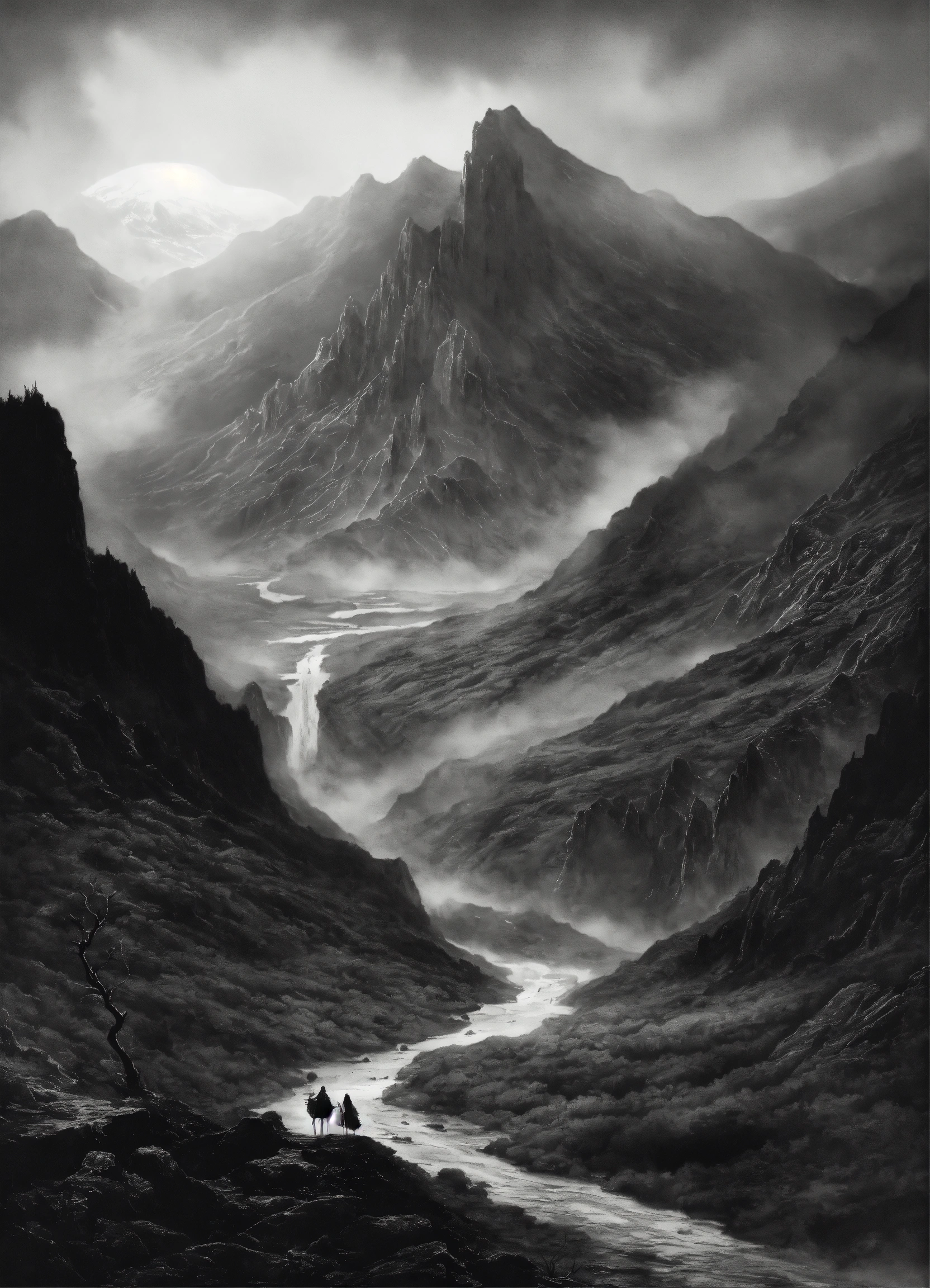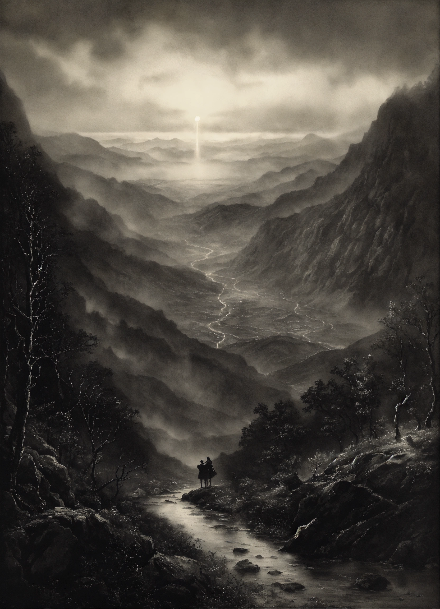 1920's dark fantasy book cover paper art of a dark valley sorrounded by misty mountains, gloomy and depressing ambient, intricate details, highly detailed, dramatic lighting, 8k, outlined silhouettes, style of alan lee, black and white painting