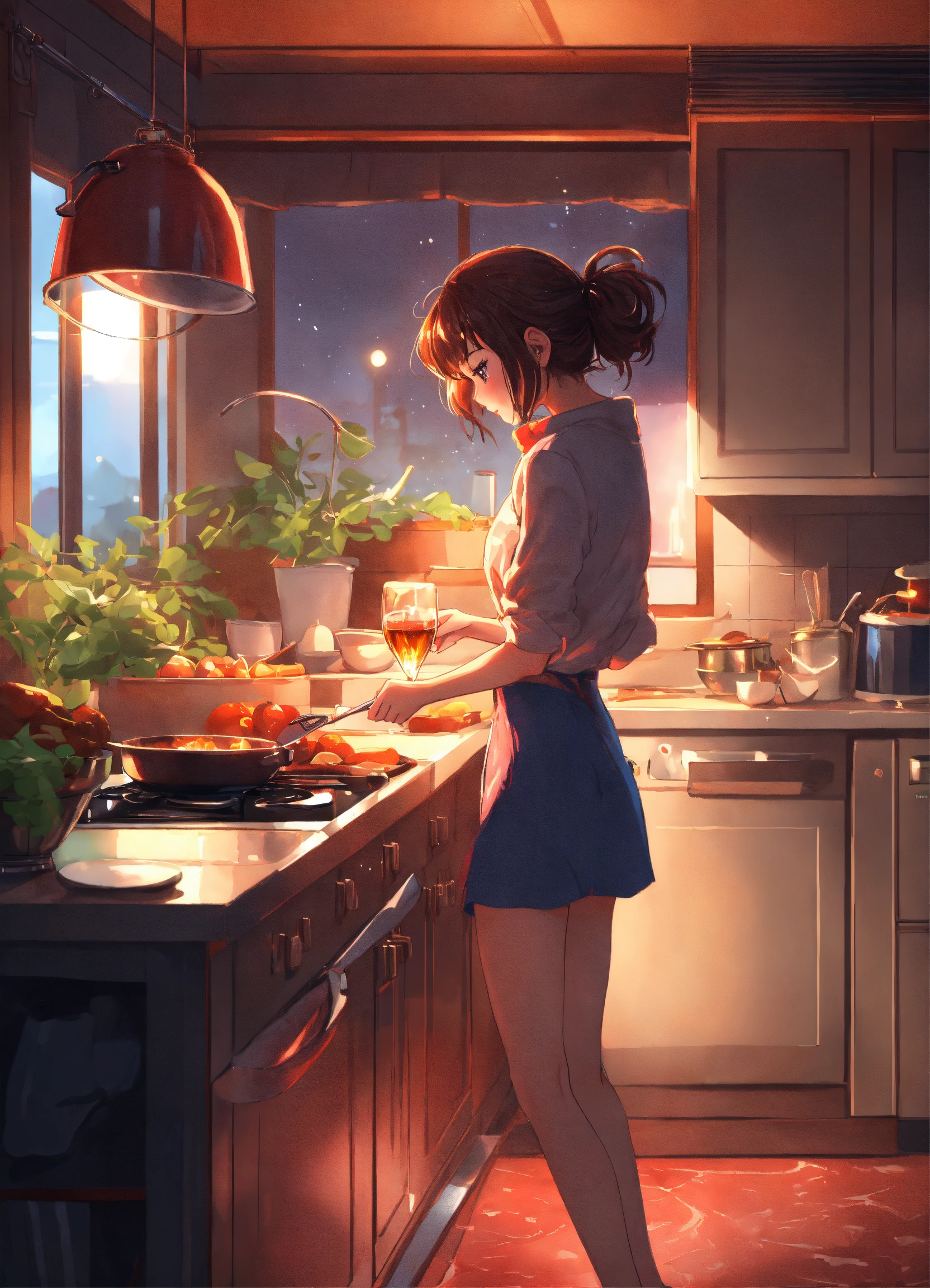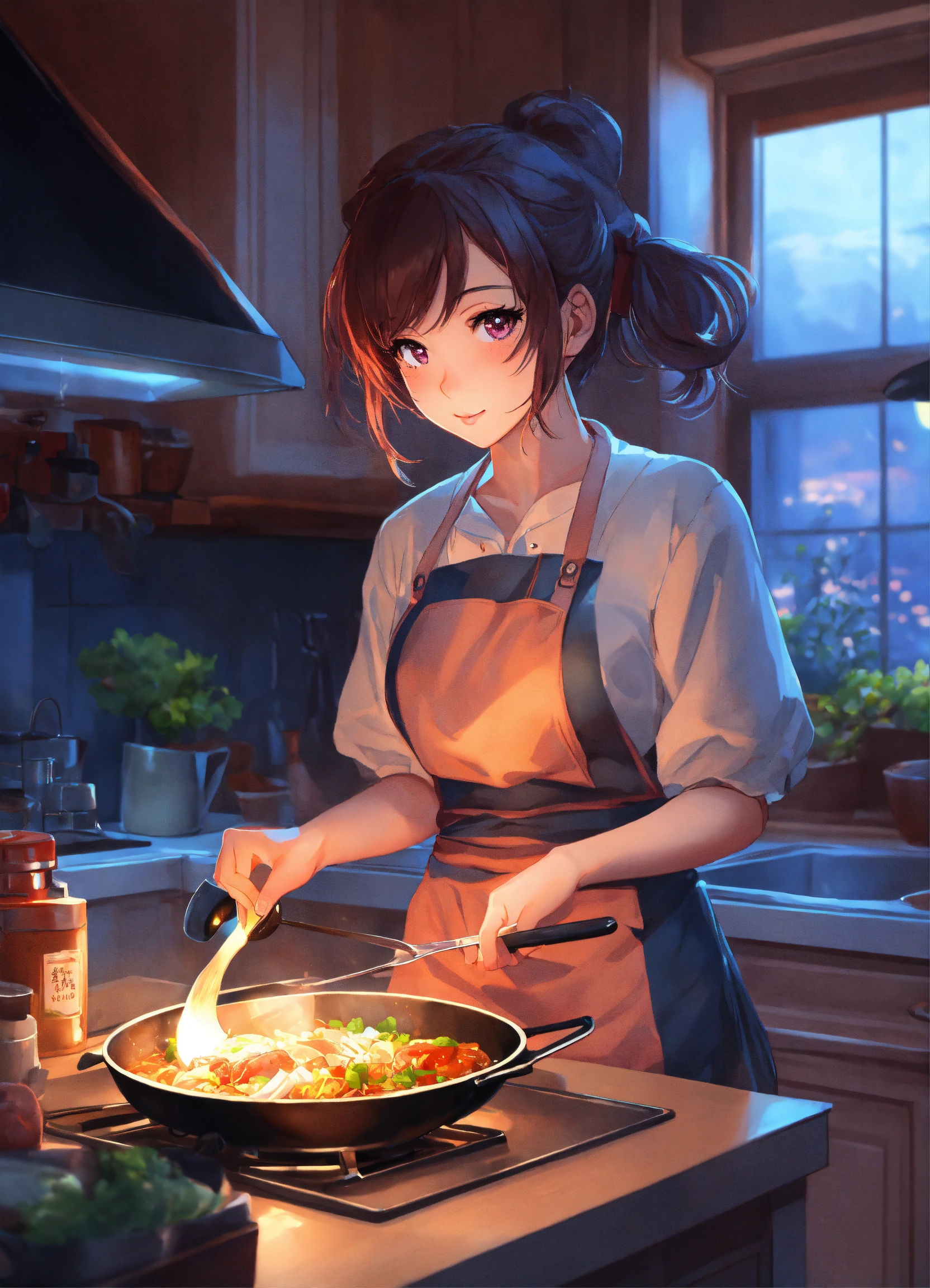 A cute anime lofi girl cooking dinner at home during the night, stunning anime art by artgerm, 8k, award-winner