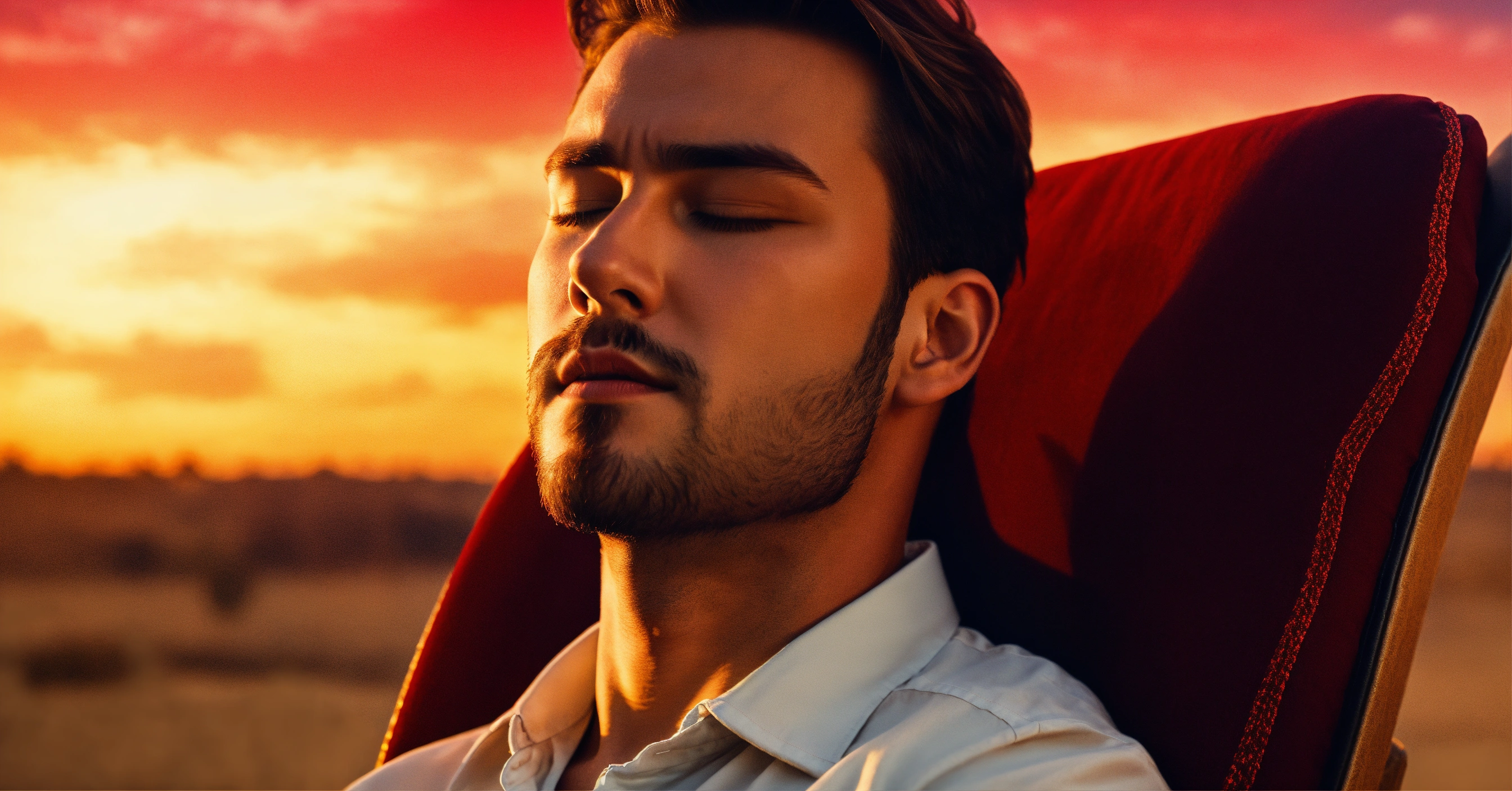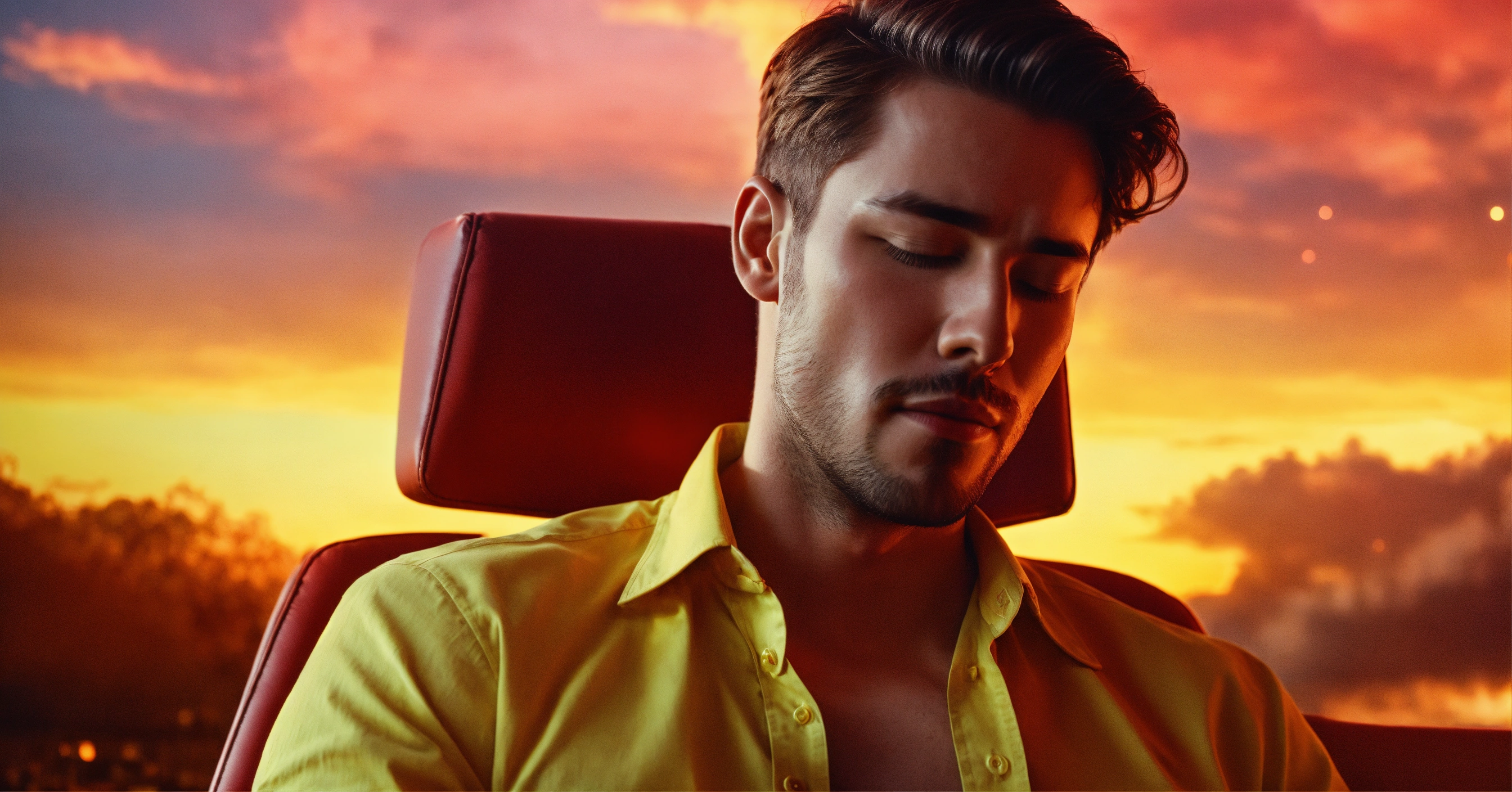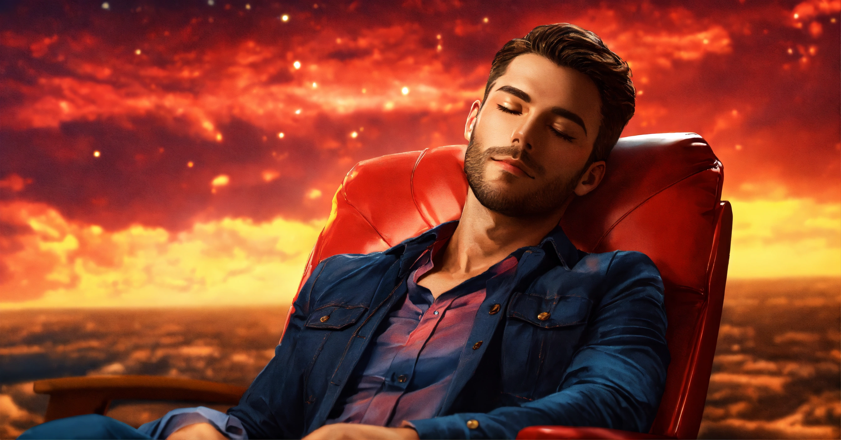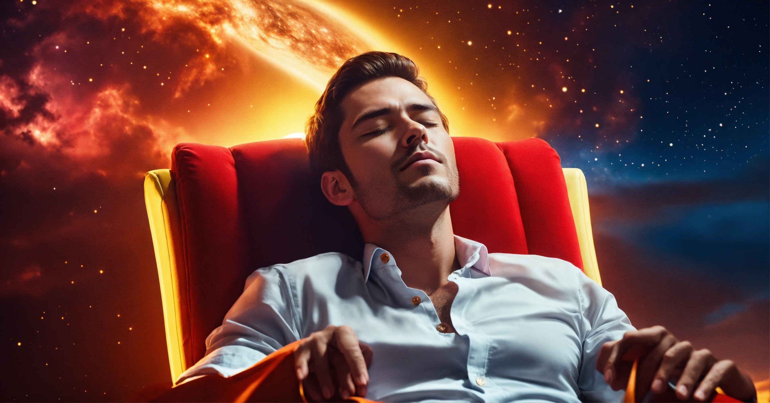 A handsome man relaxing in a chair, all shirt buttons unbuttoned, eyes closed, close up, bright red and yellow universe in the sky behind him, 4k resolution photo realistic