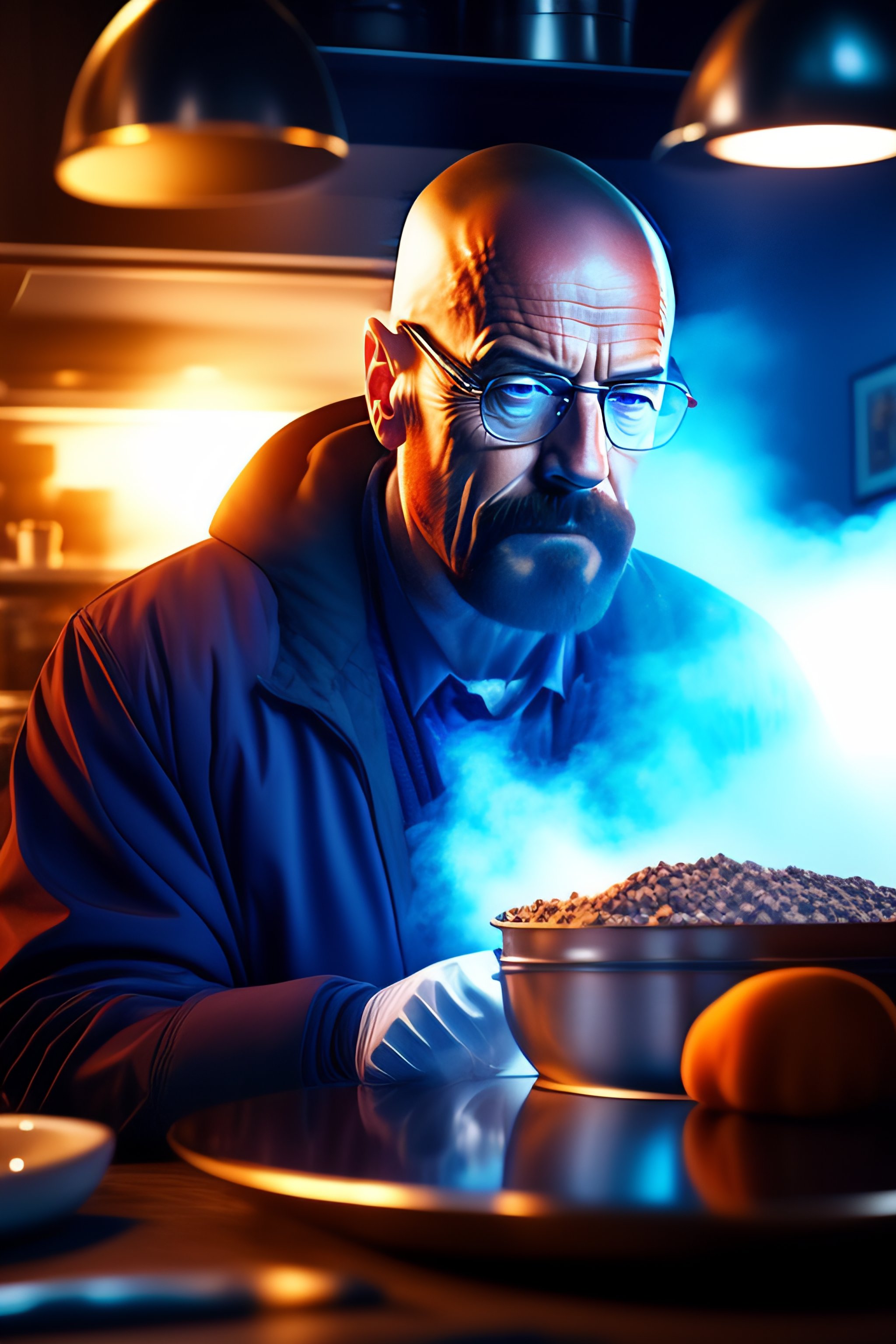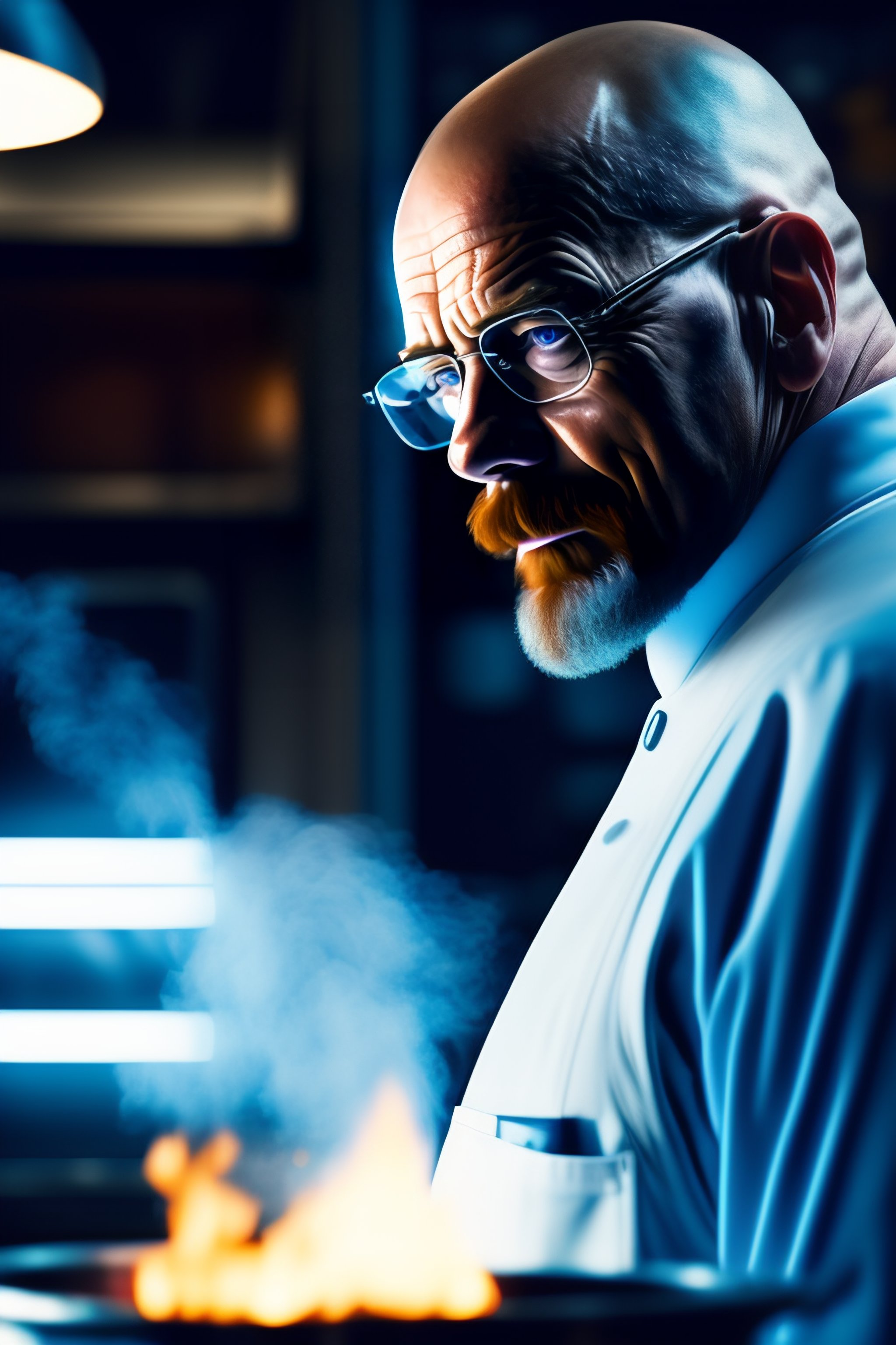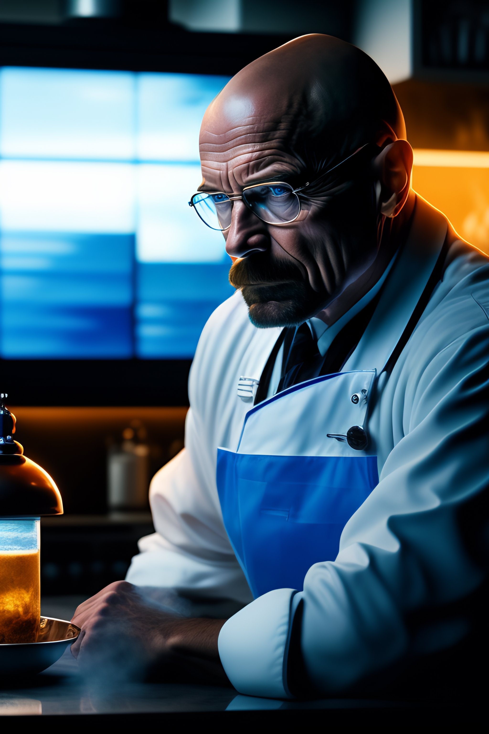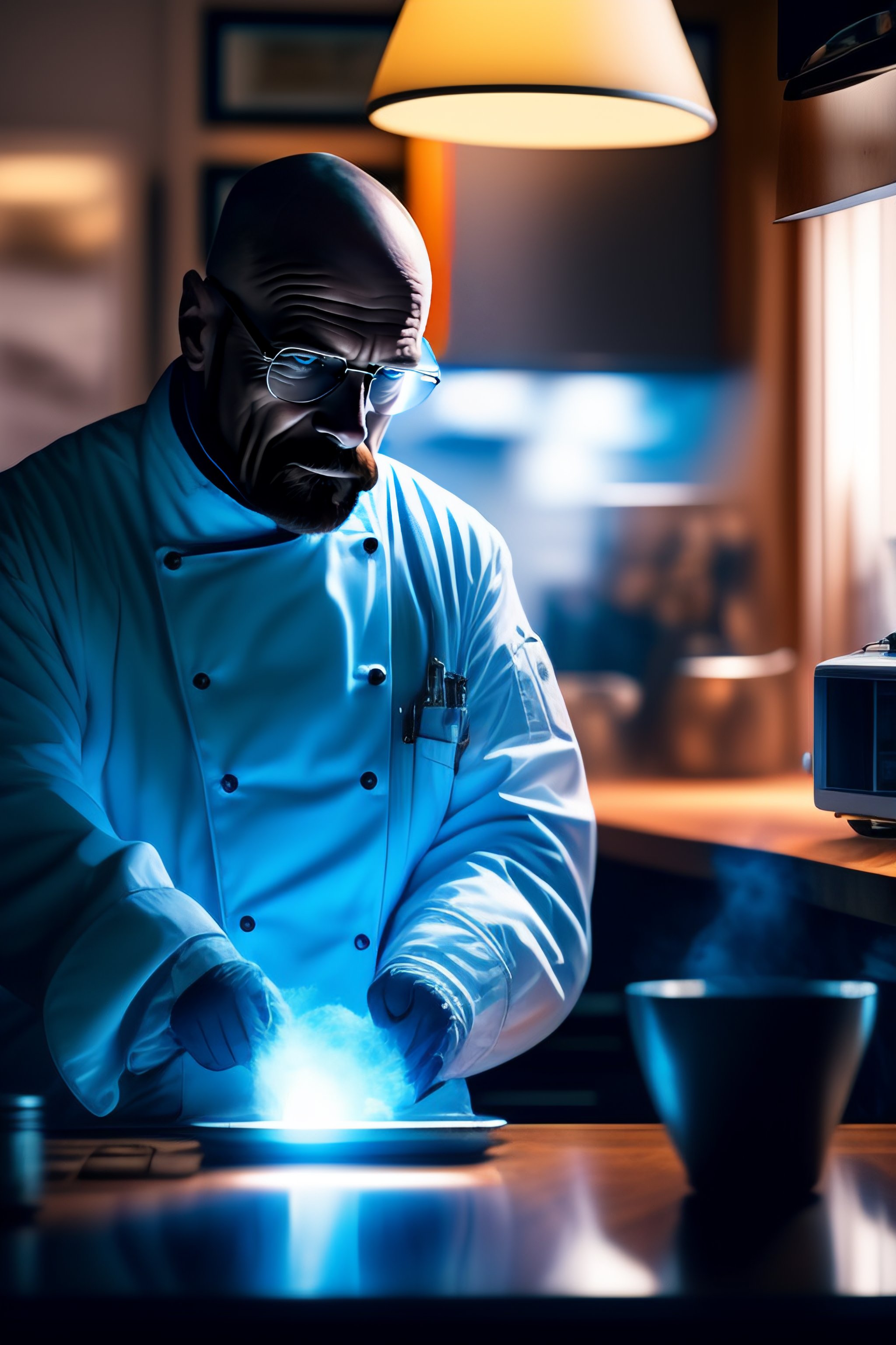 Walter white cooking blue in his office, hdr, ultra realistic, high textures, extra details, shot by sony camera, cinematic angle