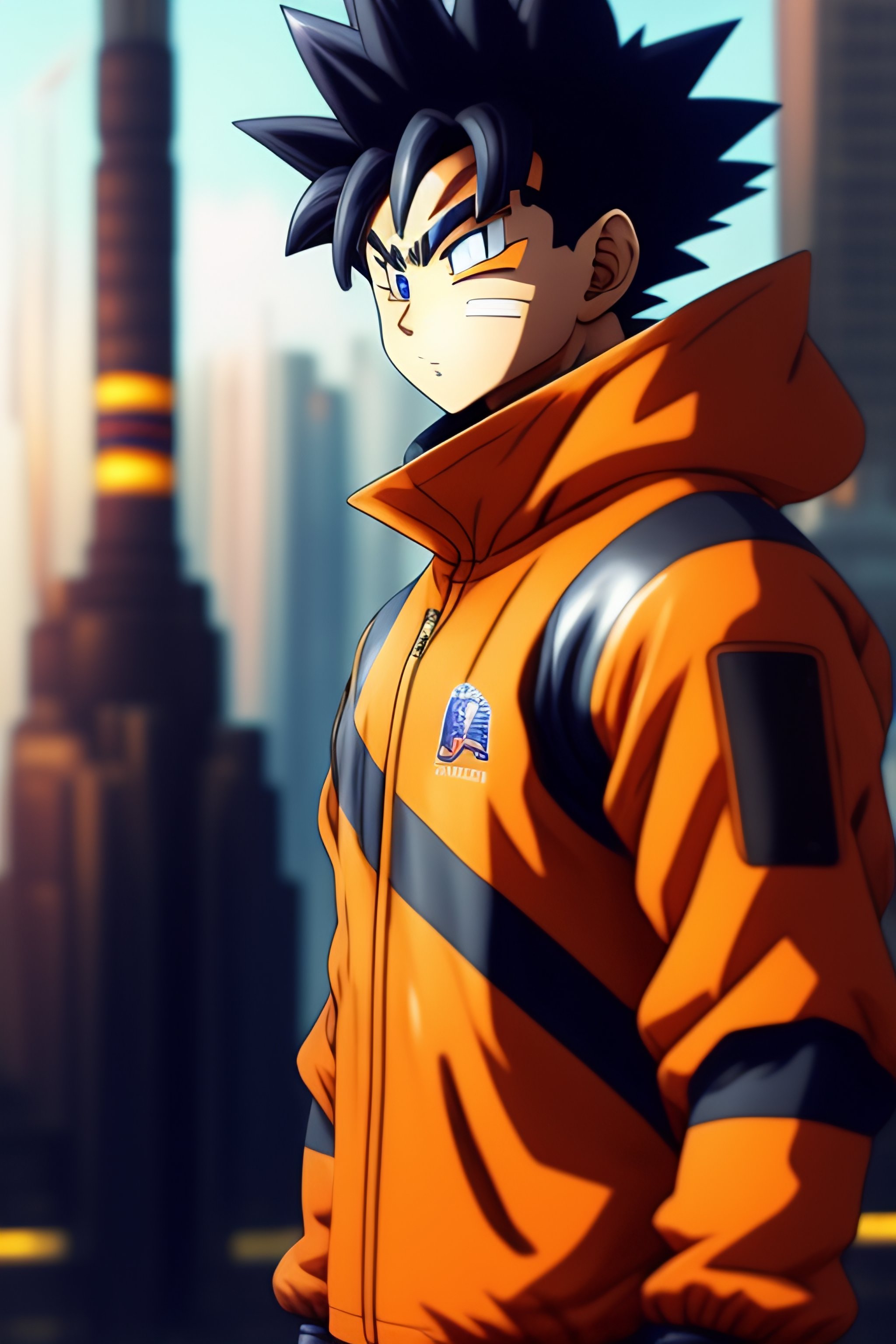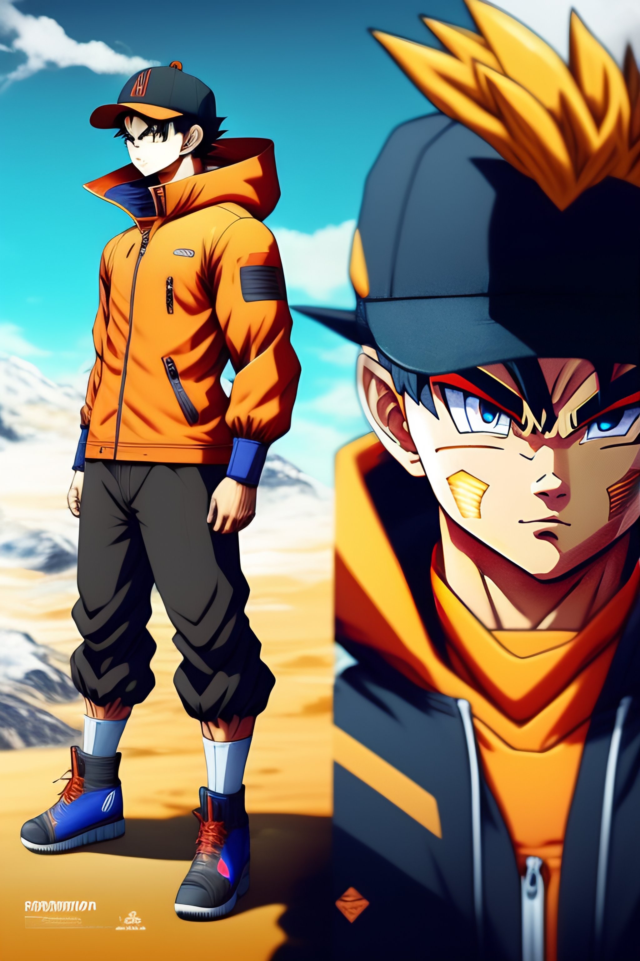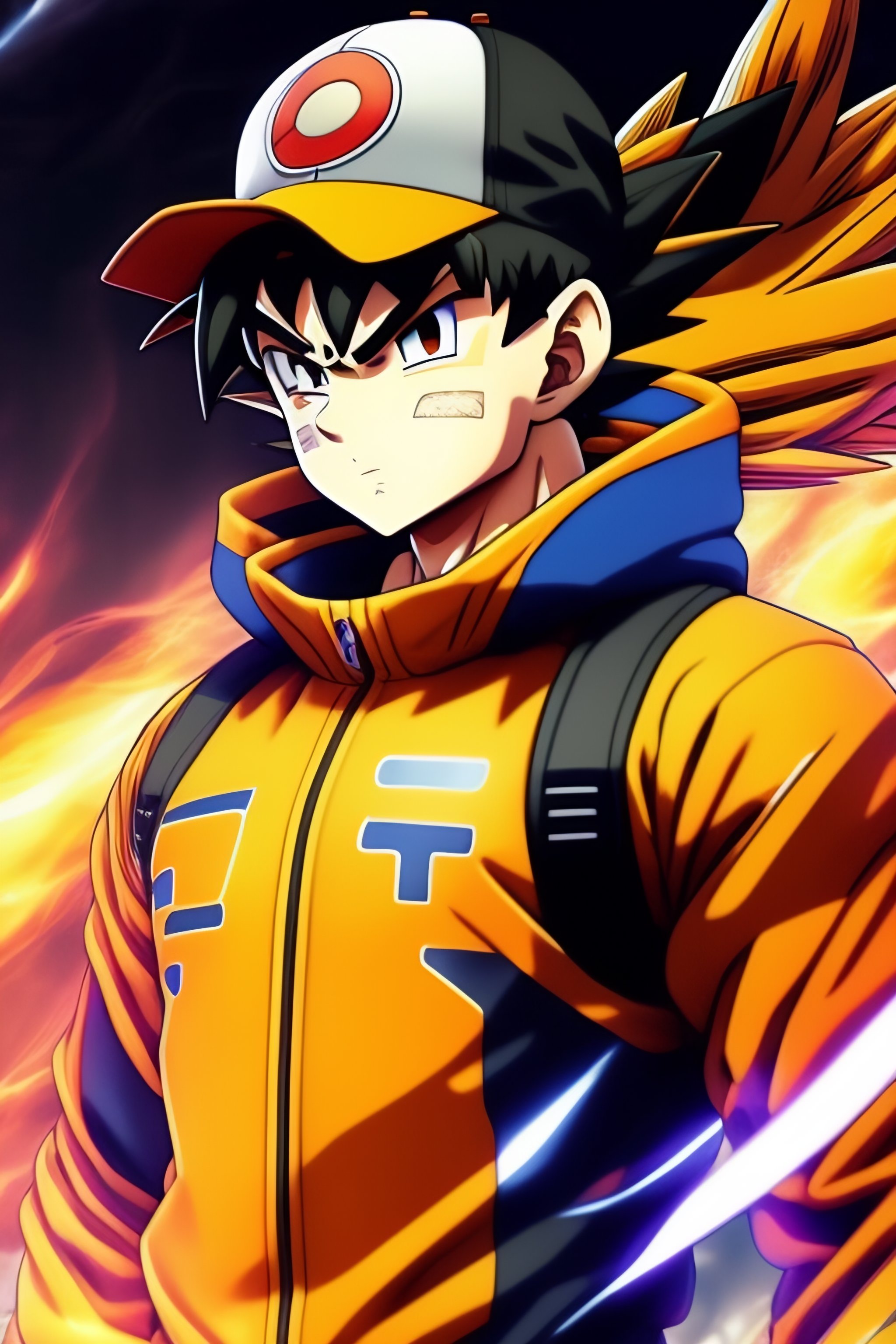 Goku pokemon trainer in techwear clothes by ken sugimori