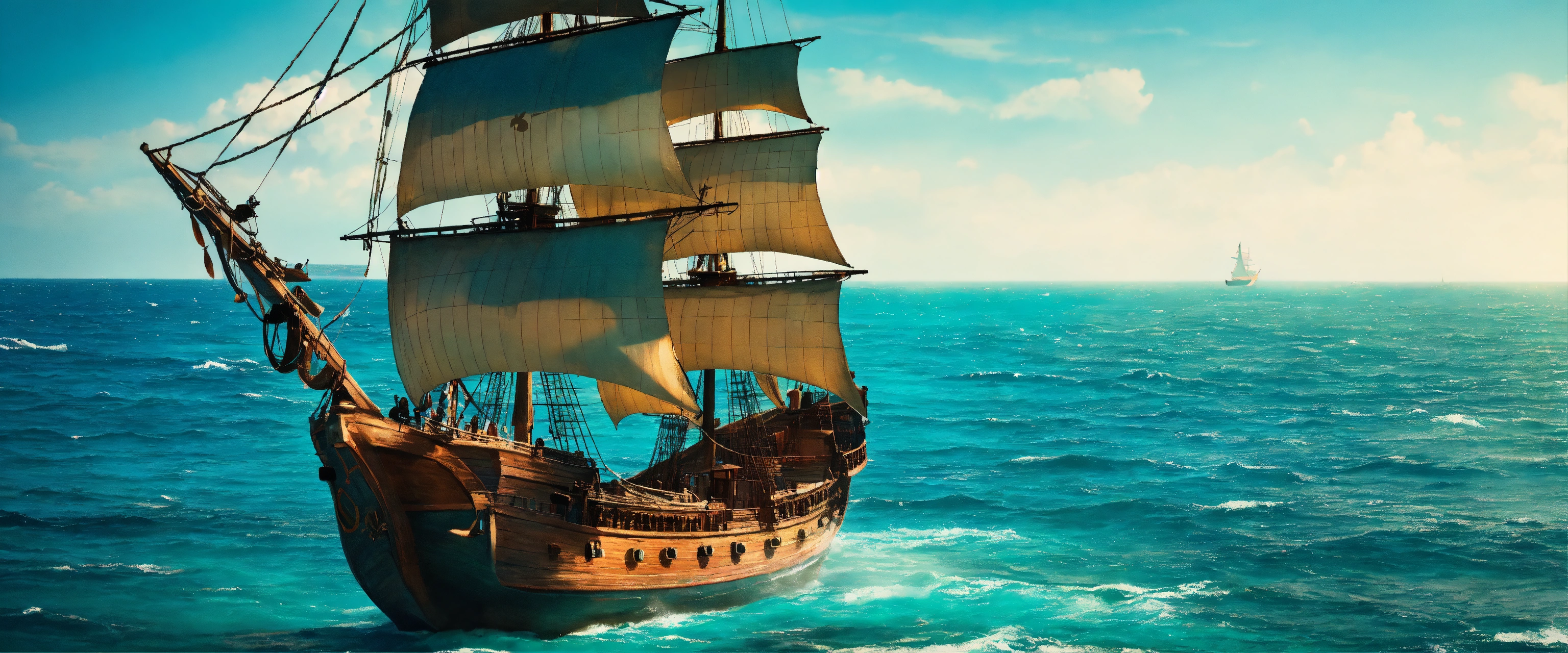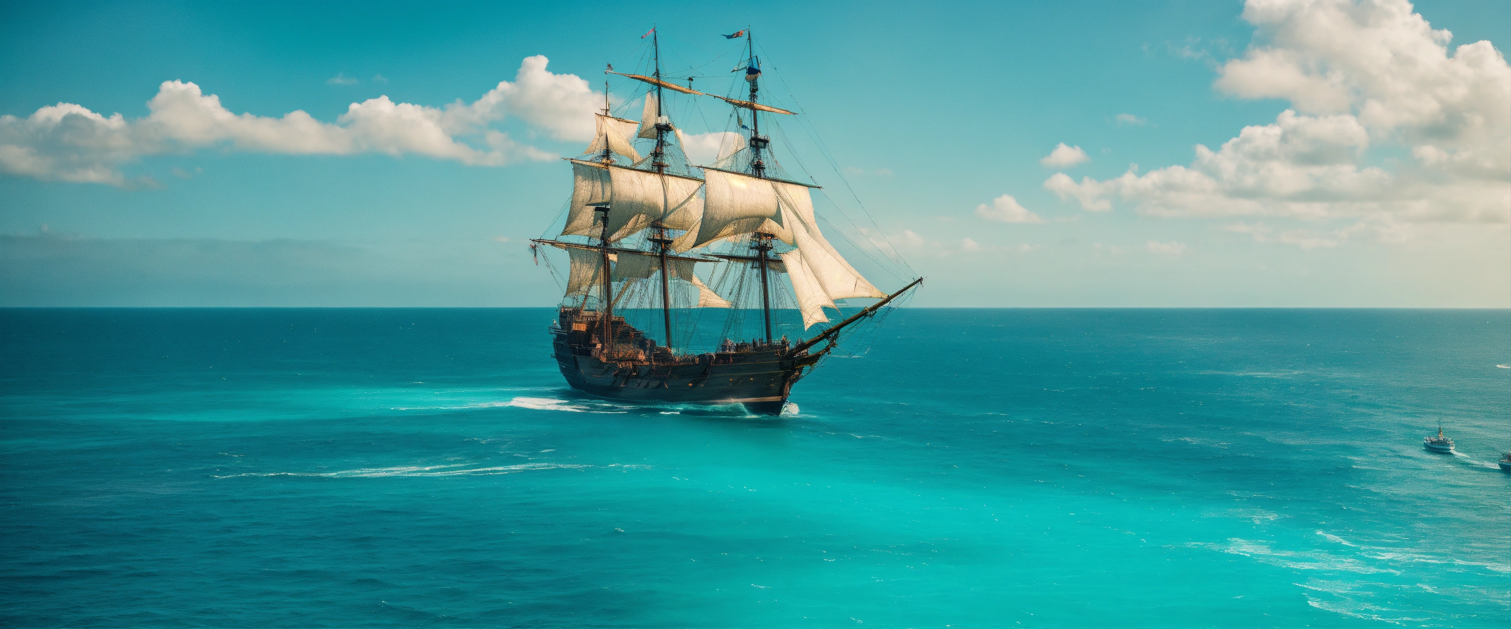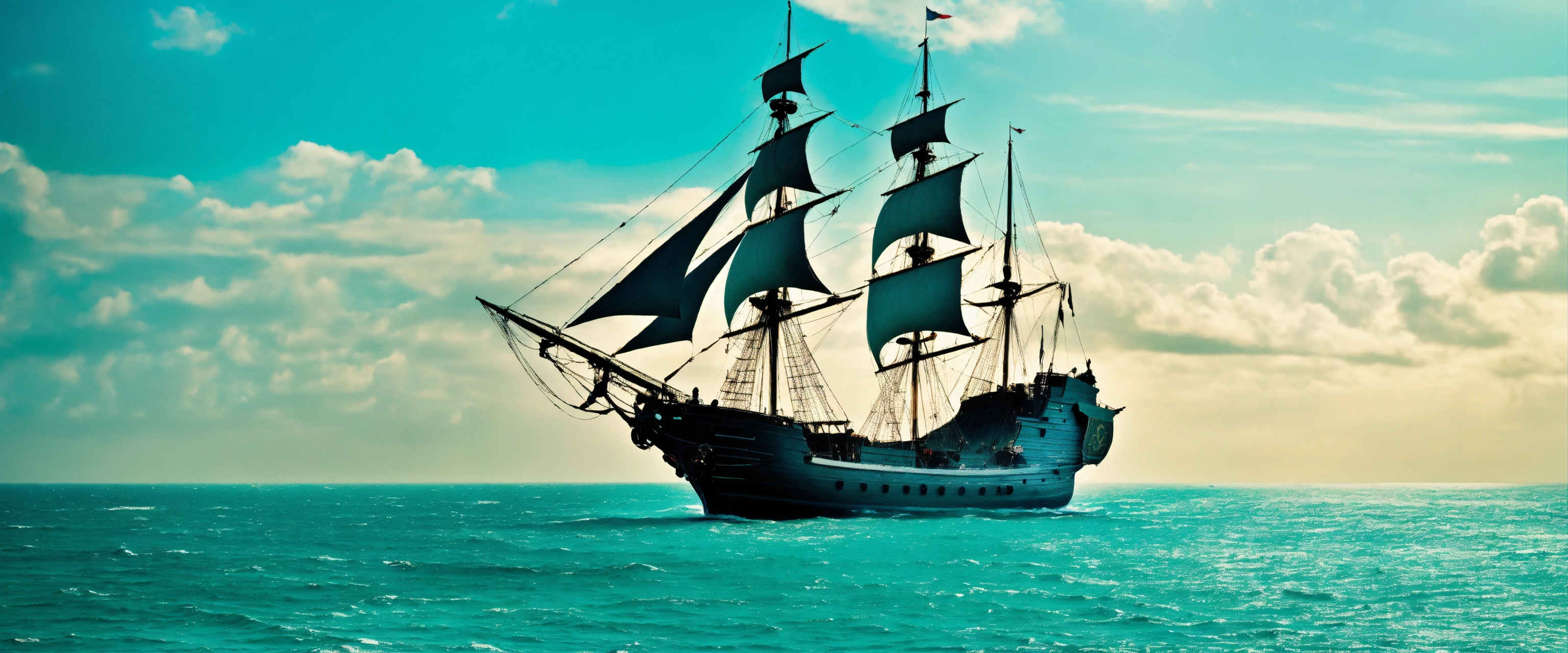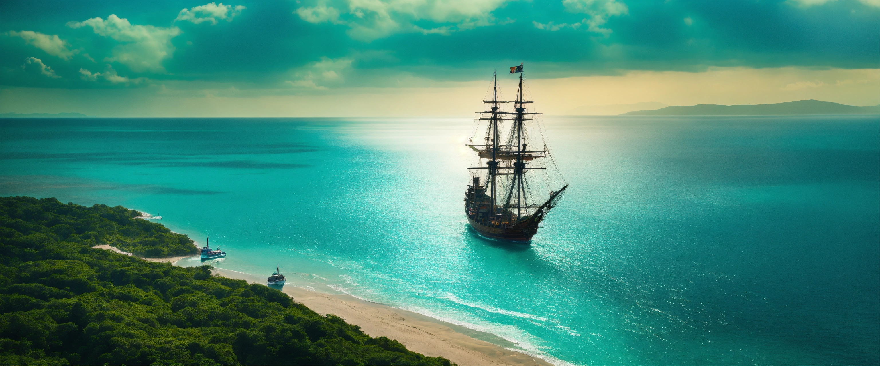 A pirate ship in open sea changing course, aerial view, turquoise sails, land in the horizon, inspirational, beautiful aesthetic, changing course means changing philosophy for a company