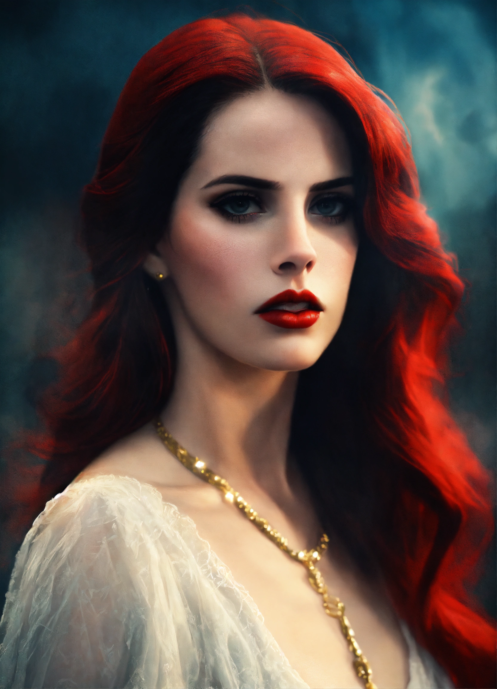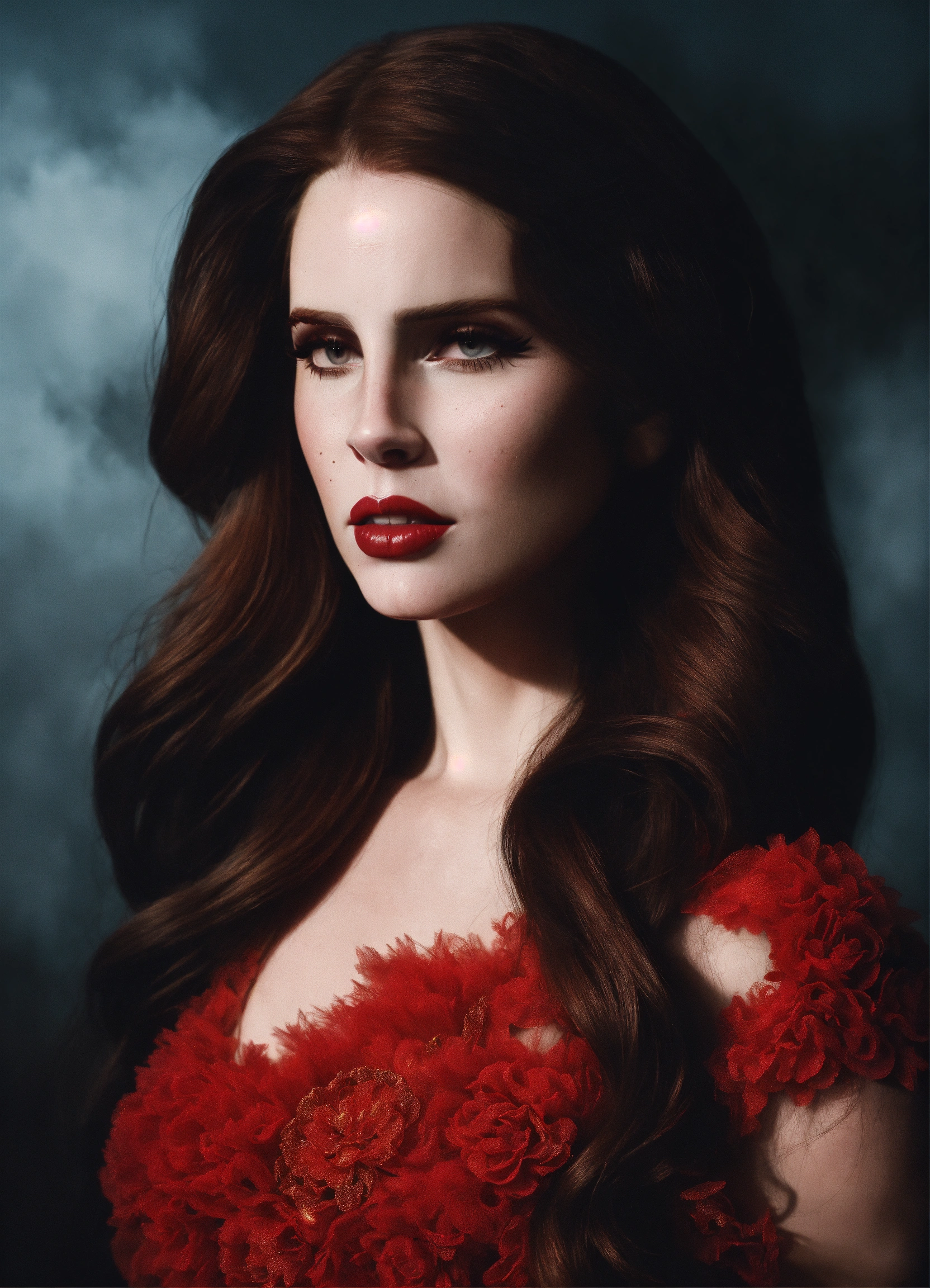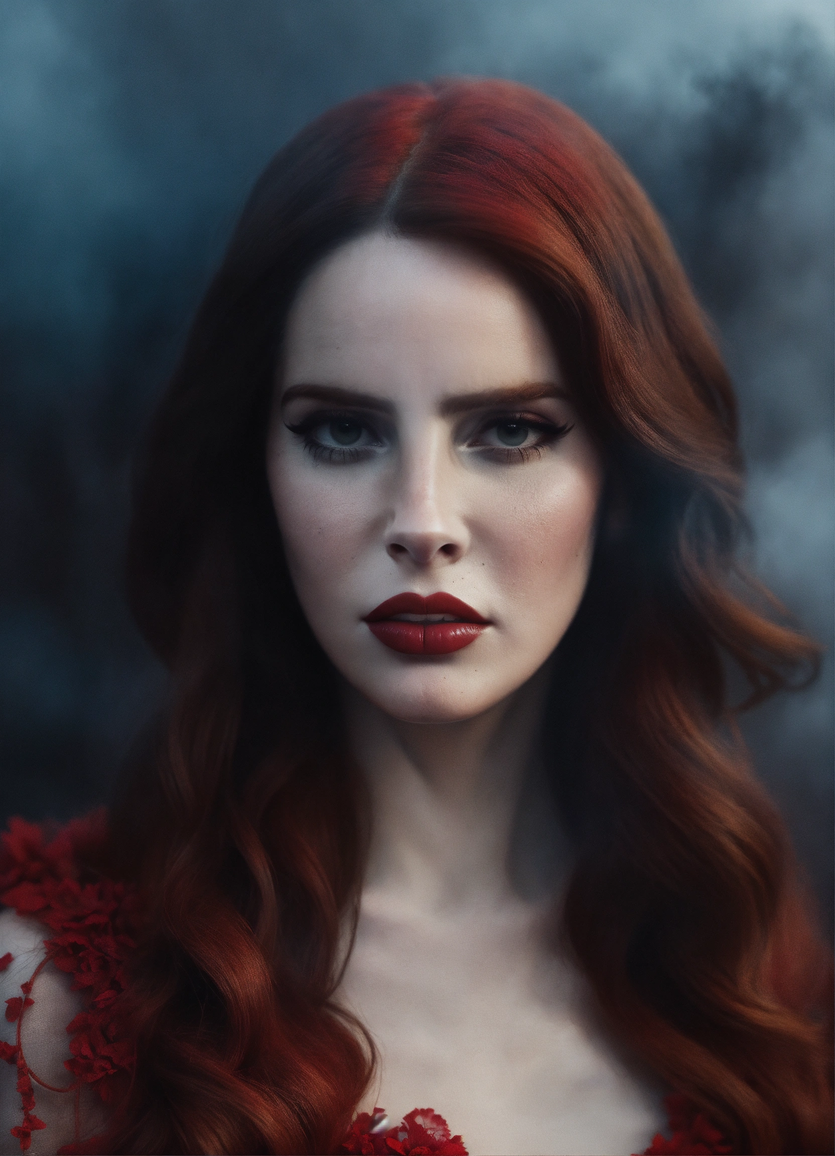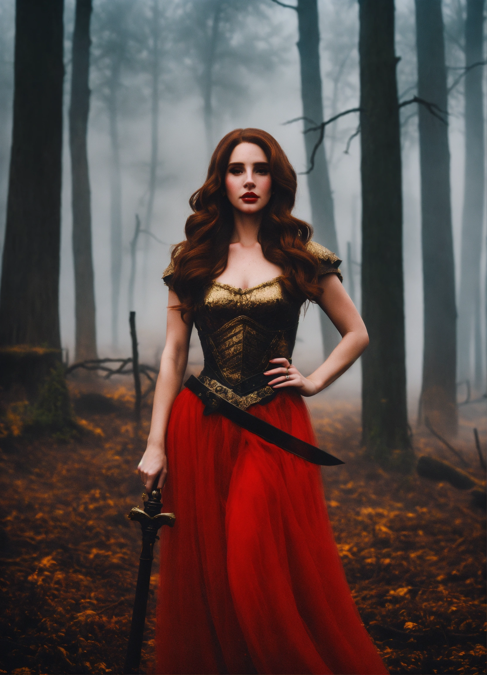 A photo quality portrait of lana del rey as a beautiful warrior with red lips, a serious expression, and surrounded by spooky fog.