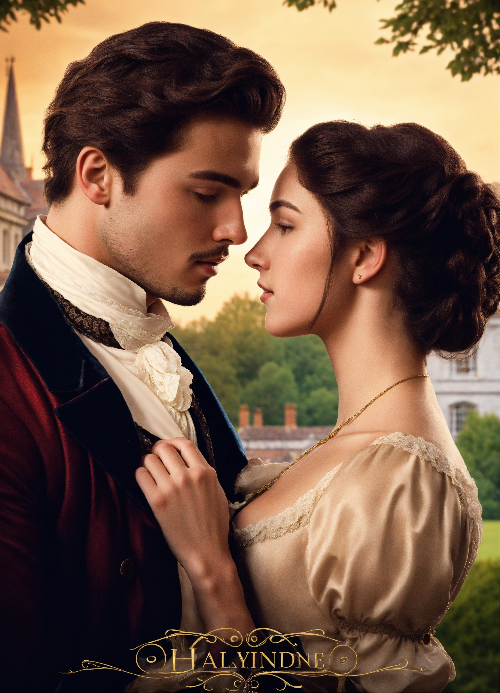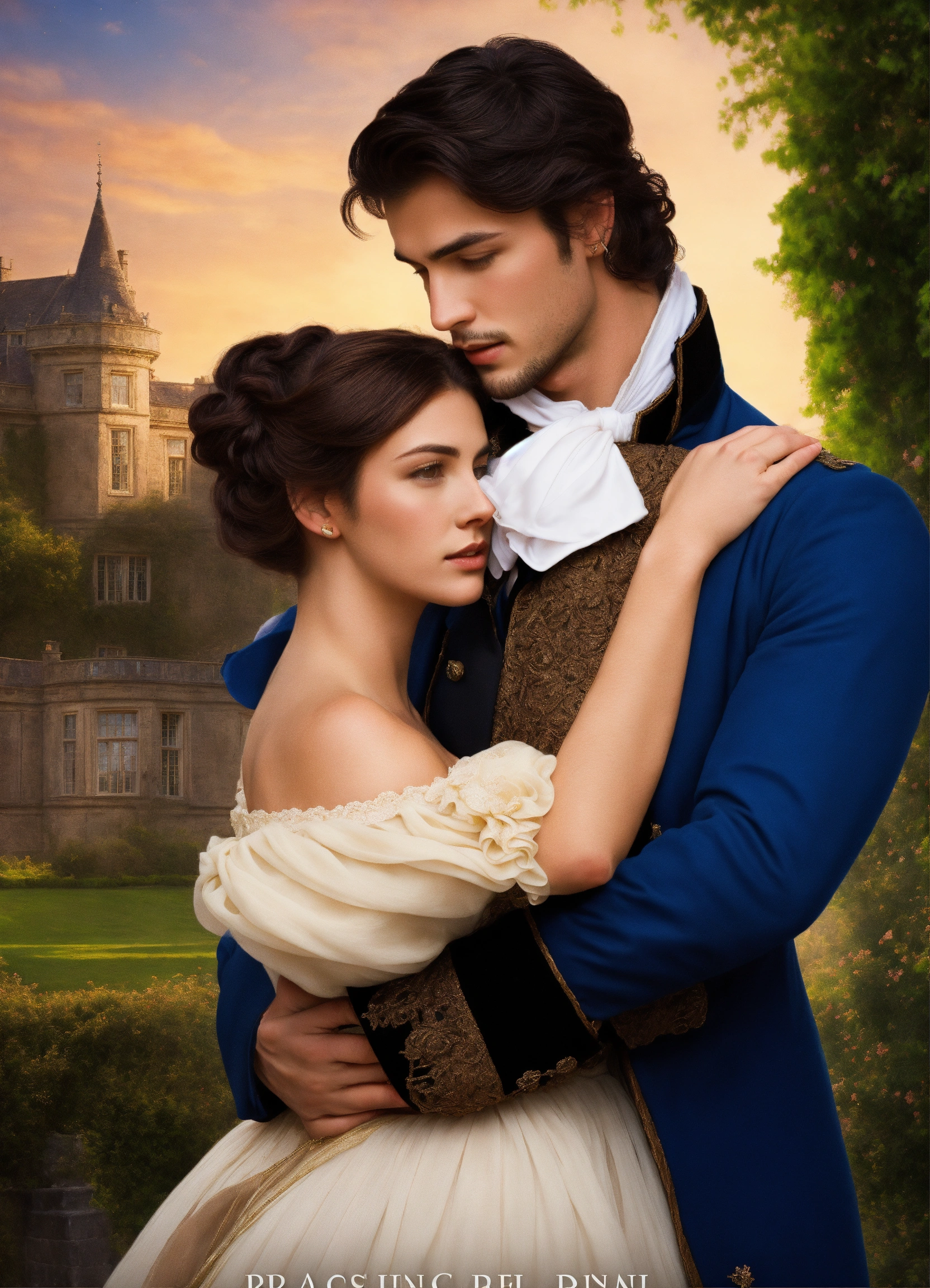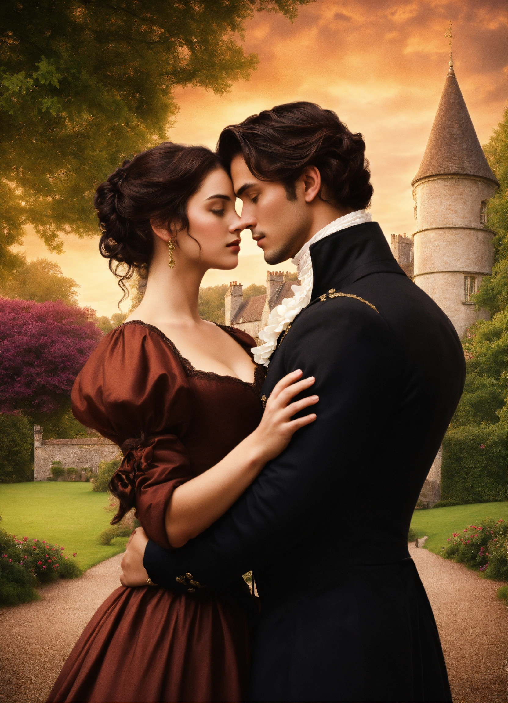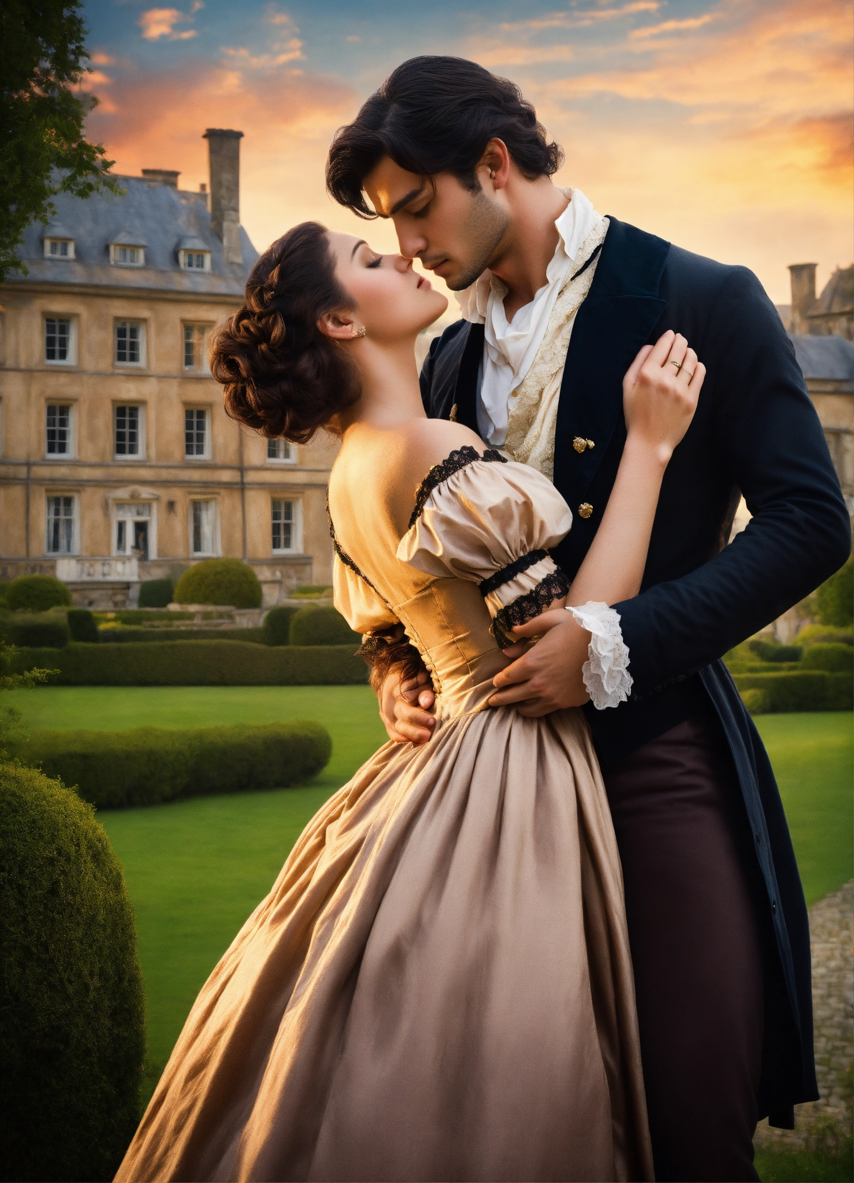 Regency romance cover, young attractive regency woman with brown hair pinned up and a handsome man with tousseled black hair, romantic embrace, romantic manor in the background