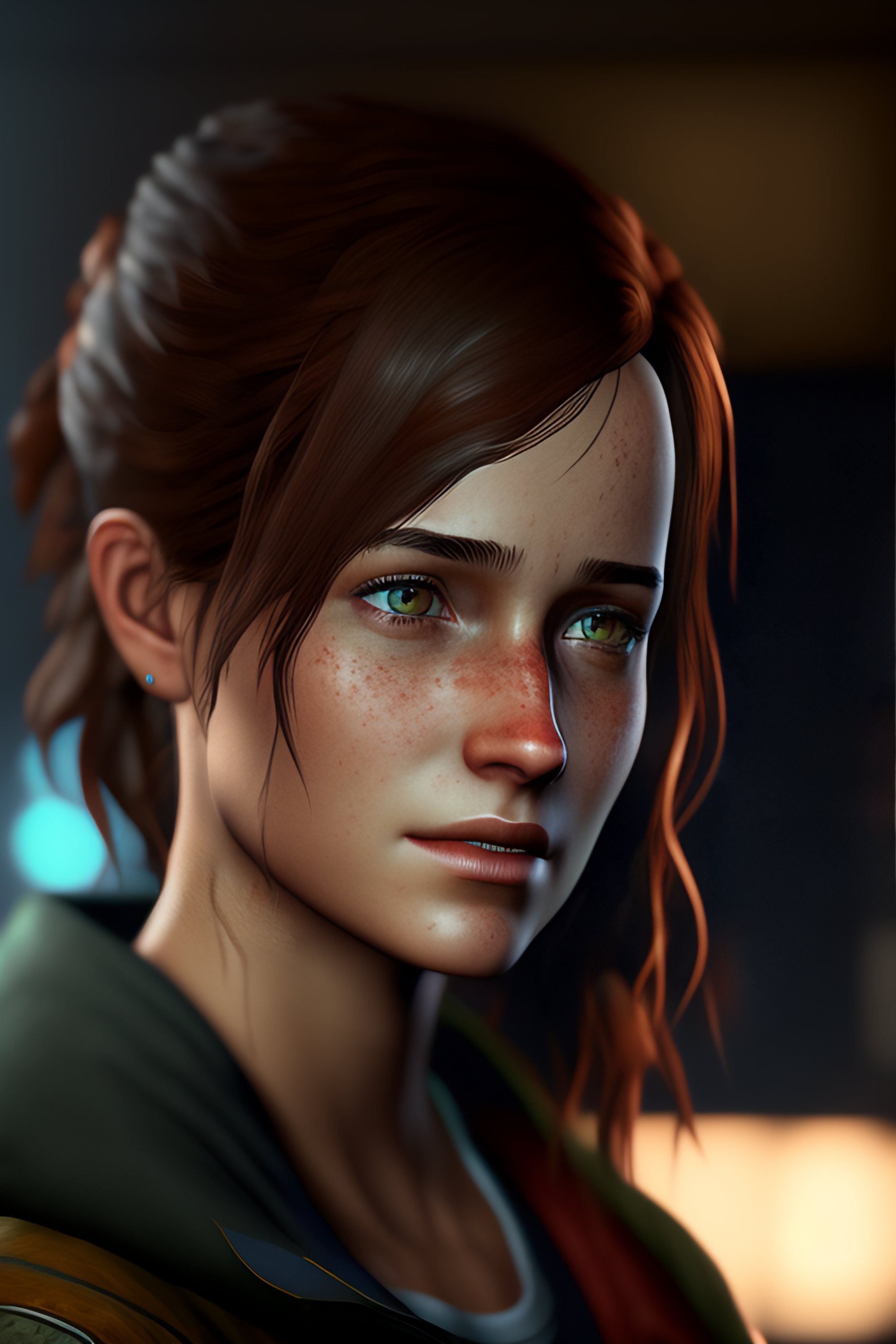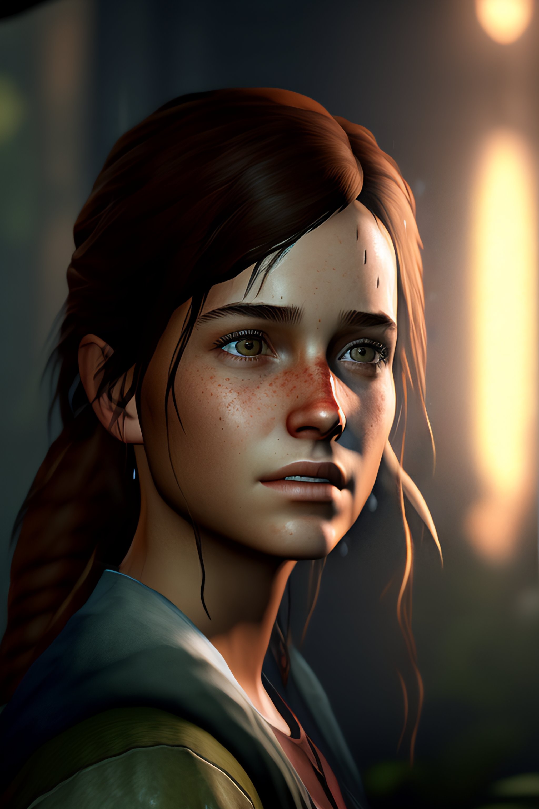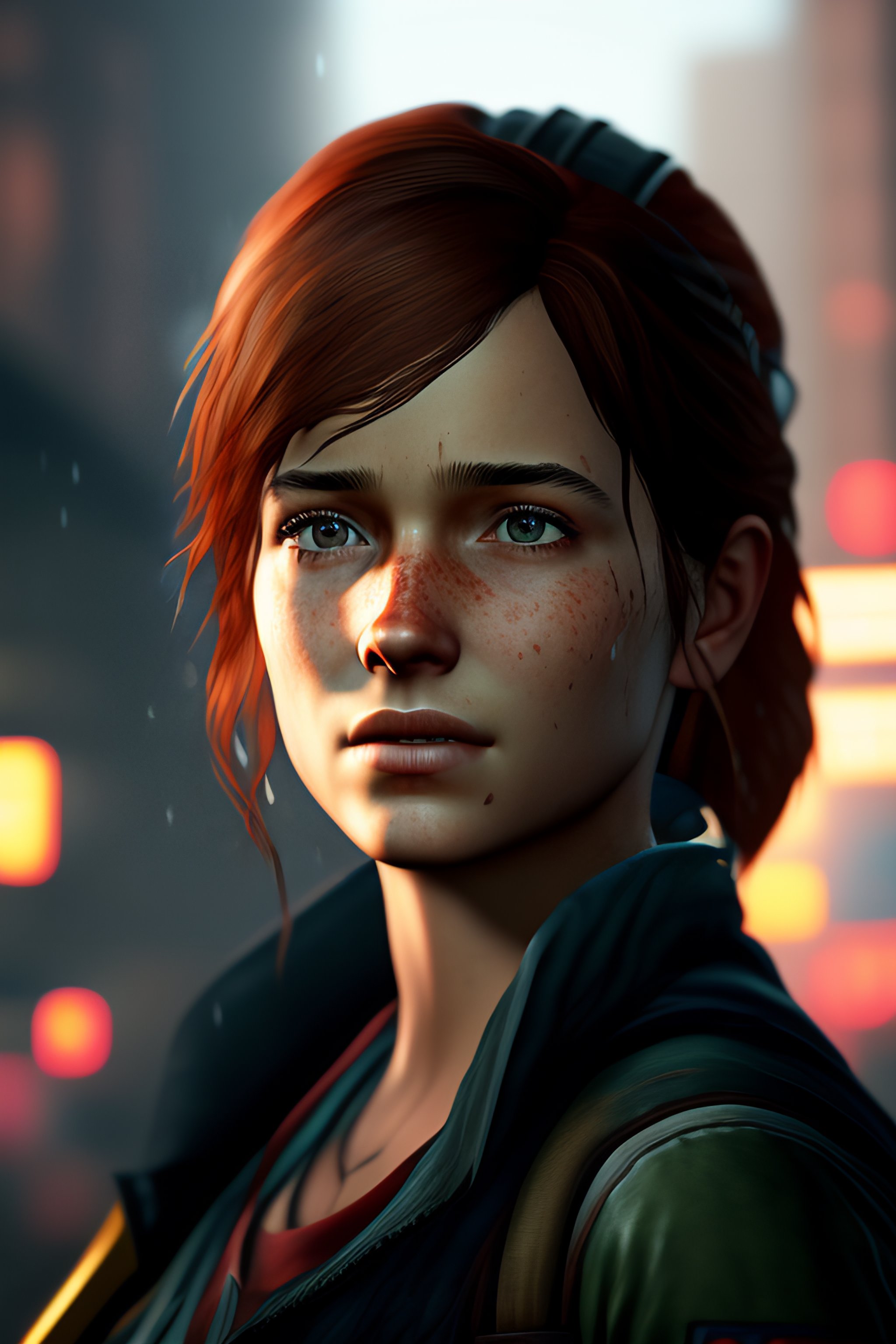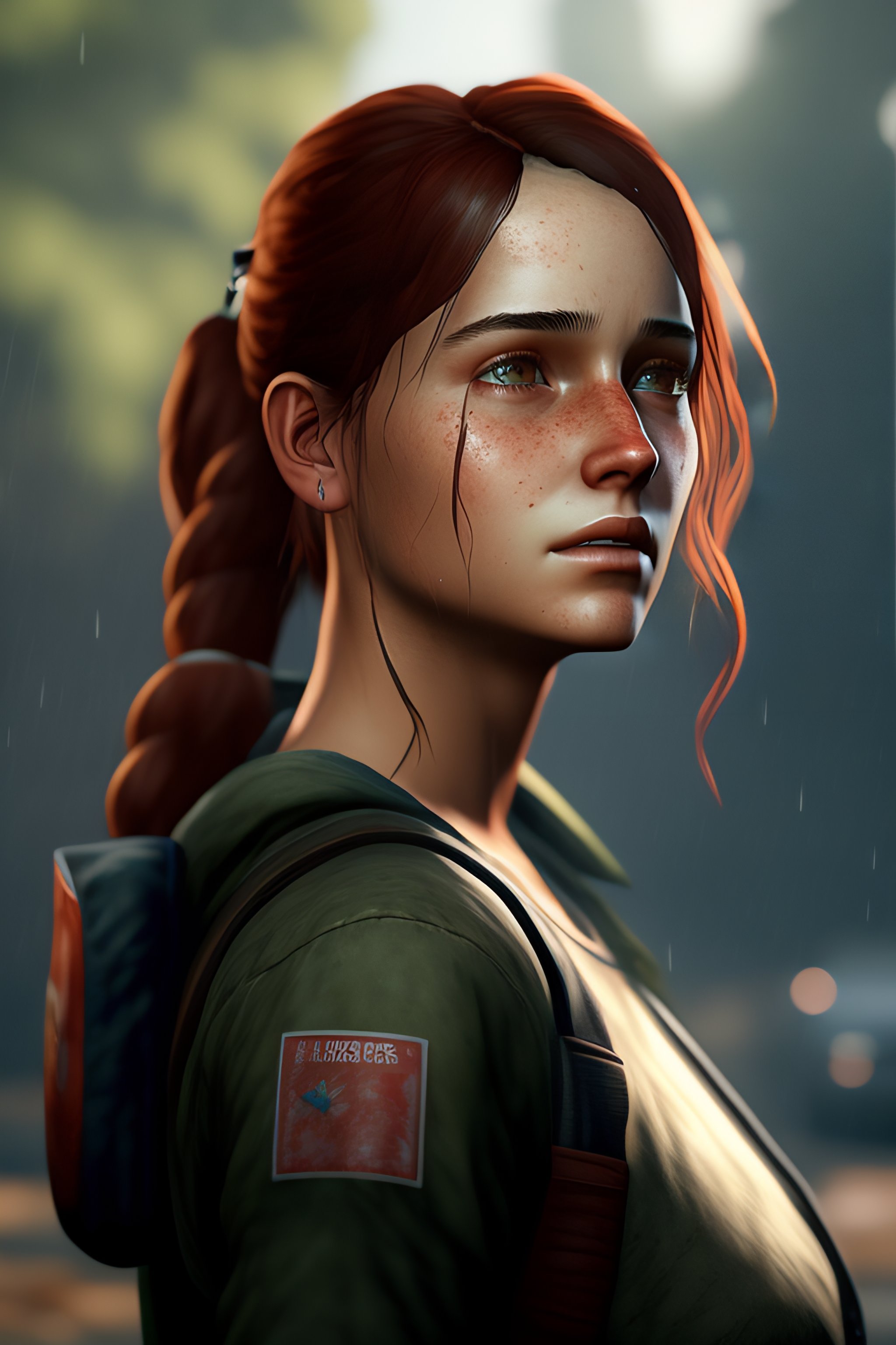 Portrait of adult ellie from the game the last of us 2, medium shot looking to the side, raining, traces of rain on her face --ar 16:9 --test