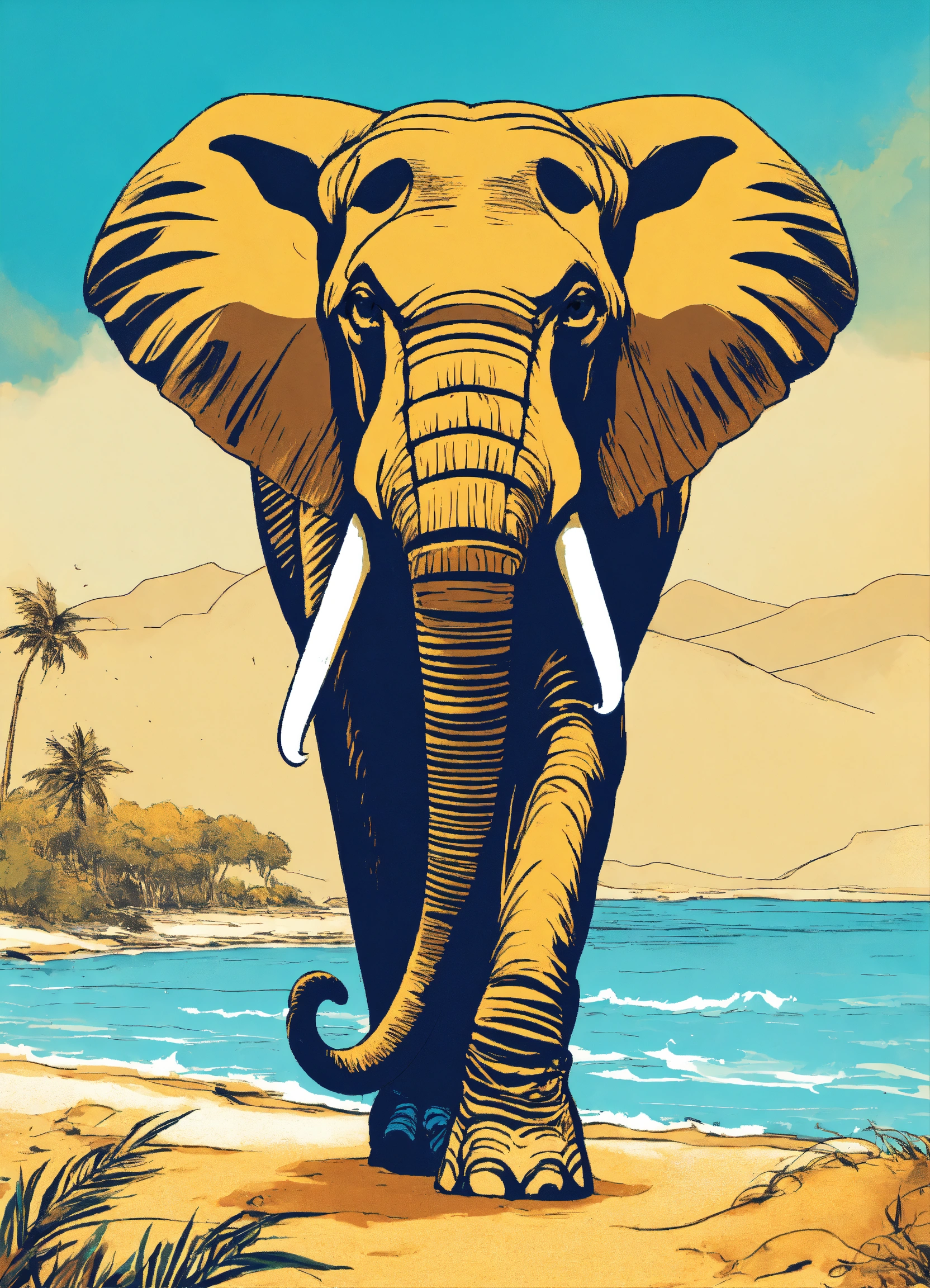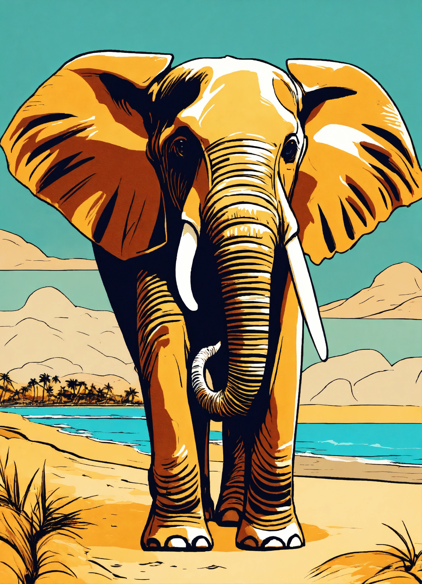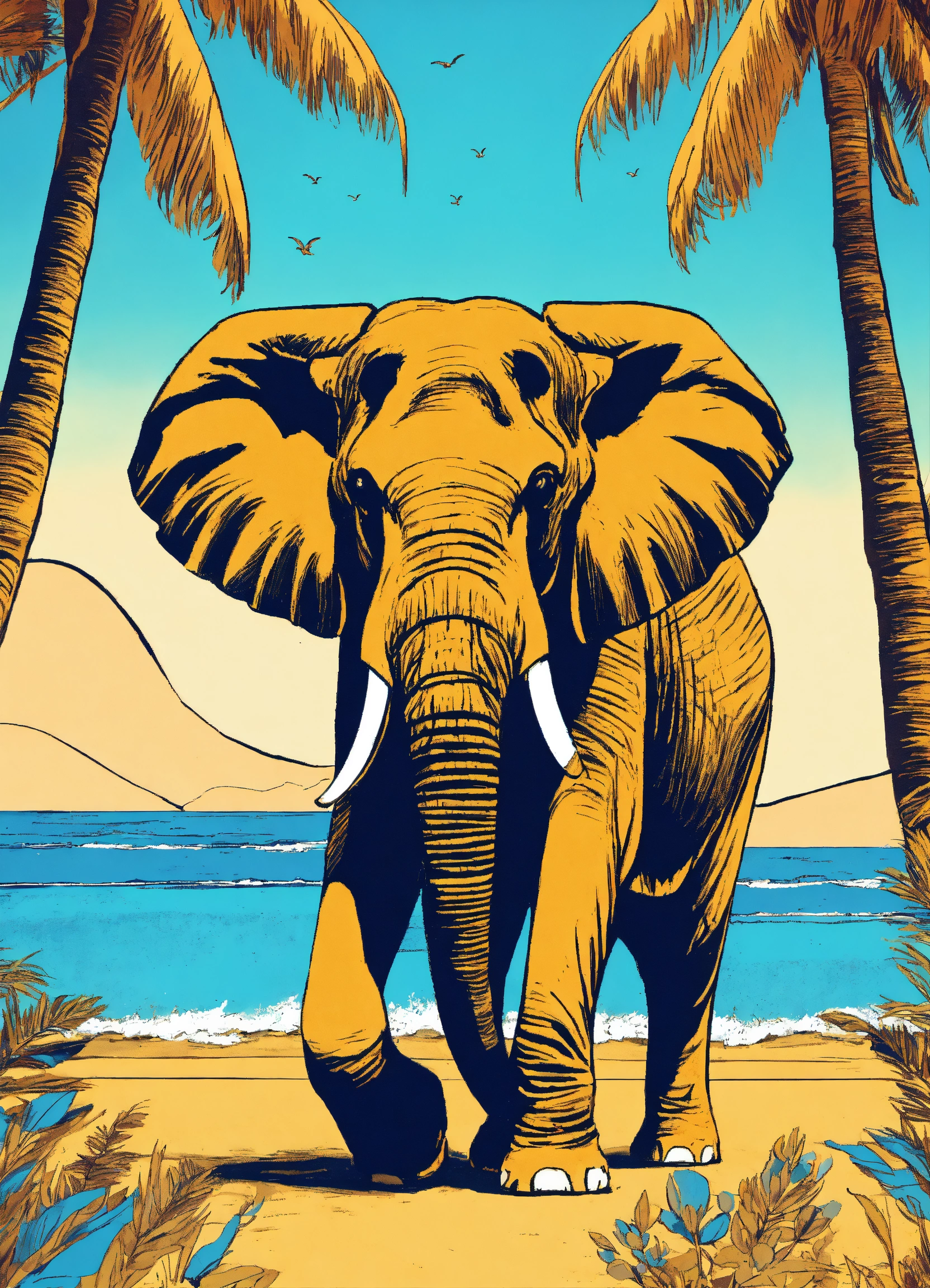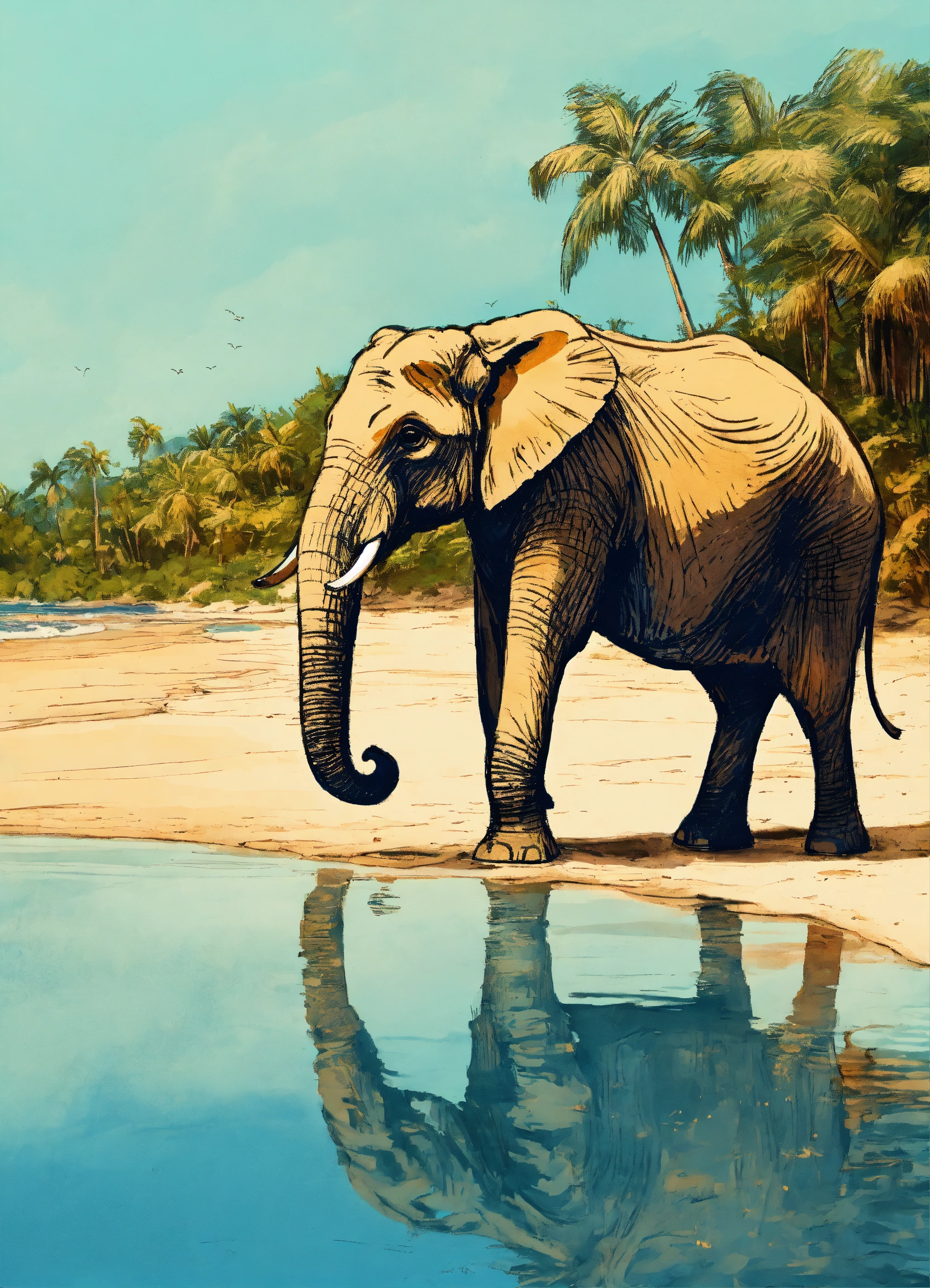 A an elephant on a pretty beach surrounded by golden sand and blue water