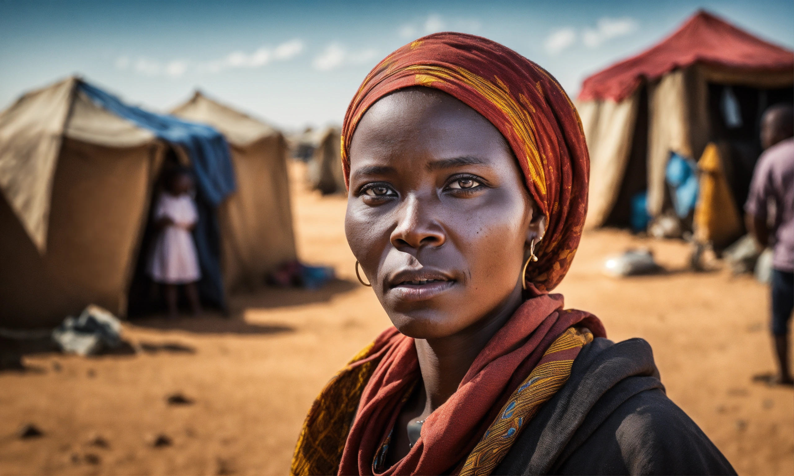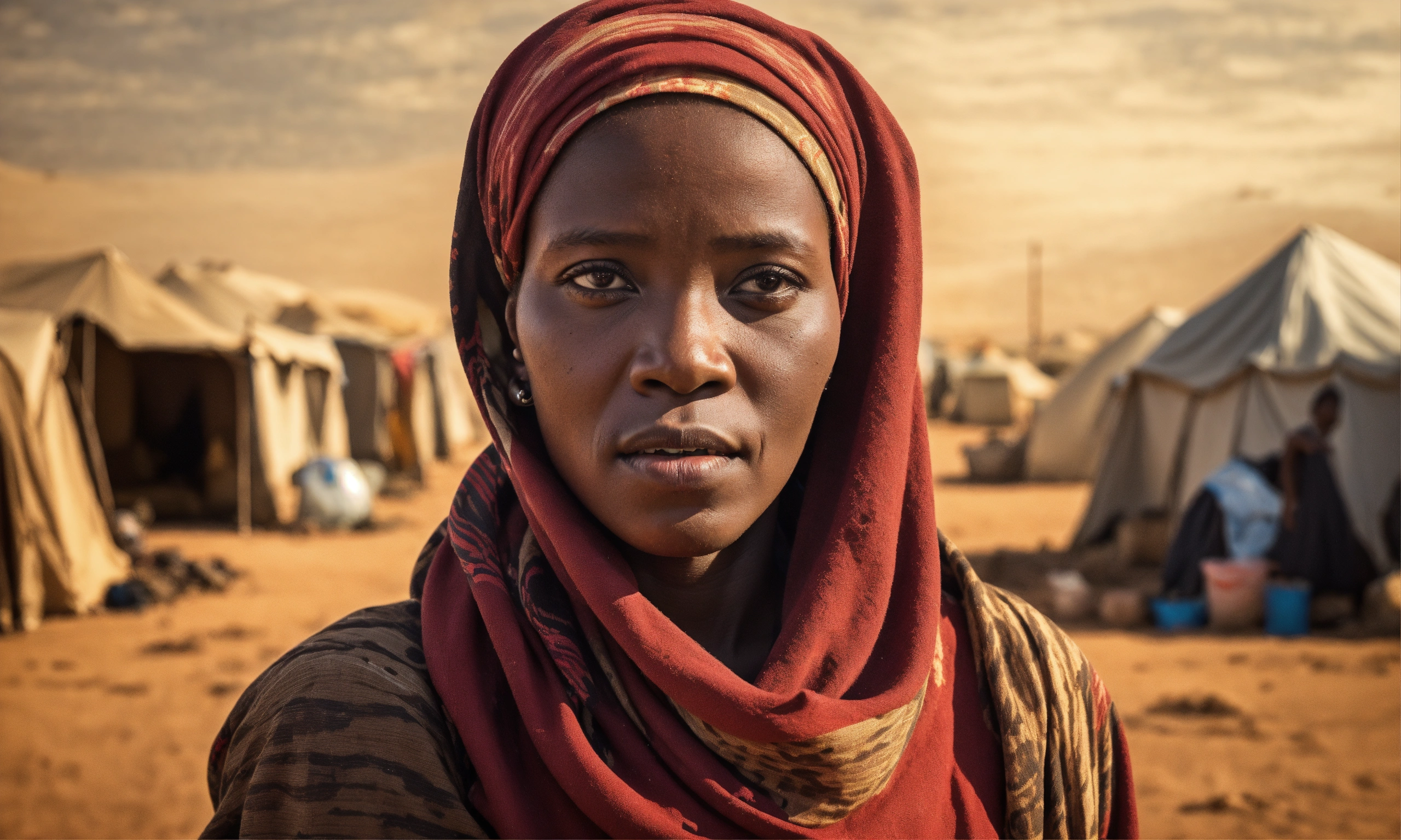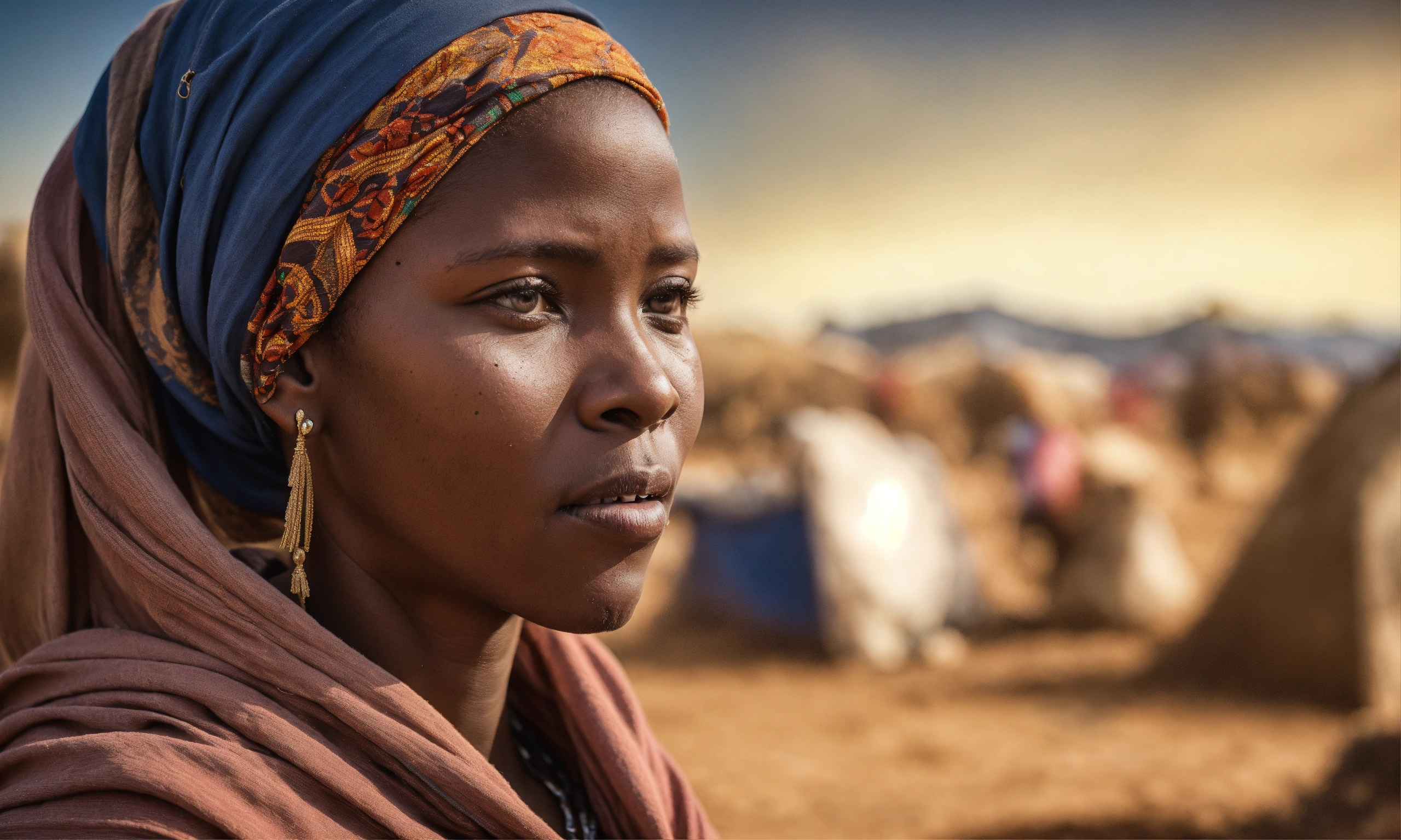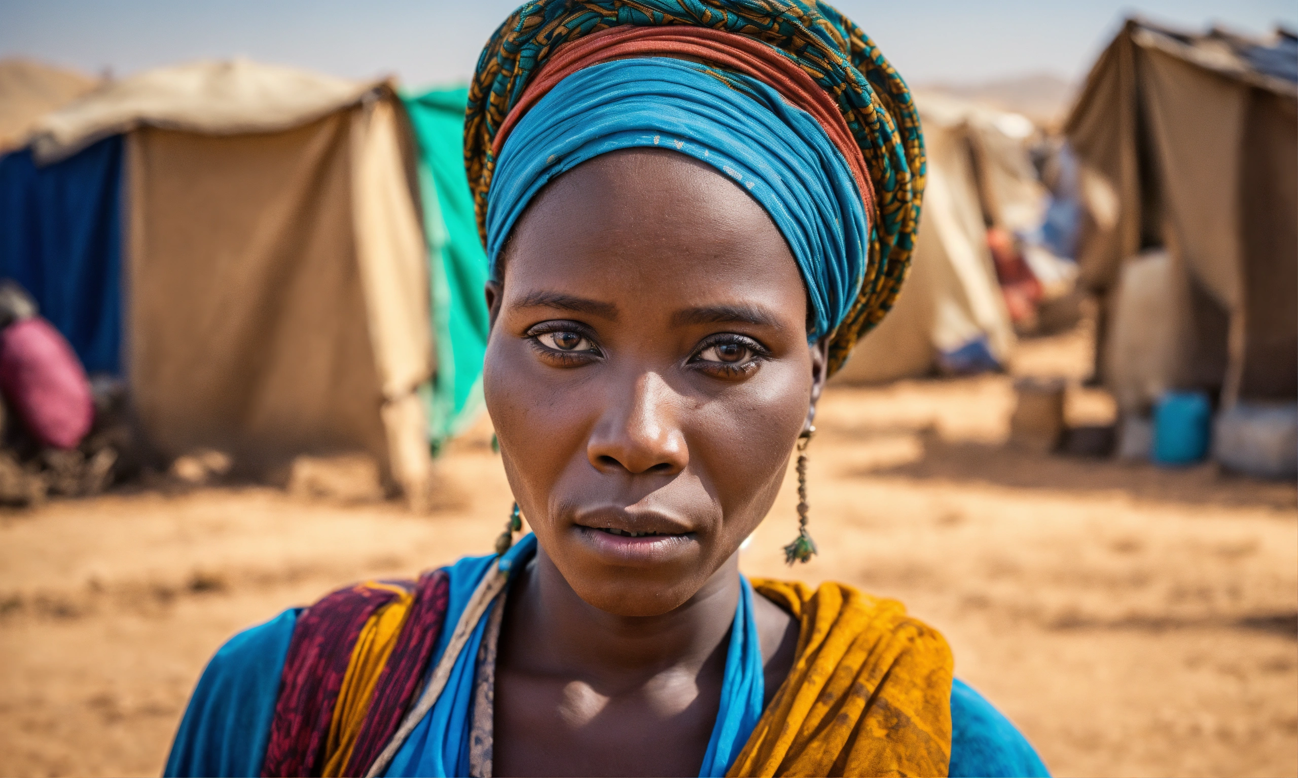 A photo of a poor african woman, 30 years old, in a refugee camp in a desert, concept of charity, concept of hunger, front view, photorealistic, hyperrealist, hdr, ultra resolution, perfection, super-resolution, gigapixel, nikon d850, sigma 28mm f/1.4