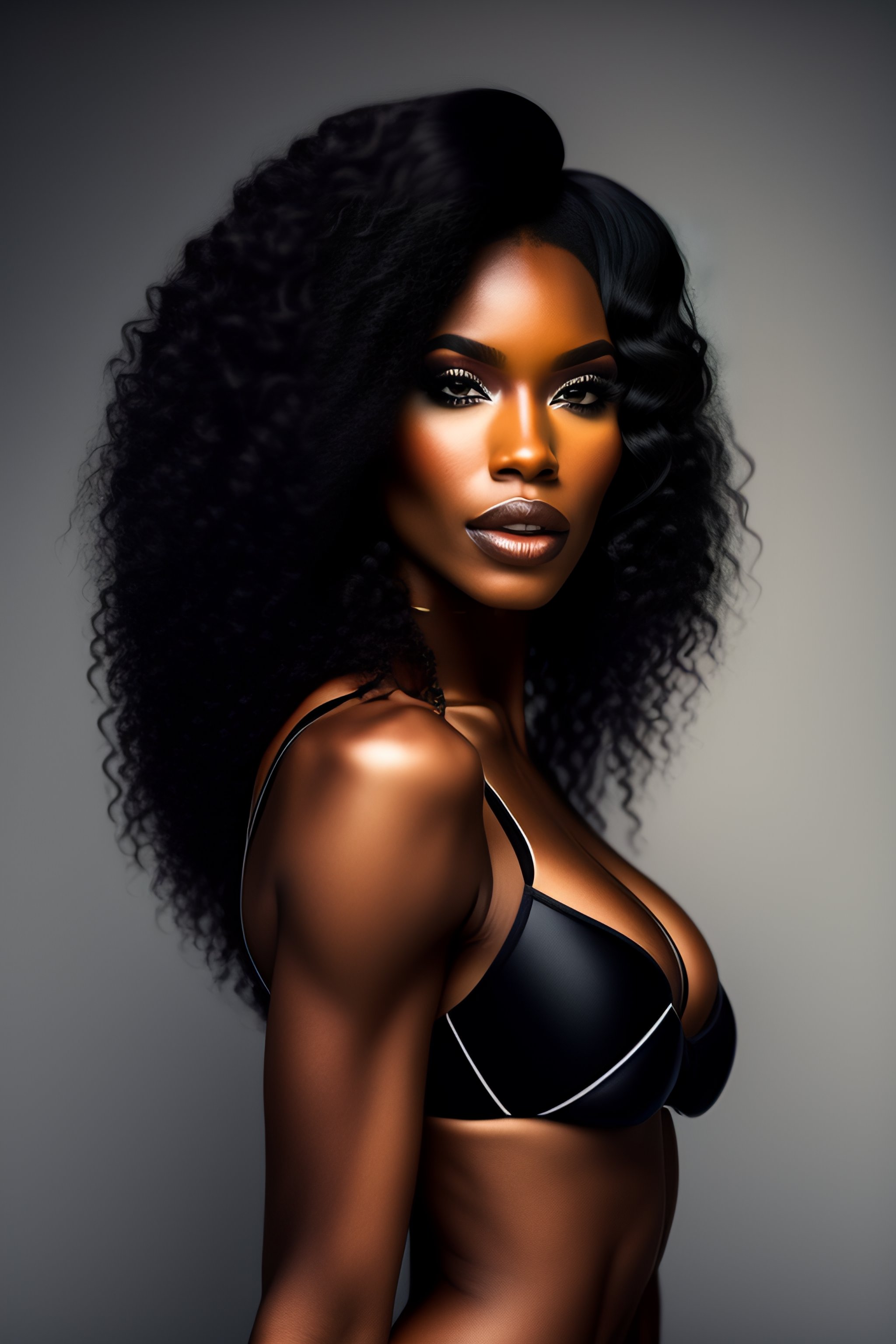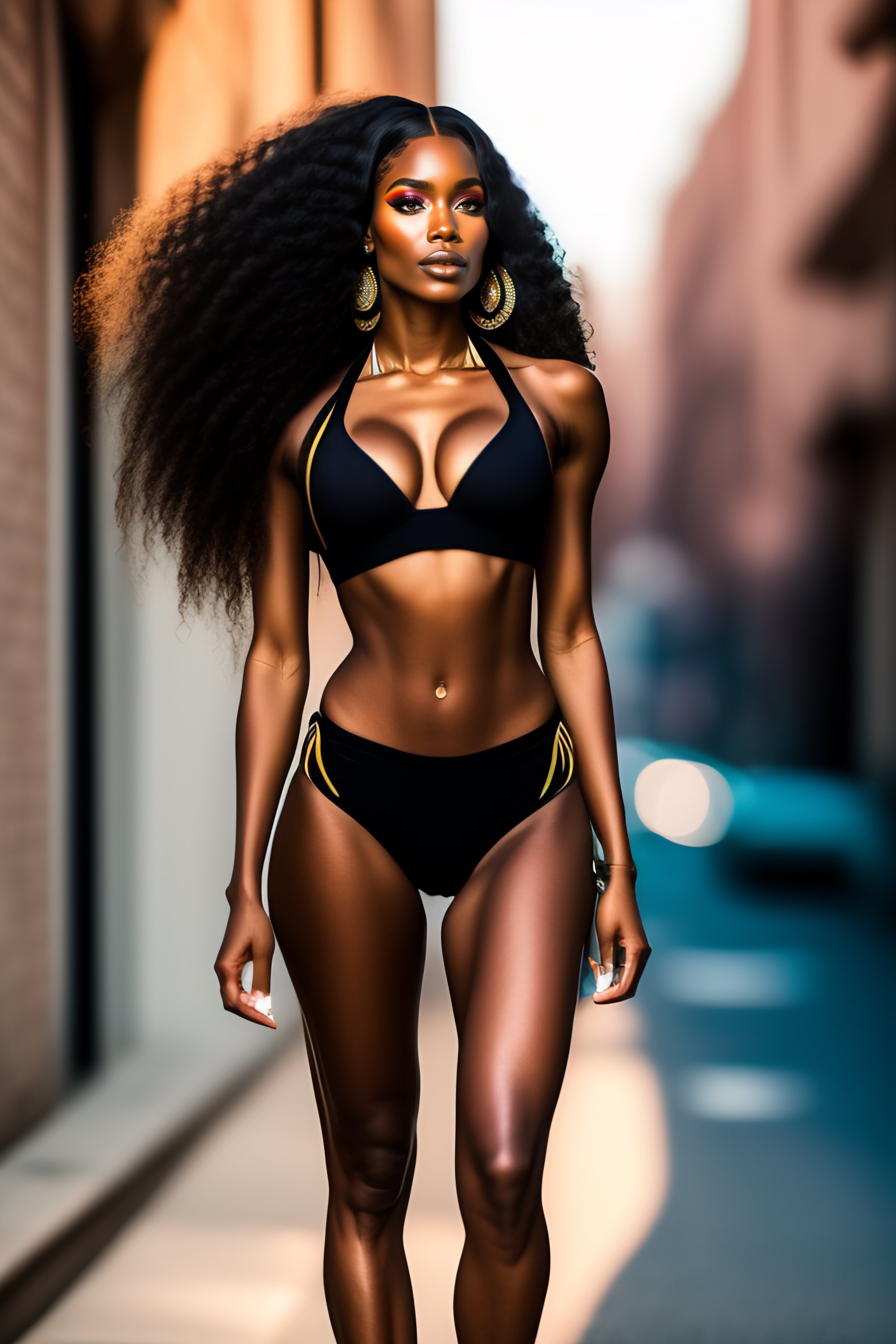Black woman, in tight black mini bikini, long colored hair, athletic body, full length, legs, high quality, high detail.