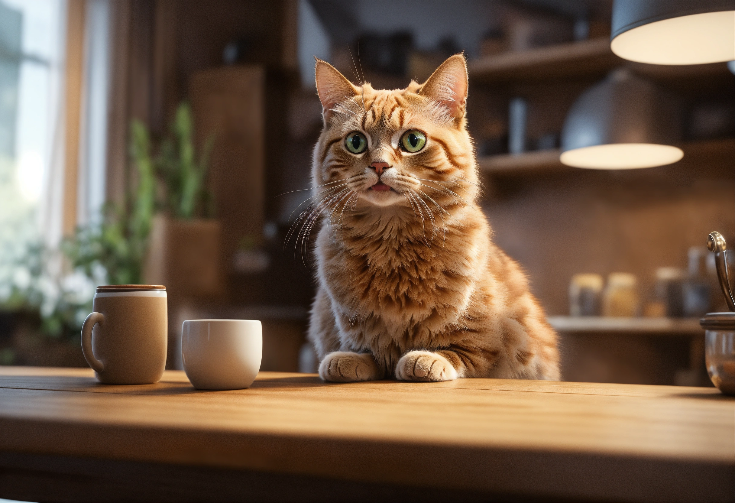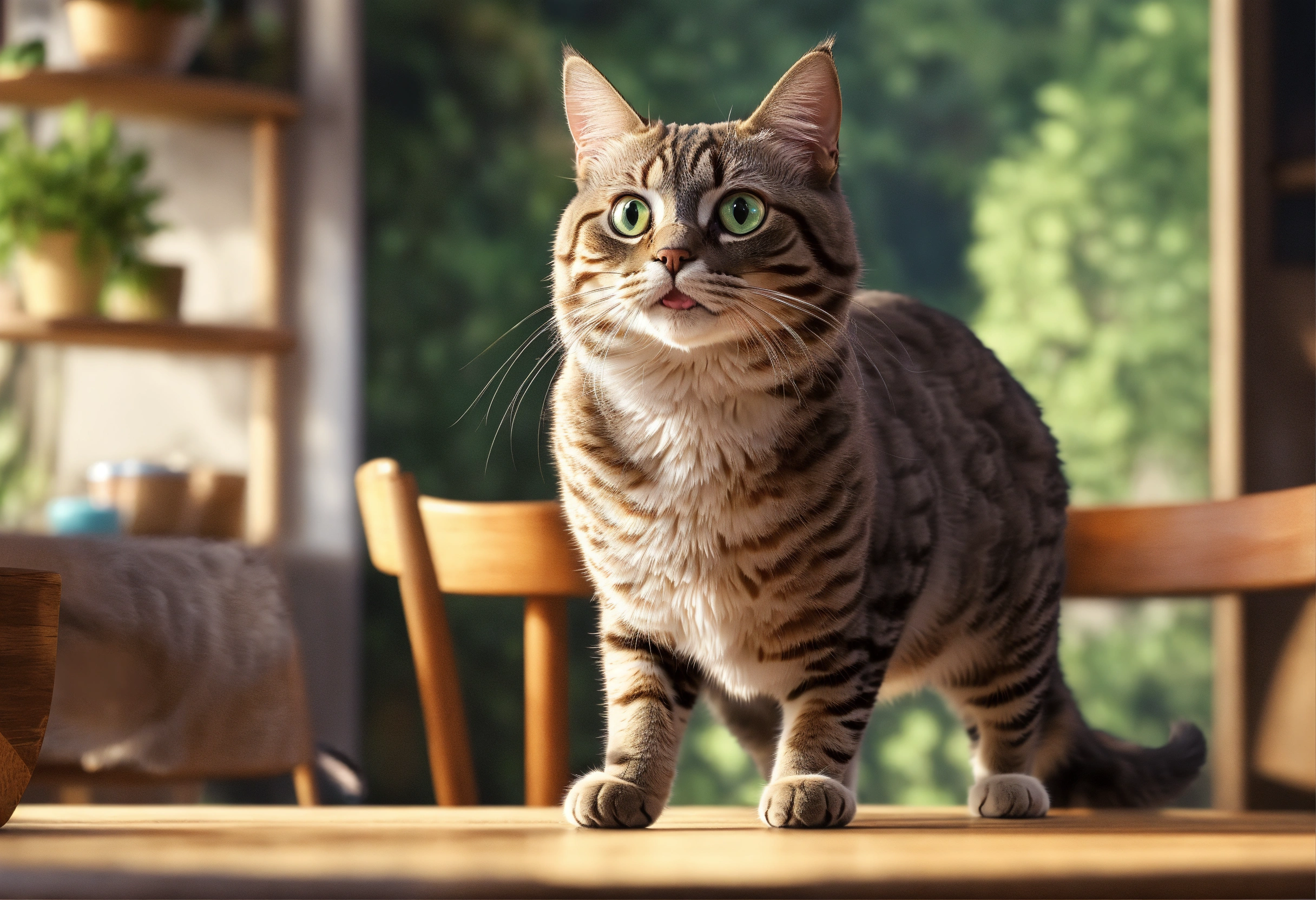 Photorealistic, a cat looking exaggerated surprised shocked face. standing over the table, 8k, ultra realistic, photorealistic