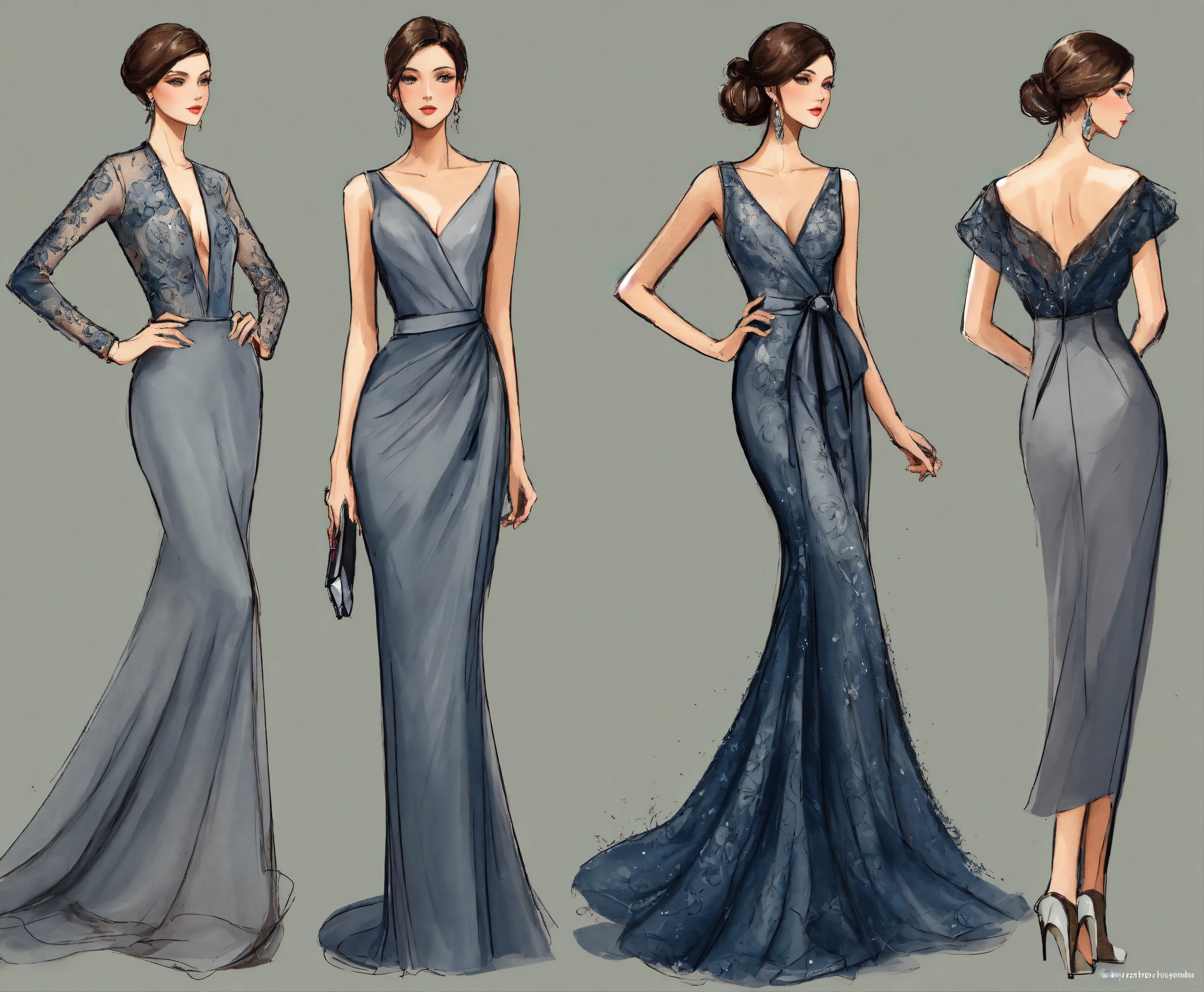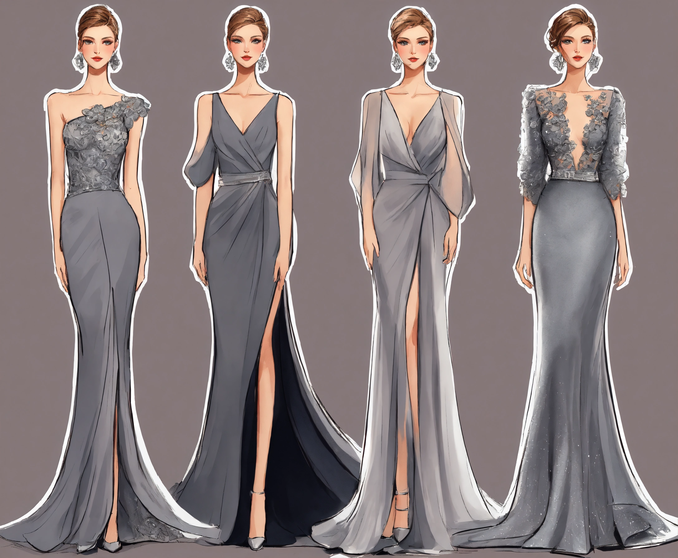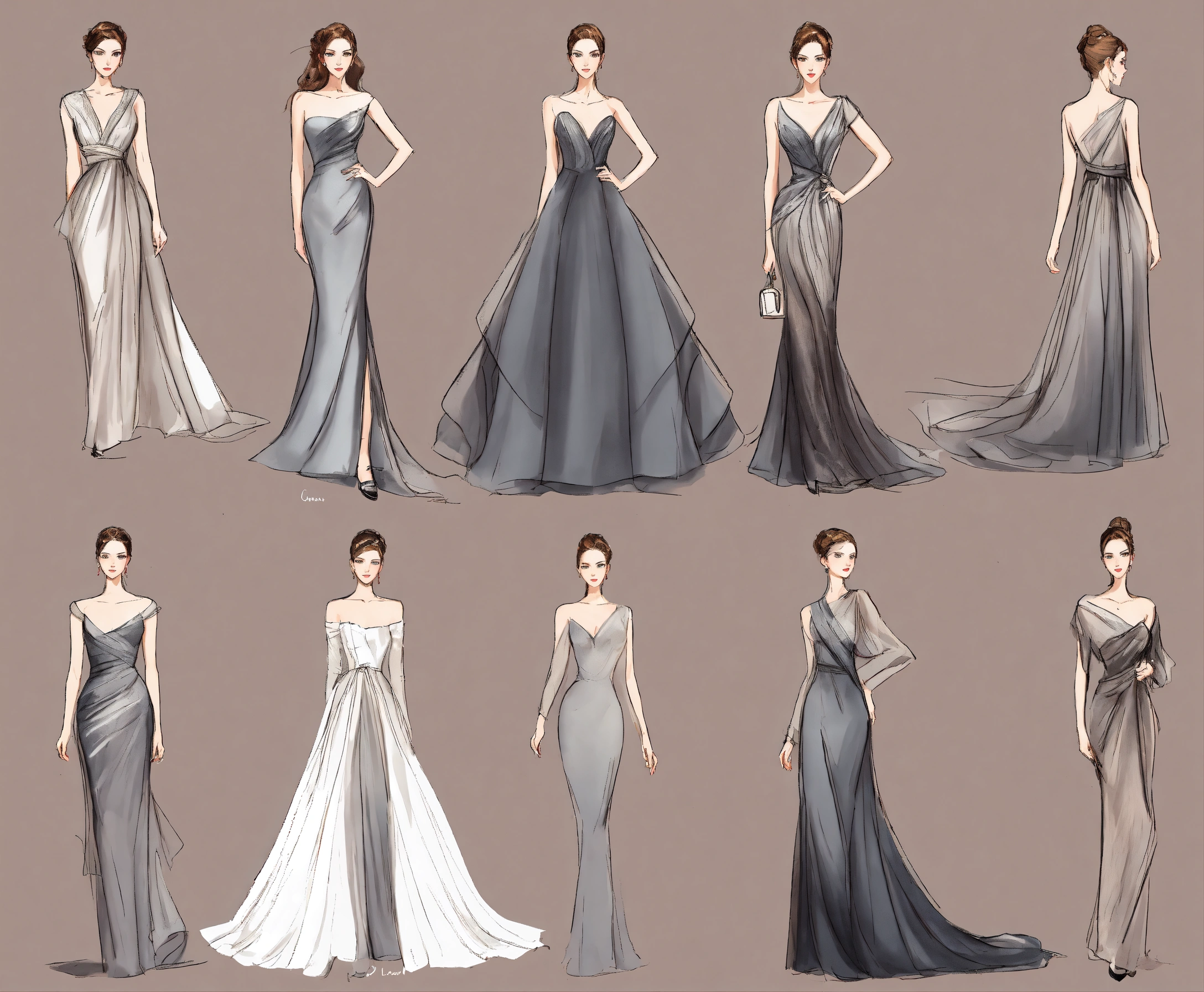 Fashion illustrations, 12 different designs, rough sketches, grey color dresses, illustrations, figure drawing, evening dresses, fancy lady, elegant, different poses, couture