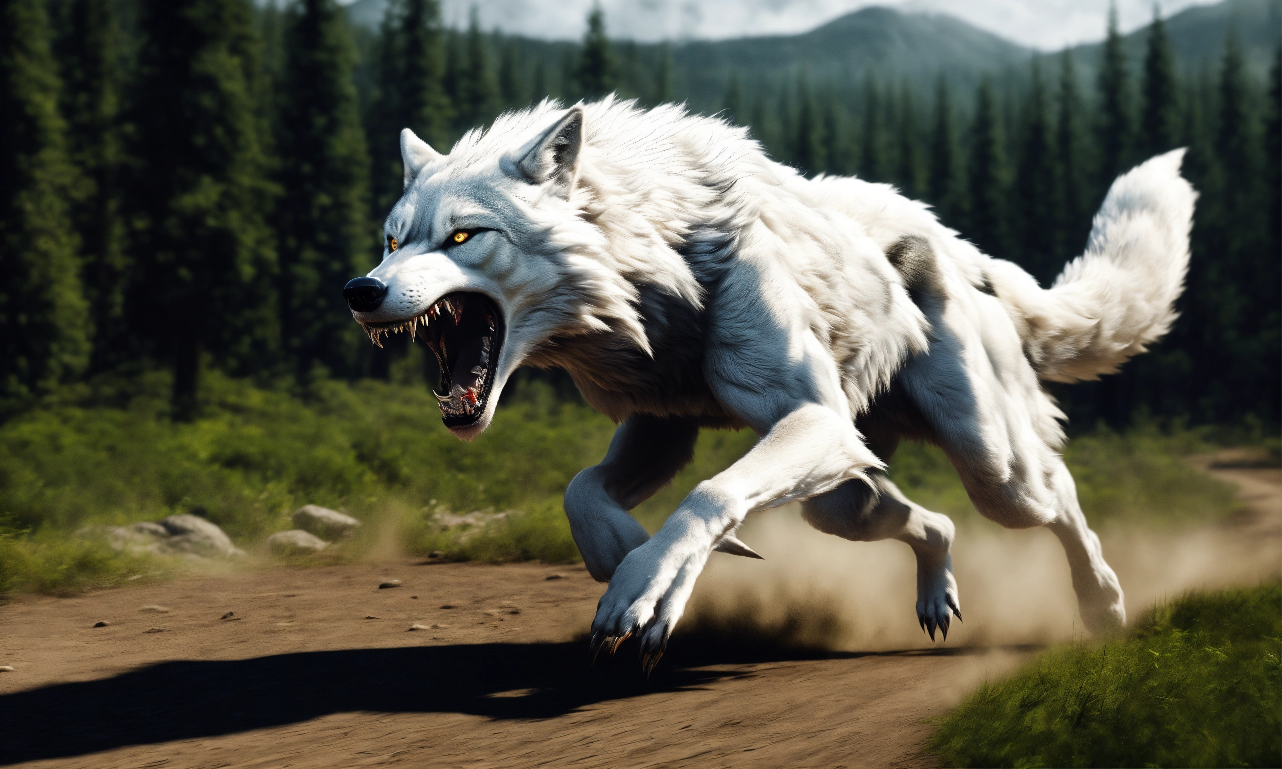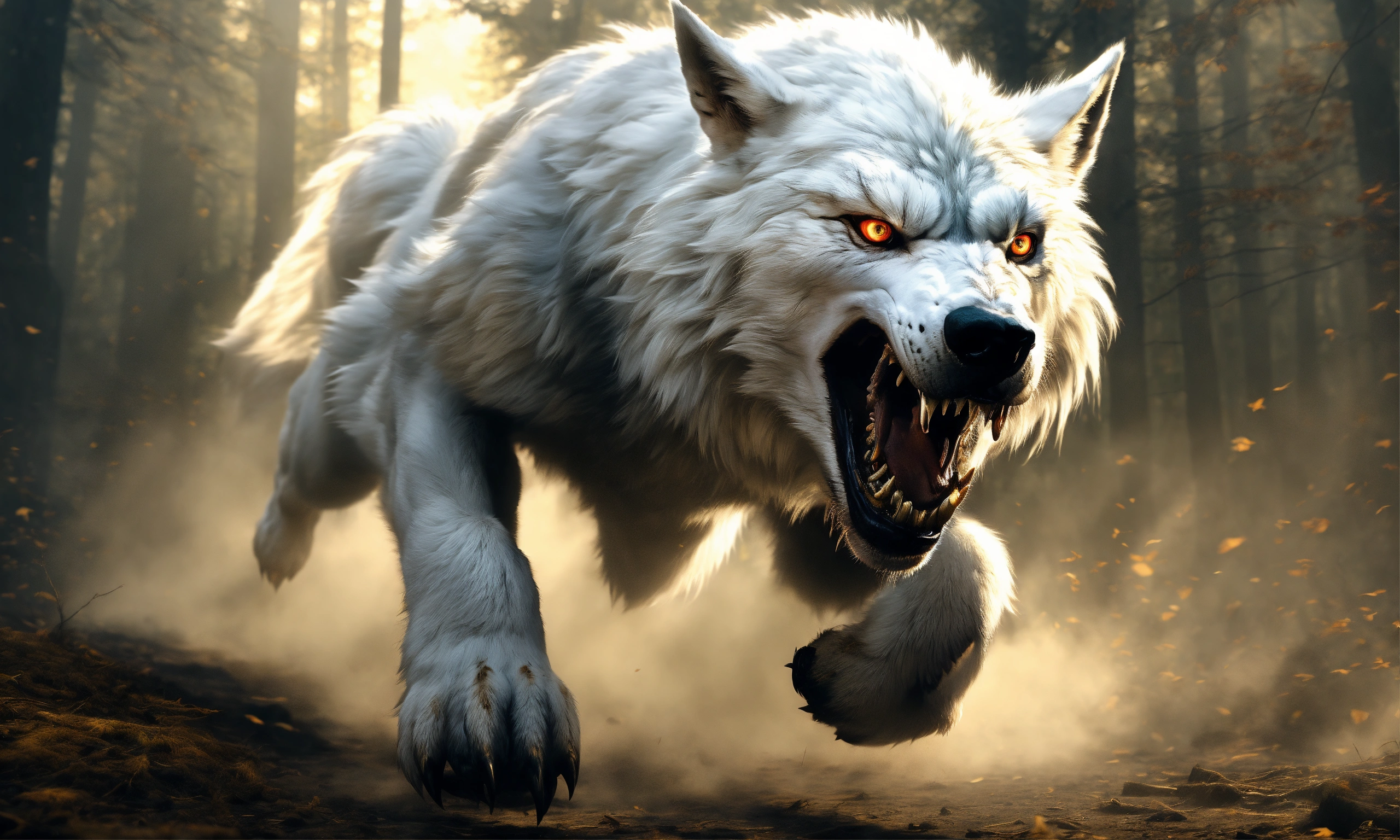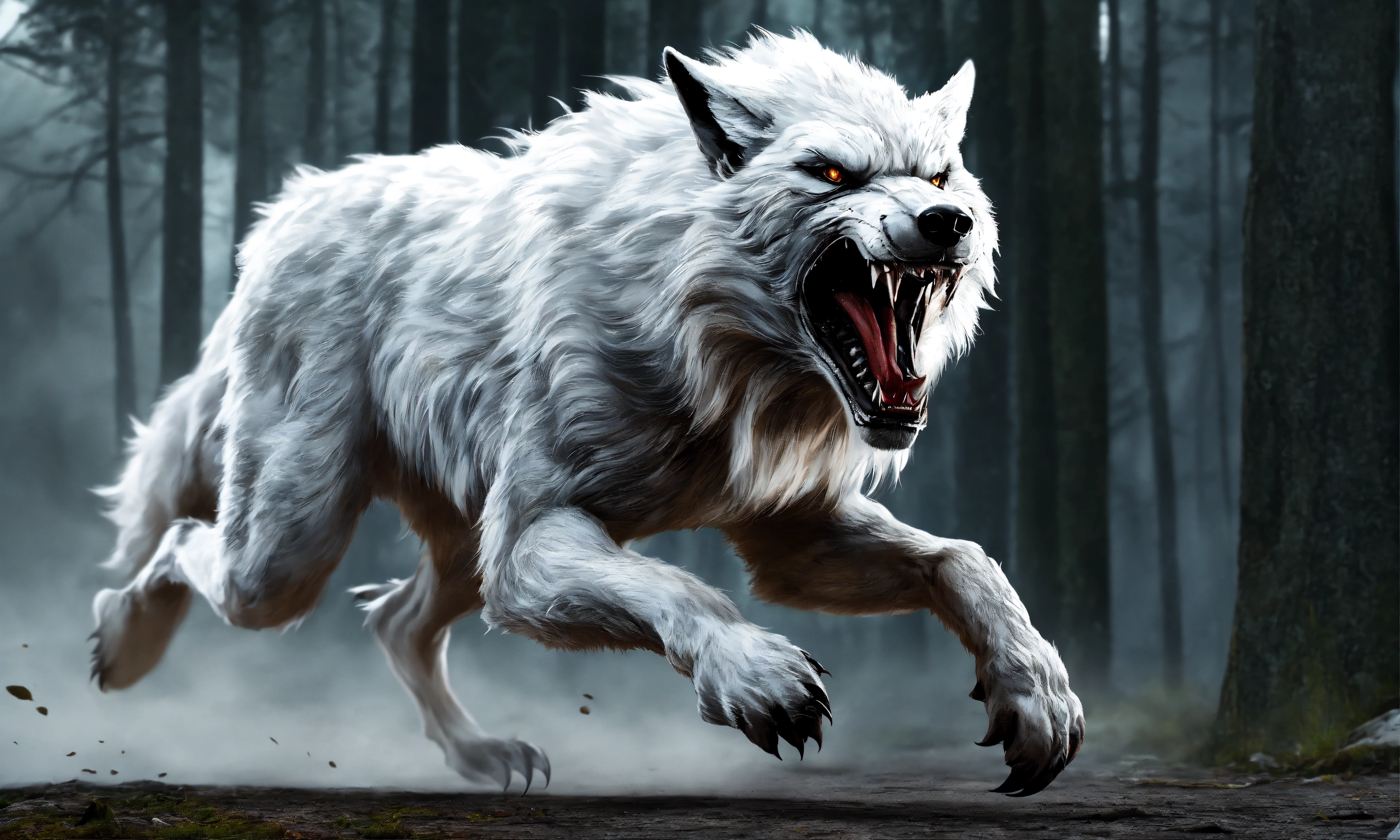 Terrifying white werewolf running in ultra realistic style, hyper-realistic, big fangs, big talons, horror, humanoid wolf