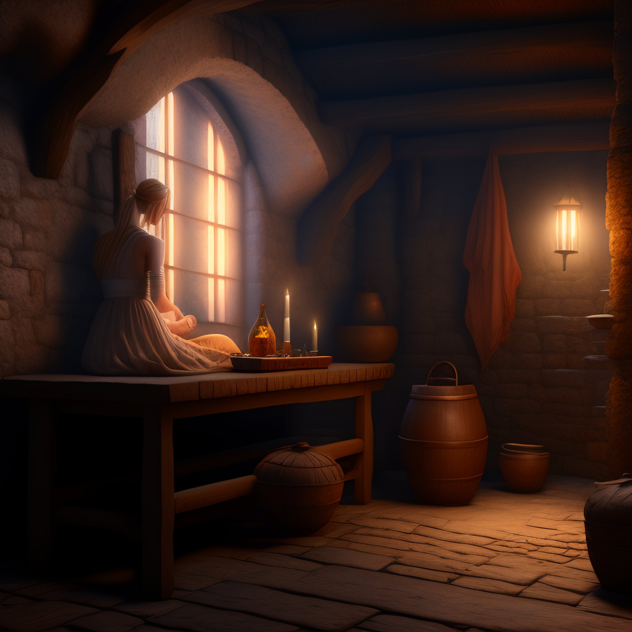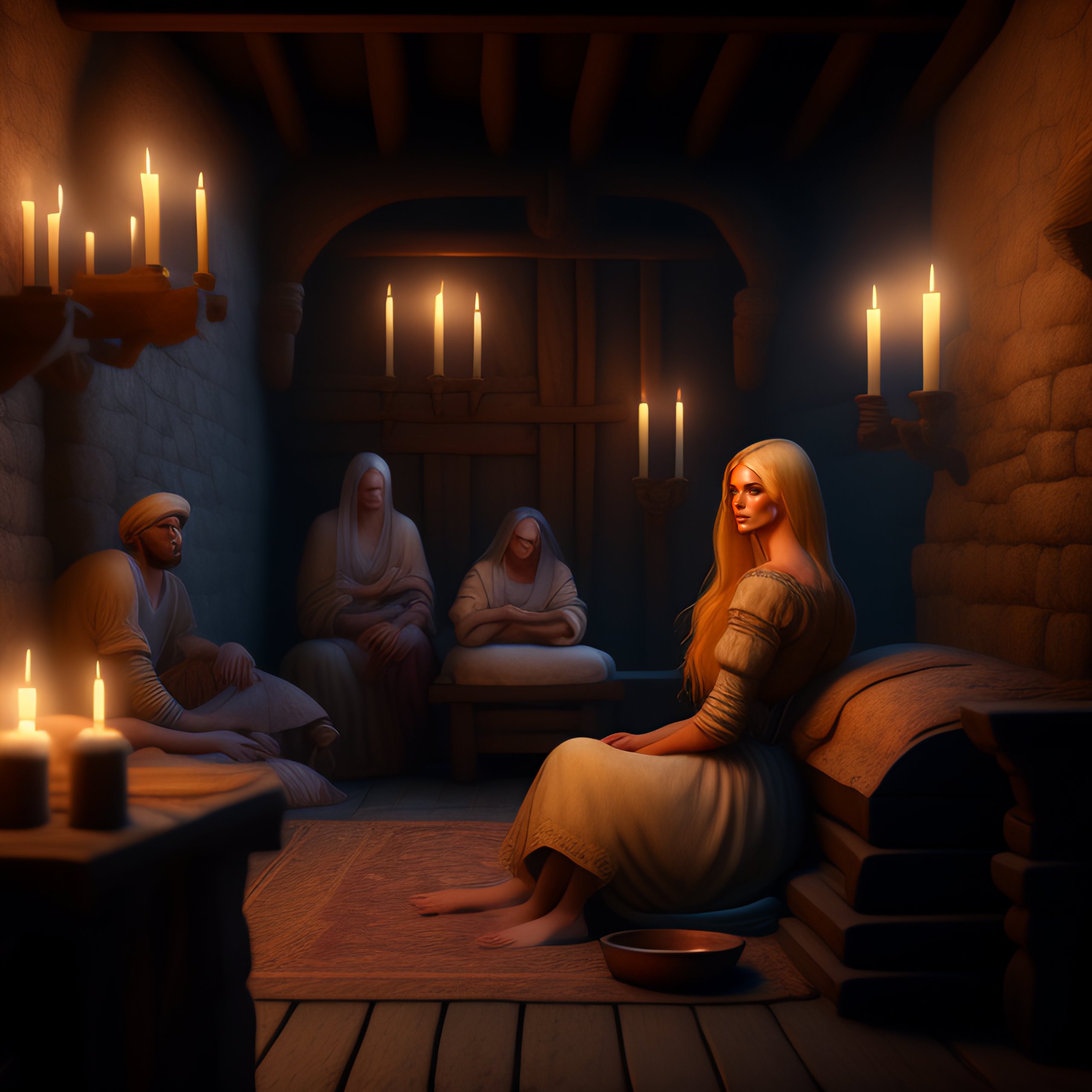Medieval prison cell, blonde christina hendricks sitting in medieval prison cell, full body, peasant rags, barefoot, kim kardashian, feet, intricate details, hyper detailed, night, dark, ultrarealism, sophie anderson, jordan grimmer, greg rutkowski, 8 k, octane render, artgerm, artstation